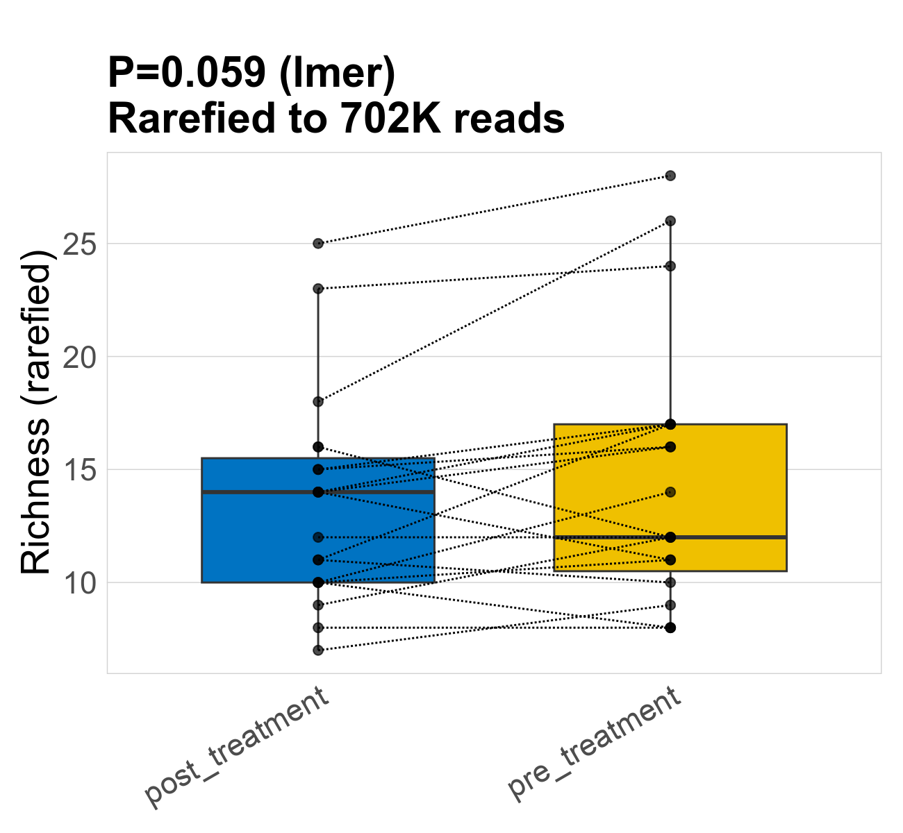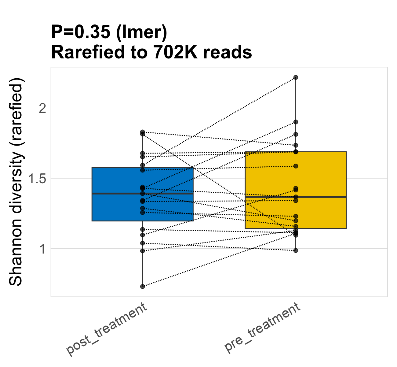| Index | rarefiedTo | P lmer condition effect | Mean Pos | Mean Abundance | Median Abundance | Mean Treatmentpost_treatment | Median Treatmentpost_treatment | SD Treatmentpost_treatment | Mean Treatmentpre_treatment | Median Treatmentpre_treatment | SD Treatmentpre_treatment | Fold Change Log2(Treatmentpre_treatment/Treatmentpost_treatment) | Positive samples | Positive Treatmentpost_treatment | Positive Treatmentpre_treatment | Positive_Treatmentpost_treatment_percent | Positive_Treatmentpre_treatment_percent |