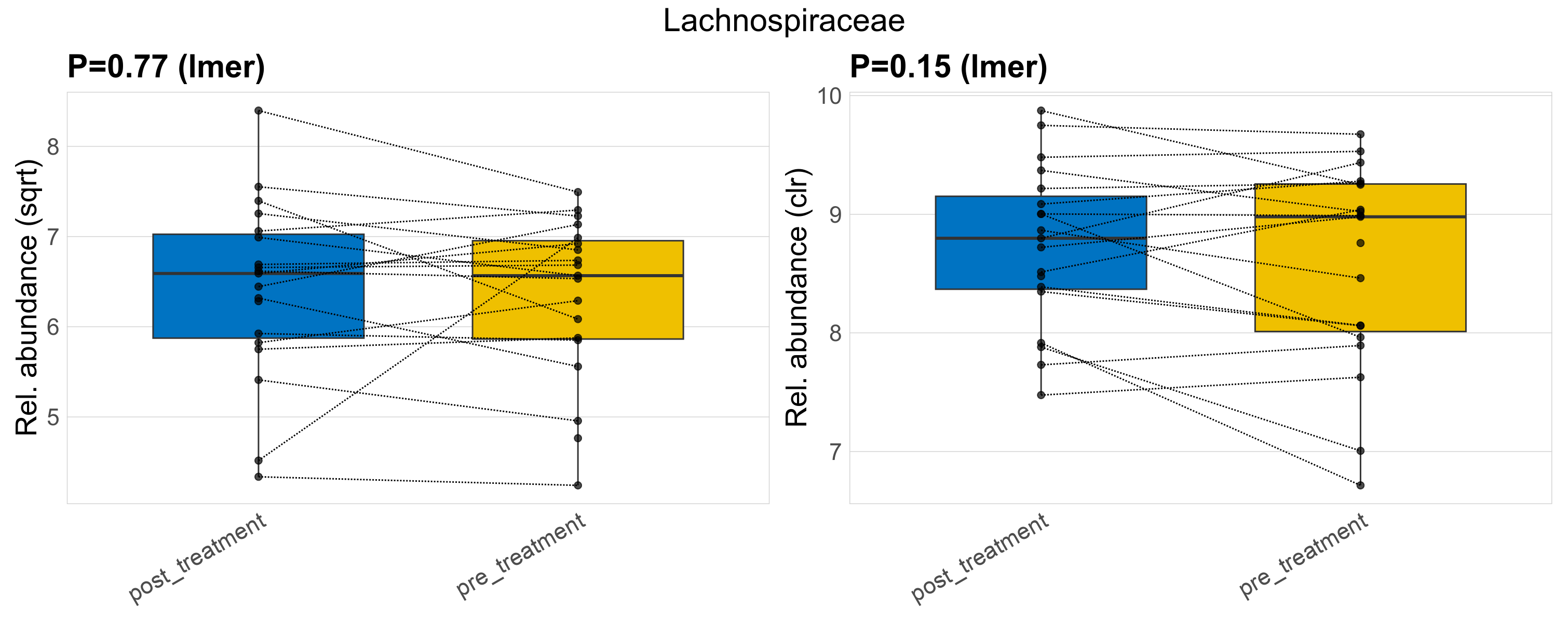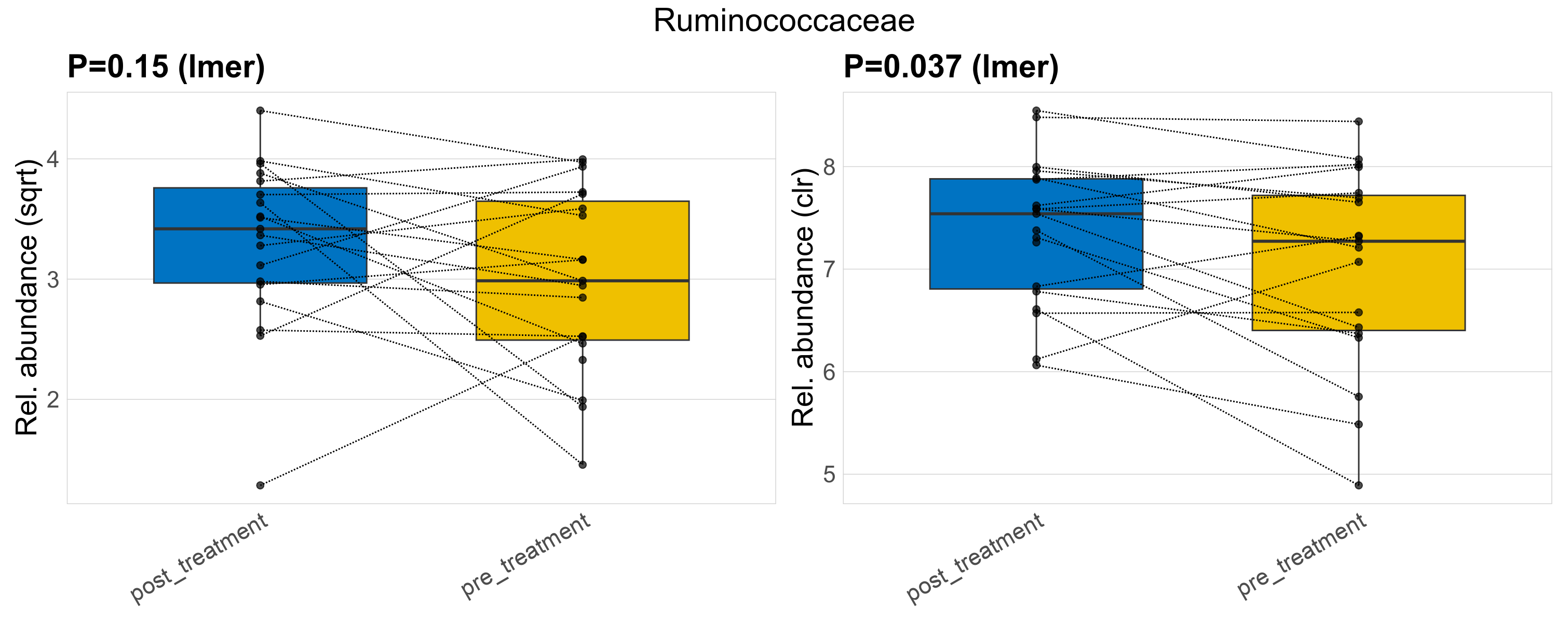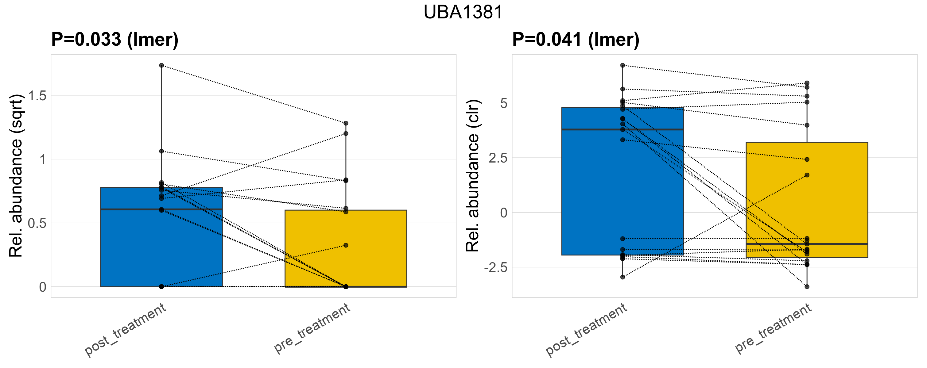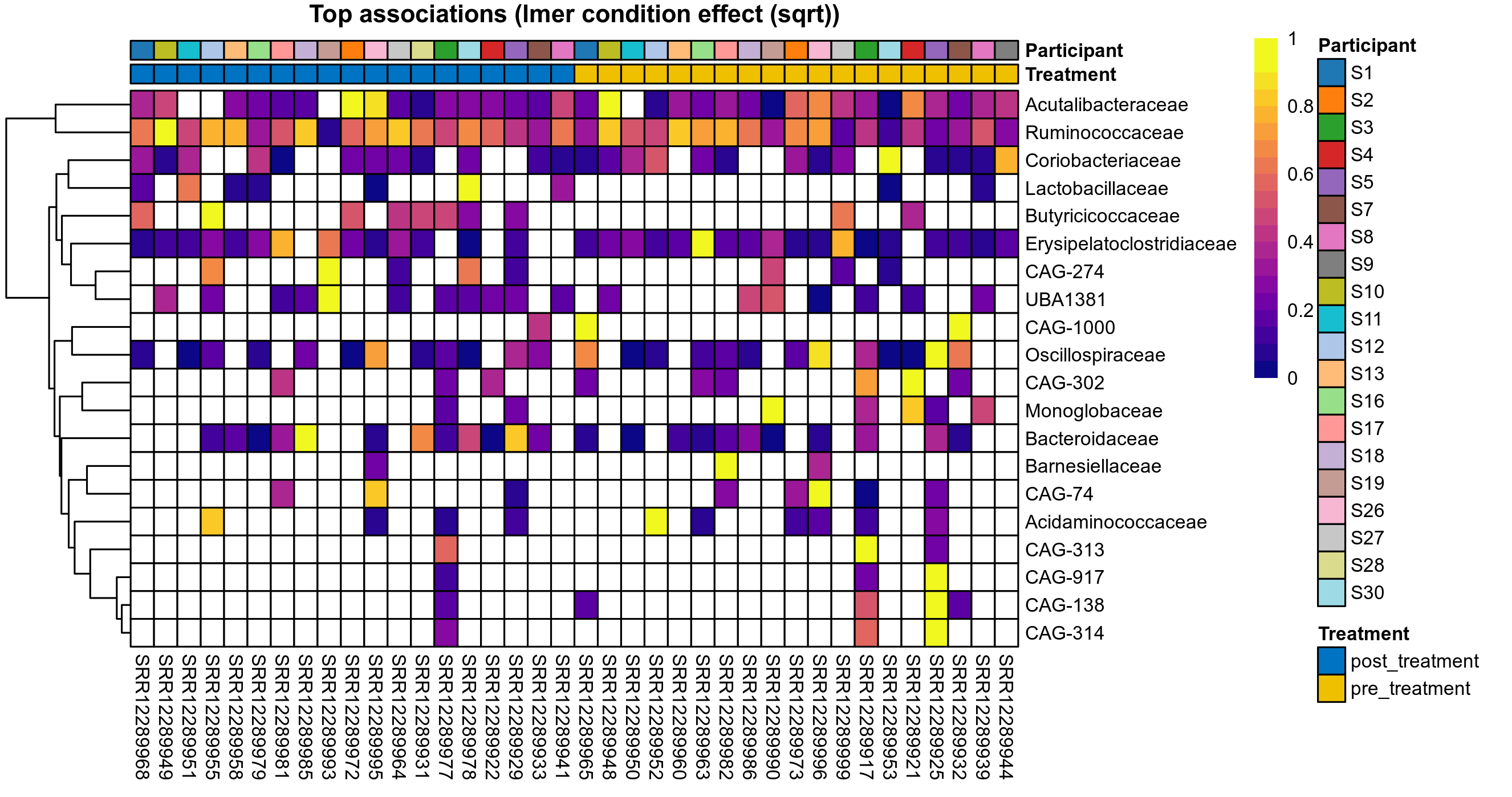 P lmer condition effect (sqrt): Differentially abundant species were identified by linear mixed effect regression without confounders. Random effects: Participant (intercept). Fixed effects: Treatment. Effect tested: Treatment.