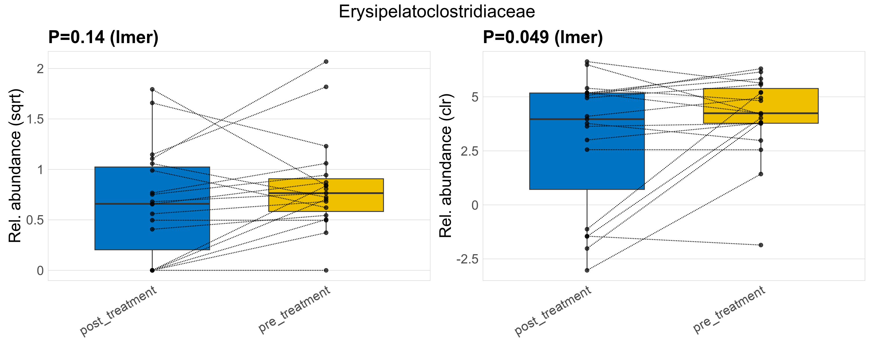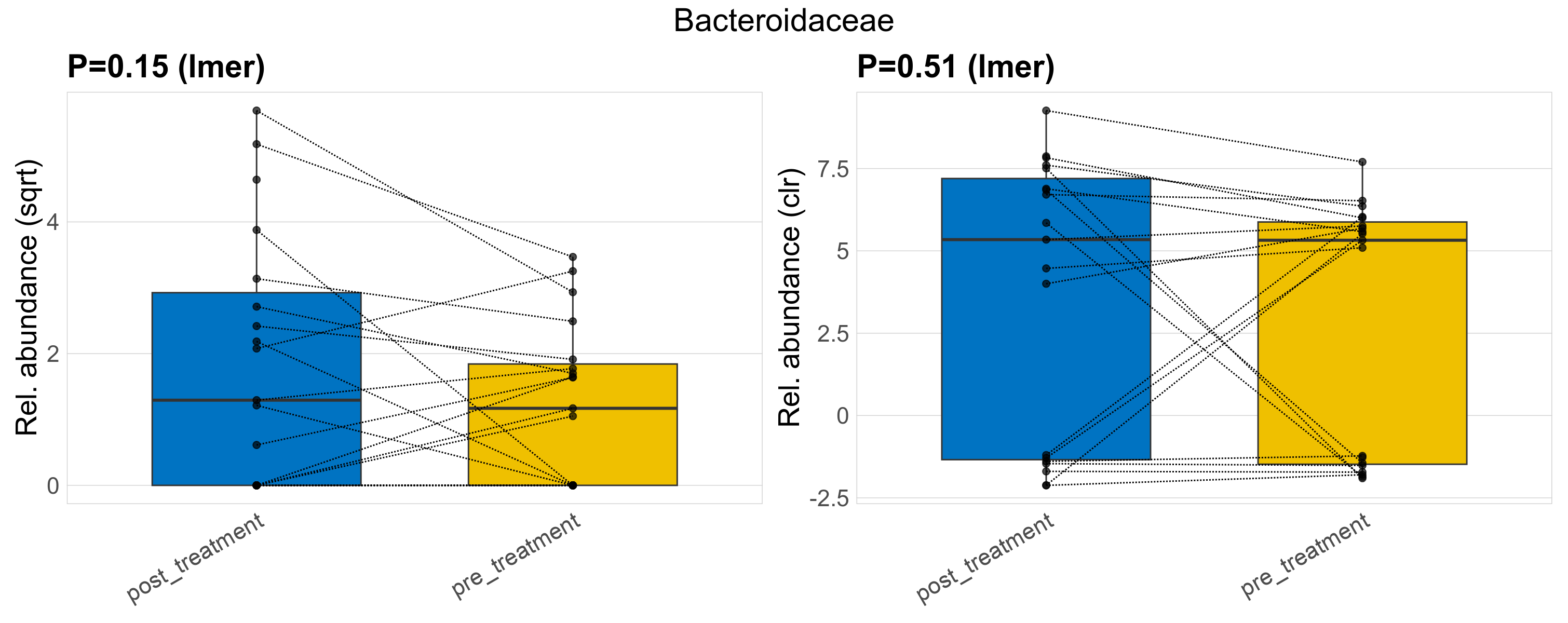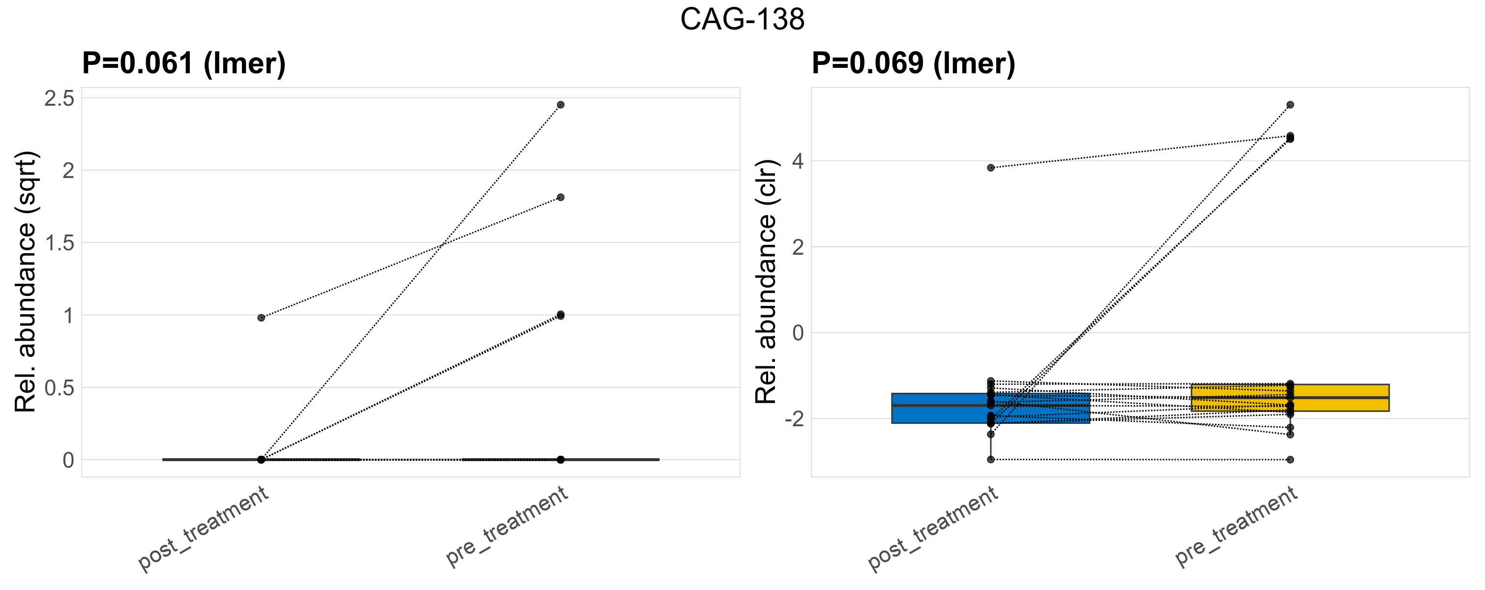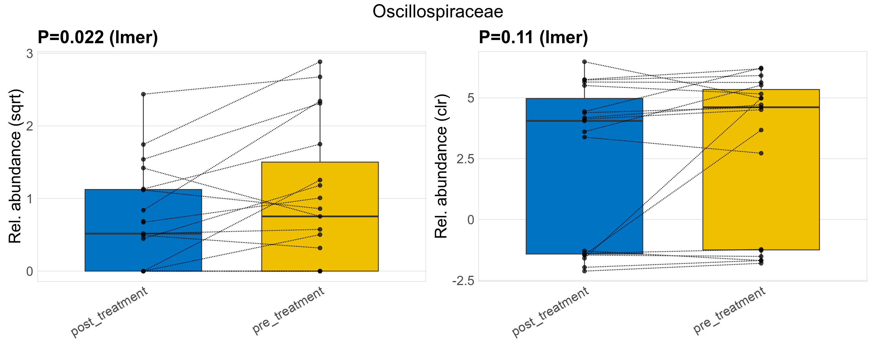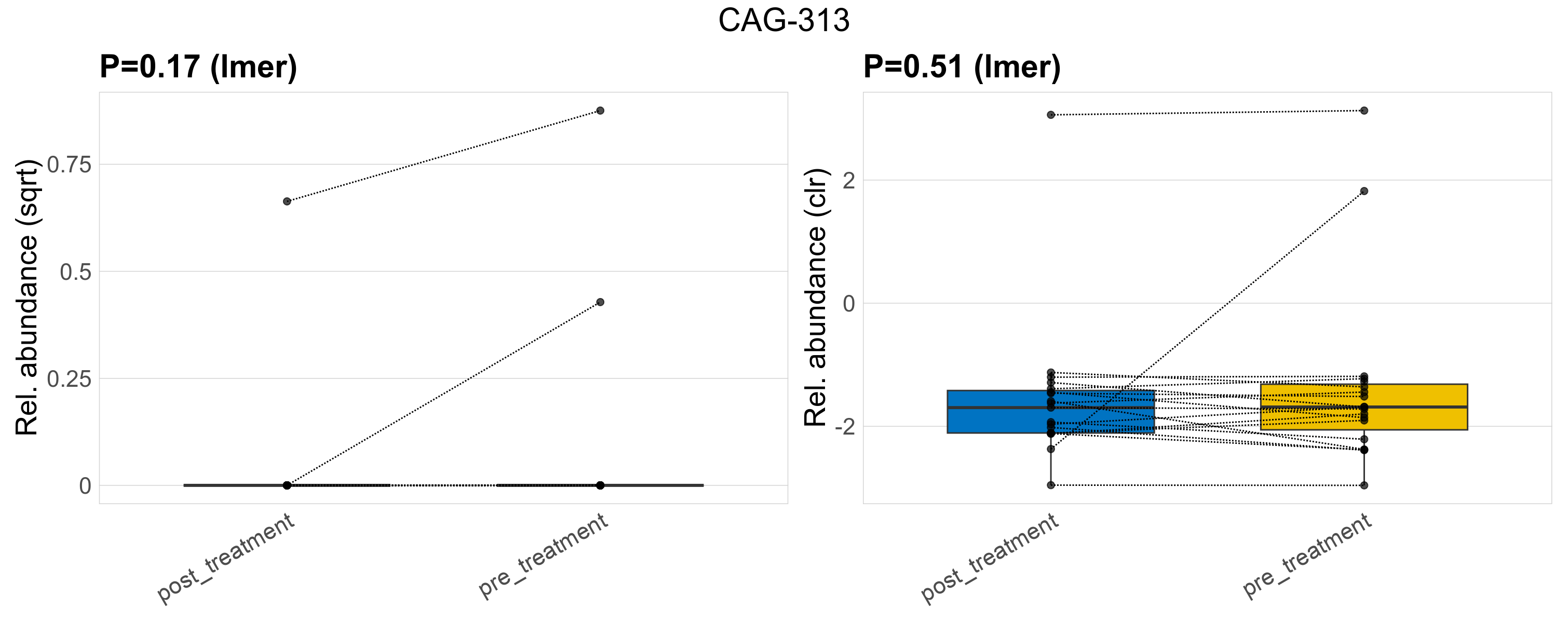 P lmer condition effect (sqrt): Differentially abundant species were identified by linear mixed effect regression without confounders. Random effects: Participant (intercept). Fixed effects: Treatment. Effect tested: Treatment.