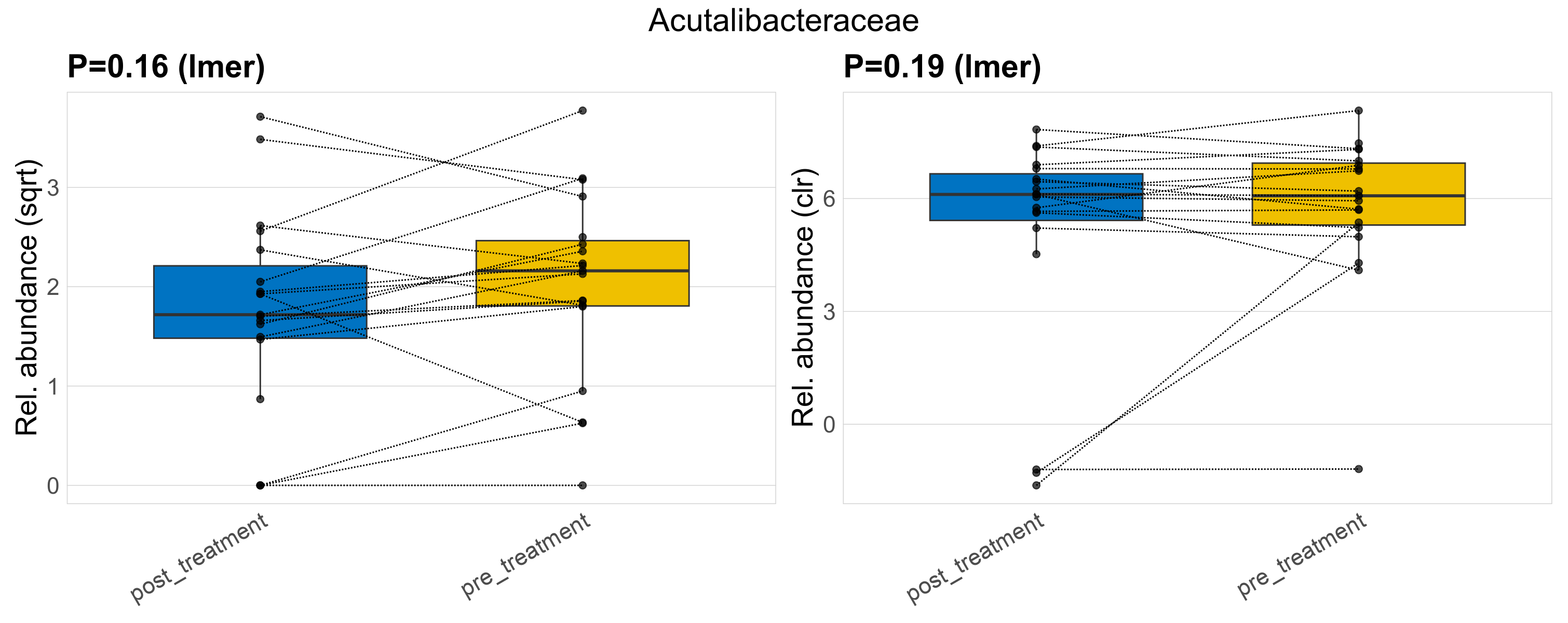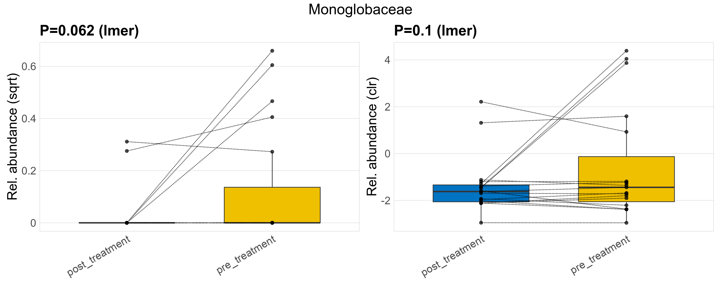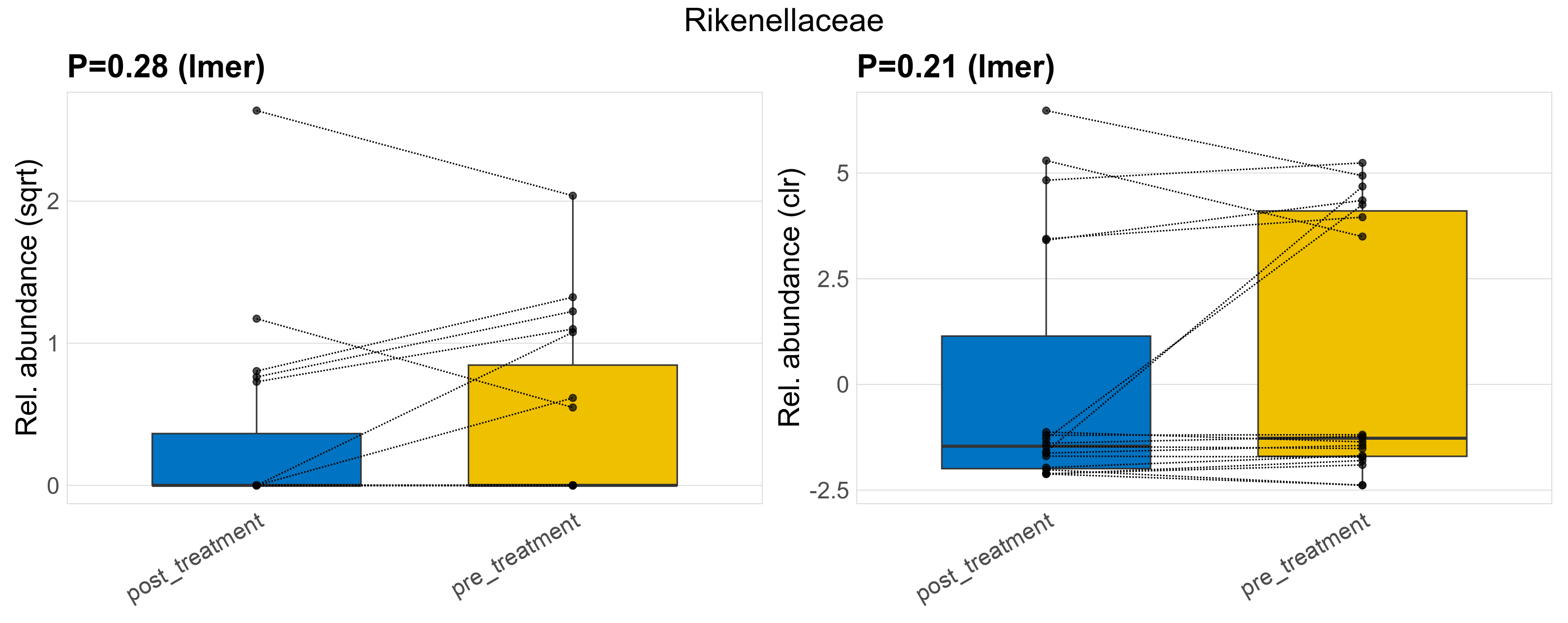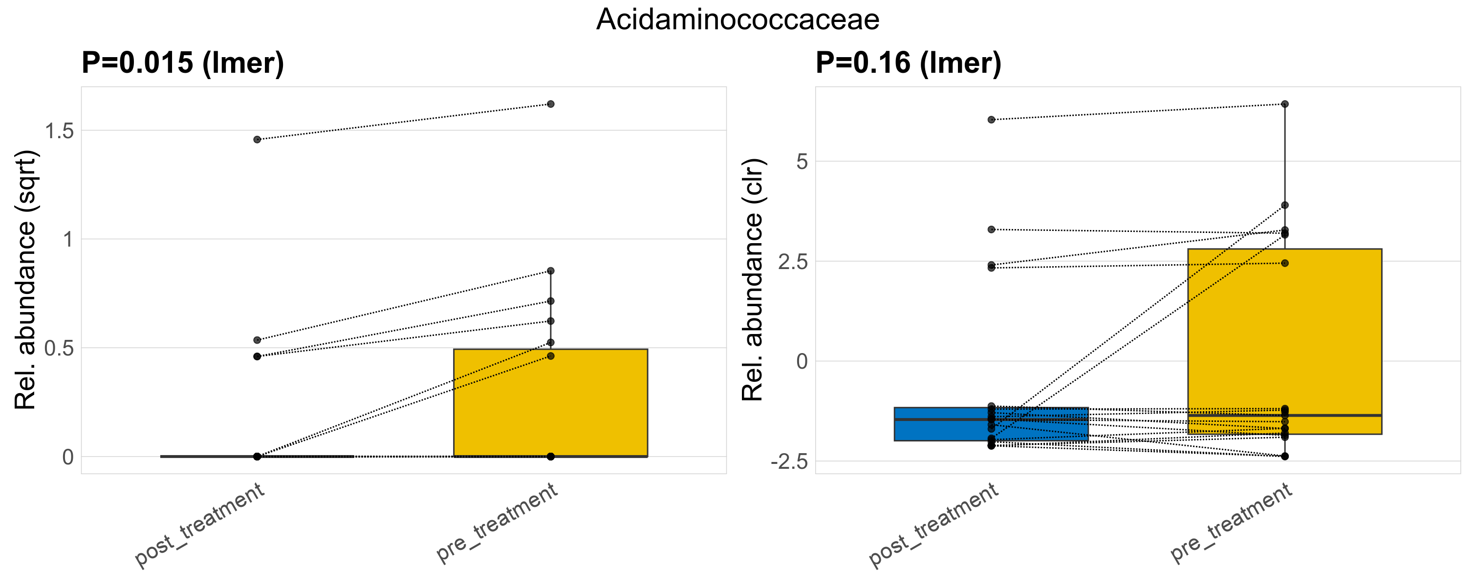 P lmer condition effect (sqrt): Differentially abundant species were identified by linear mixed effect regression without confounders. Random effects: Participant (intercept). Fixed effects: Treatment. Effect tested: Treatment.