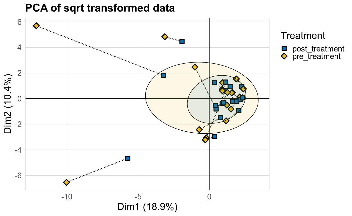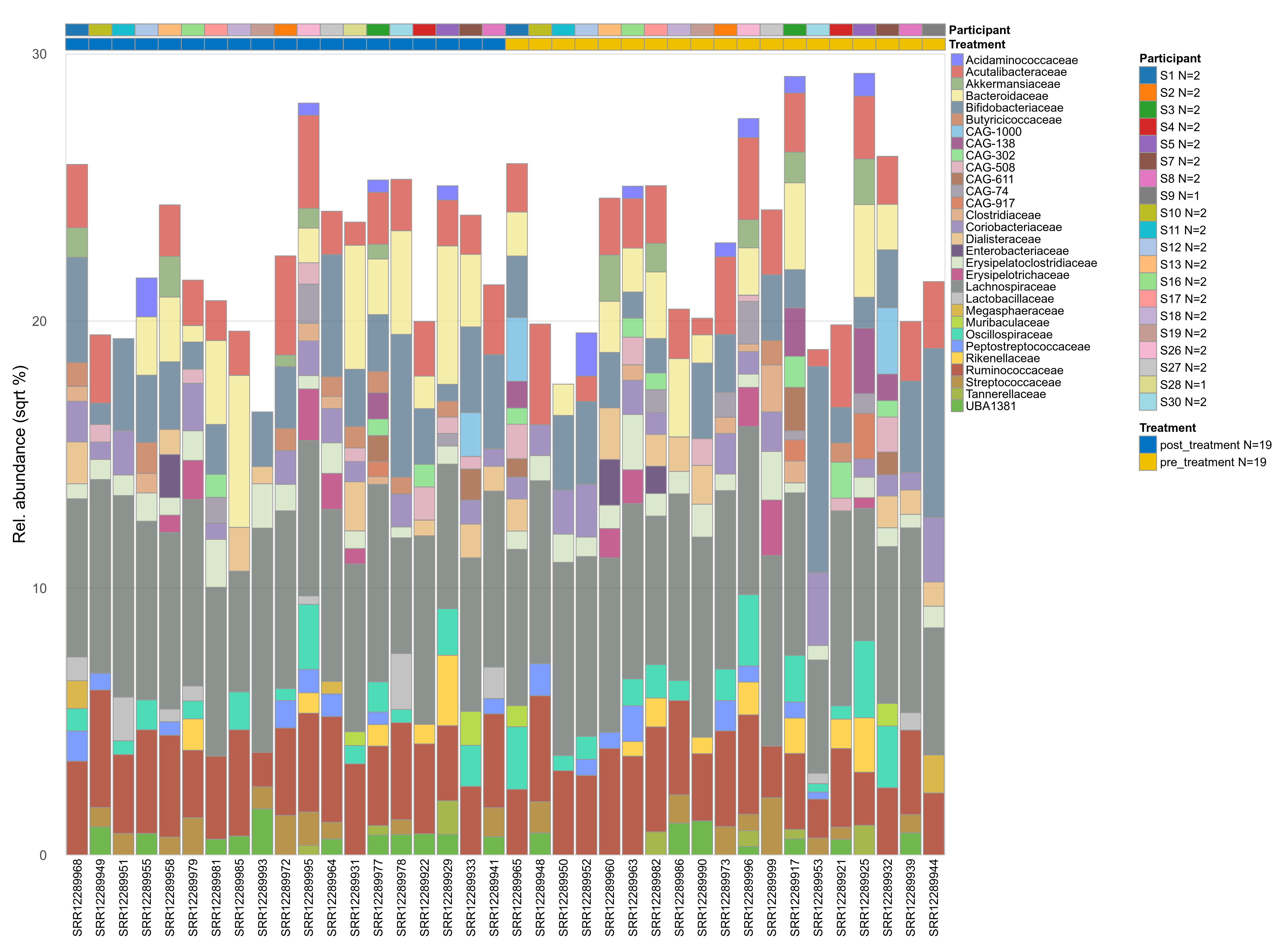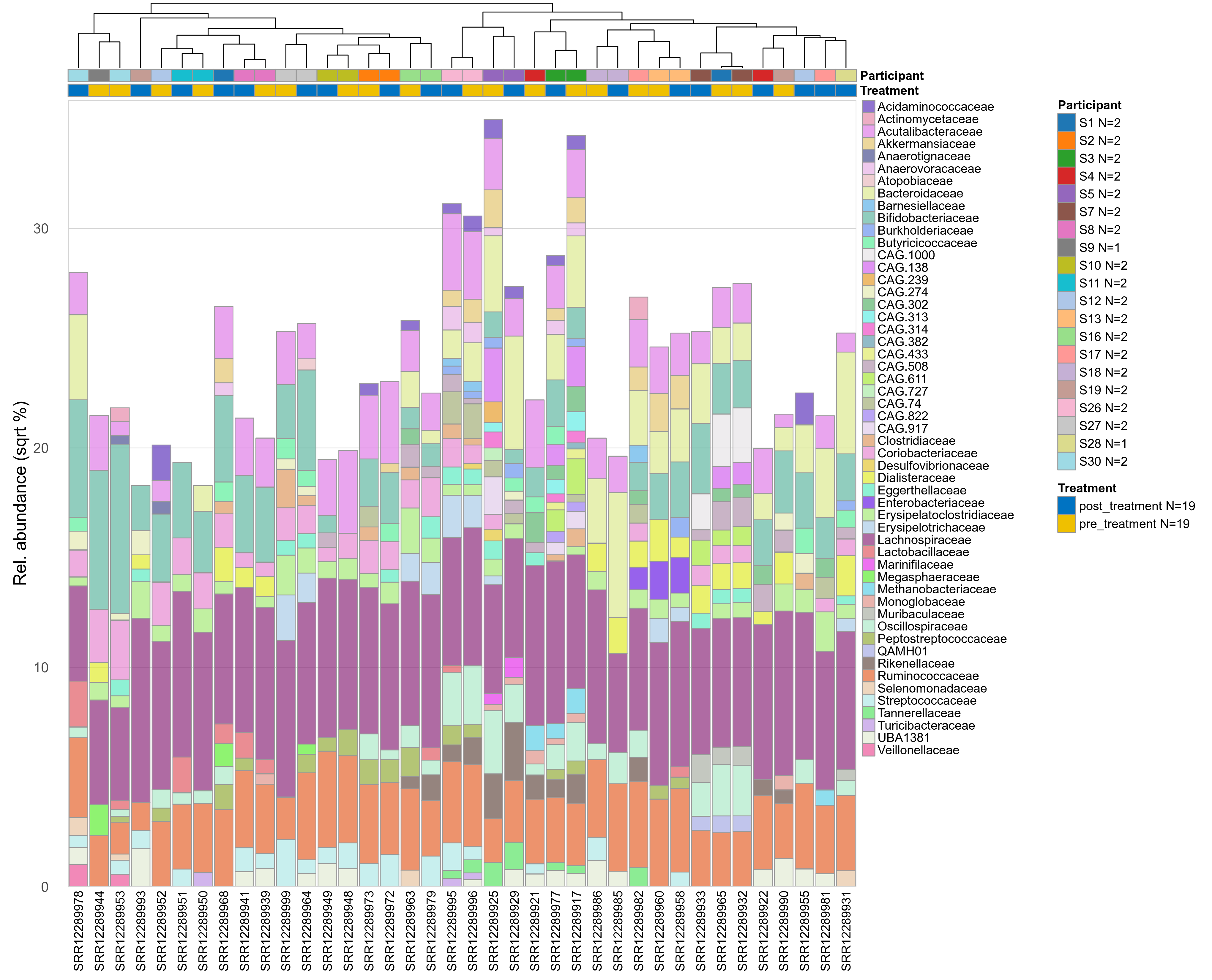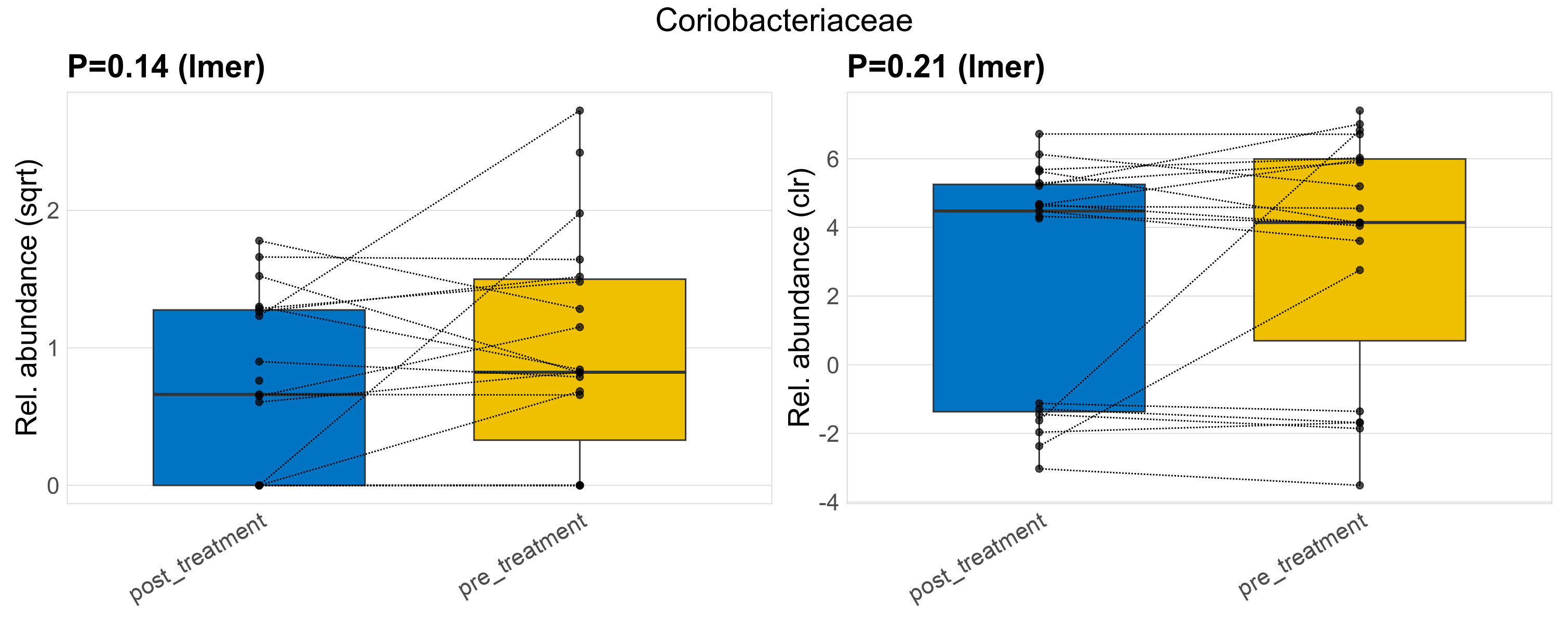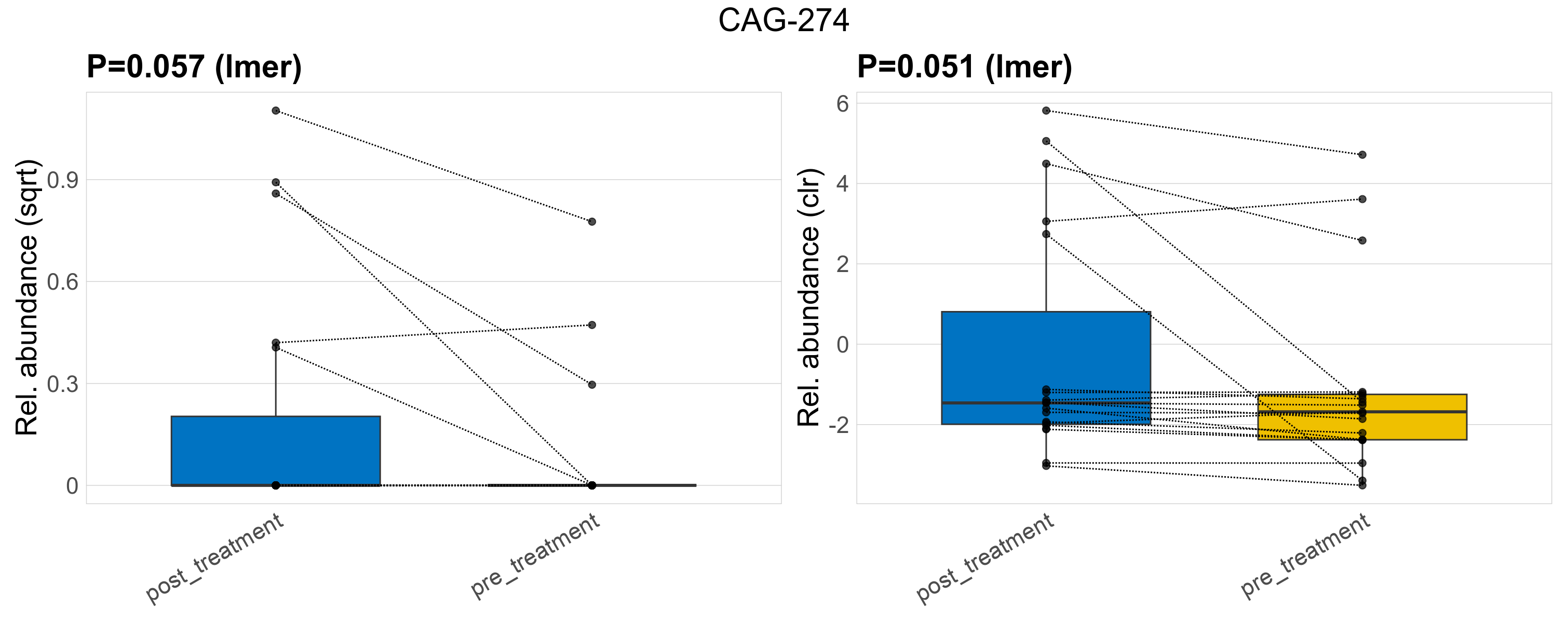 P lmer condition effect (sqrt): Differentially abundant species were identified by linear mixed effect regression without confounders. Random effects: Participant (intercept). Fixed effects: Treatment. Effect tested: Treatment.