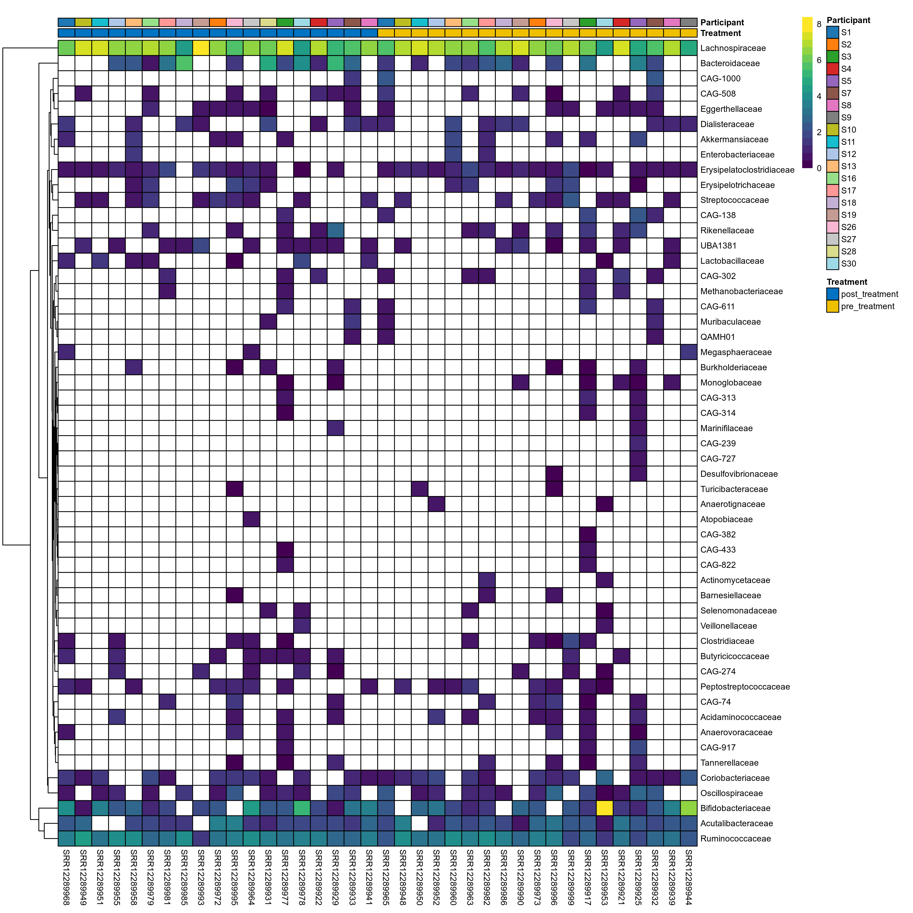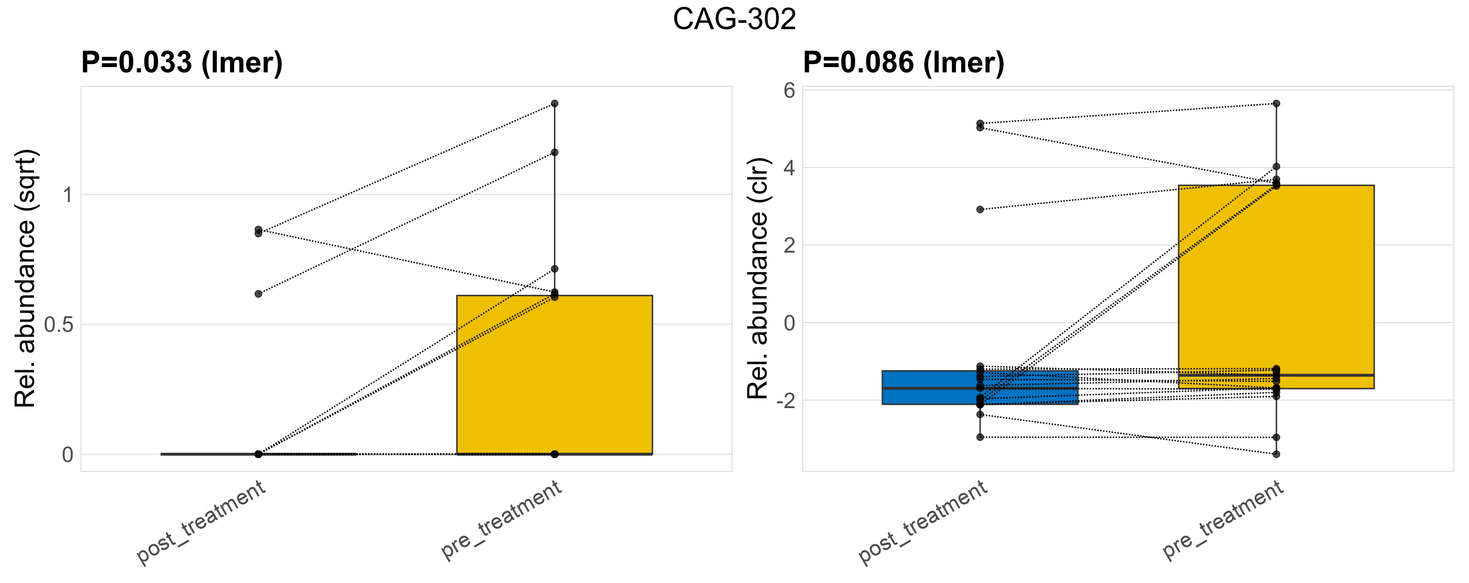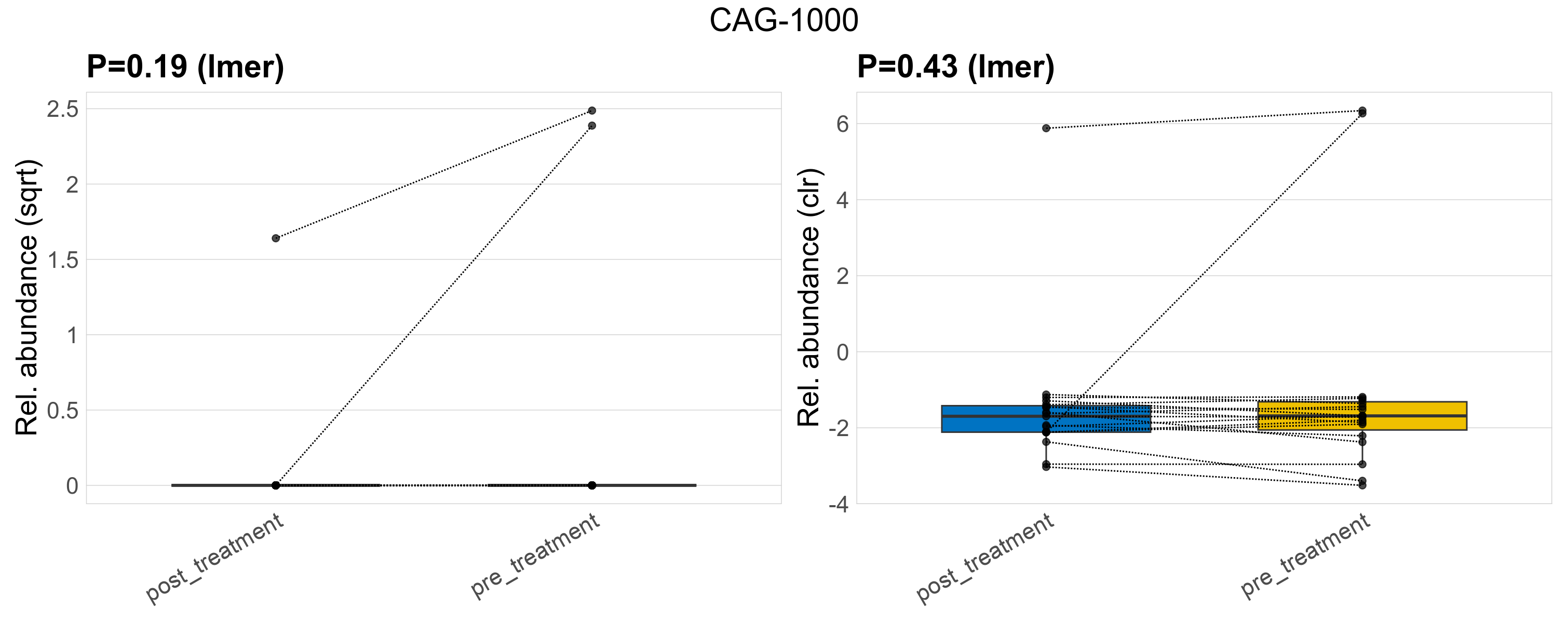 | Taxon | GTDB taxonomy | P lmer condition effect (sqrt) | FDR lmer condition effect (sqrt) | Pbonf lmer condition effect (sqrt) | P lmer condition effect (clr) | FDR lmer condition effect (clr) | Pbonf lmer condition effect (clr) | Mean Pos | Mean Abundance | Median Abundance | Mean Treatmentpost_treatment | Median Treatmentpost_treatment | SD Treatmentpost_treatment | Mean Treatmentpre_treatment | Median Treatmentpre_treatment | SD Treatmentpre_treatment | Fold Change Log2(Treatmentpre_treatment/Treatmentpost_treatment) | Positive samples | Positive Treatmentpost_treatment | Positive Treatmentpre_treatment | Positive_Treatmentpost_treatment_percent | Positive_Treatmentpre_treatment_percent |