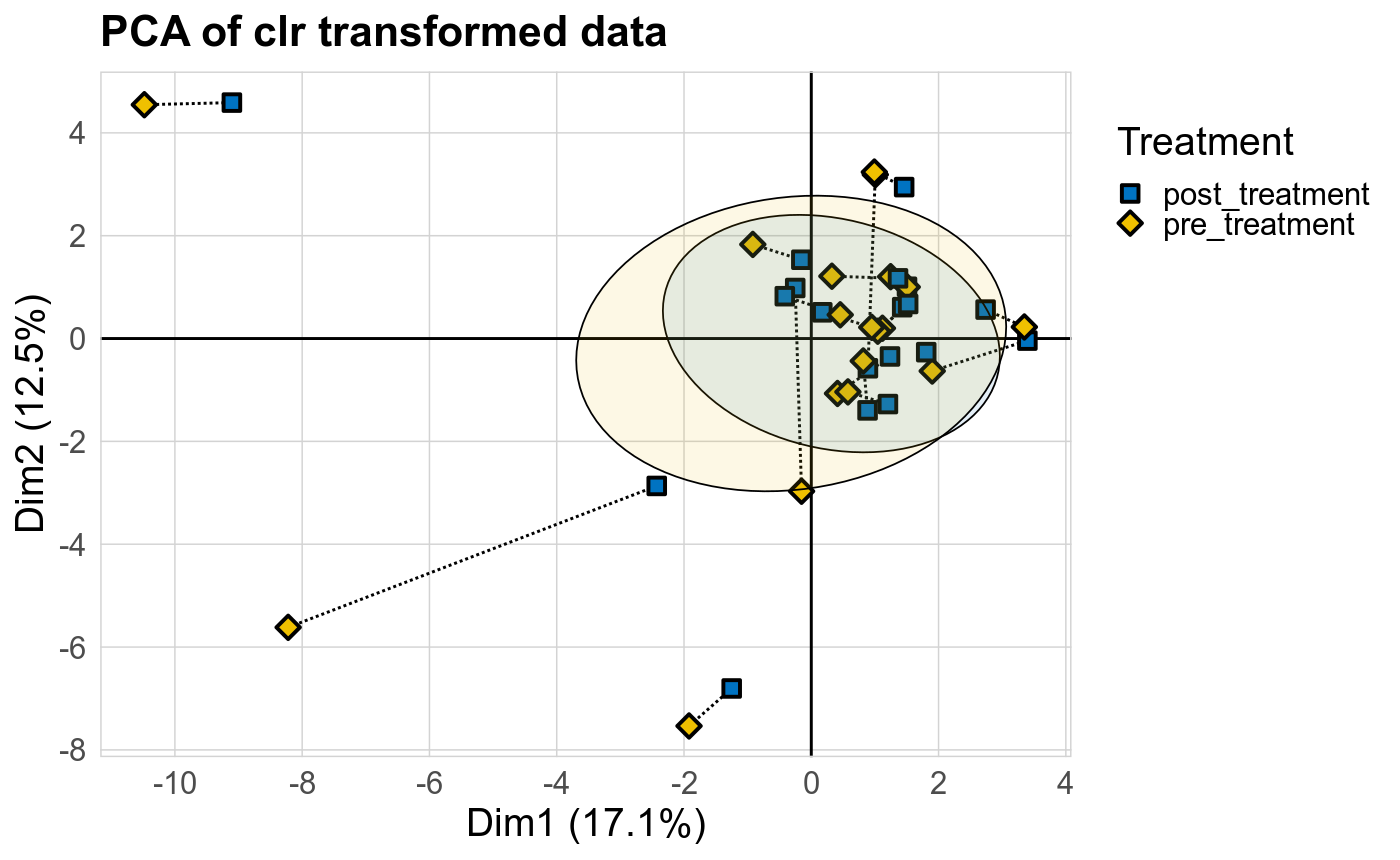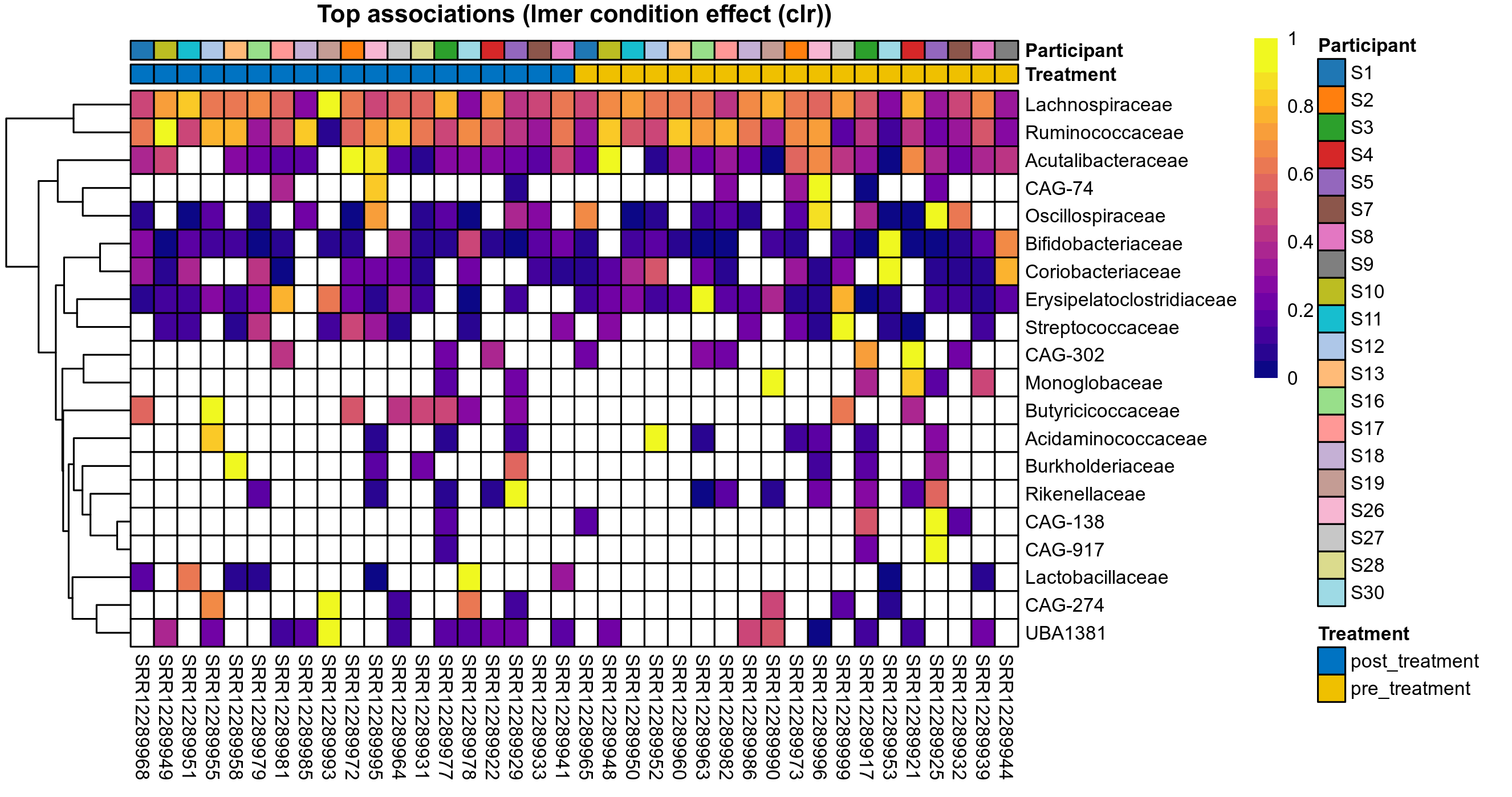 P lmer condition effect (clr): Differentially abundant species were identified by linear mixed effect regression without confounders. Random effects: Participant (intercept). Fixed effects: Treatment. Effect tested: Treatment.