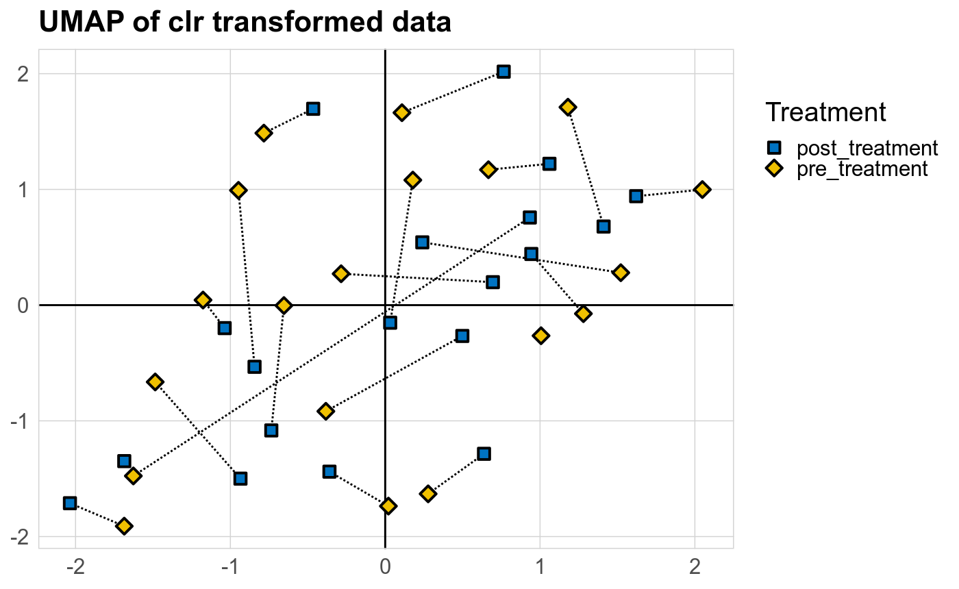 The supervised methods Adonis and Redundancy analysis (RDA) were used to assess if variance in microbial community composition can be attributed to the study condition. NMDS, PCoA and Adonis were run on Bray-Curtis dissimilarities. A short introduction of the used methods can be found at the GUide to STatistical Analysis in Microbial Ecology (GUSTA ME). Sparse Partial Least Square Discriminant Analysis (sPLS-DA) from the MixMc package was additionaly used to extract features associated with the study condition.