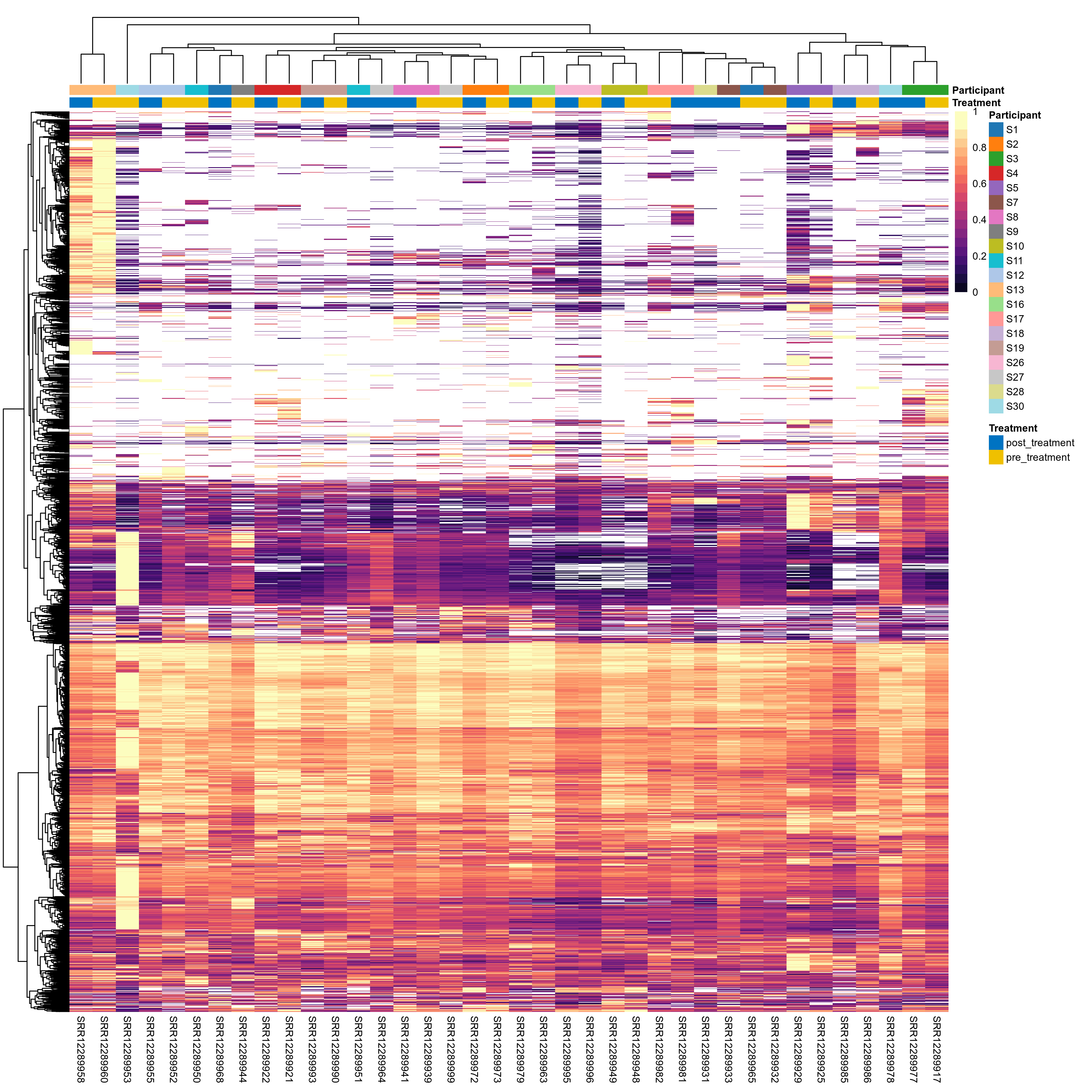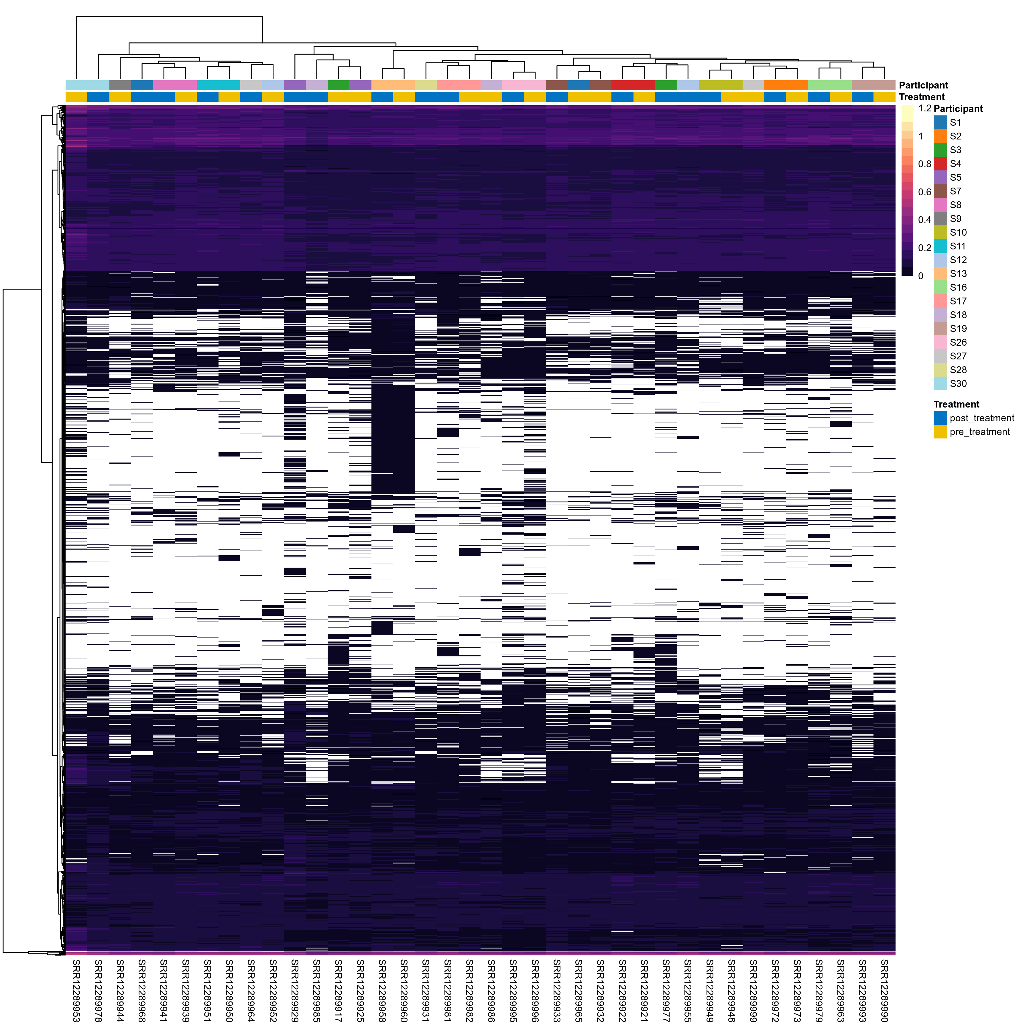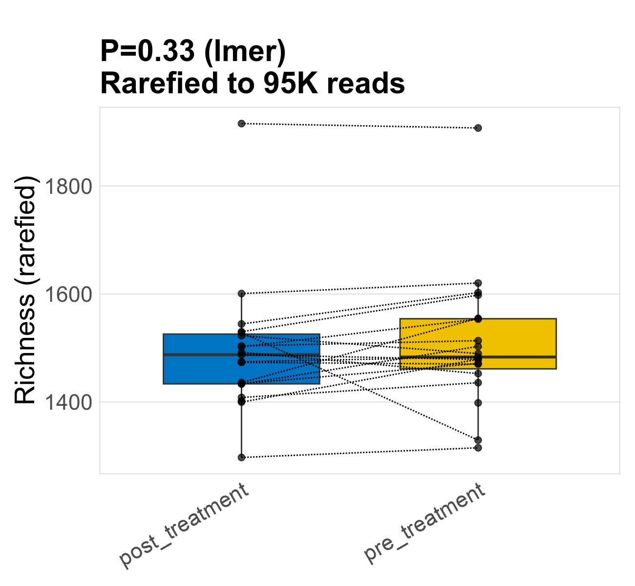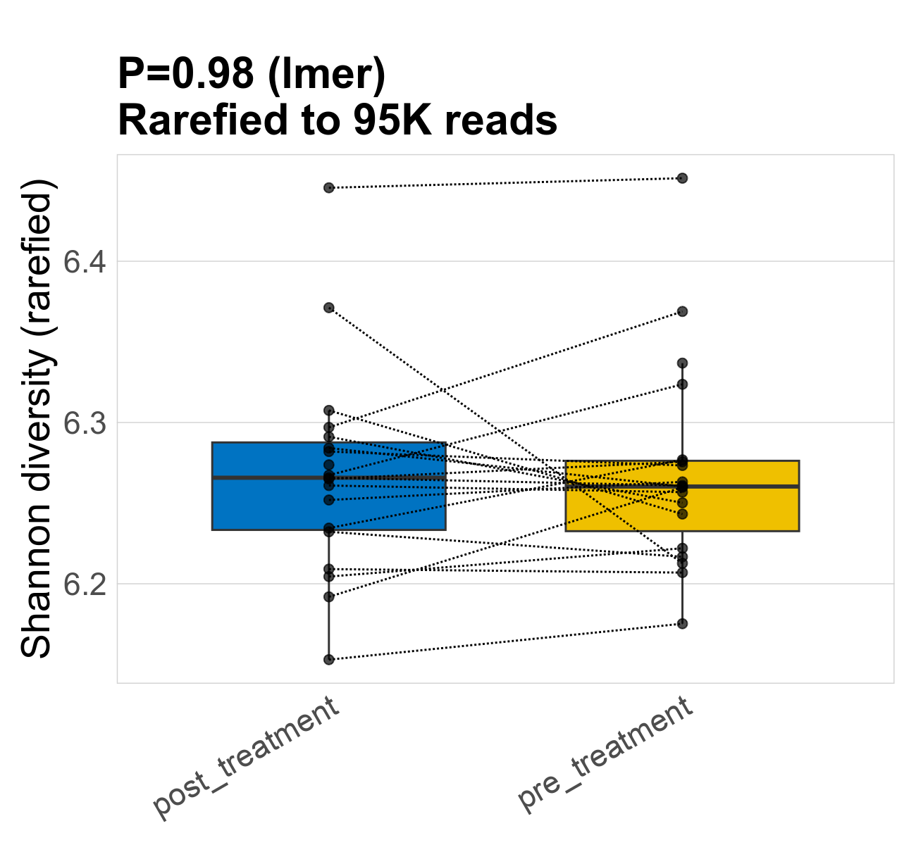 | Index | rarefiedTo | P lmer condition effect | Mean Pos | Mean Abundance | Median Abundance | Mean Treatmentpost_treatment | Median Treatmentpost_treatment | SD Treatmentpost_treatment | Mean Treatmentpre_treatment | Median Treatmentpre_treatment | SD Treatmentpre_treatment | Fold Change Log2(Treatmentpre_treatment/Treatmentpost_treatment) | Positive samples | Positive Treatmentpost_treatment | Positive Treatmentpre_treatment | Positive_Treatmentpost_treatment_percent | Positive_Treatmentpre_treatment_percent |
