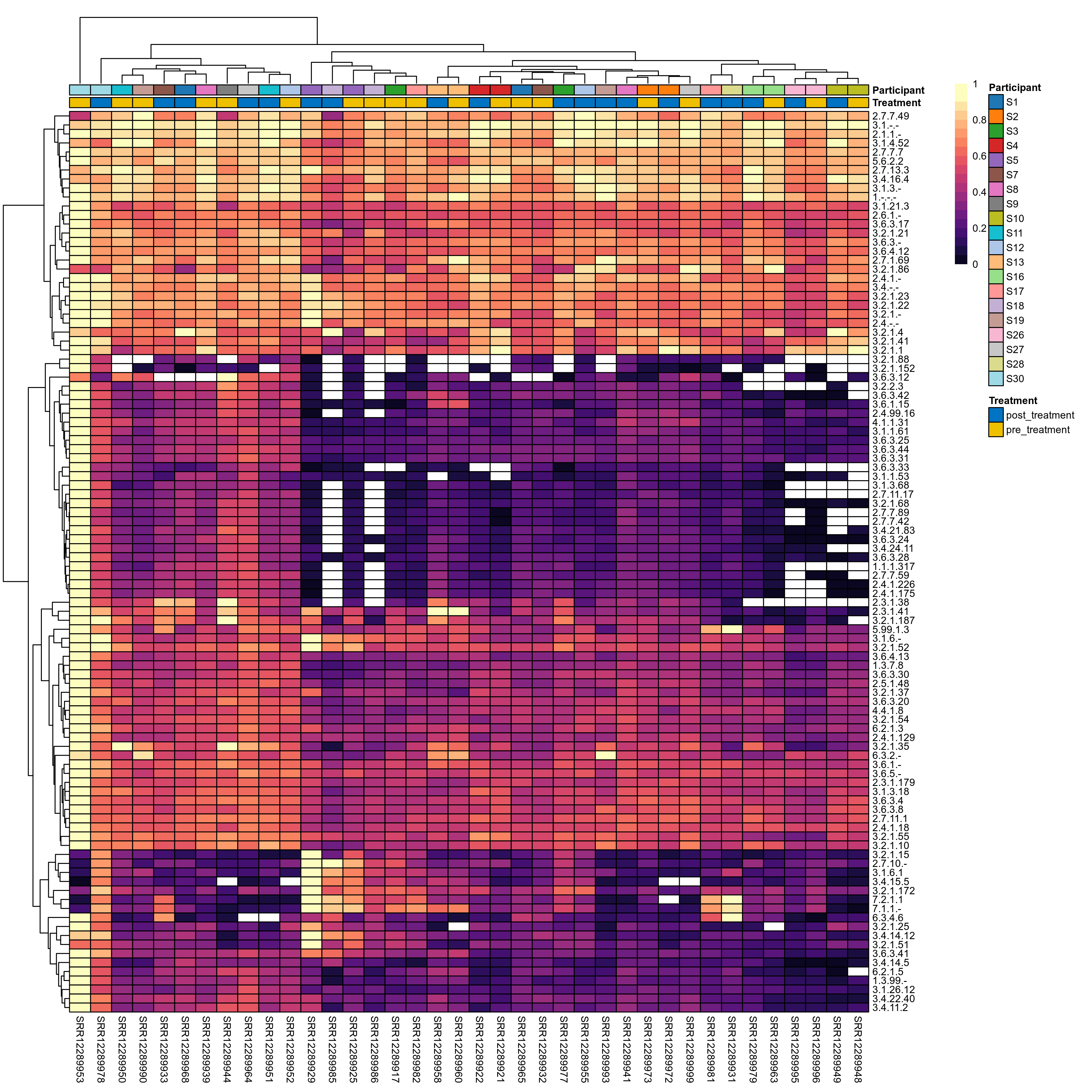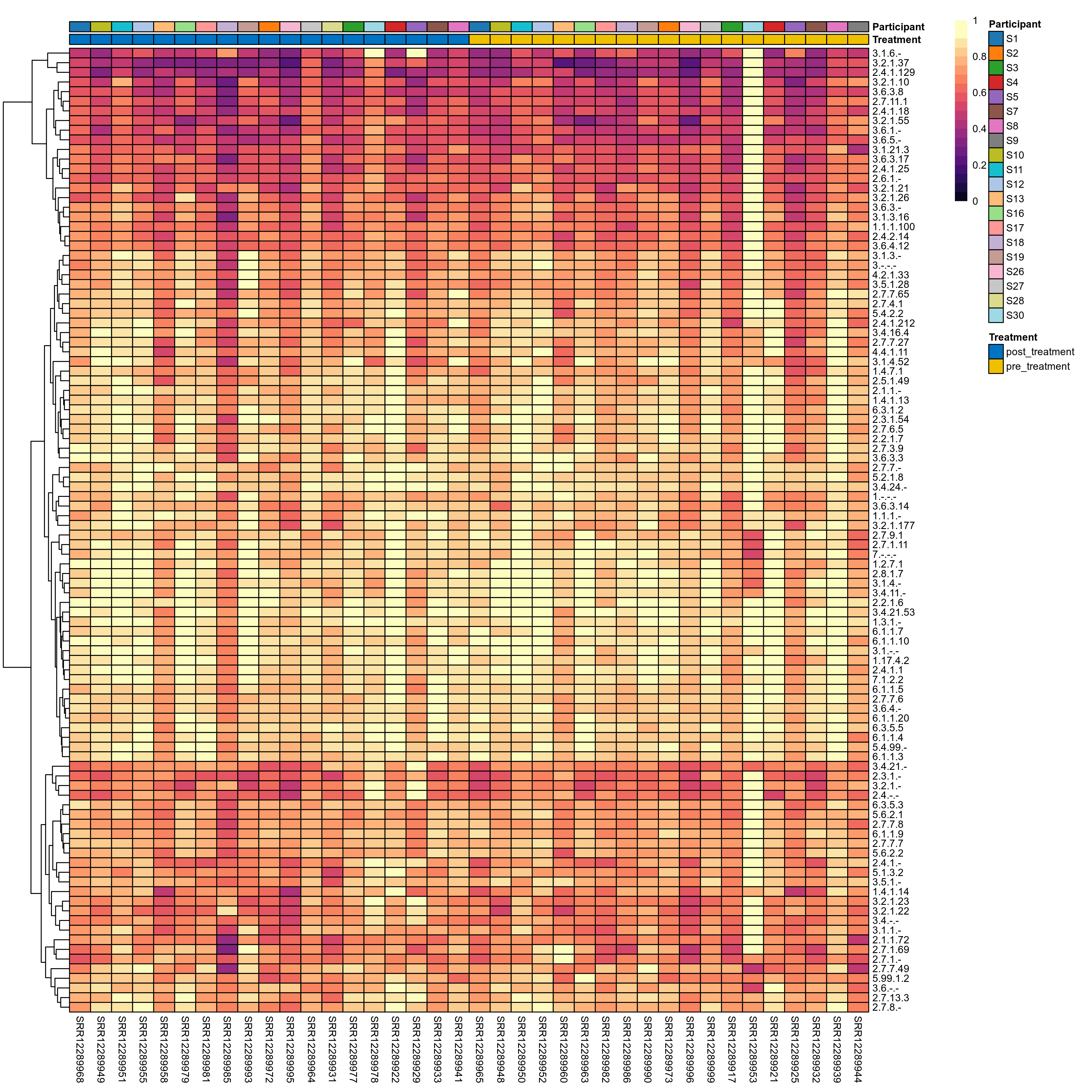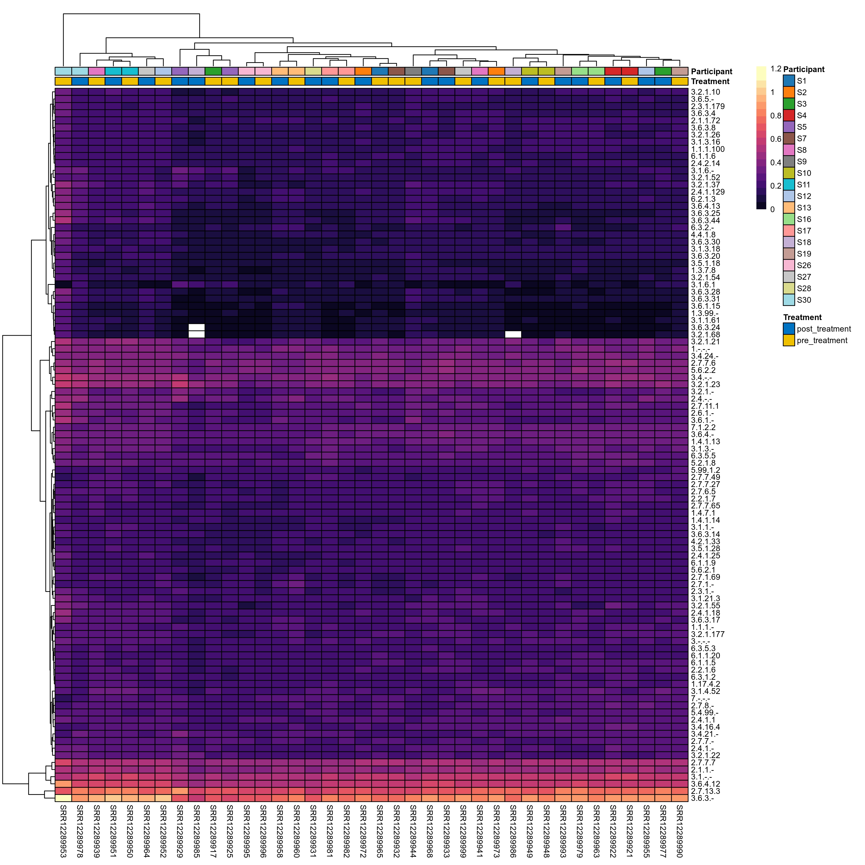 | Function | Annotation | P lmer condition effect (sqrt) | FDR lmer condition effect (sqrt) | Pbonf lmer condition effect (sqrt) | P lmer condition effect (clr) | FDR lmer condition effect (clr) | Pbonf lmer condition effect (clr) | Mean Pos | Mean Abundance | Median Abundance | Mean Treatmentpost_treatment | Median Treatmentpost_treatment | SD Treatmentpost_treatment | Mean Treatmentpre_treatment | Median Treatmentpre_treatment | SD Treatmentpre_treatment | Fold Change Log2(Treatmentpre_treatment/Treatmentpost_treatment) | Positive samples | Positive Treatmentpost_treatment | Positive Treatmentpre_treatment | Positive_Treatmentpost_treatment_percent | Positive_Treatmentpre_treatment_percent |