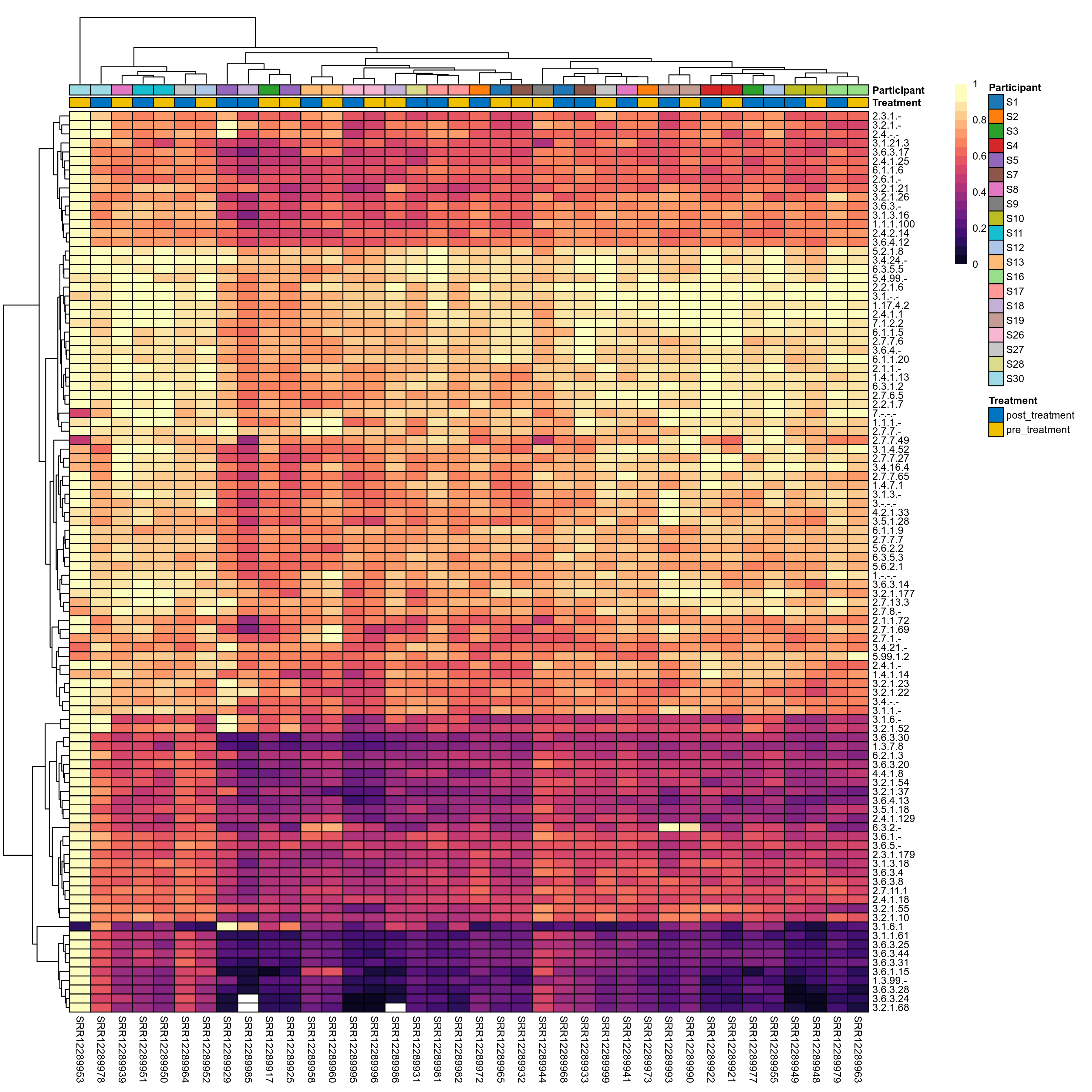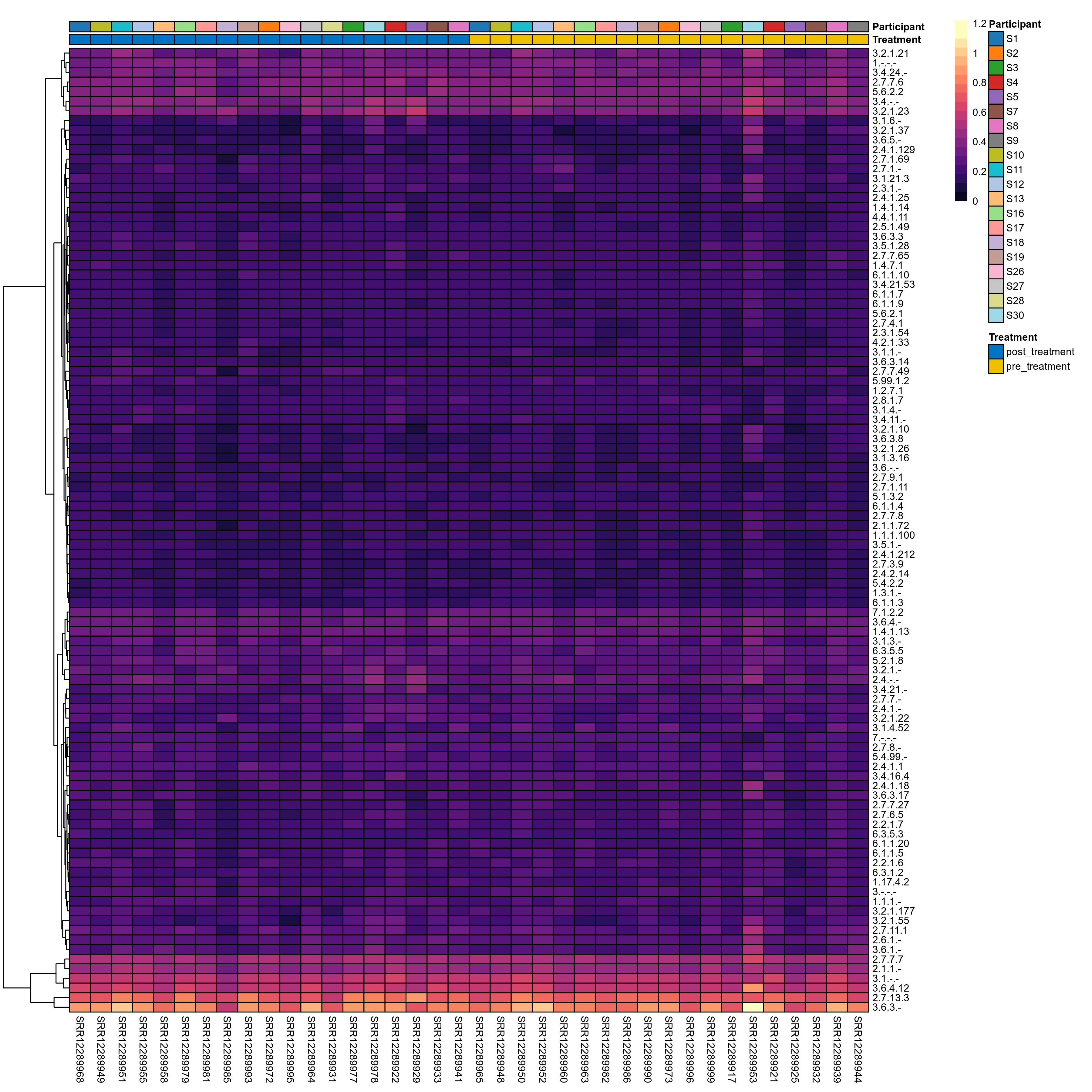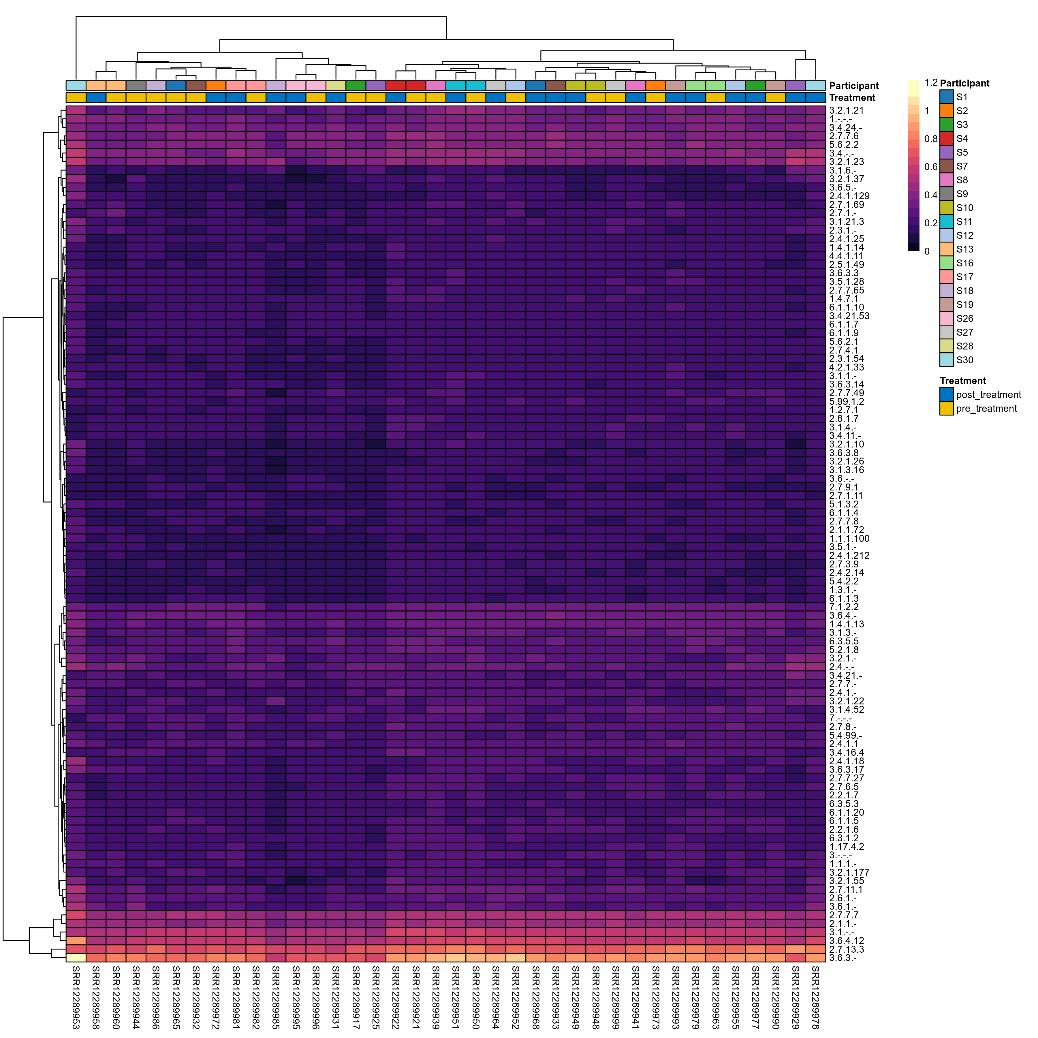 | Function | Annotation | P lmer condition effect (sqrt) | FDR lmer condition effect (sqrt) | Pbonf lmer condition effect (sqrt) | P lmer condition effect (clr) | FDR lmer condition effect (clr) | Pbonf lmer condition effect (clr) | Mean Pos | Mean Abundance | Median Abundance | Mean Treatmentpost_treatment | Median Treatmentpost_treatment | SD Treatmentpost_treatment | Mean Treatmentpre_treatment | Median Treatmentpre_treatment | SD Treatmentpre_treatment | Fold Change Log2(Treatmentpre_treatment/Treatmentpost_treatment) | Positive samples | Positive Treatmentpost_treatment | Positive Treatmentpre_treatment | Positive_Treatmentpost_treatment_percent | Positive_Treatmentpre_treatment_percent |