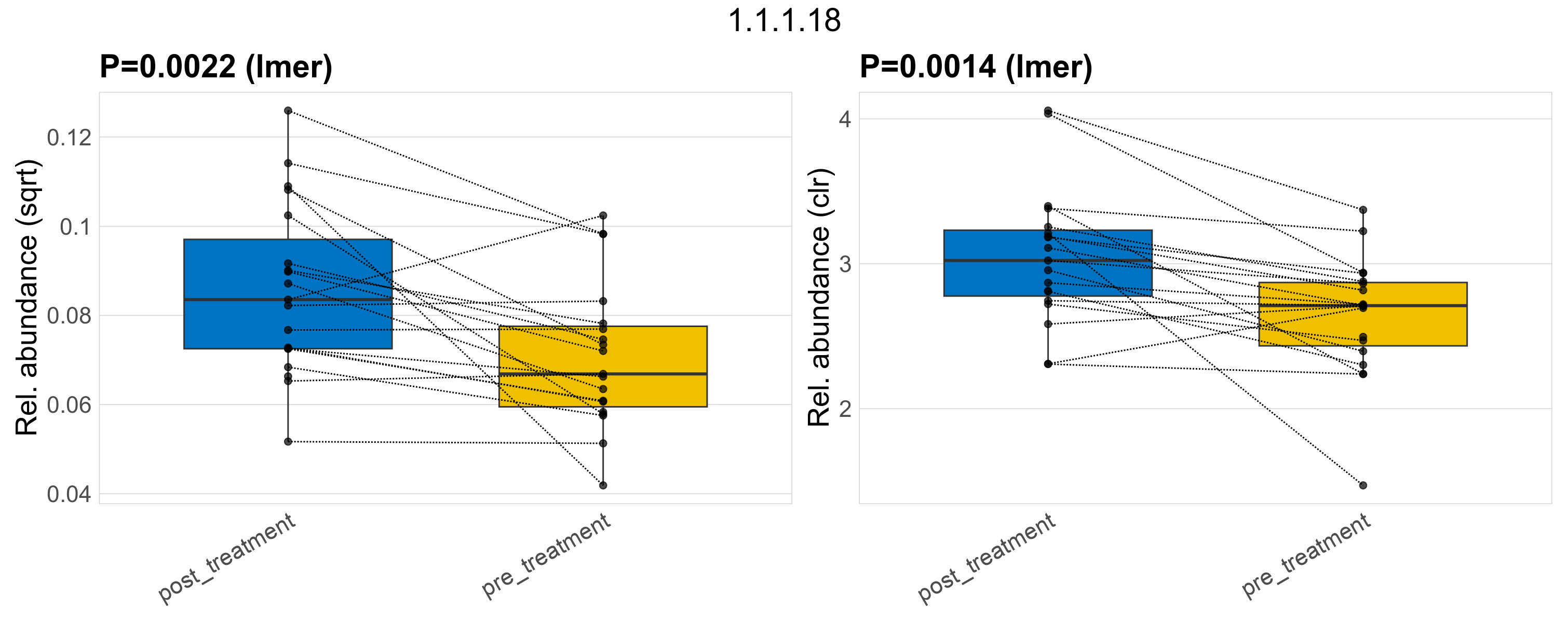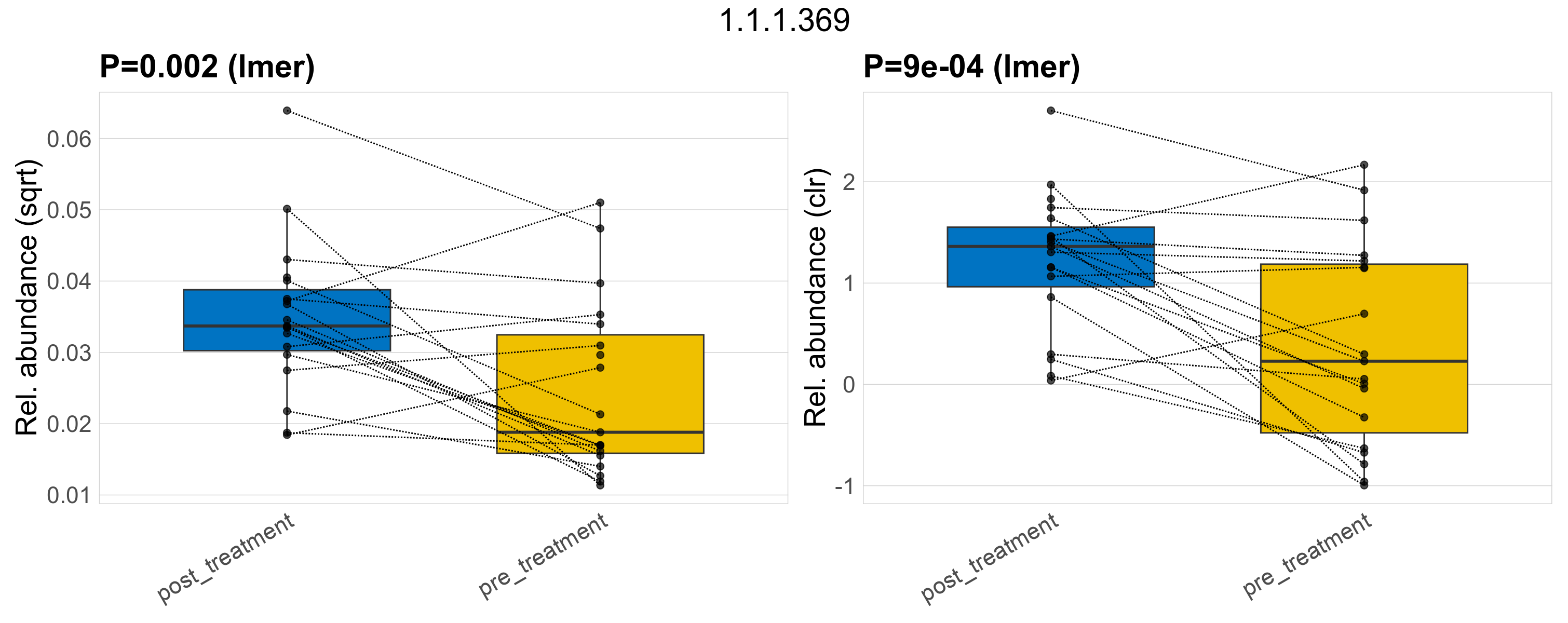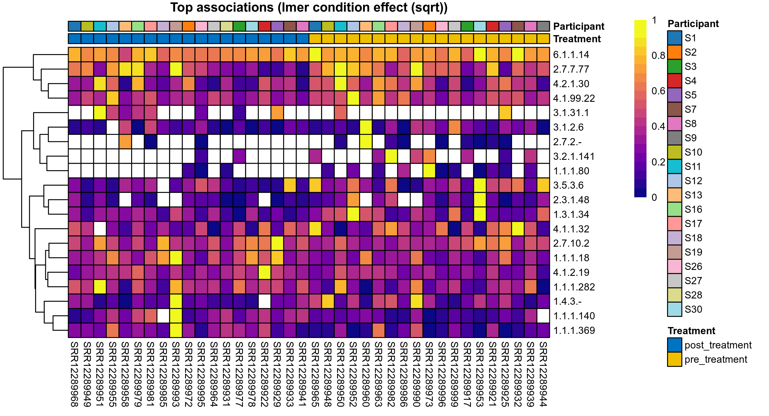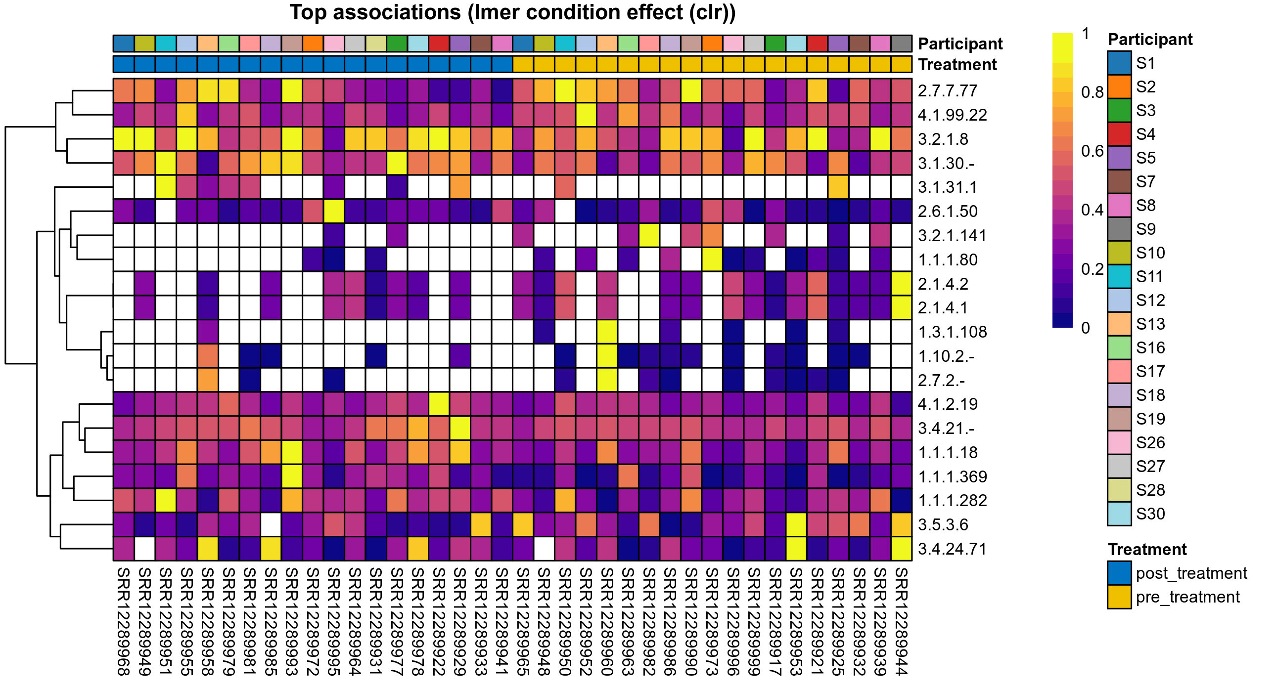 P lmer condition effect (clr): Differentially abundant functions were identified by linear mixed effect regression without confounders. Random effects: Participant (intercept). Fixed effects: Treatment. Effect tested: Treatment.