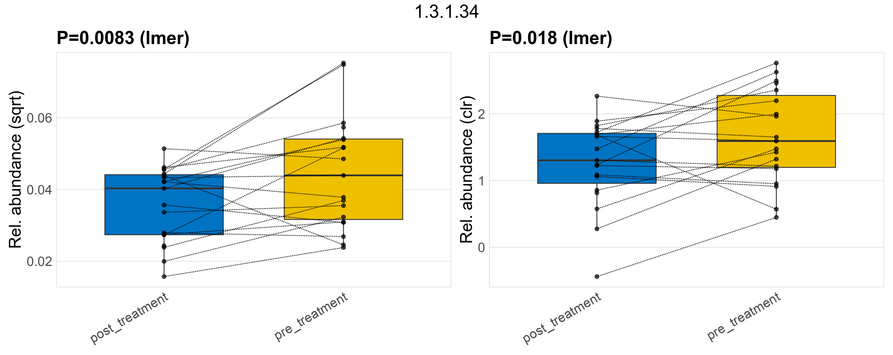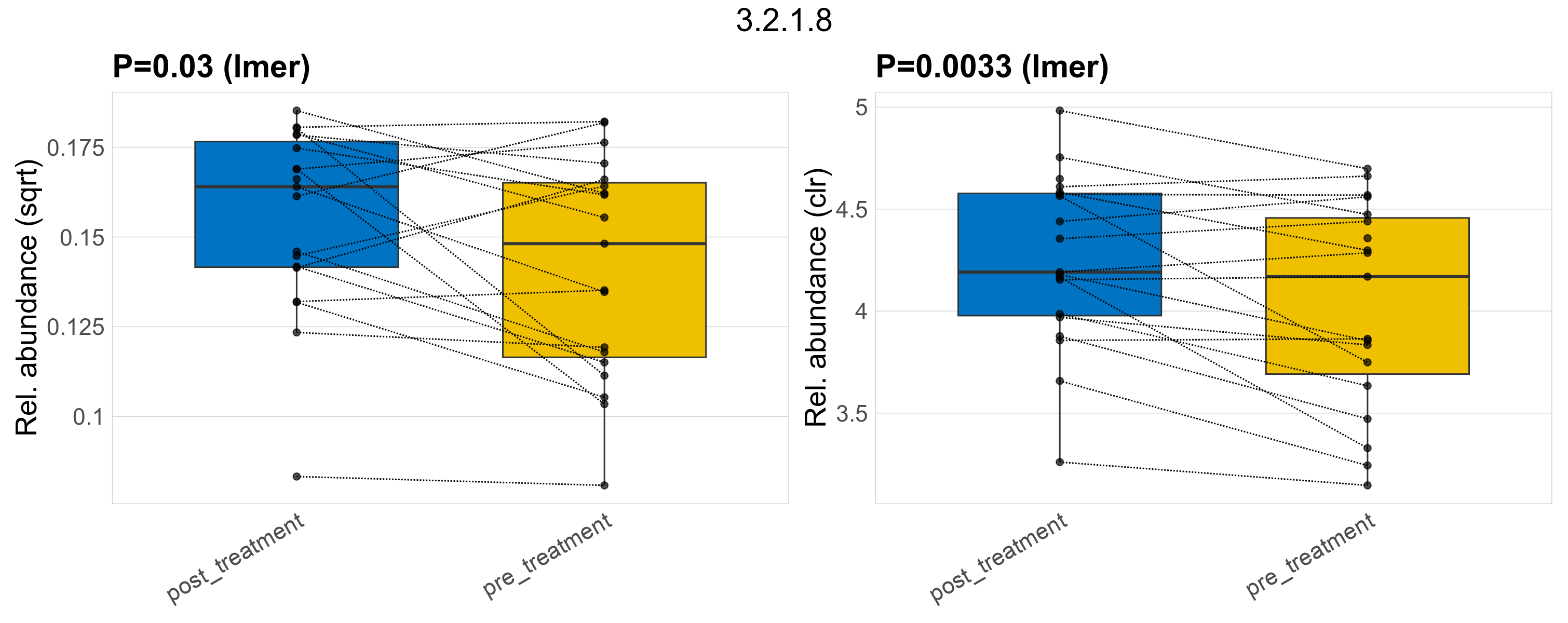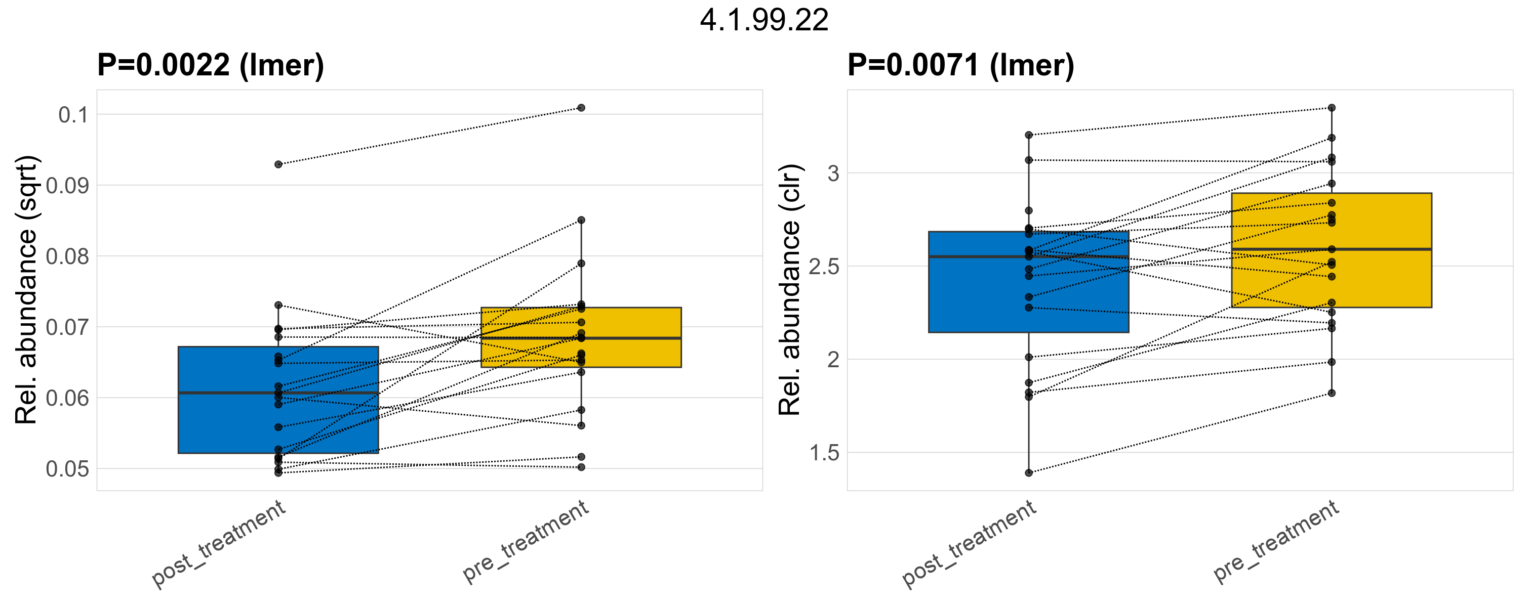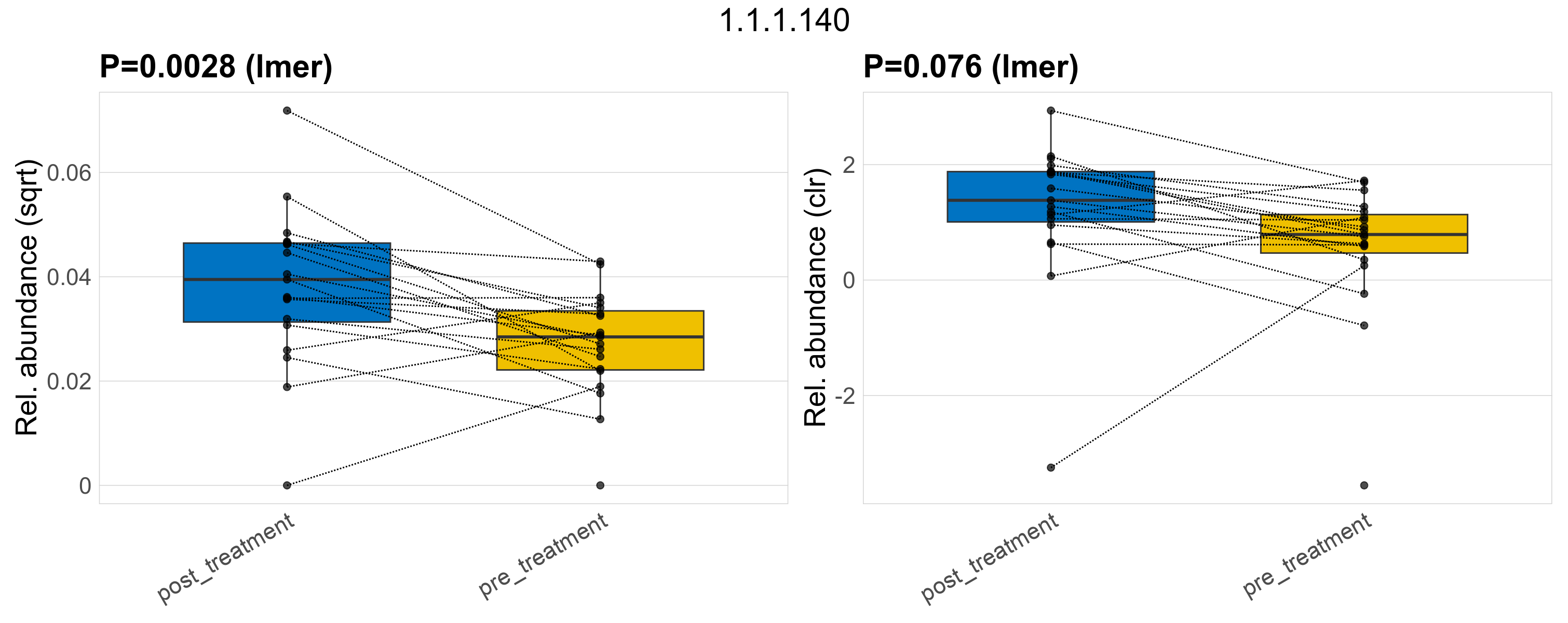 P lmer condition effect (clr): Differentially abundant functions were identified by linear mixed effect regression without confounders. Random effects: Participant (intercept). Fixed effects: Treatment. Effect tested: Treatment.