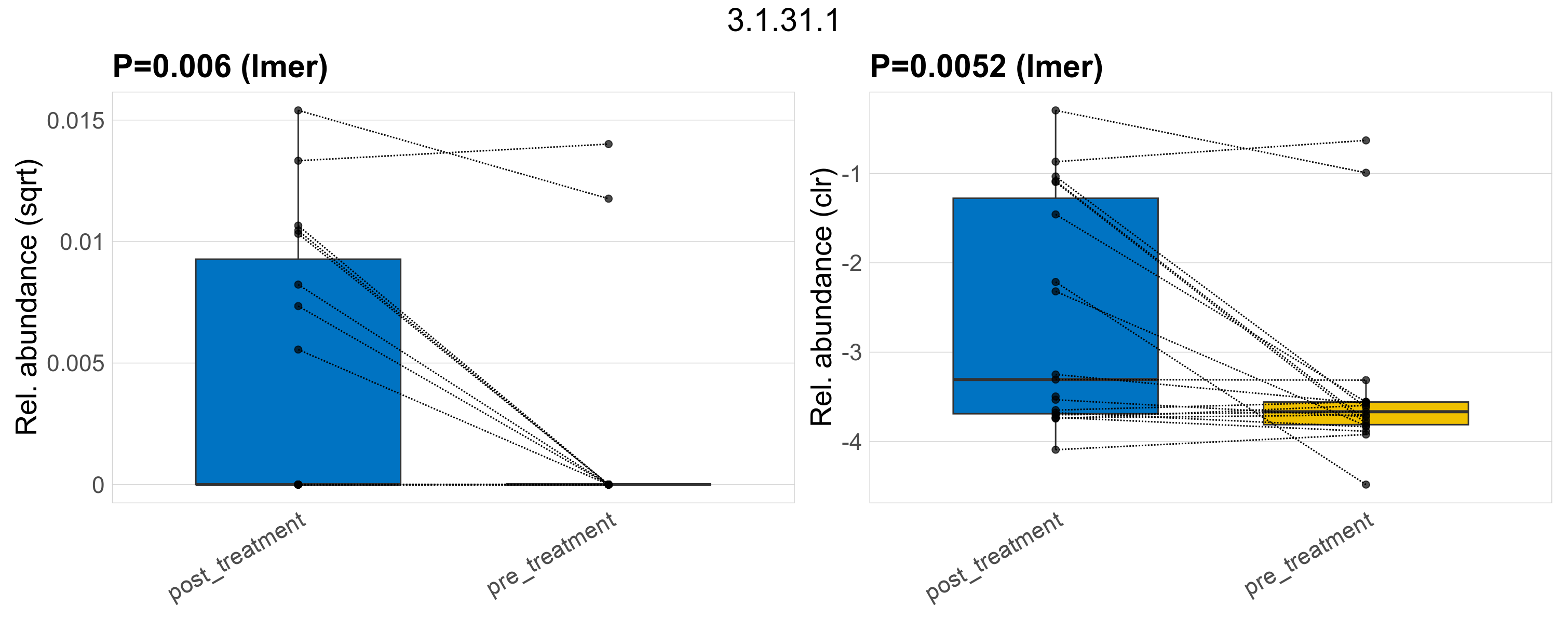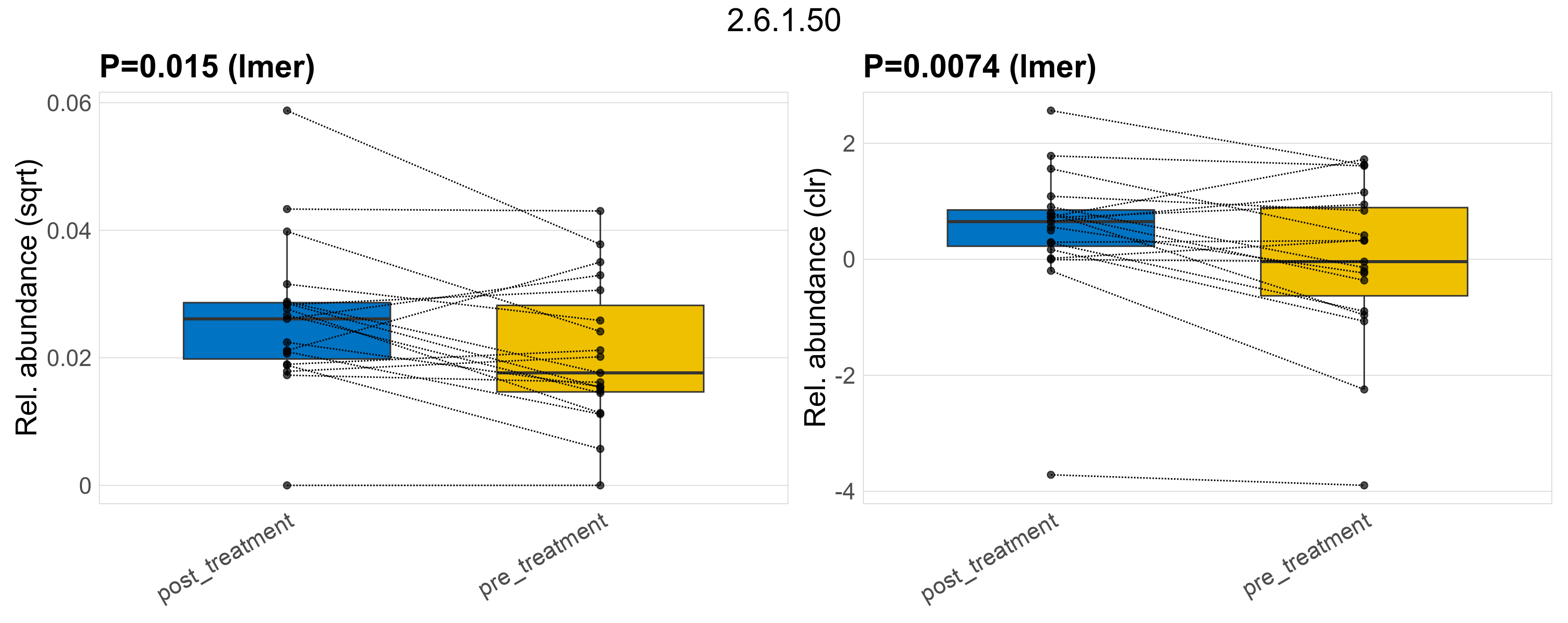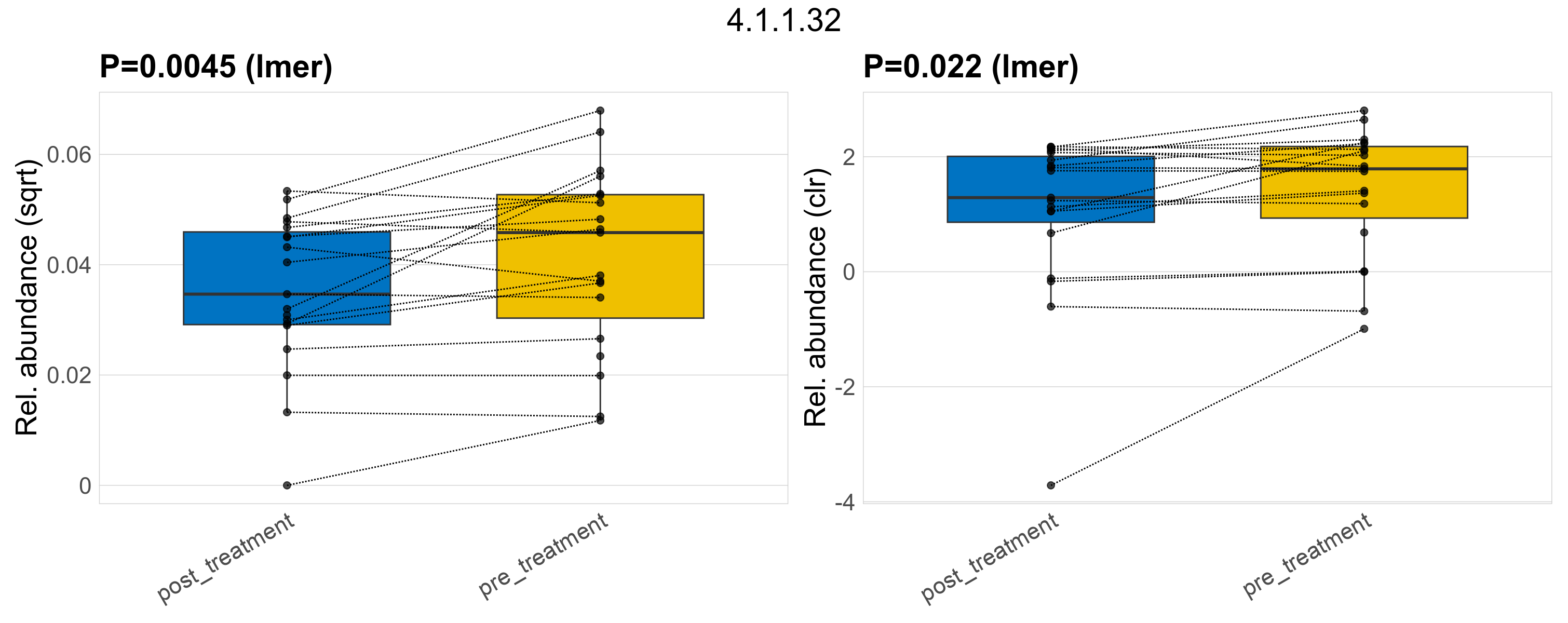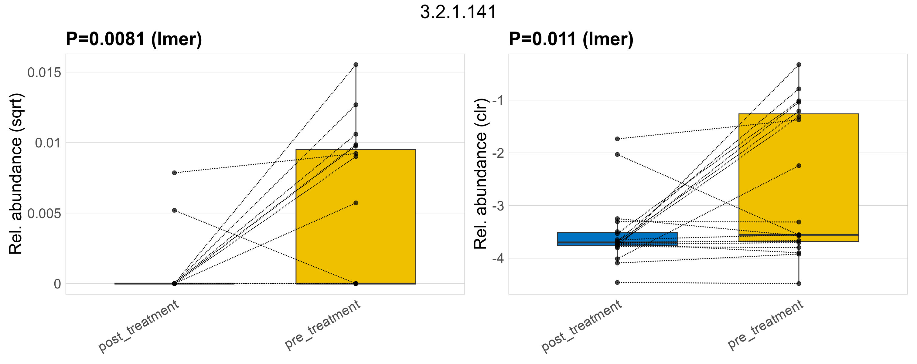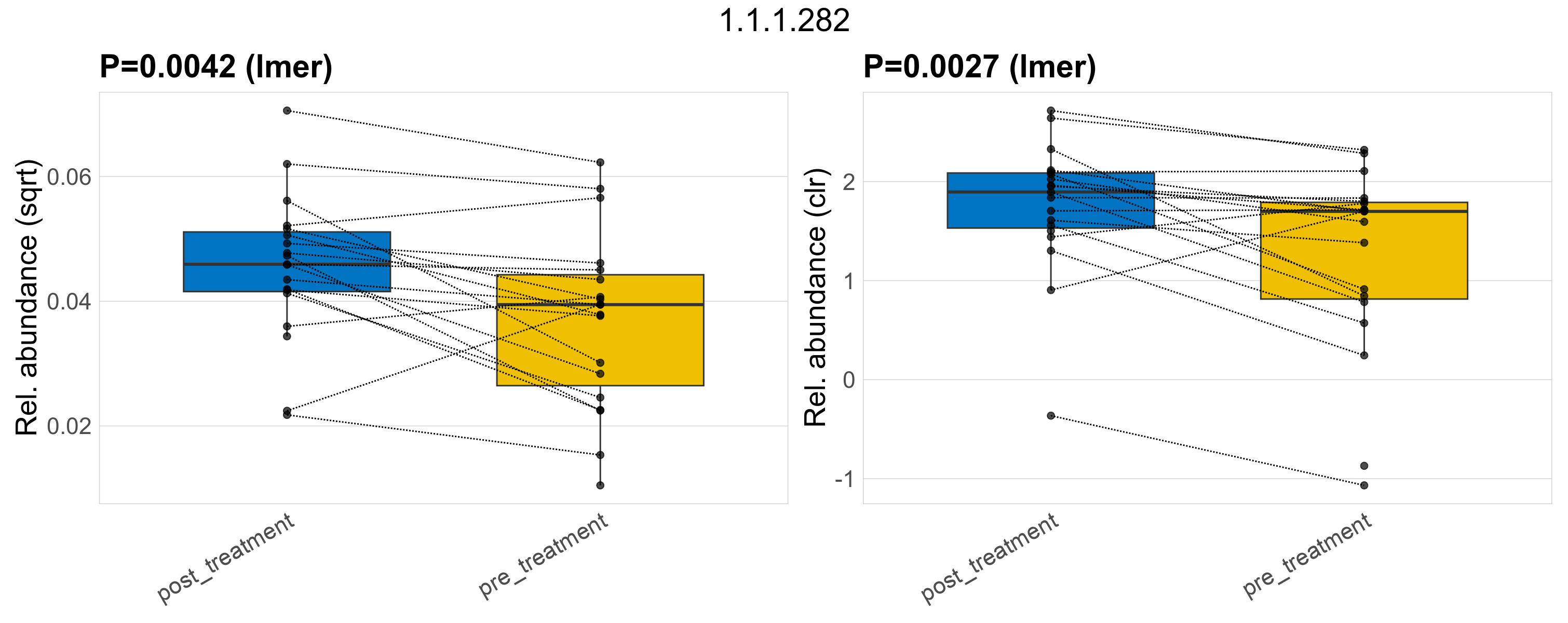 P lmer condition effect (clr): Differentially abundant functions were identified by linear mixed effect regression without confounders. Random effects: Participant (intercept). Fixed effects: Treatment. Effect tested: Treatment.
