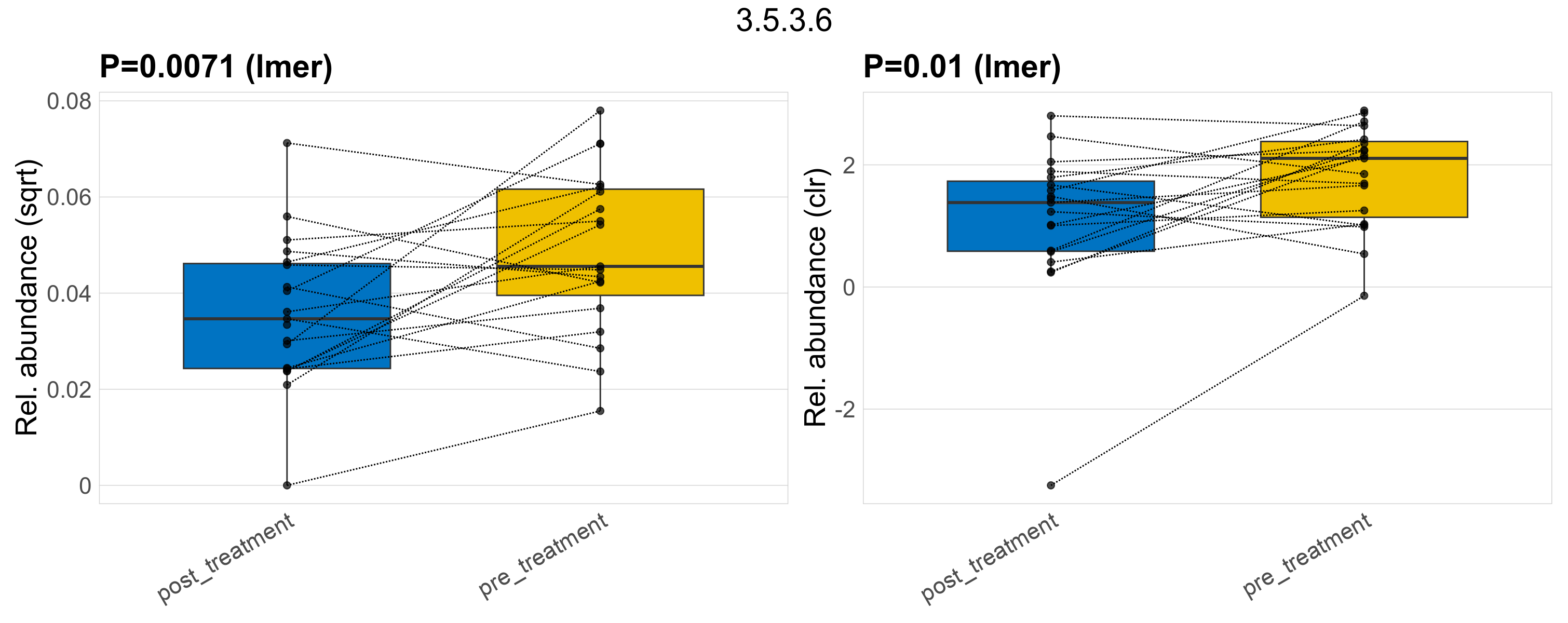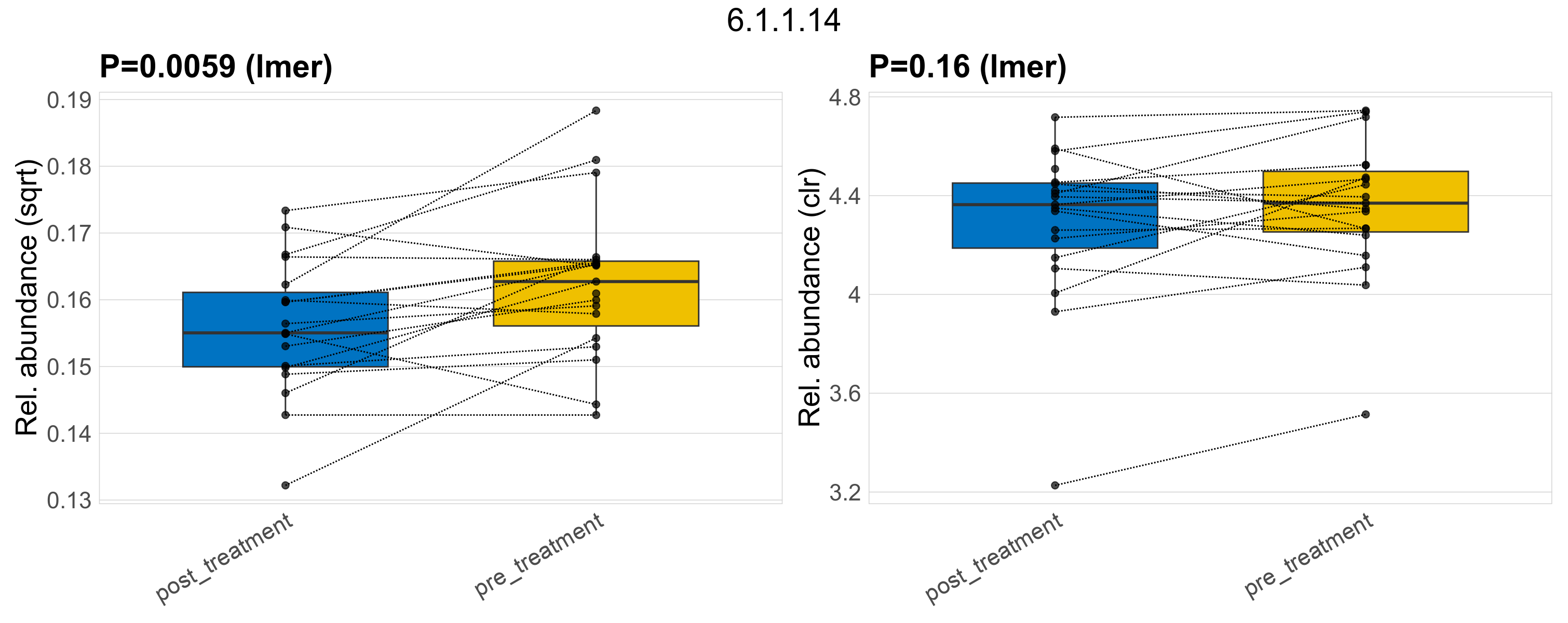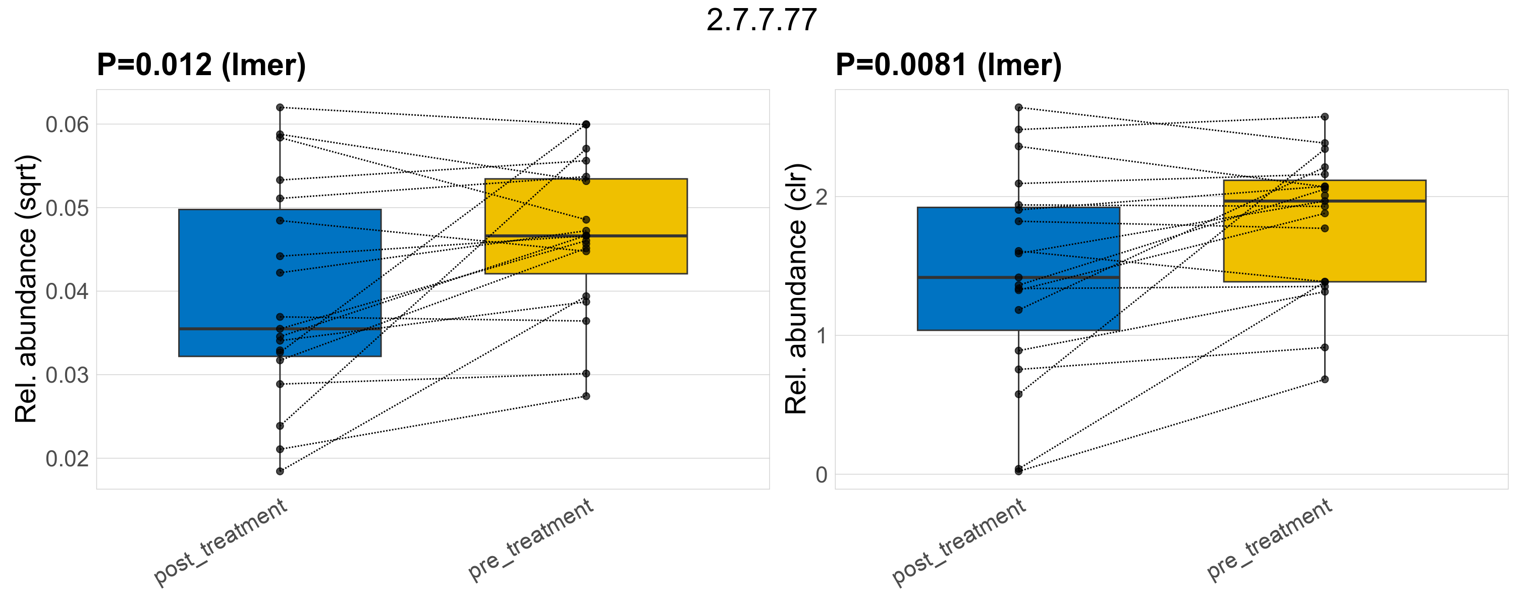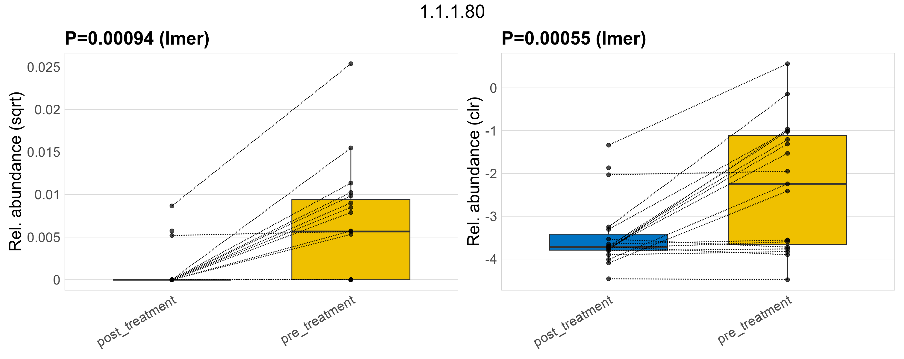 P lmer condition effect (clr): Differentially abundant functions were identified by linear mixed effect regression without confounders. Random effects: Participant (intercept). Fixed effects: Treatment. Effect tested: Treatment.