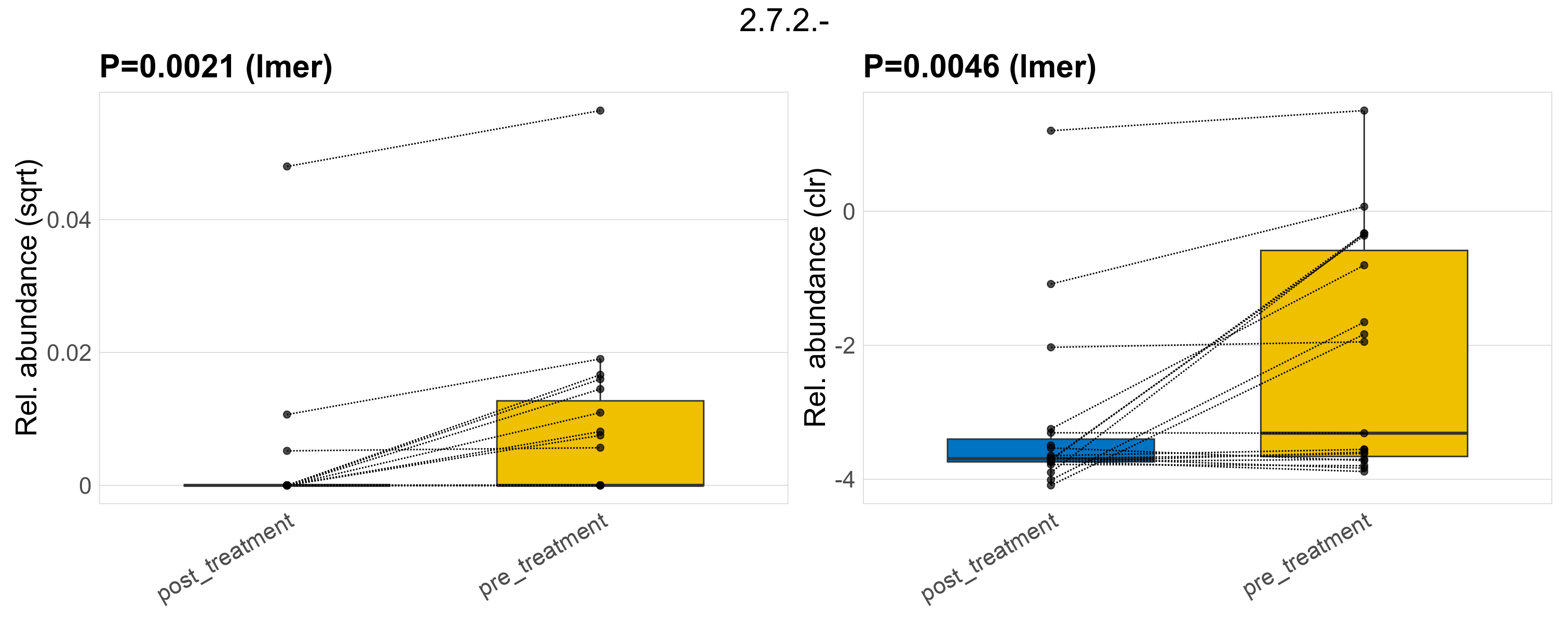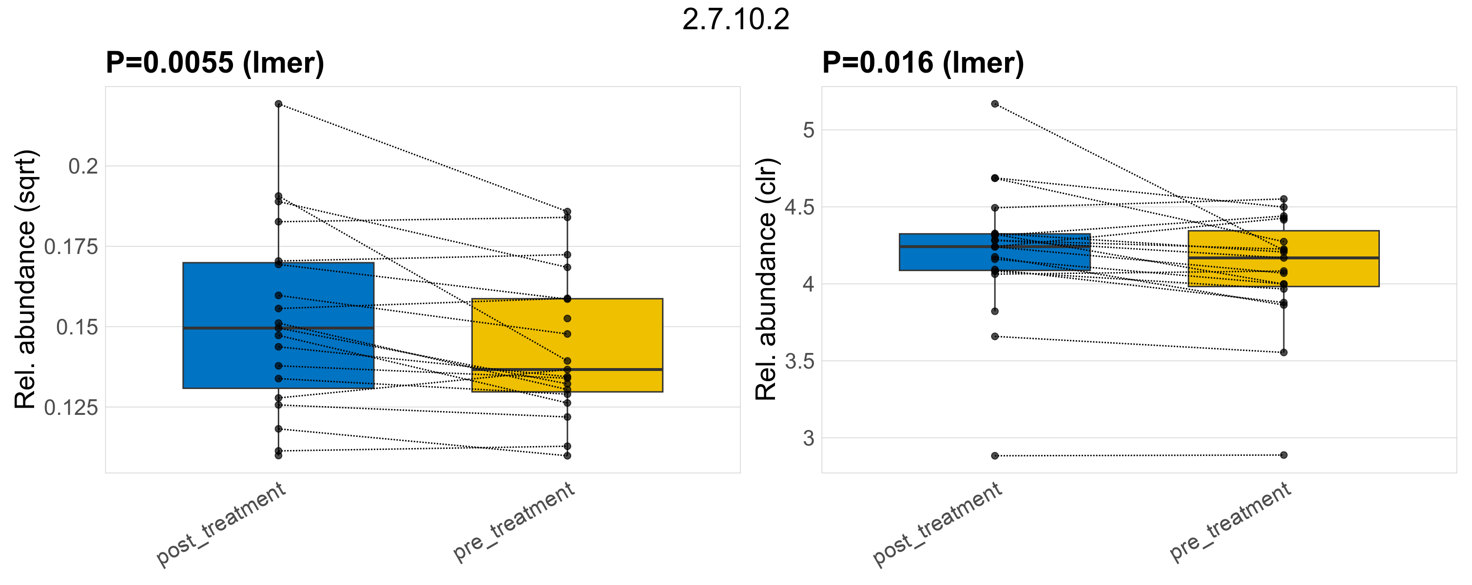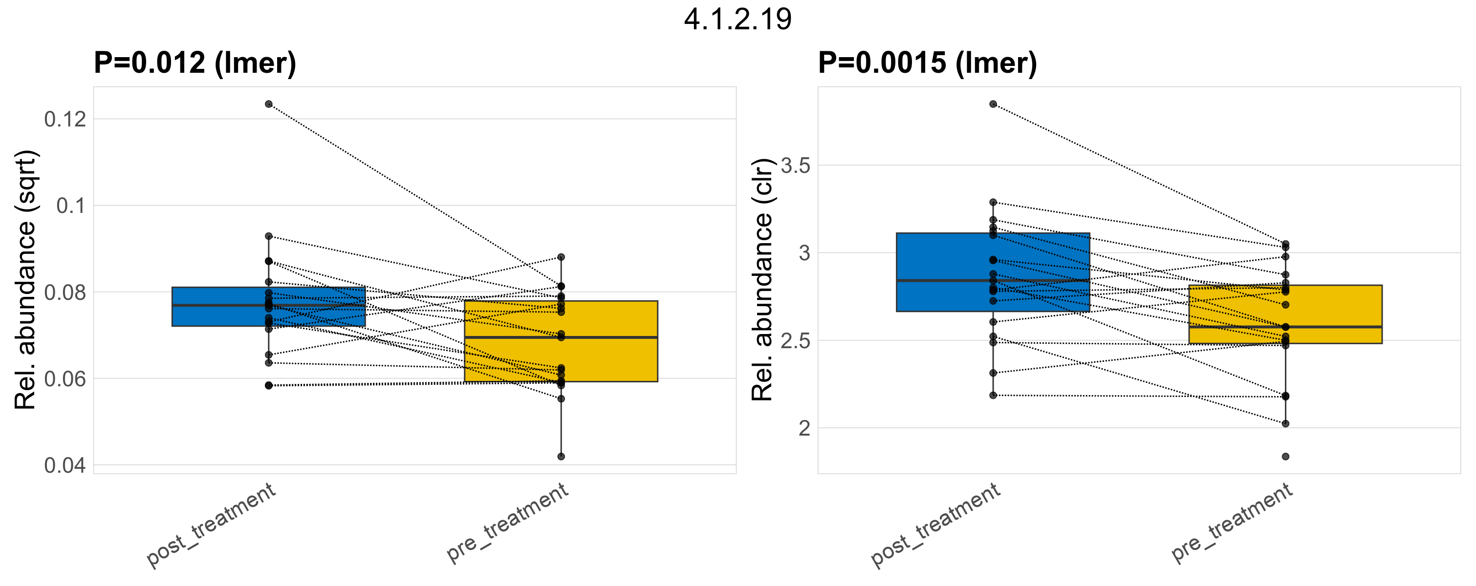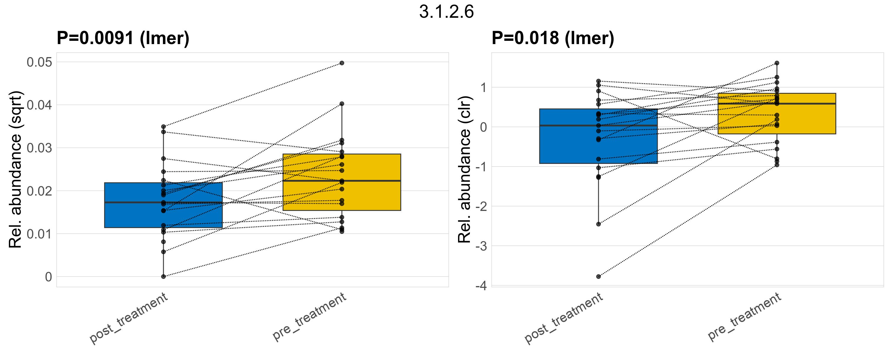 P lmer condition effect (clr): Differentially abundant functions were identified by linear mixed effect regression without confounders. Random effects: Participant (intercept). Fixed effects: Treatment. Effect tested: Treatment.