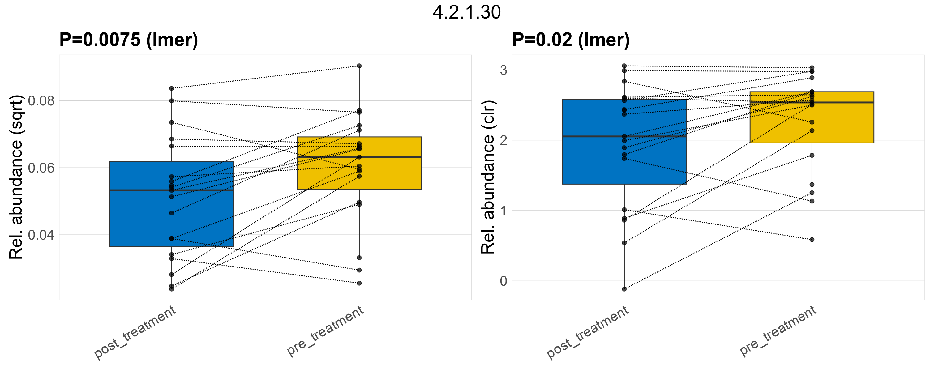 The following plots present the distribution of the top most differentially abundant microbial functions across all applied statistical analysis. Plots are ordered alphabetically.