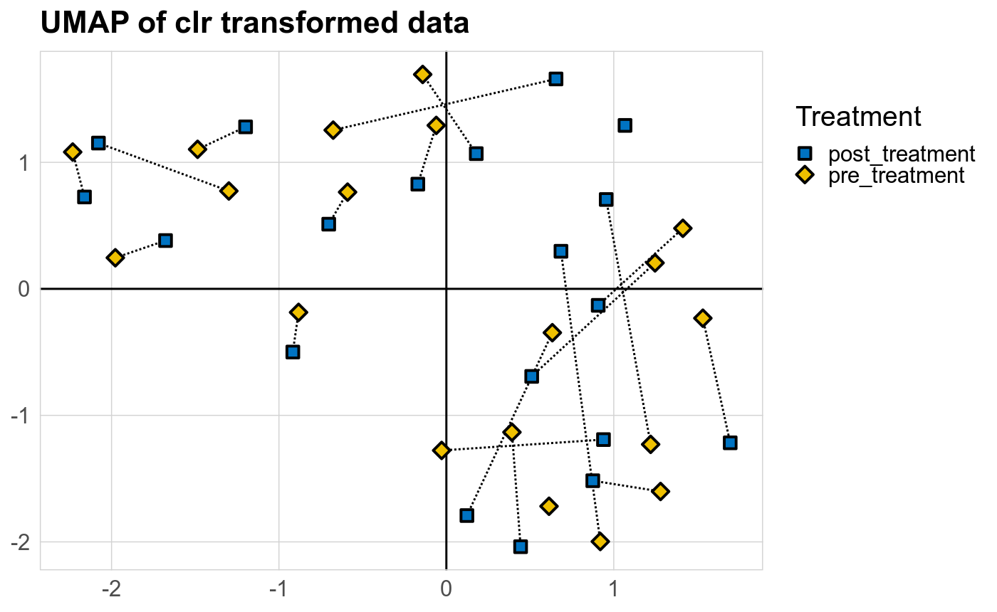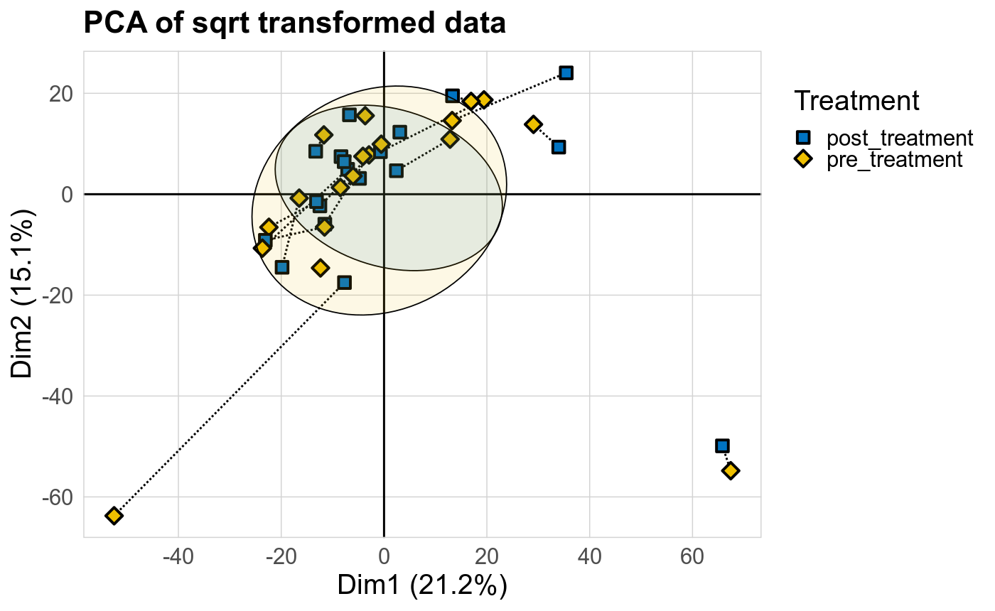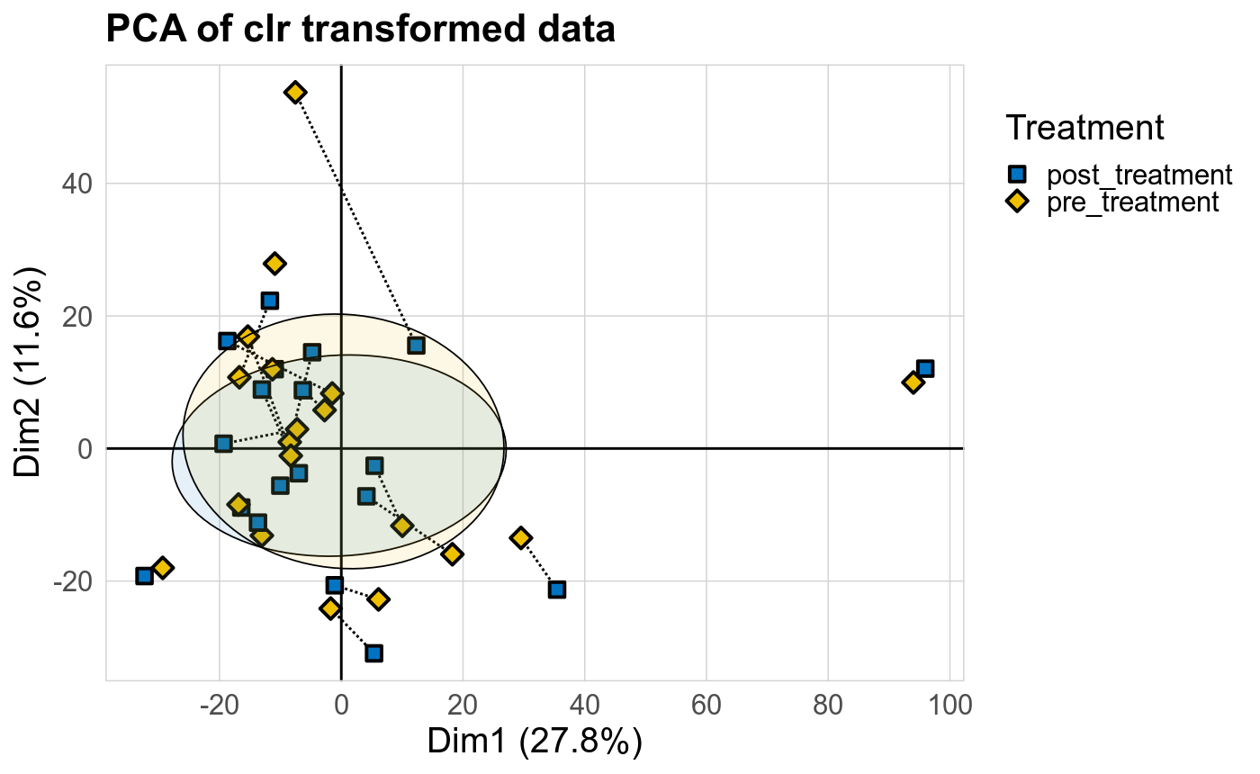 Microbial functions were analyzed using supervised and unsupervised multivariate techniques. Functional profiles were ordinated using the unsupervised methods Principal Coordinates Analysis (PCoA), Non-Metric Multidimensional Scaling (NMDS) and Principal Component Analysis (PCA). The supervised methods Adonis and Redundancy analysis (RDA) were used to assess if variance in the functional profiles was significantly associated with the study condition. A guide explaining these methods can be found here. Sparse Partial Least Square Discriminant Analysis (sPLS-DA) from the MixMc package was additionaly used to extract features associated with the condition of interest.
