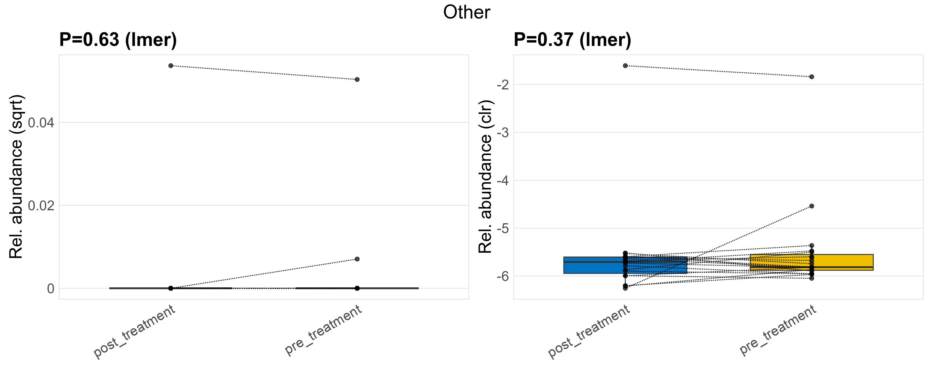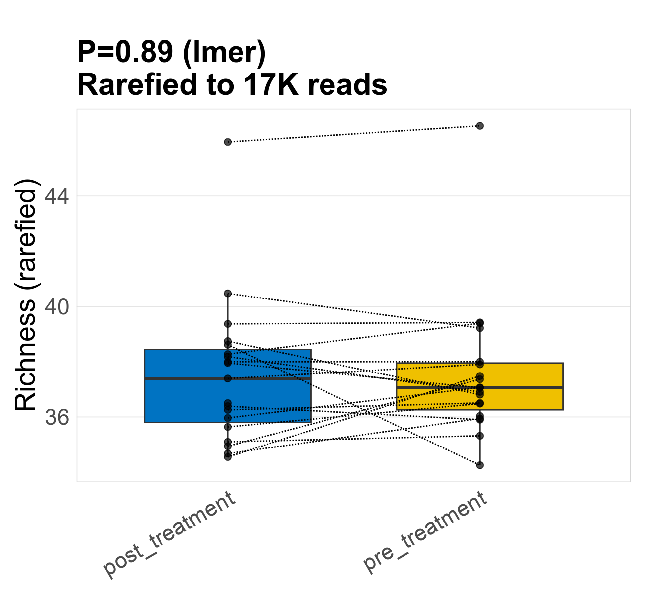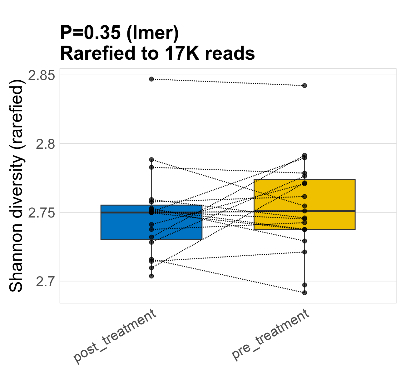 | Index | rarefiedTo | P lmer condition effect | Mean Pos | Mean Abundance | Median Abundance | Mean Treatmentpost_treatment | Median Treatmentpost_treatment | SD Treatmentpost_treatment | Mean Treatmentpre_treatment | Median Treatmentpre_treatment | SD Treatmentpre_treatment | Fold Change Log2(Treatmentpre_treatment/Treatmentpost_treatment) | Positive samples | Positive Treatmentpost_treatment | Positive Treatmentpre_treatment | Positive_Treatmentpost_treatment_percent | Positive_Treatmentpre_treatment_percent |