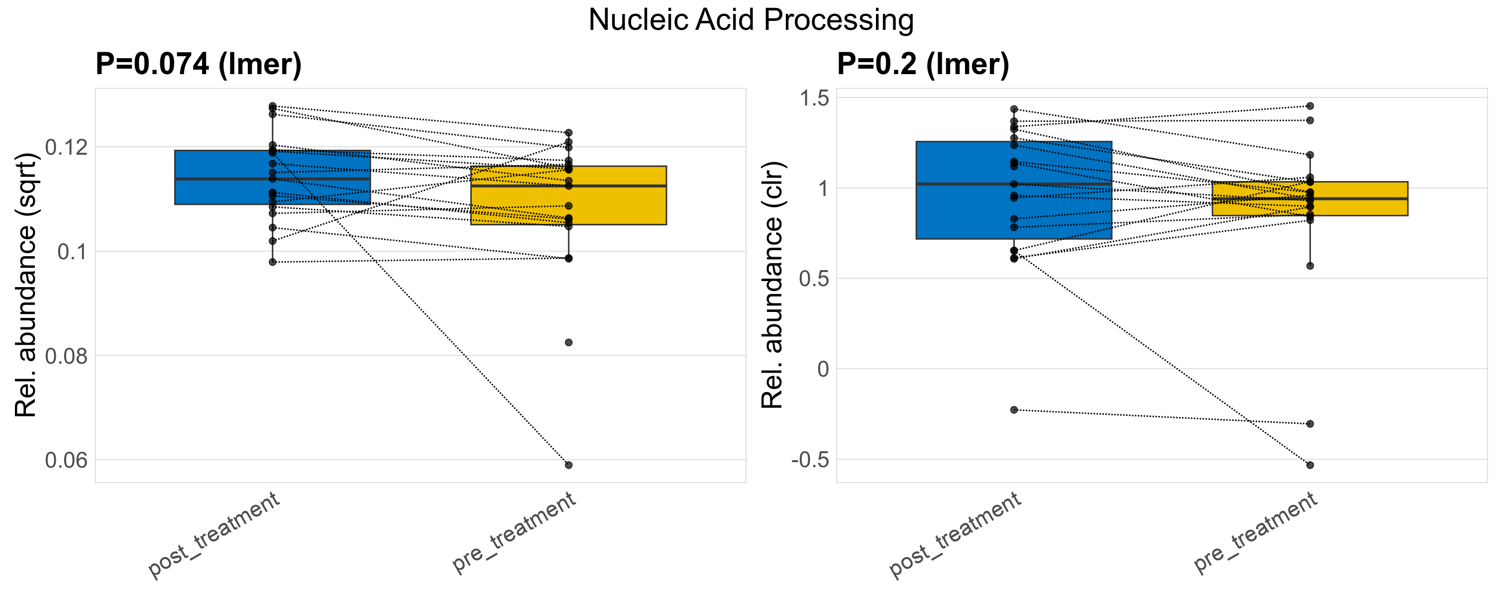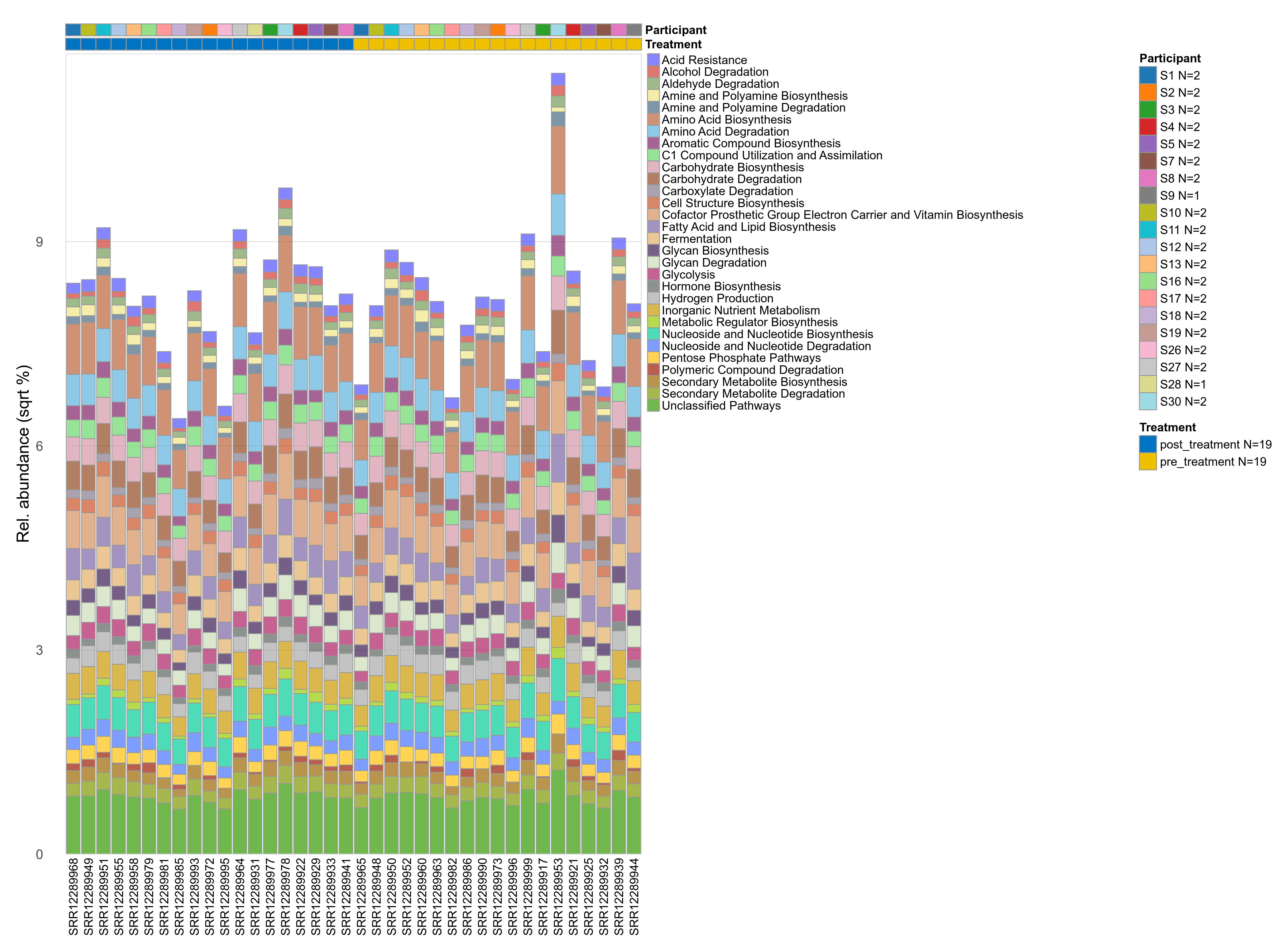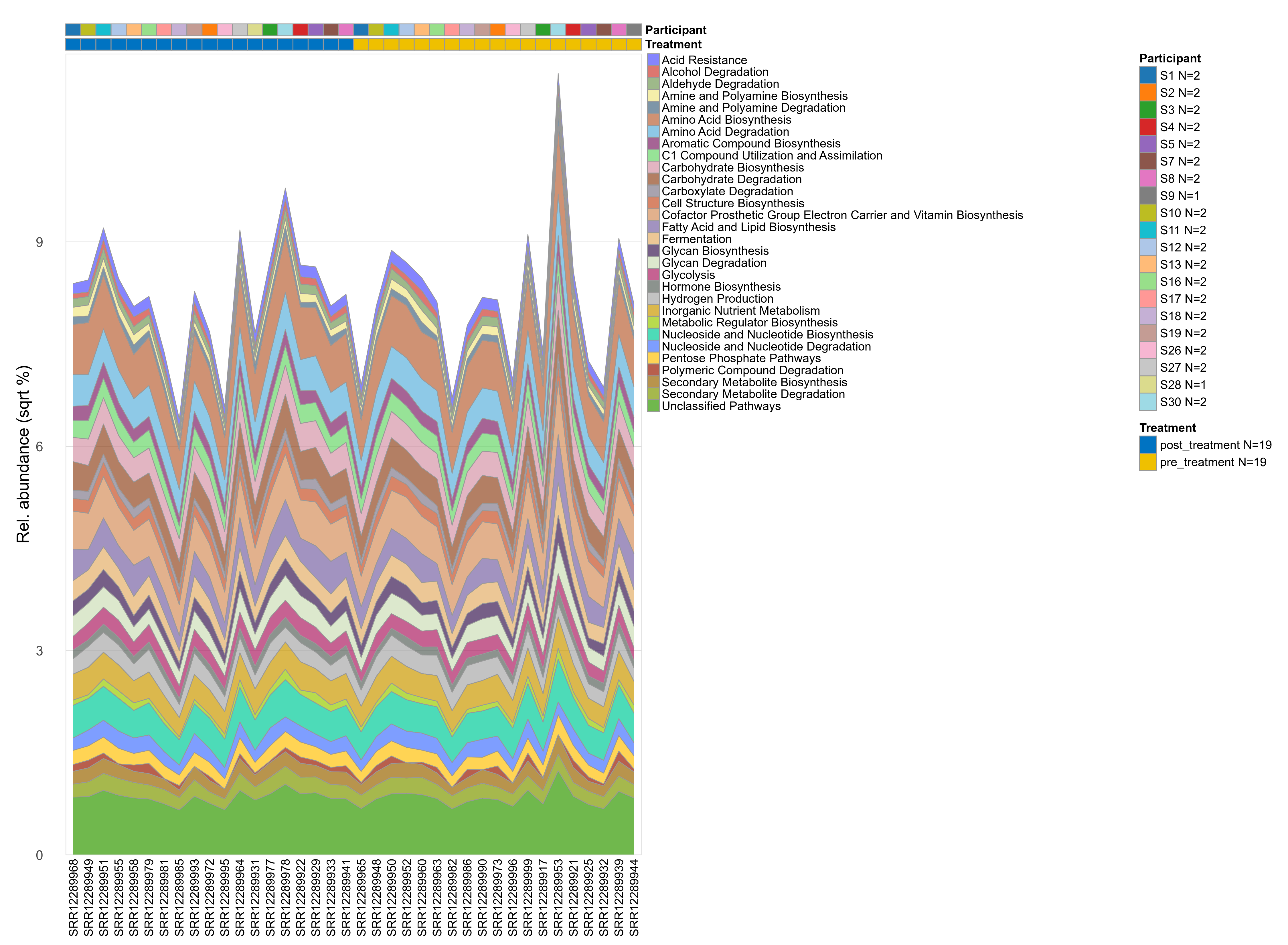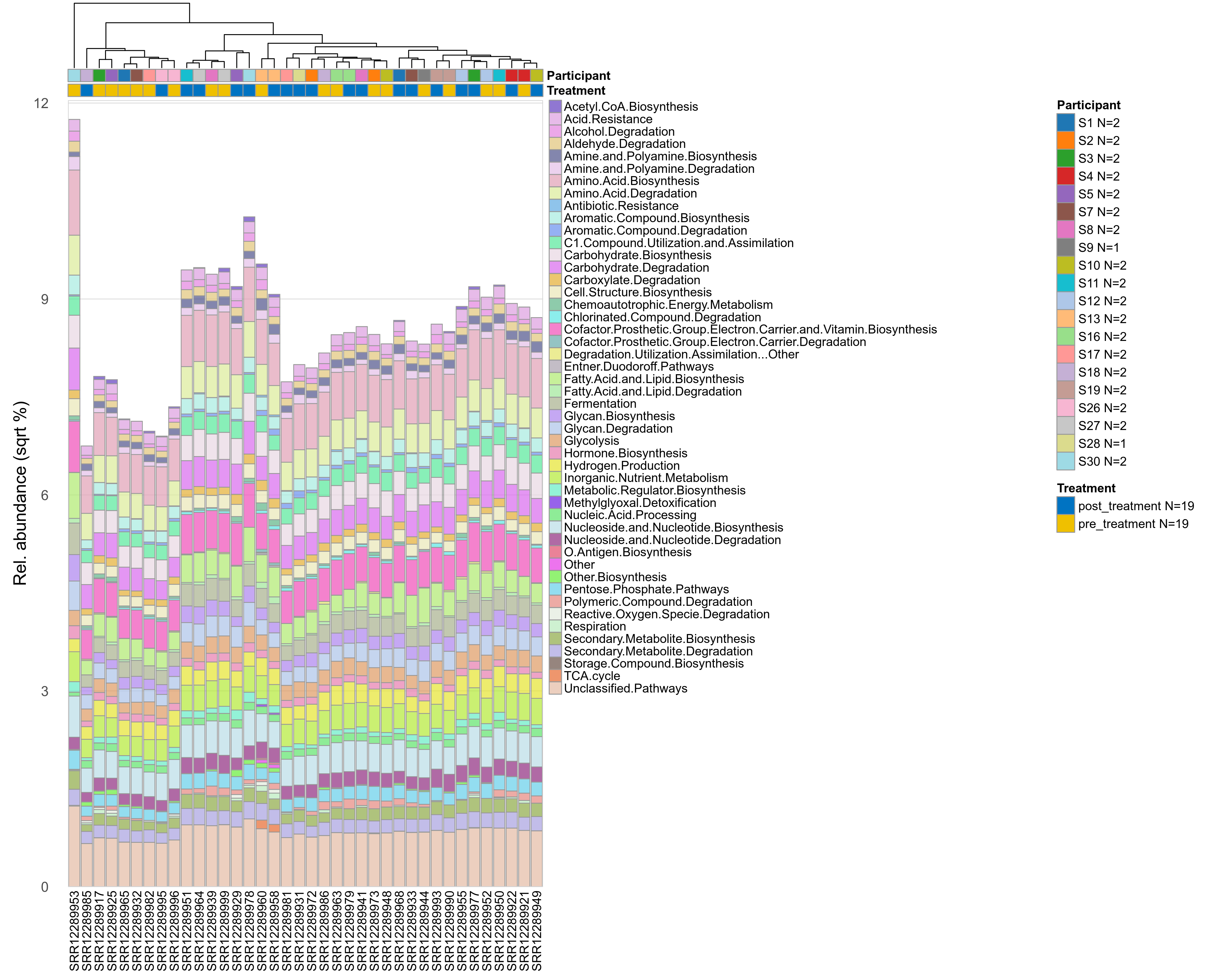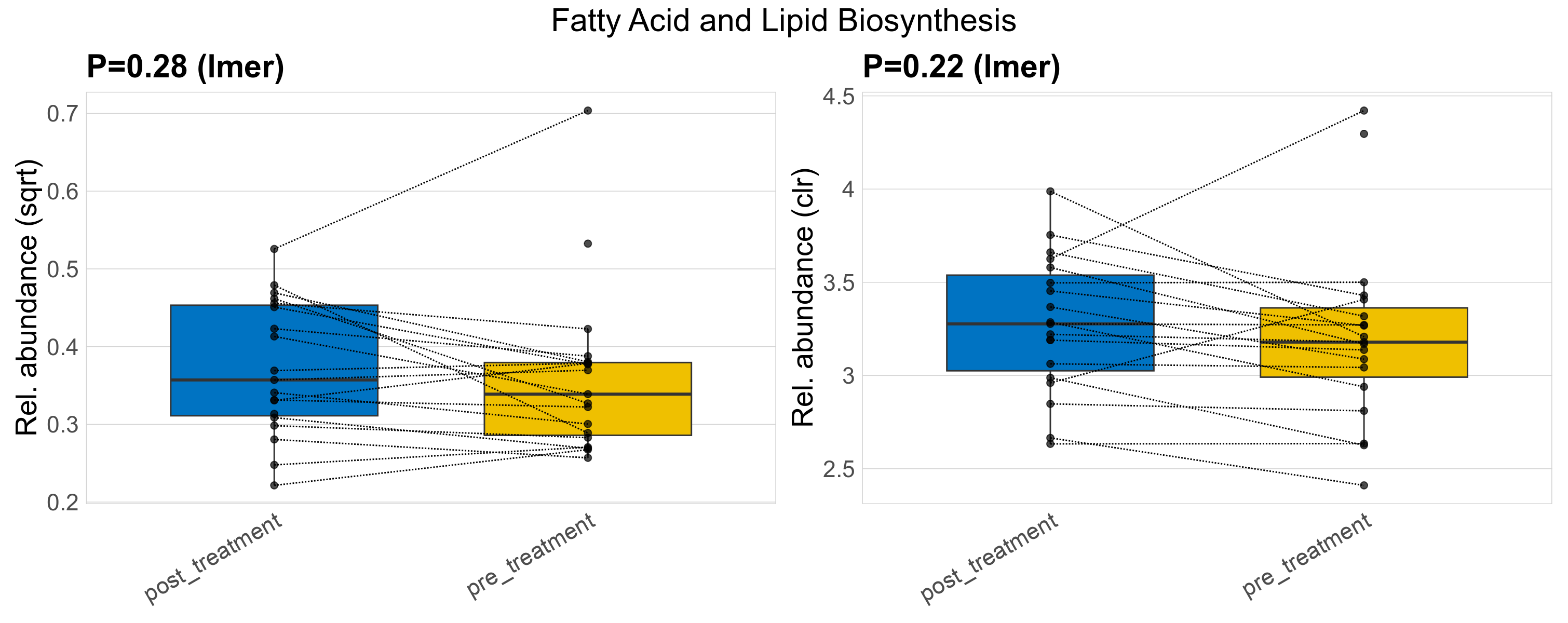| Function | P lmer condition effect (sqrt) | FDR lmer condition effect (sqrt) | Pbonf lmer condition effect (sqrt) | P lmer condition effect (clr) | FDR lmer condition effect (clr) | Pbonf lmer condition effect (clr) | Mean Pos | Mean Abundance | Median Abundance | Mean Treatmentpost_treatment | Median Treatmentpost_treatment | SD Treatmentpost_treatment | Mean Treatmentpre_treatment | Median Treatmentpre_treatment | SD Treatmentpre_treatment | Fold Change Log2(Treatmentpre_treatment/Treatmentpost_treatment) | Positive samples | Positive Treatmentpost_treatment | Positive Treatmentpre_treatment | Positive_Treatmentpost_treatment_percent | Positive_Treatmentpre_treatment_percent |