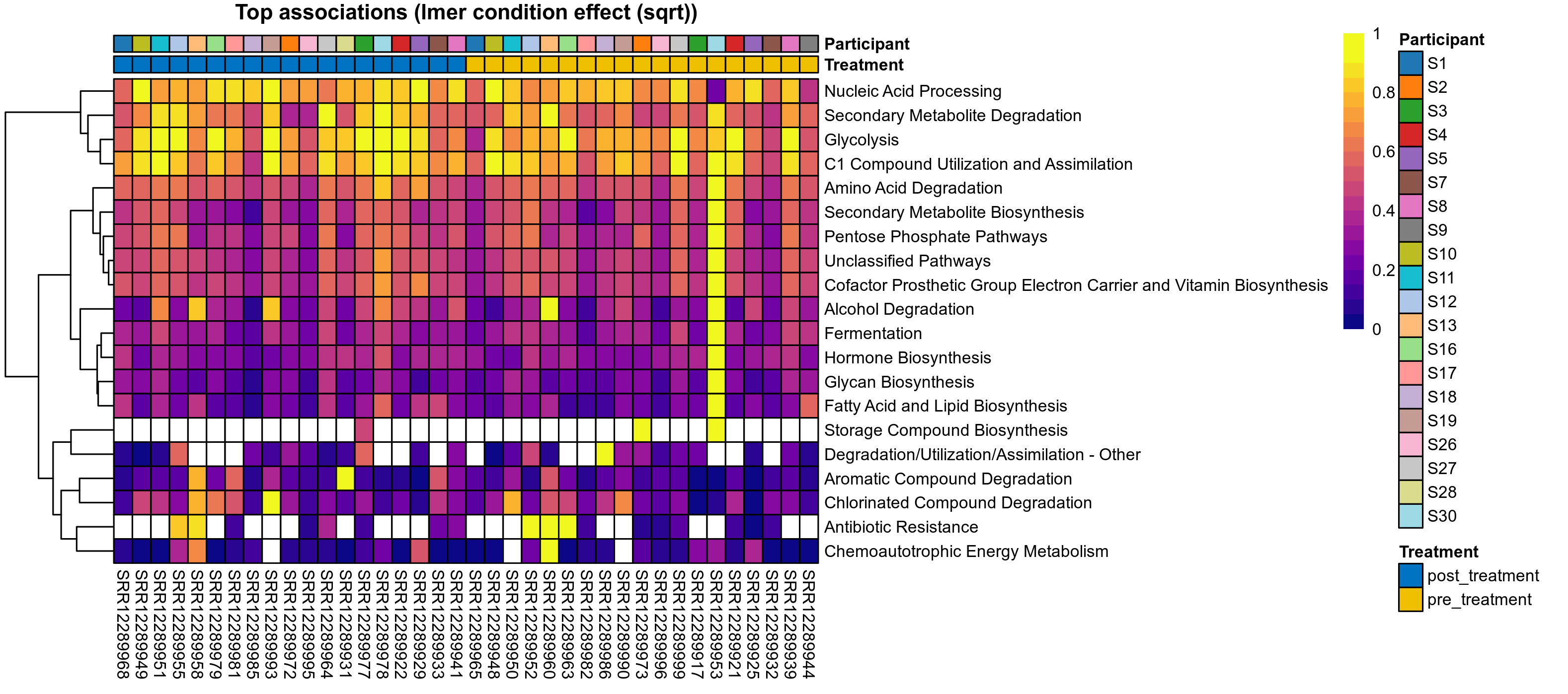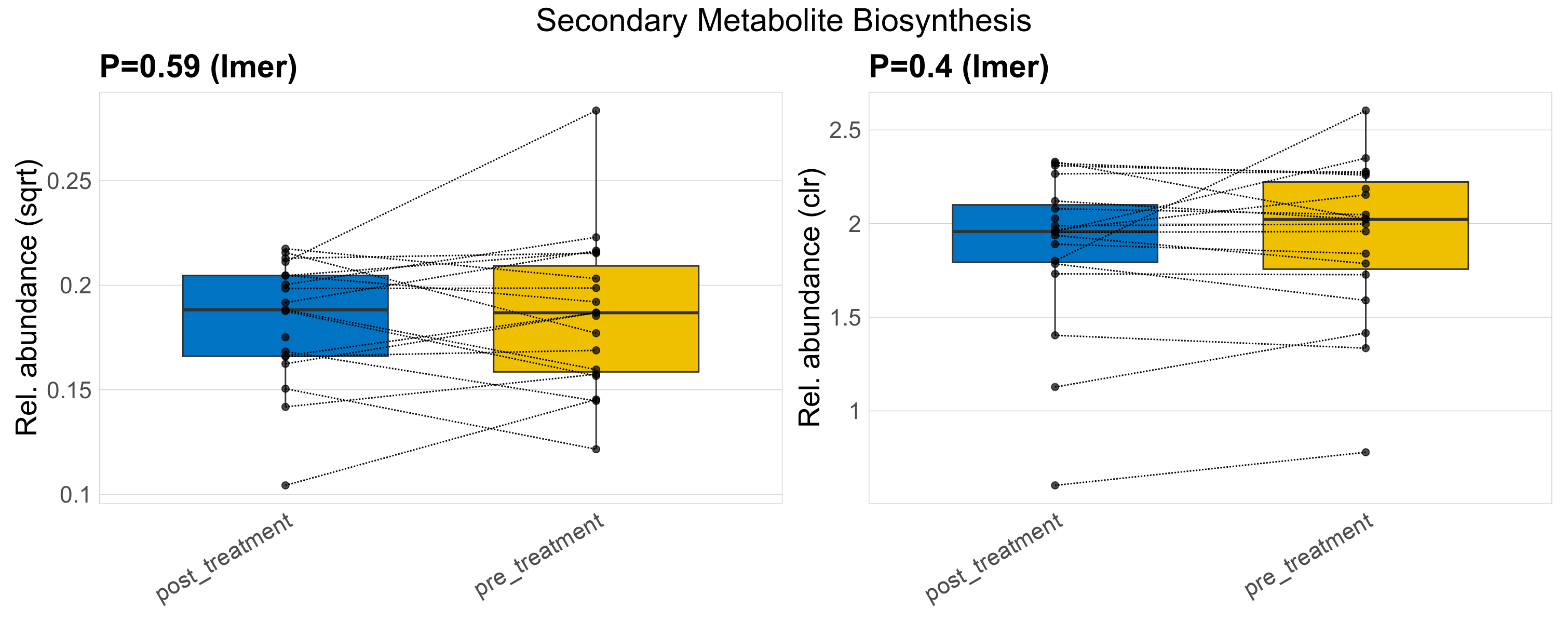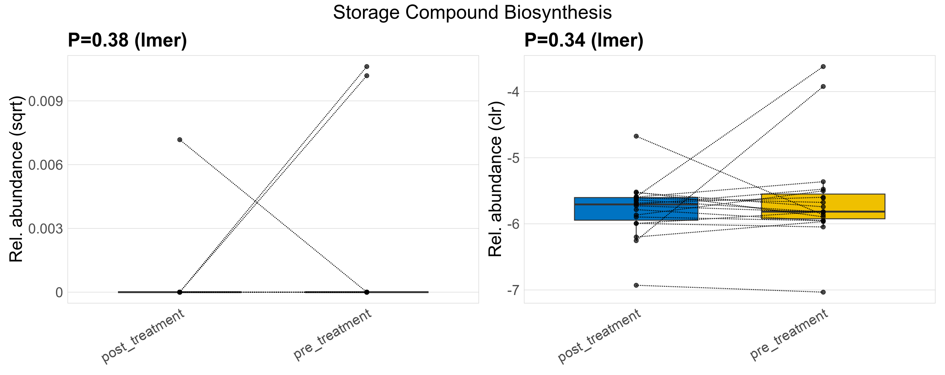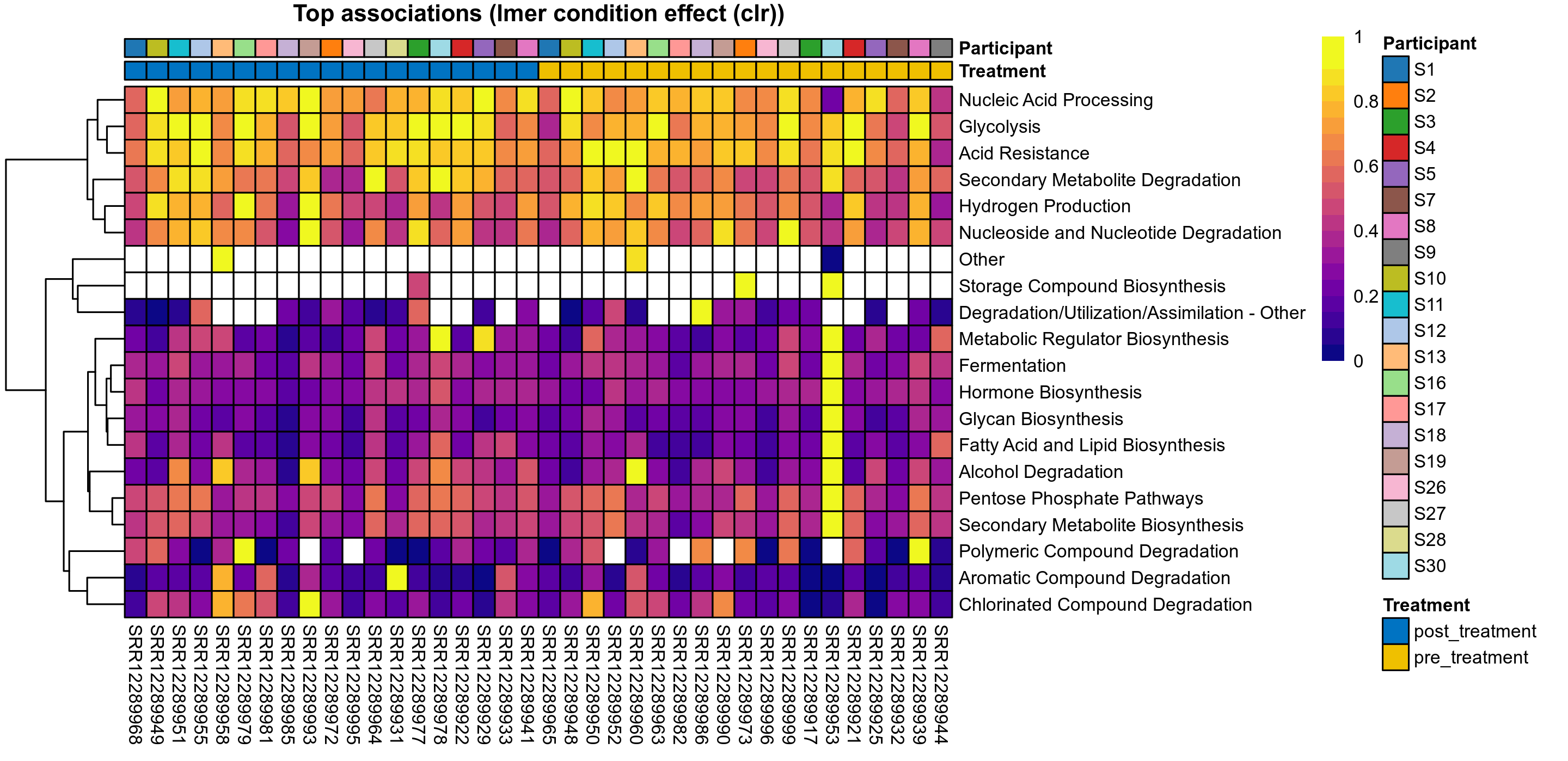 P lmer condition effect (clr): Differentially abundant functions were identified by linear mixed effect regression without confounders. Random effects: Participant (intercept). Fixed effects: Treatment. Effect tested: Treatment.