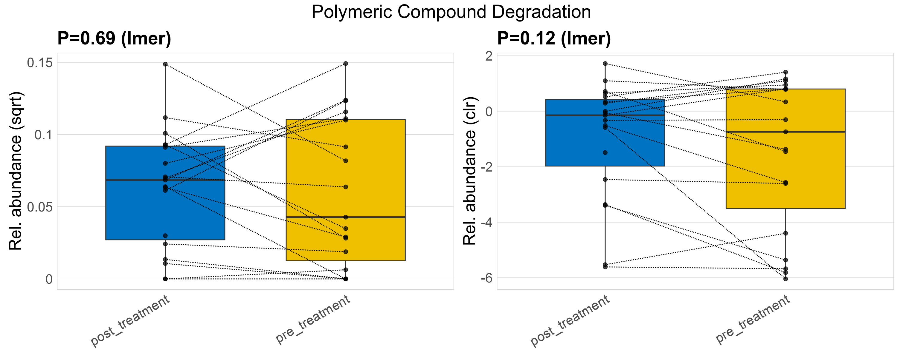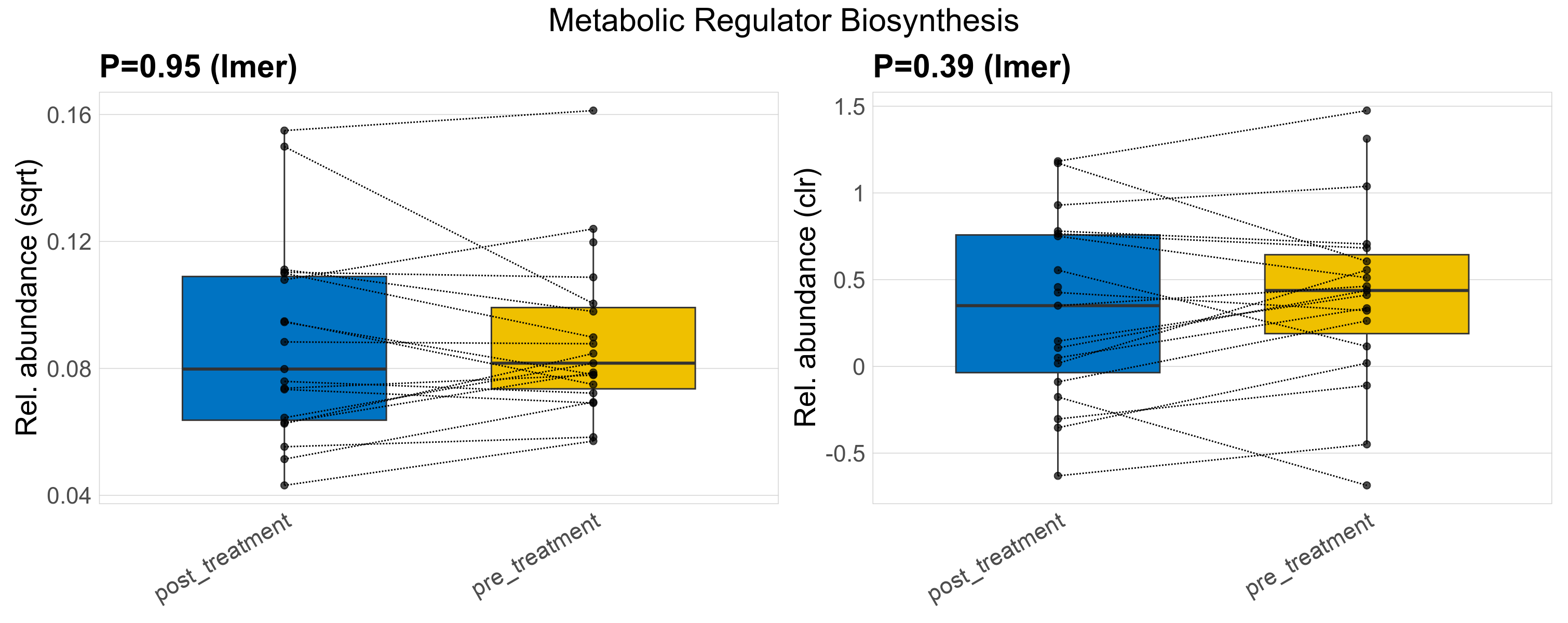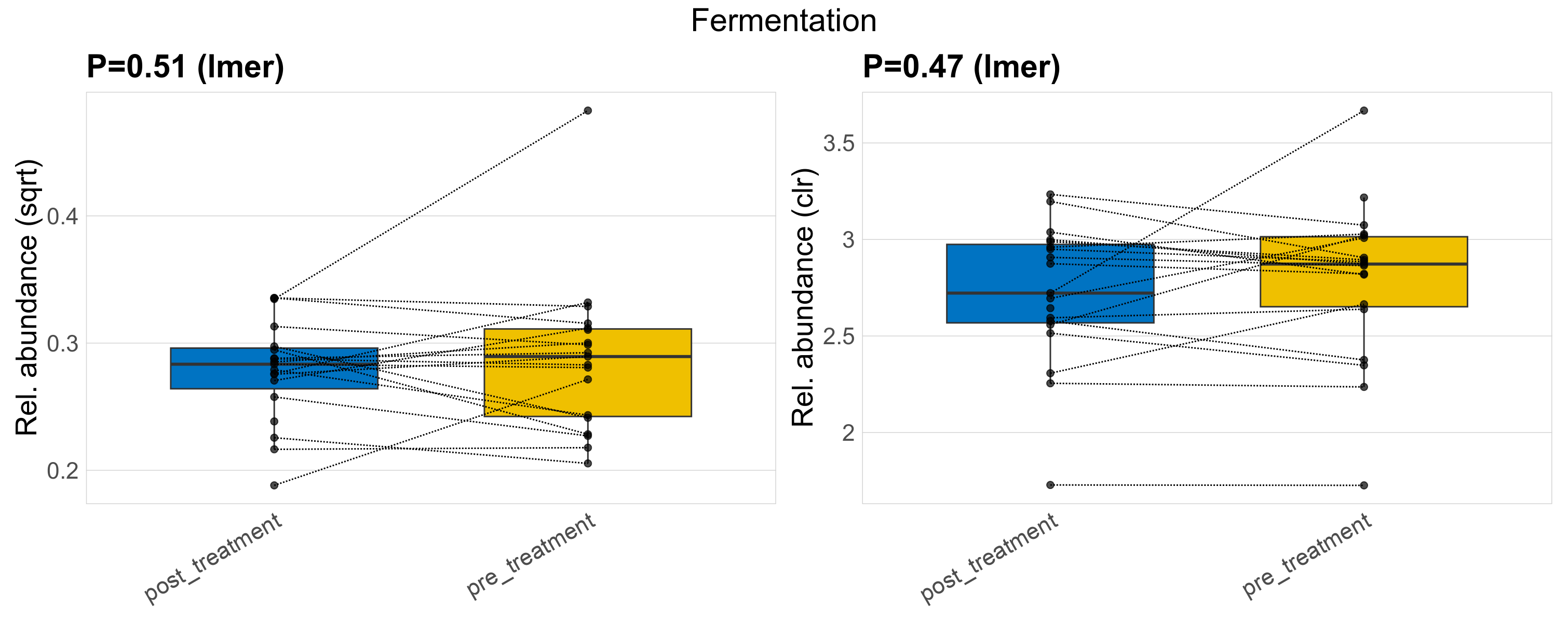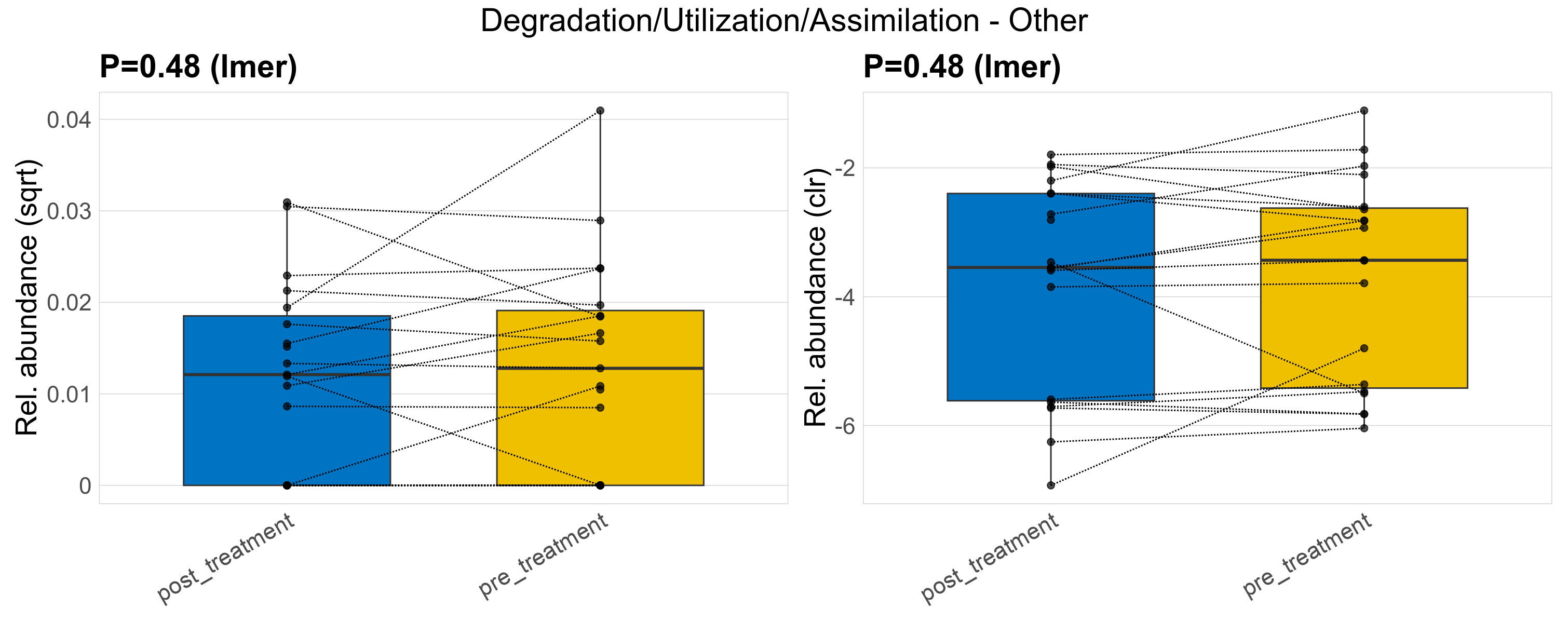 P lmer condition effect (clr): Differentially abundant functions were identified by linear mixed effect regression without confounders. Random effects: Participant (intercept). Fixed effects: Treatment. Effect tested: Treatment.