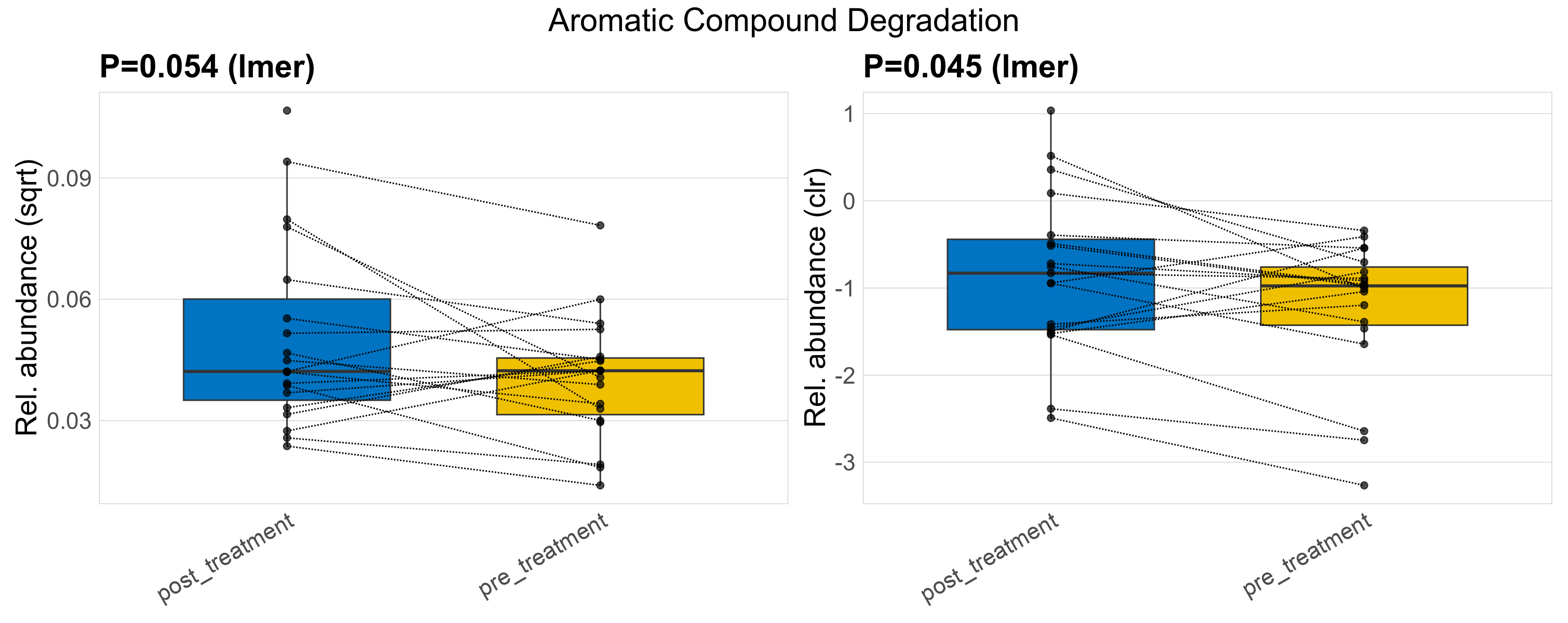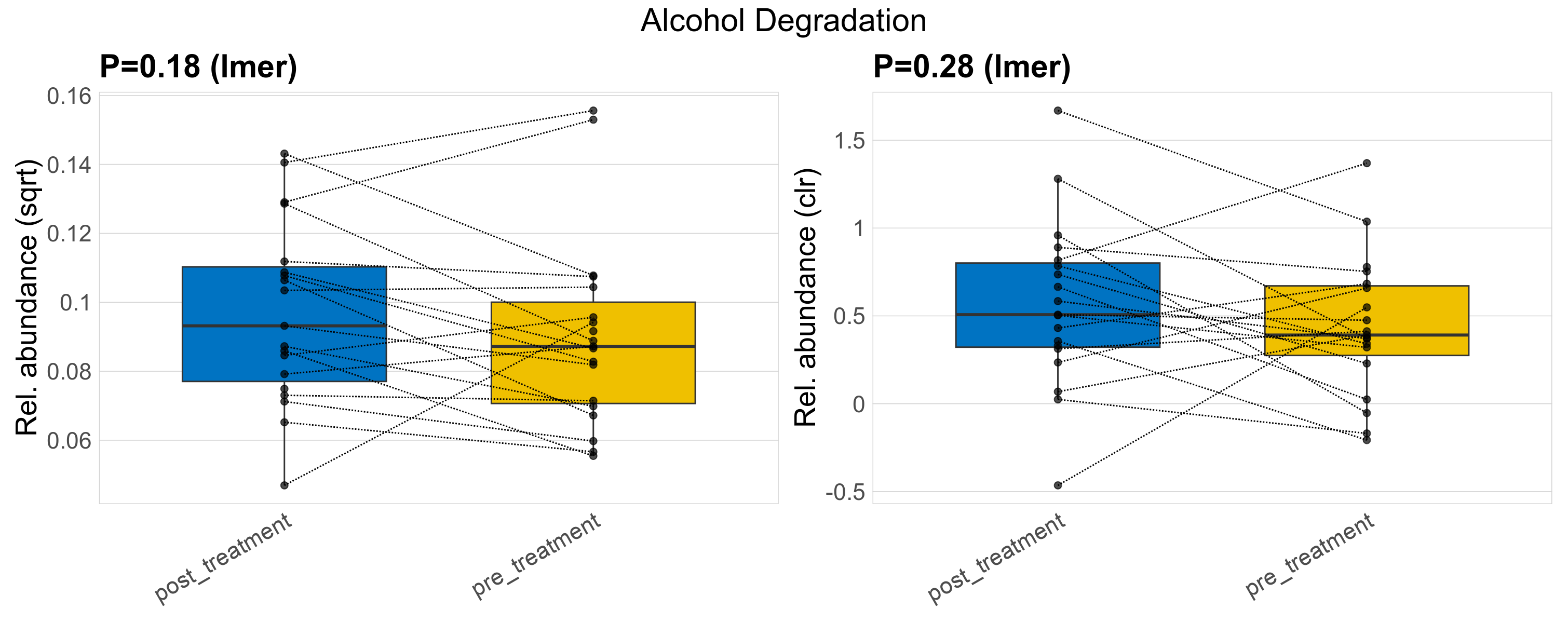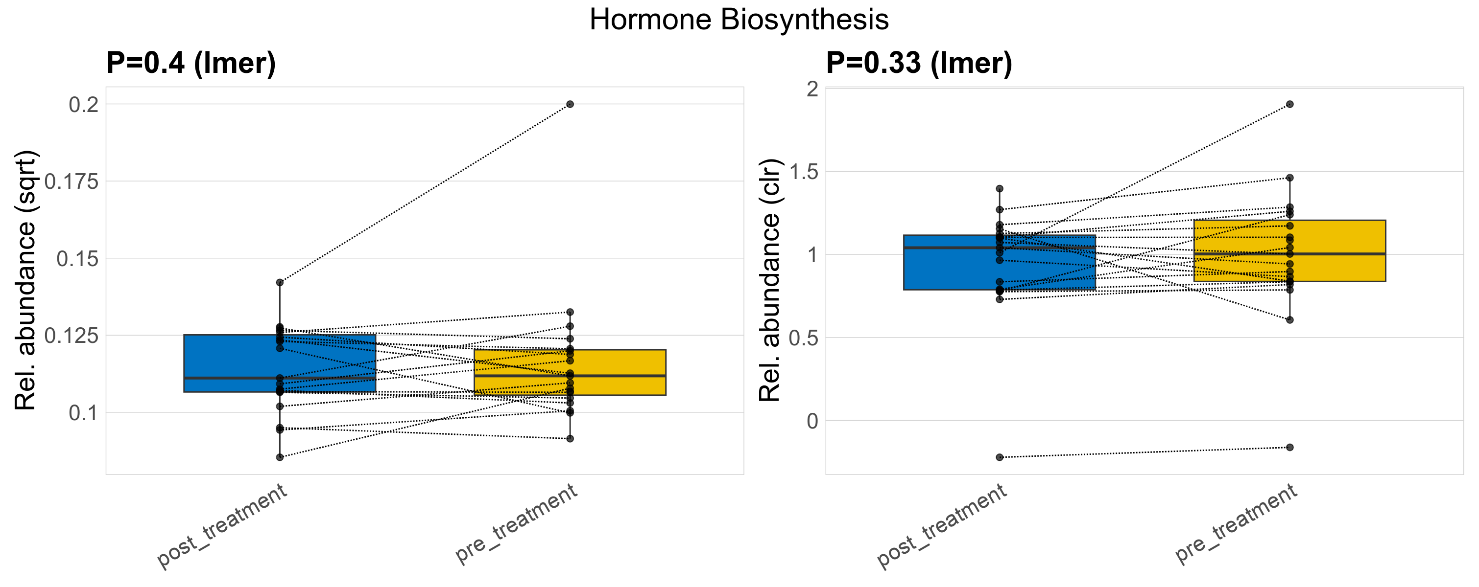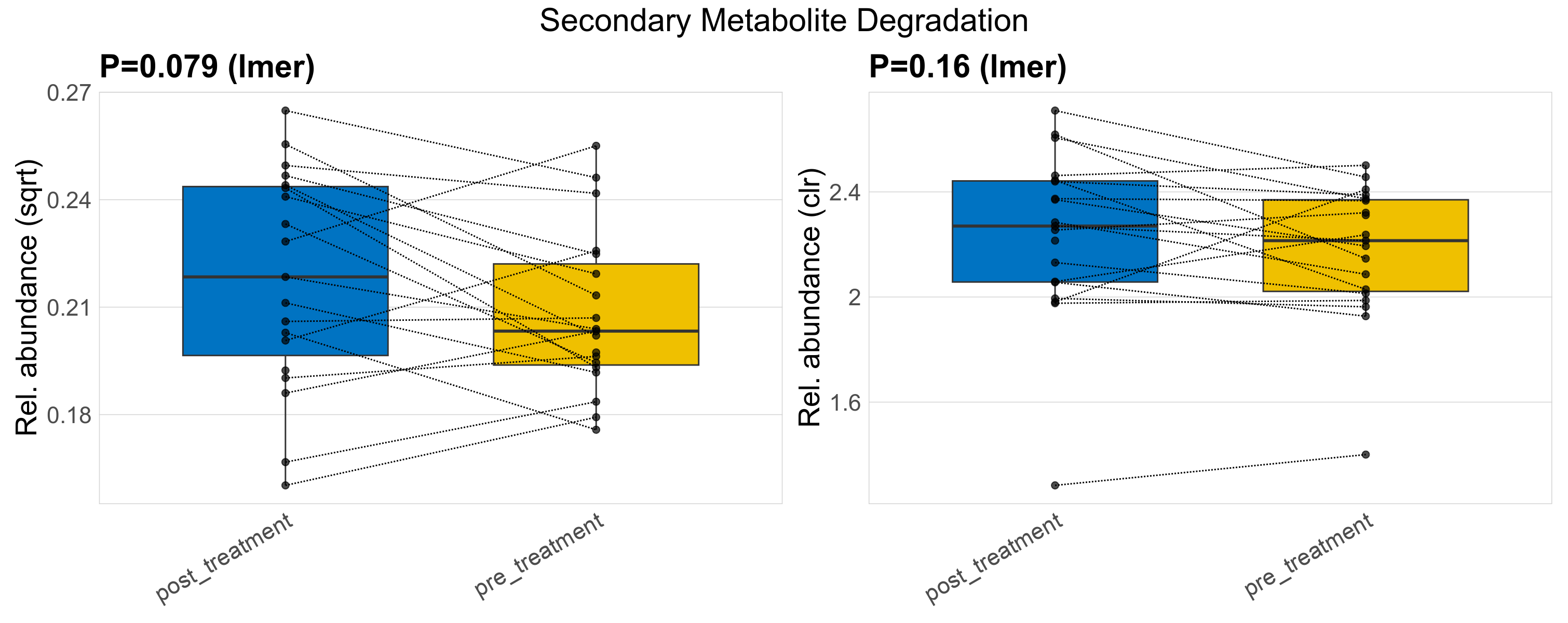 P lmer condition effect (clr): Differentially abundant functions were identified by linear mixed effect regression without confounders. Random effects: Participant (intercept). Fixed effects: Treatment. Effect tested: Treatment.