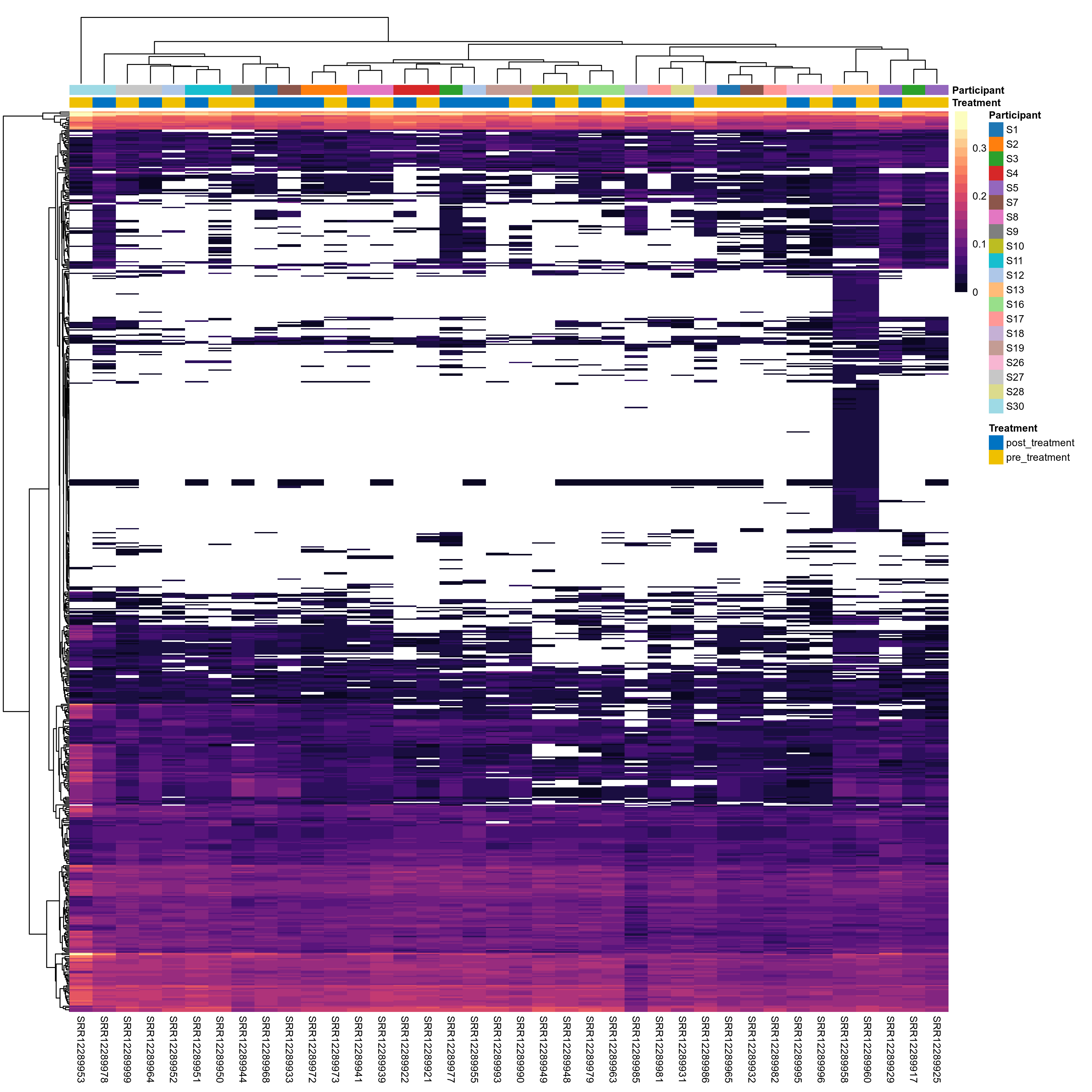 | Index | rarefiedTo | P lmer condition effect | Mean Pos | Mean Abundance | Median Abundance | Mean Treatmentpost_treatment | Median Treatmentpost_treatment | SD Treatmentpost_treatment | Mean Treatmentpre_treatment | Median Treatmentpre_treatment | SD Treatmentpre_treatment | Fold Change Log2(Treatmentpre_treatment/Treatmentpost_treatment) | Positive samples | Positive Treatmentpost_treatment | Positive Treatmentpre_treatment | Positive_Treatmentpost_treatment_percent | Positive_Treatmentpre_treatment_percent |