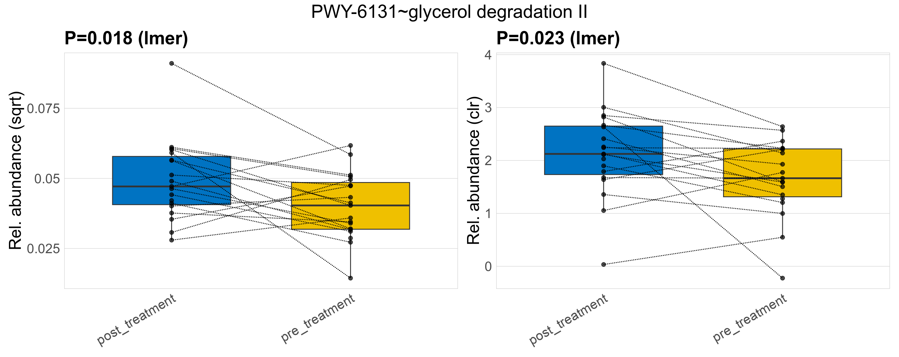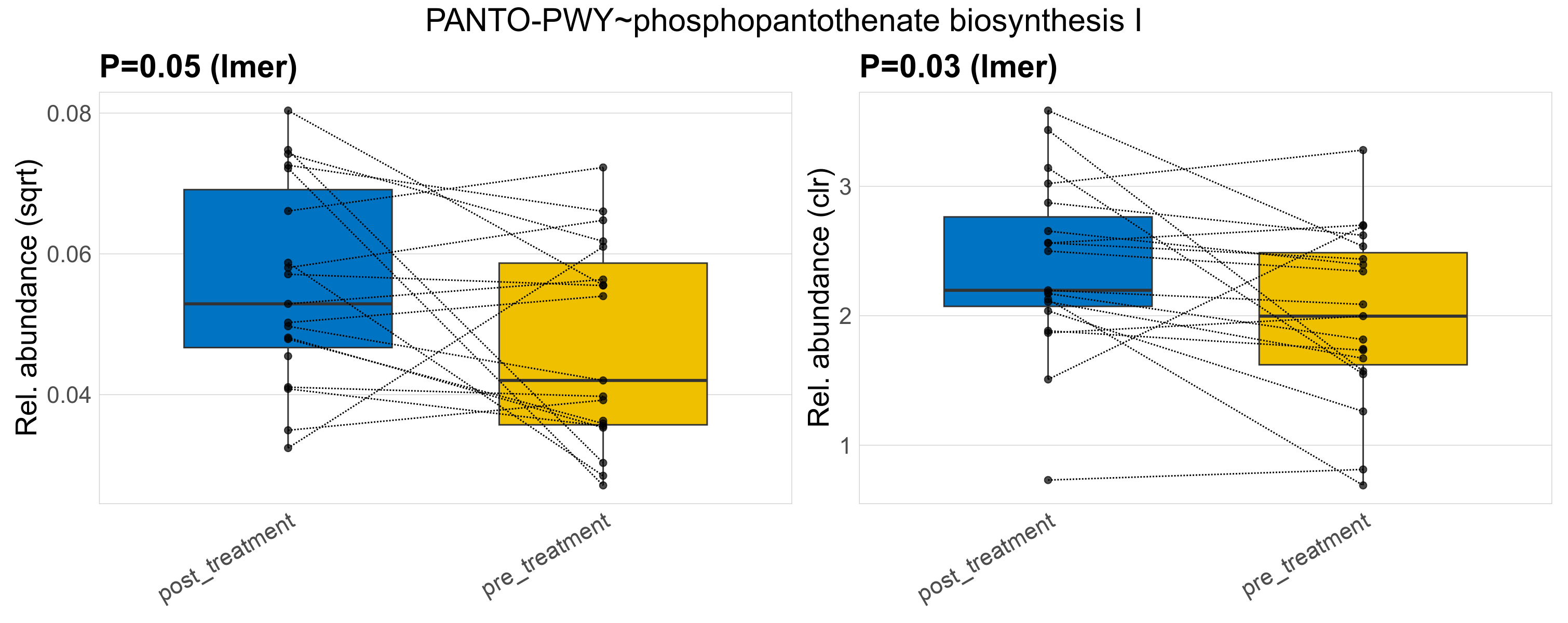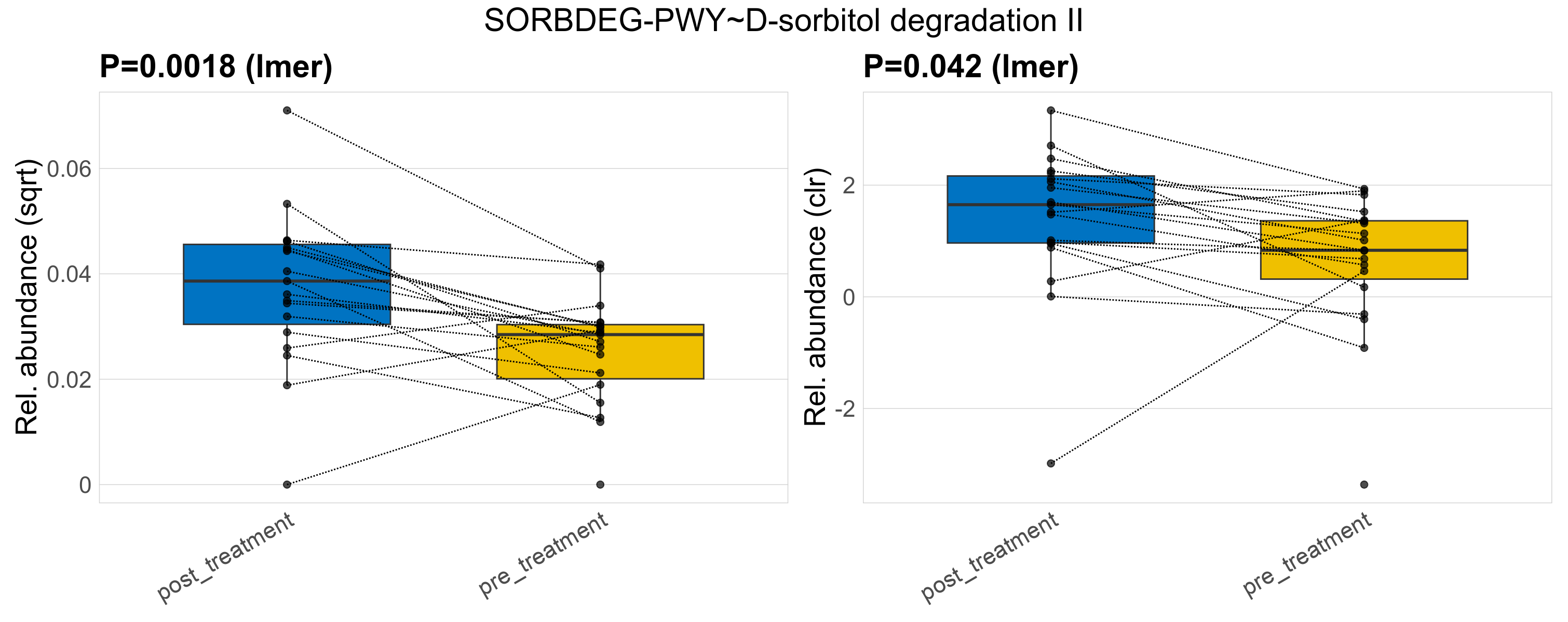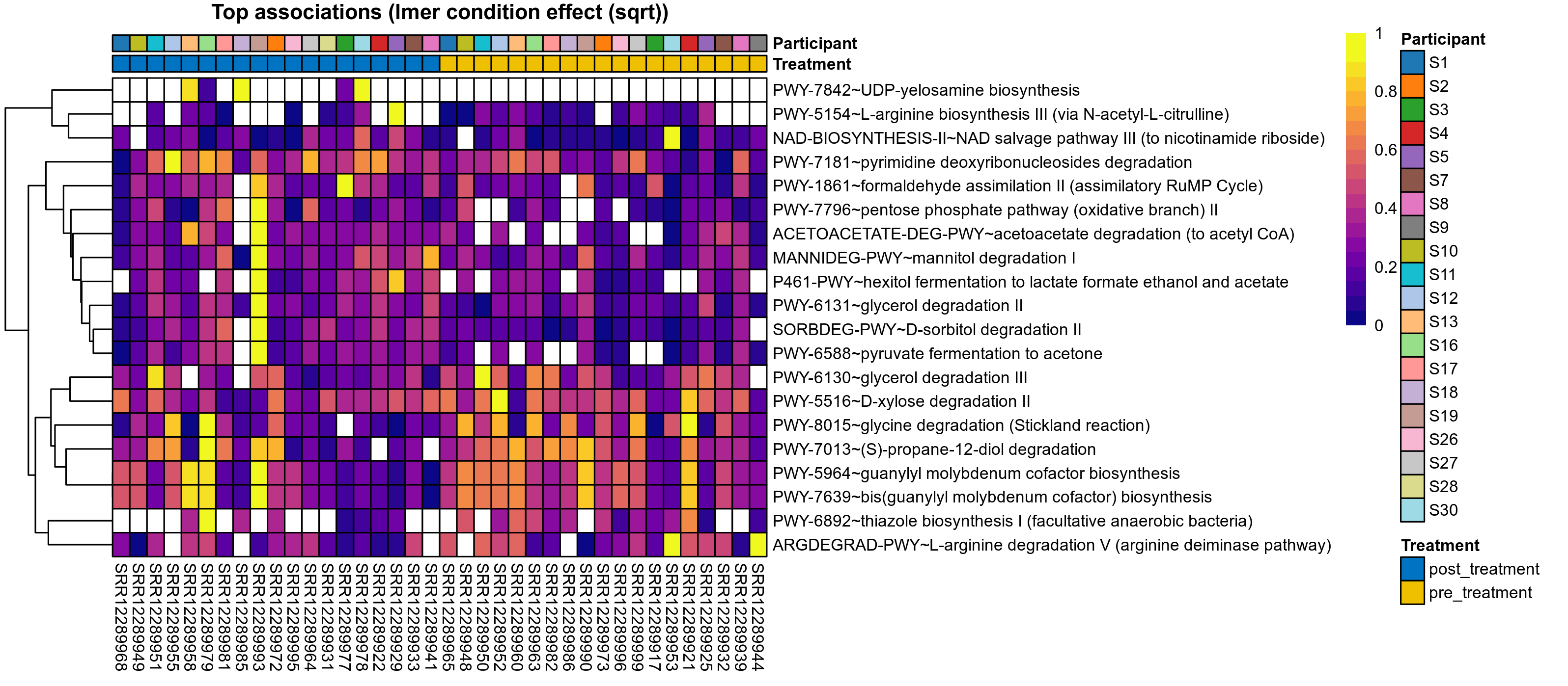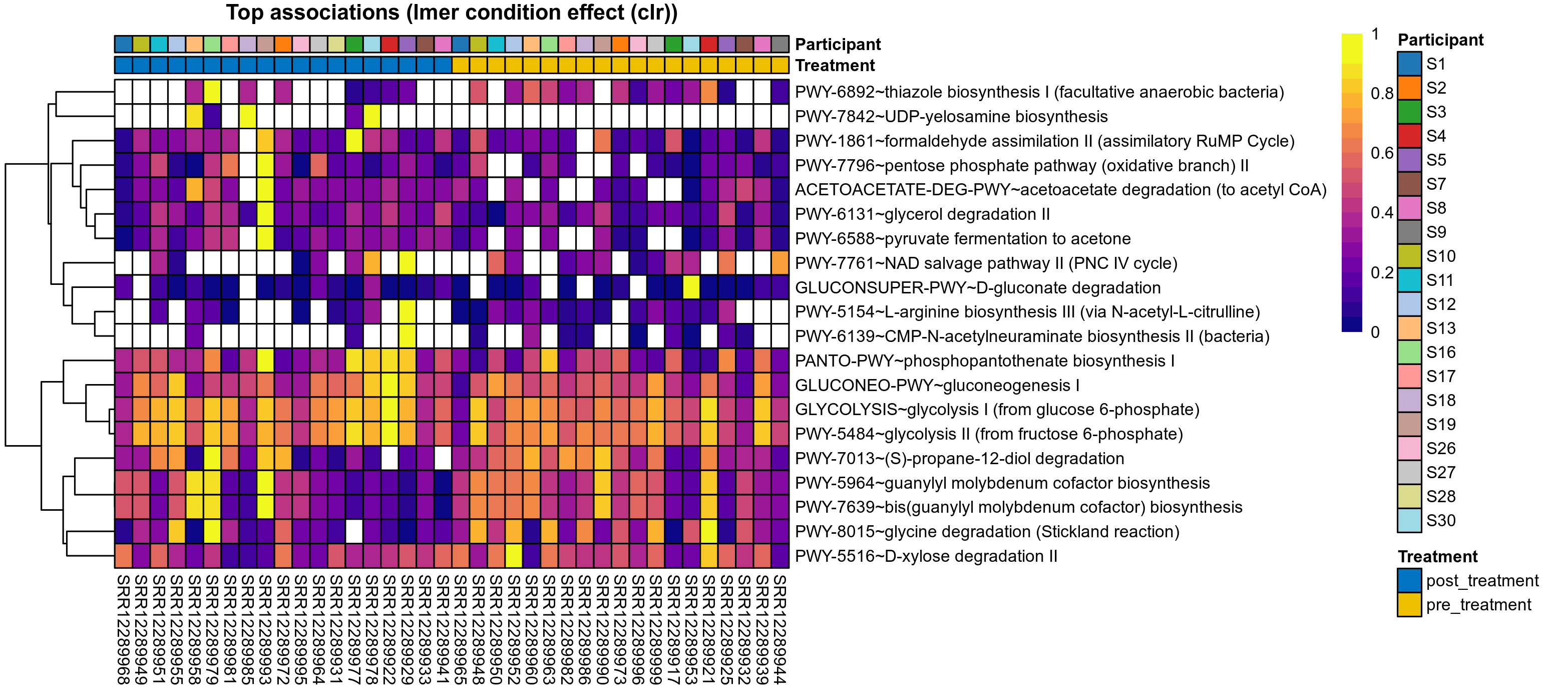 P lmer condition effect (clr): Differentially abundant functions were identified by linear mixed effect regression without confounders. Random effects: Participant (intercept). Fixed effects: Treatment. Effect tested: Treatment.