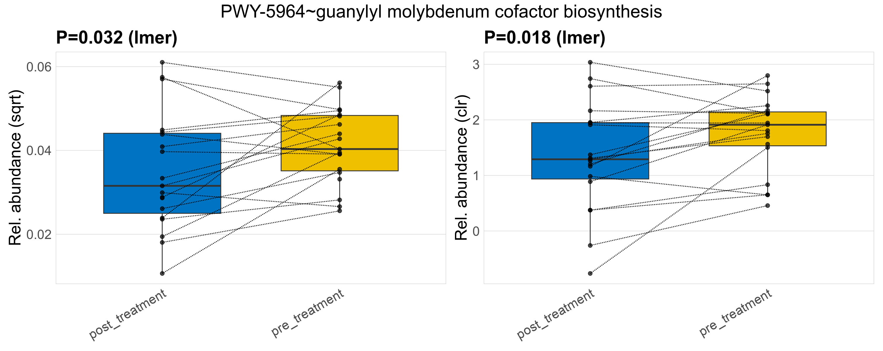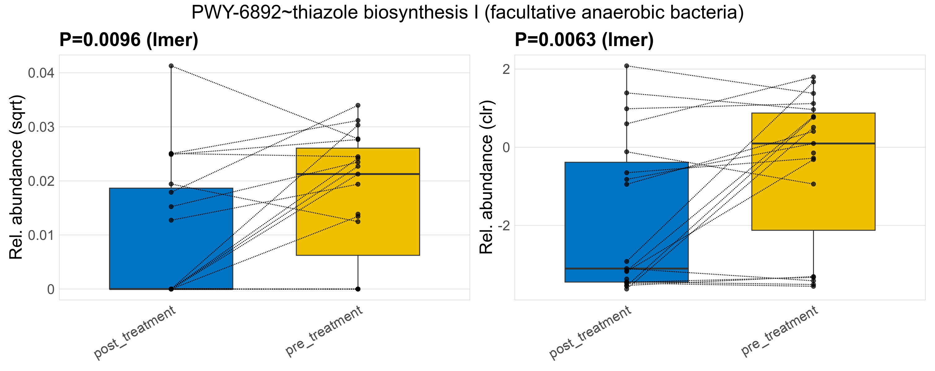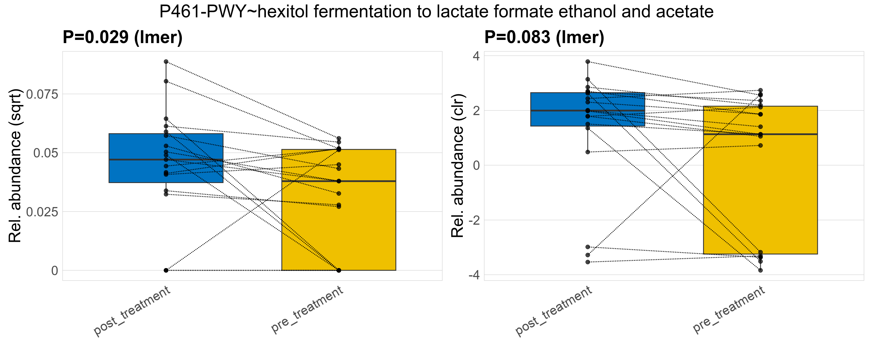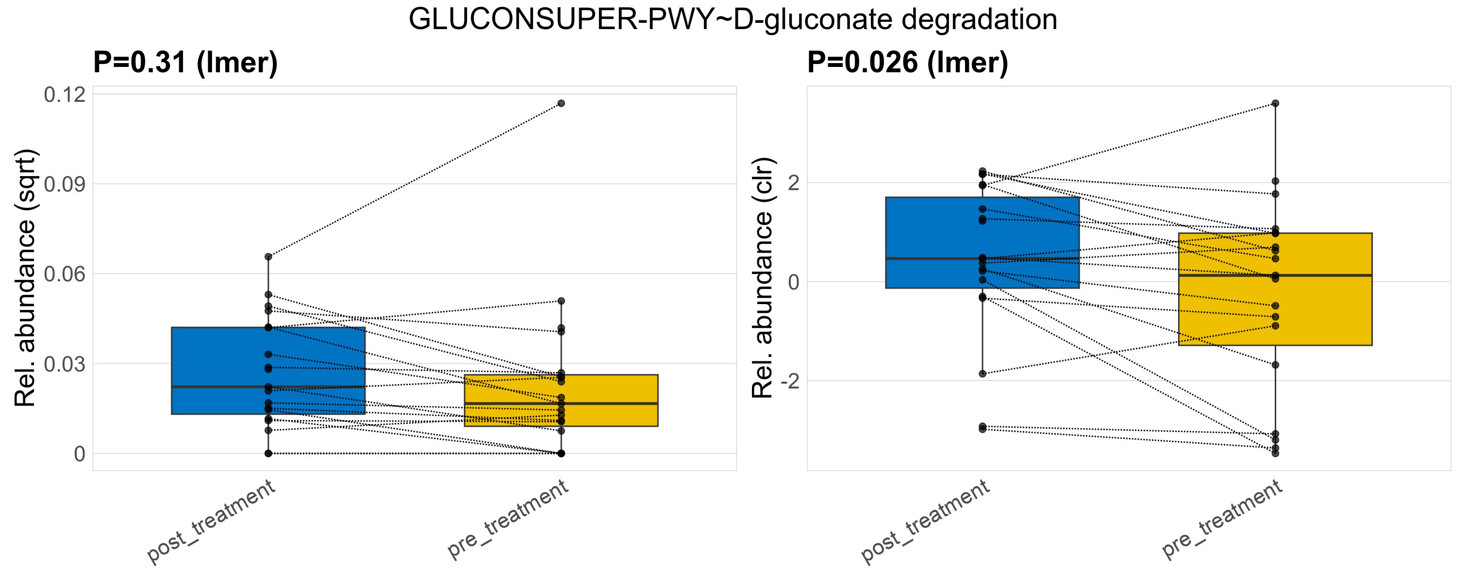 P lmer condition effect (clr): Differentially abundant functions were identified by linear mixed effect regression without confounders. Random effects: Participant (intercept). Fixed effects: Treatment. Effect tested: Treatment.