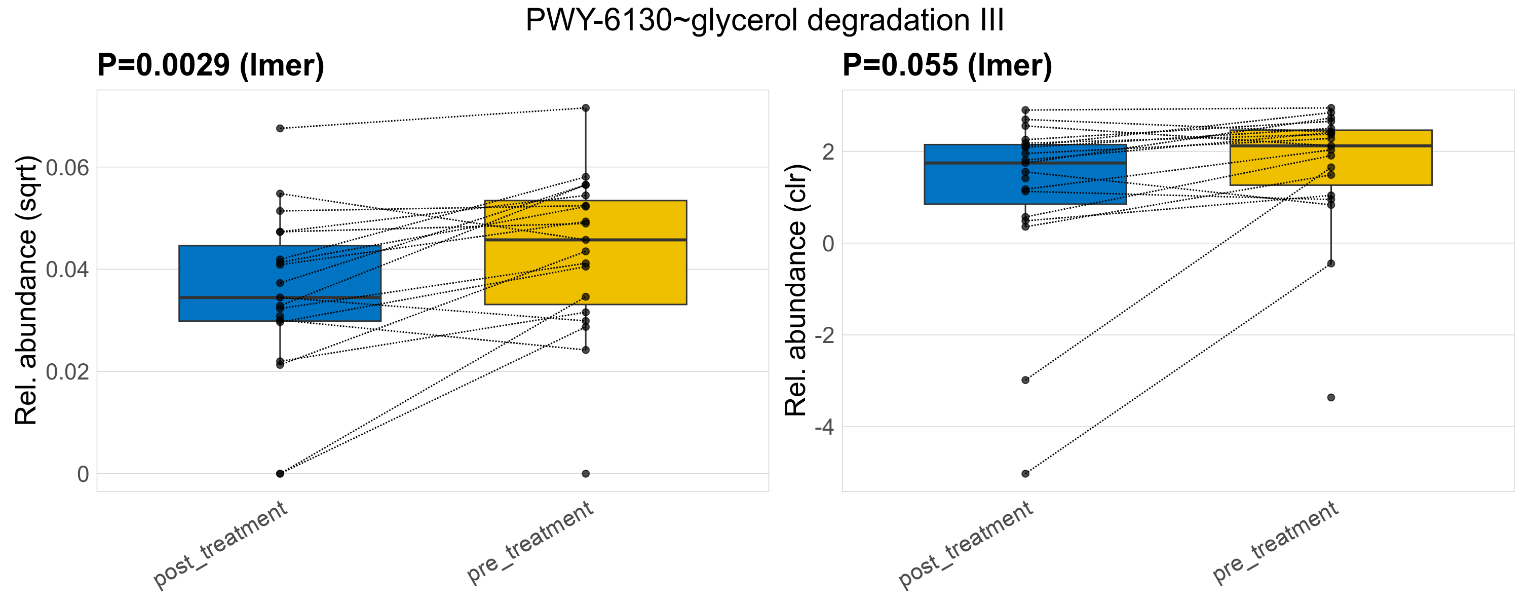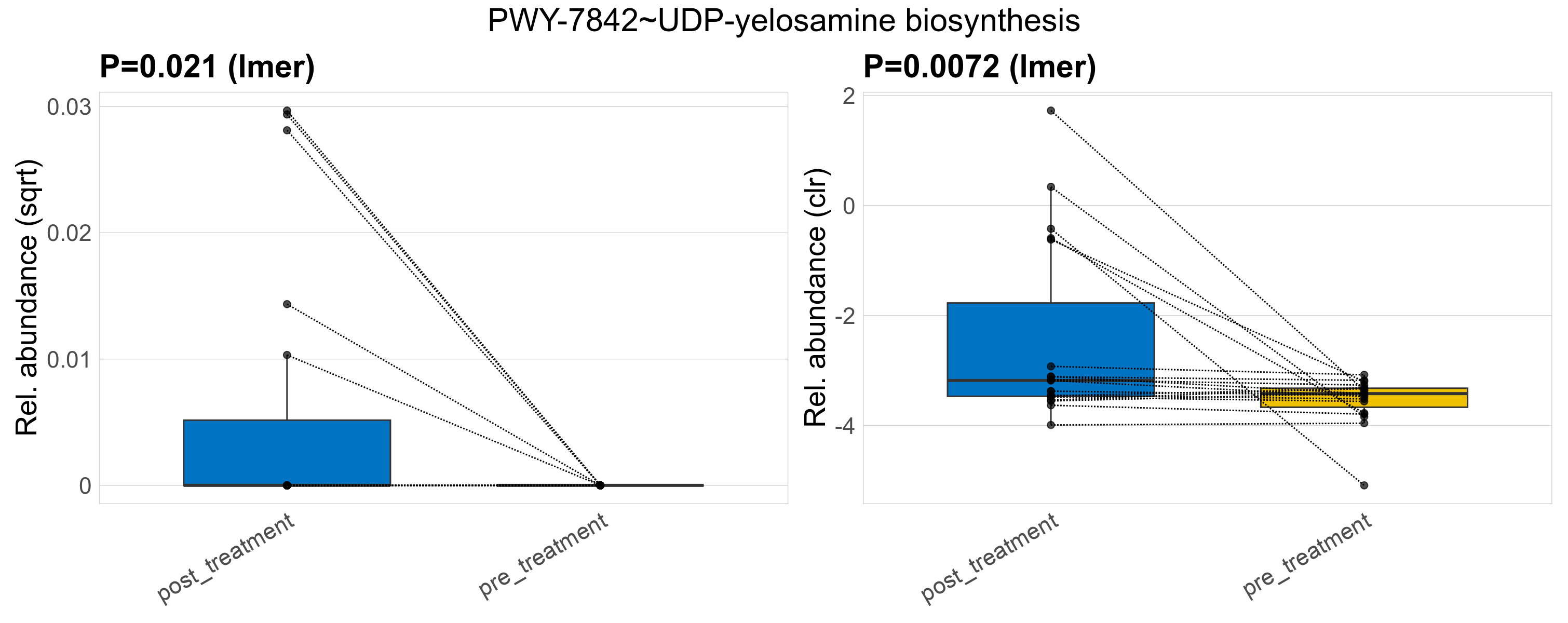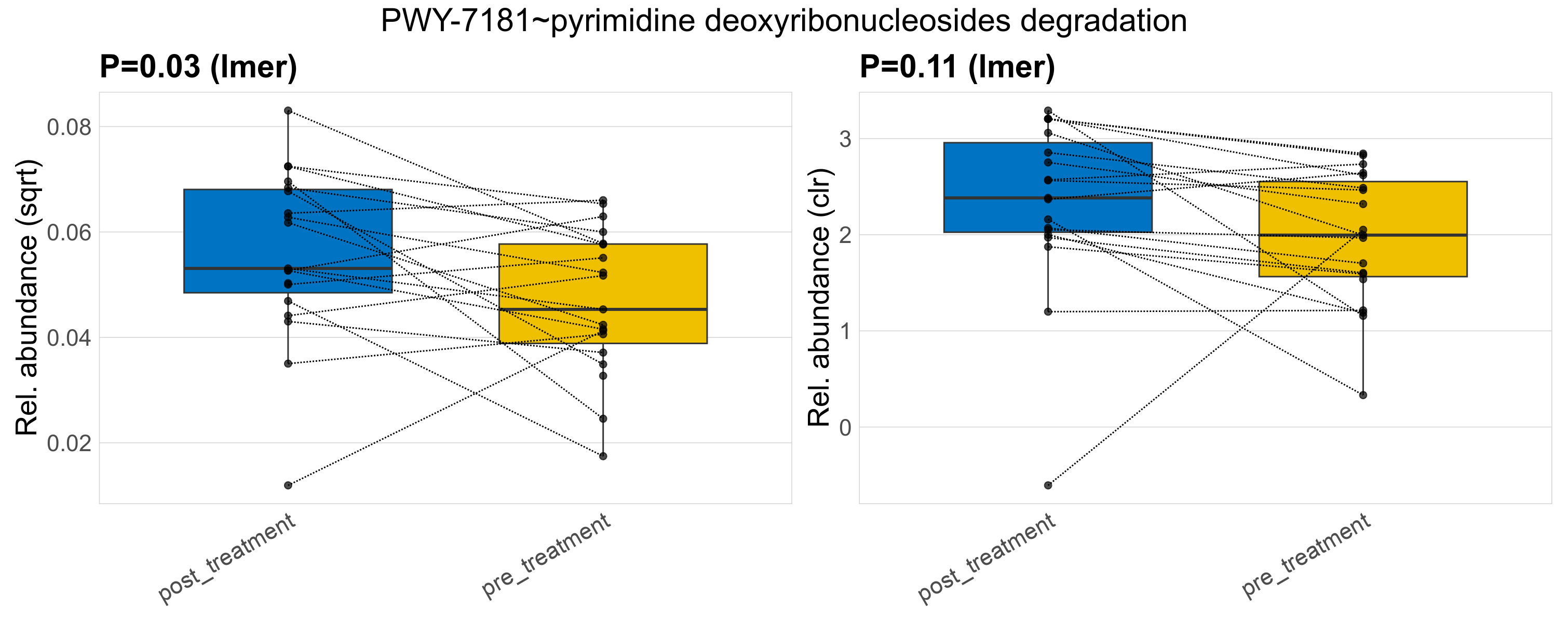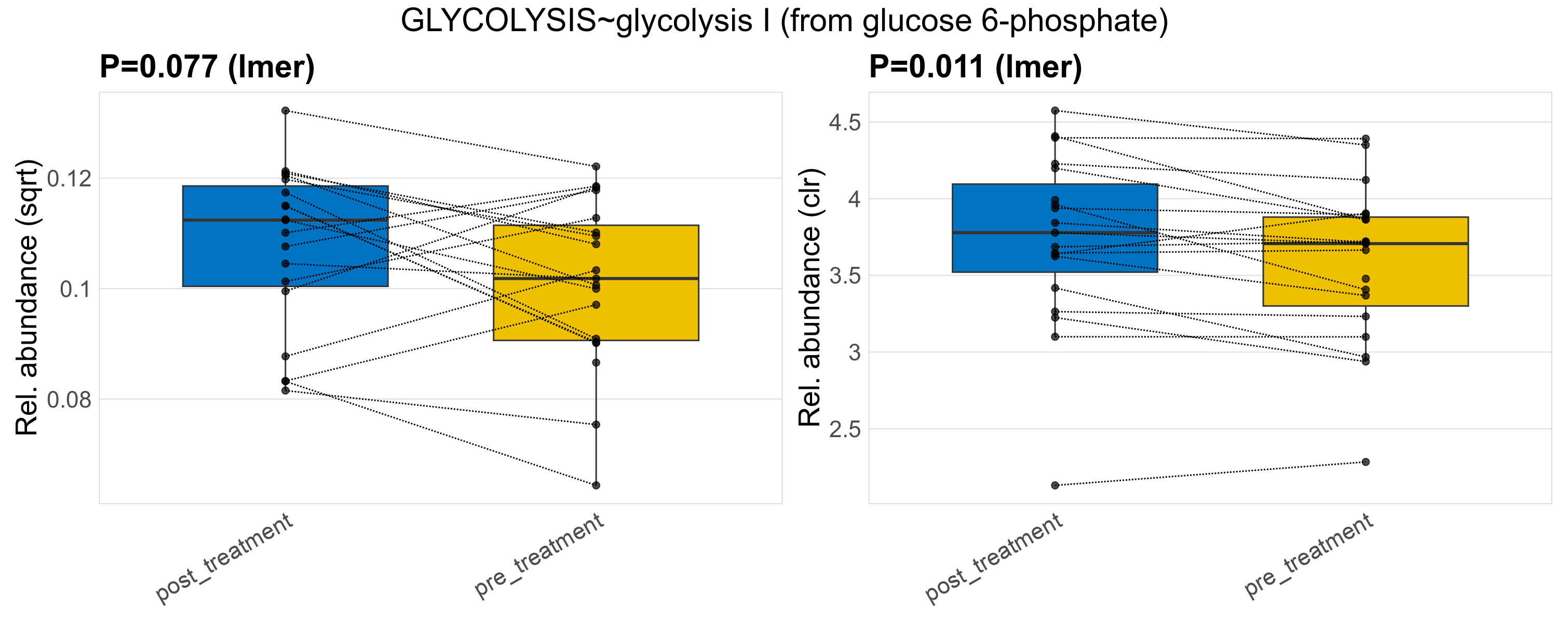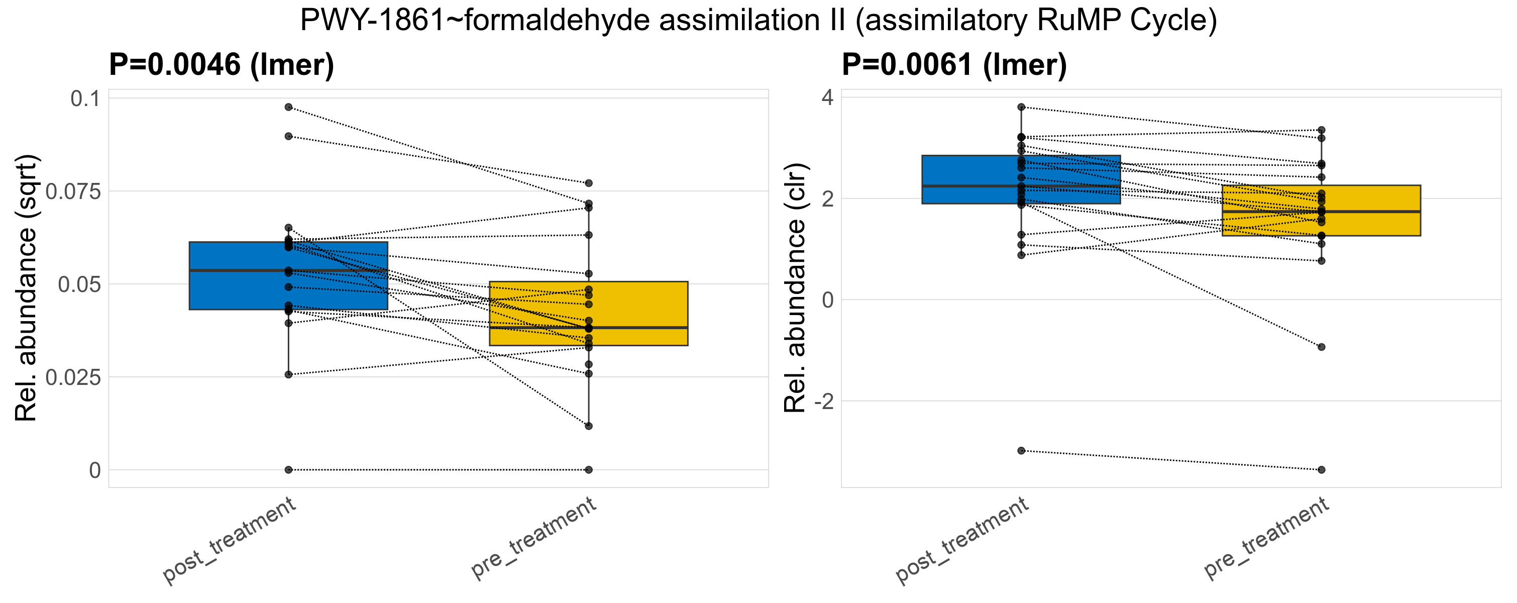 P lmer condition effect (clr): Differentially abundant functions were identified by linear mixed effect regression without confounders. Random effects: Participant (intercept). Fixed effects: Treatment. Effect tested: Treatment.