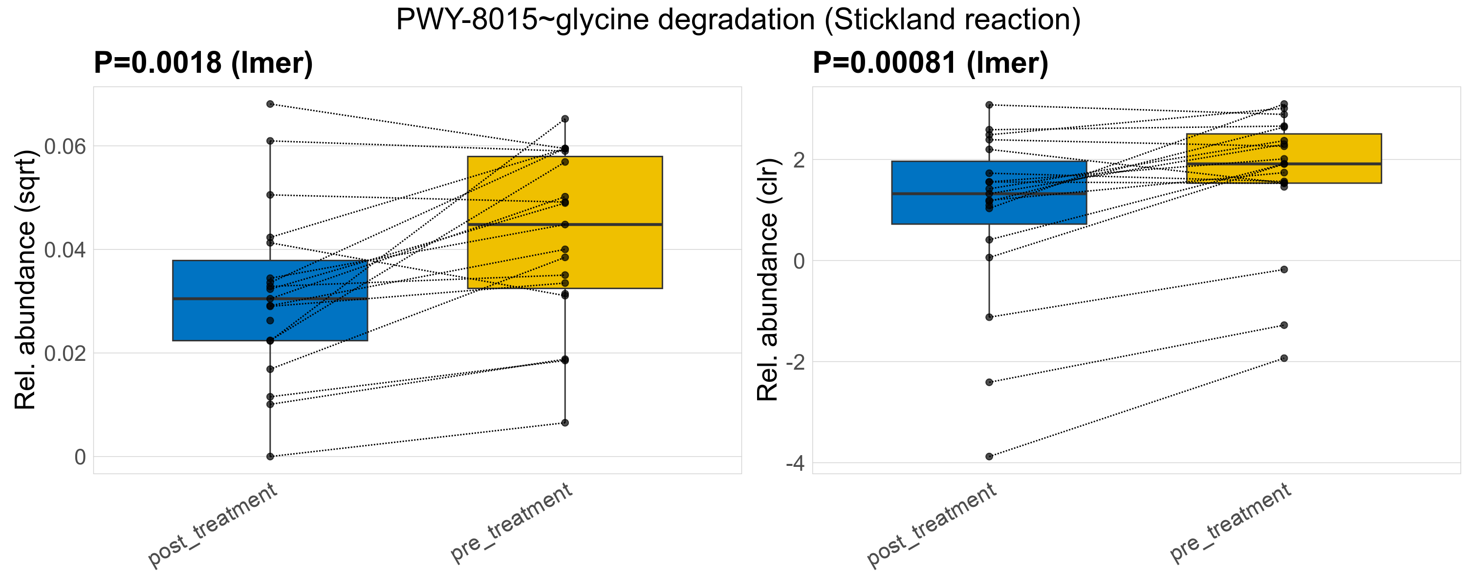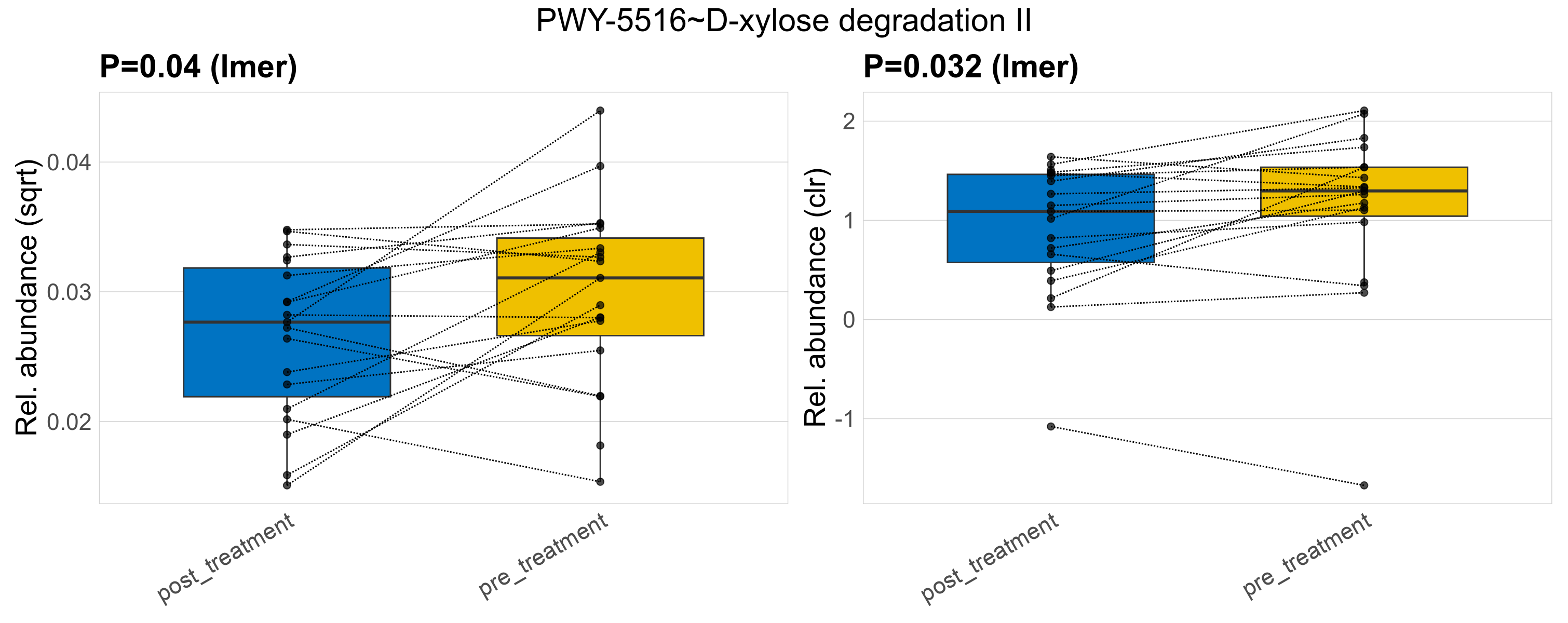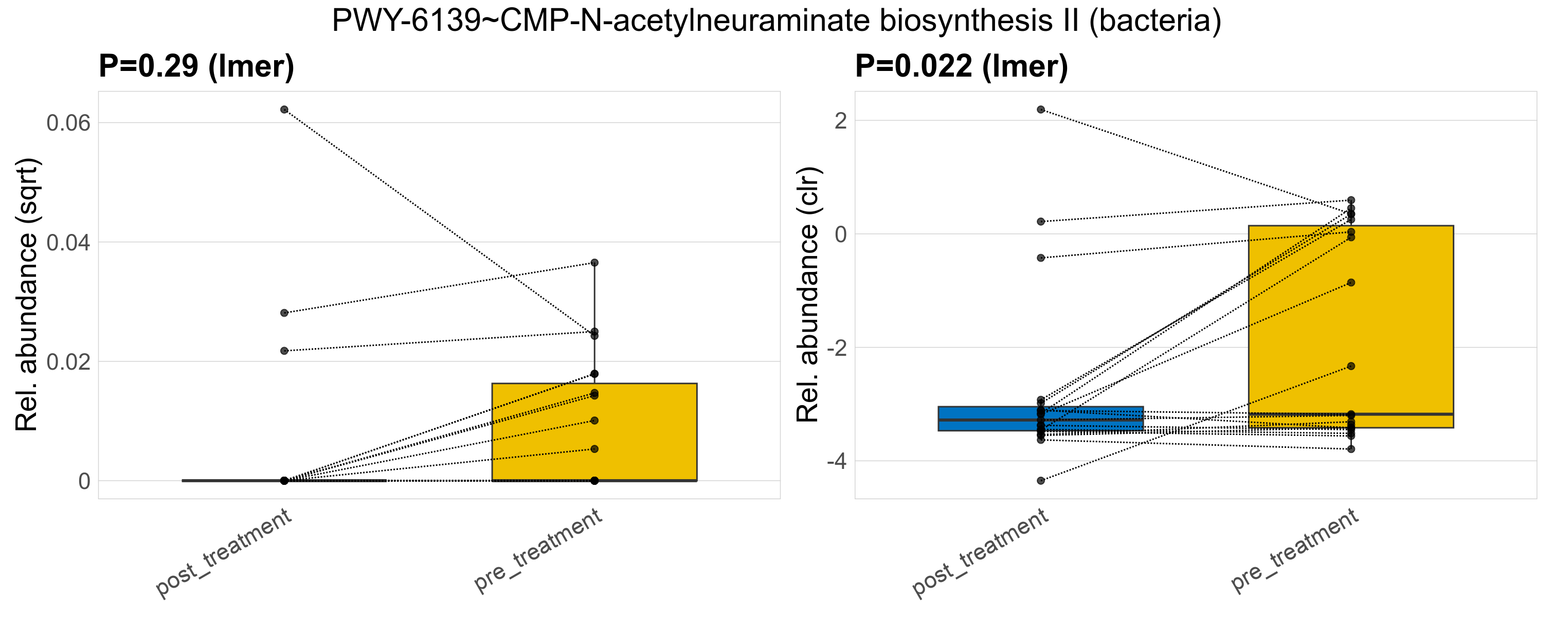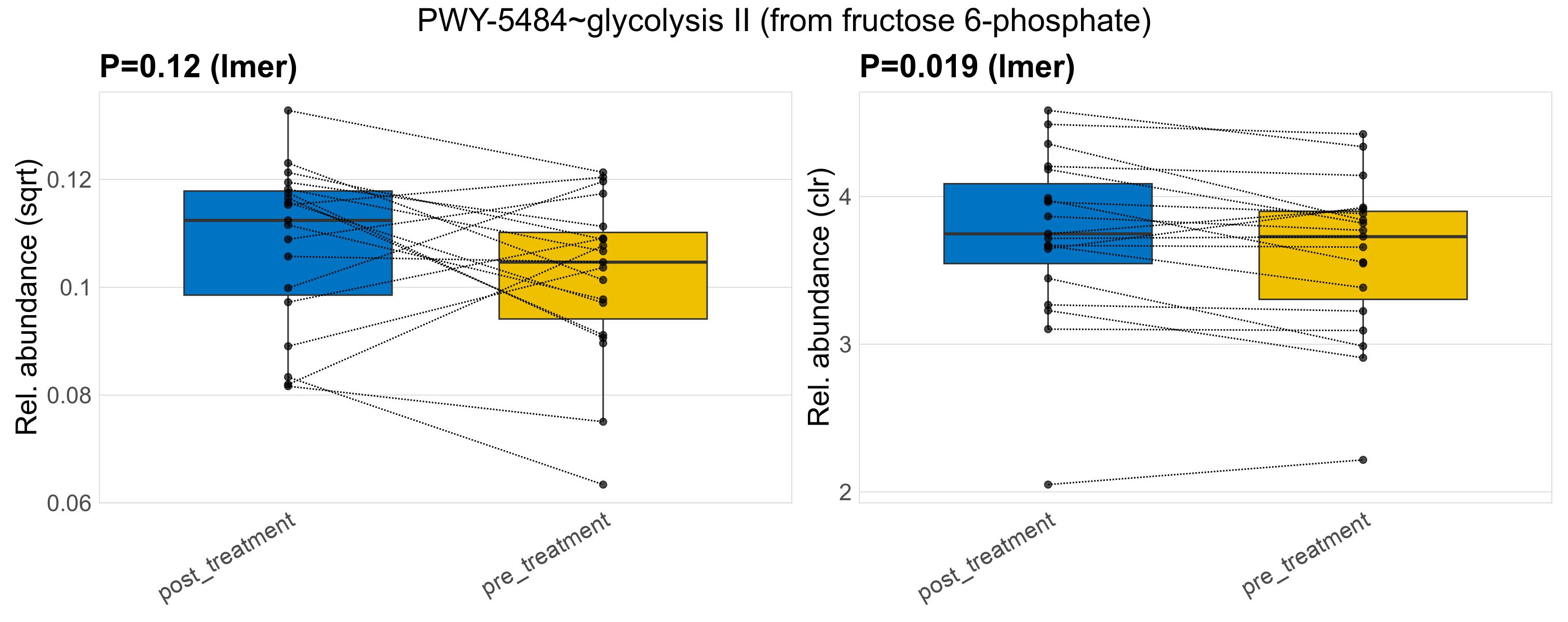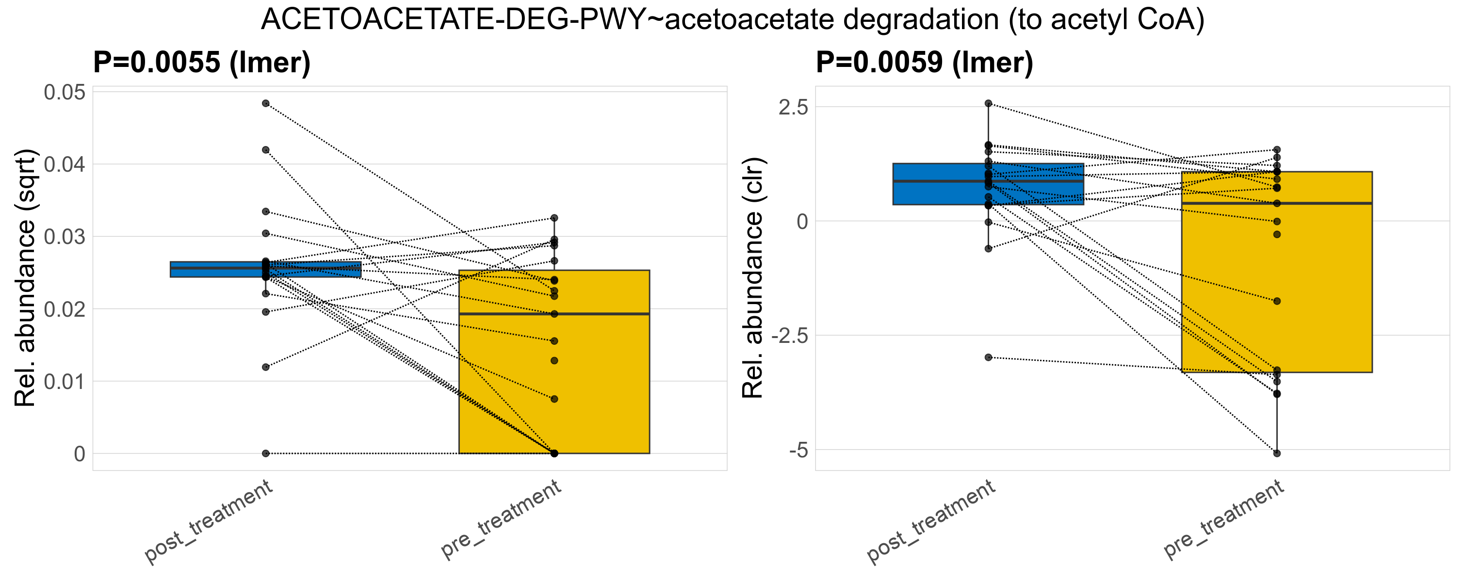 P lmer condition effect (clr): Differentially abundant functions were identified by linear mixed effect regression without confounders. Random effects: Participant (intercept). Fixed effects: Treatment. Effect tested: Treatment.