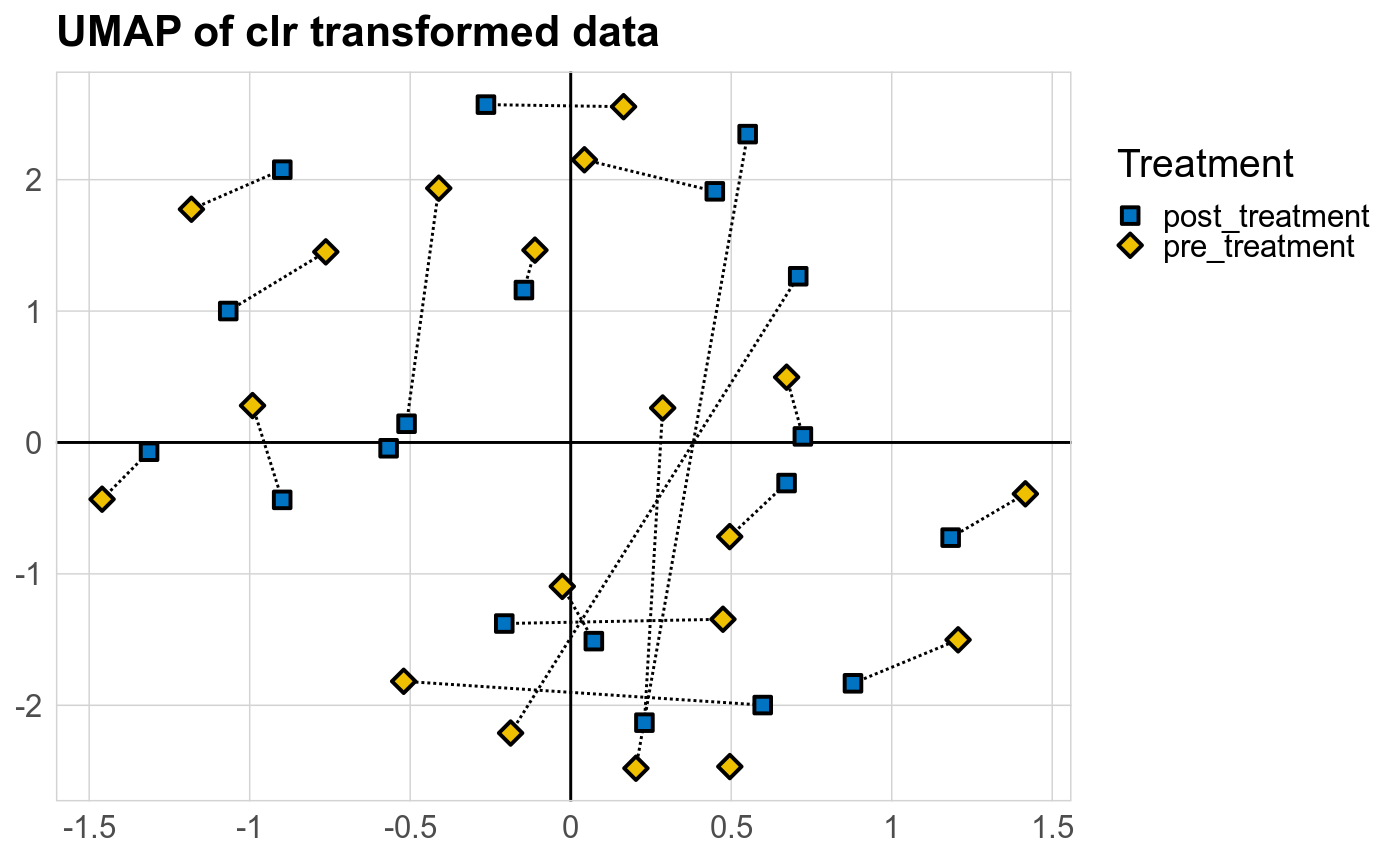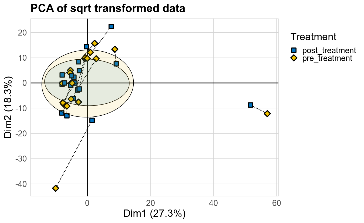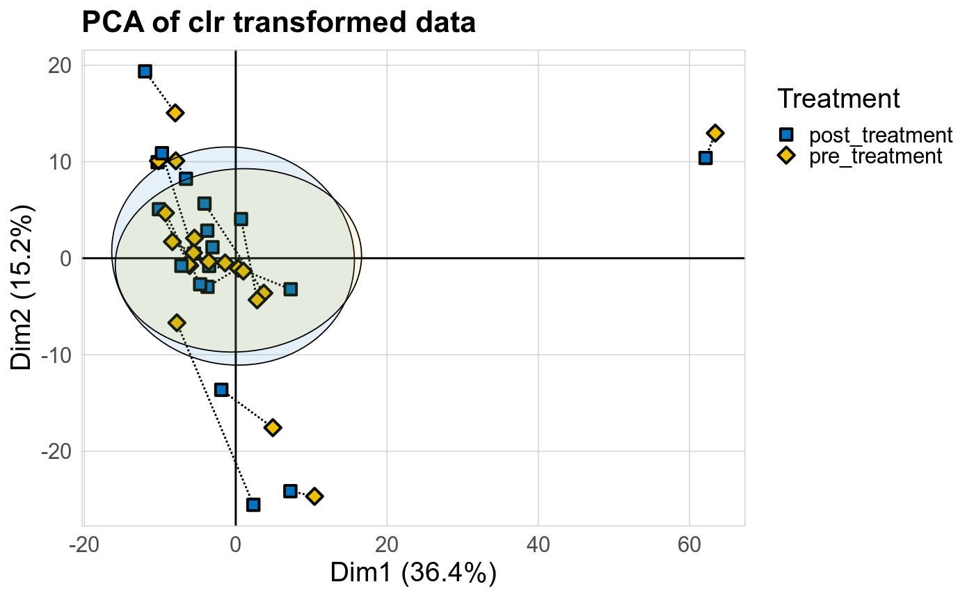 Microbial functions were analyzed using supervised and unsupervised multivariate techniques. Functional profiles were ordinated using the unsupervised methods Principal Coordinates Analysis (PCoA), Non-Metric Multidimensional Scaling (NMDS) and Principal Component Analysis (PCA). The supervised methods Adonis and Redundancy analysis (RDA) were used to assess if variance in the functional profiles was significantly associated with the study condition. A guide explaining these methods can be found here. Sparse Partial Least Square Discriminant Analysis (sPLS-DA) from the MixMc package was additionaly used to extract features associated with the condition of interest.