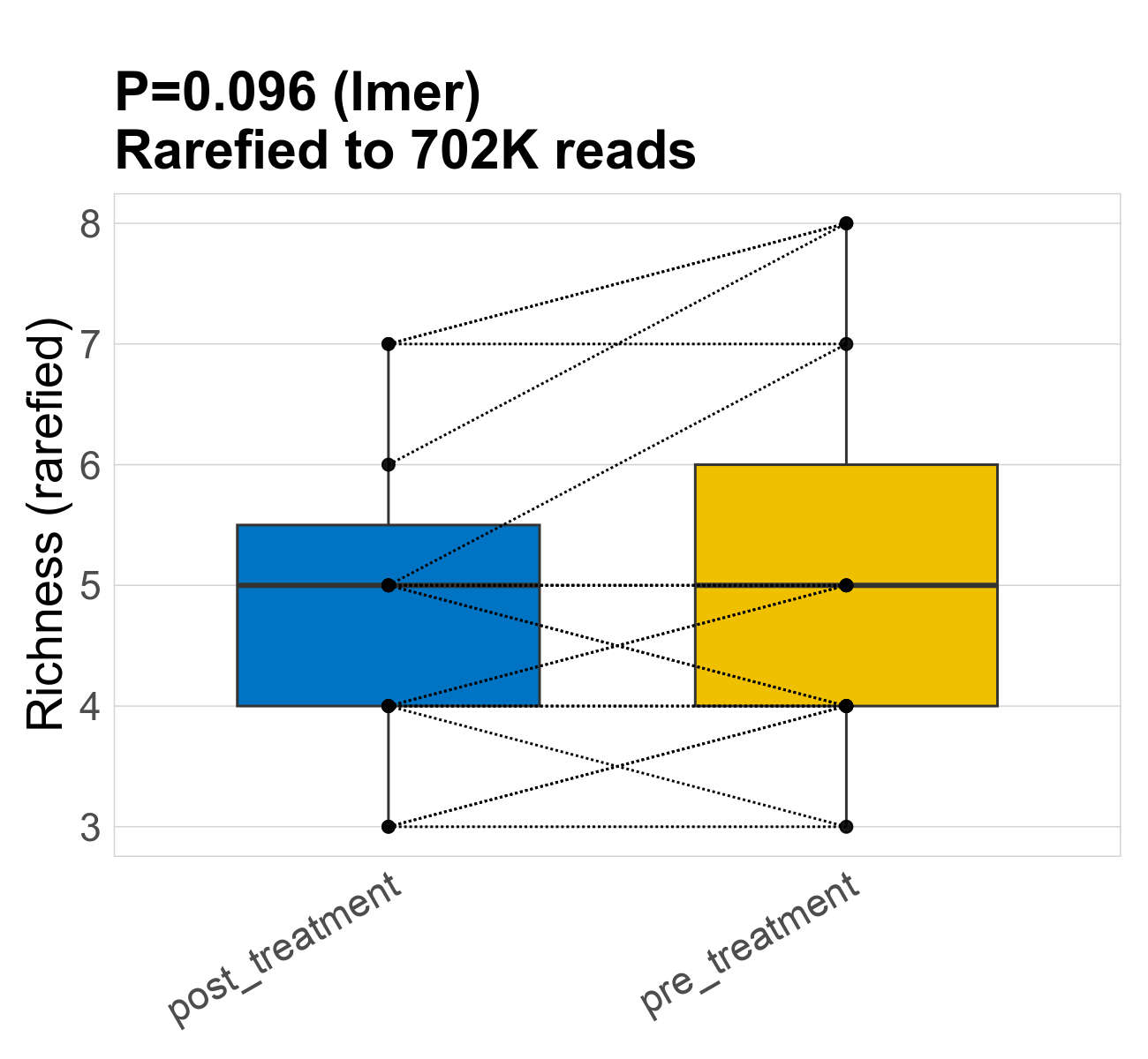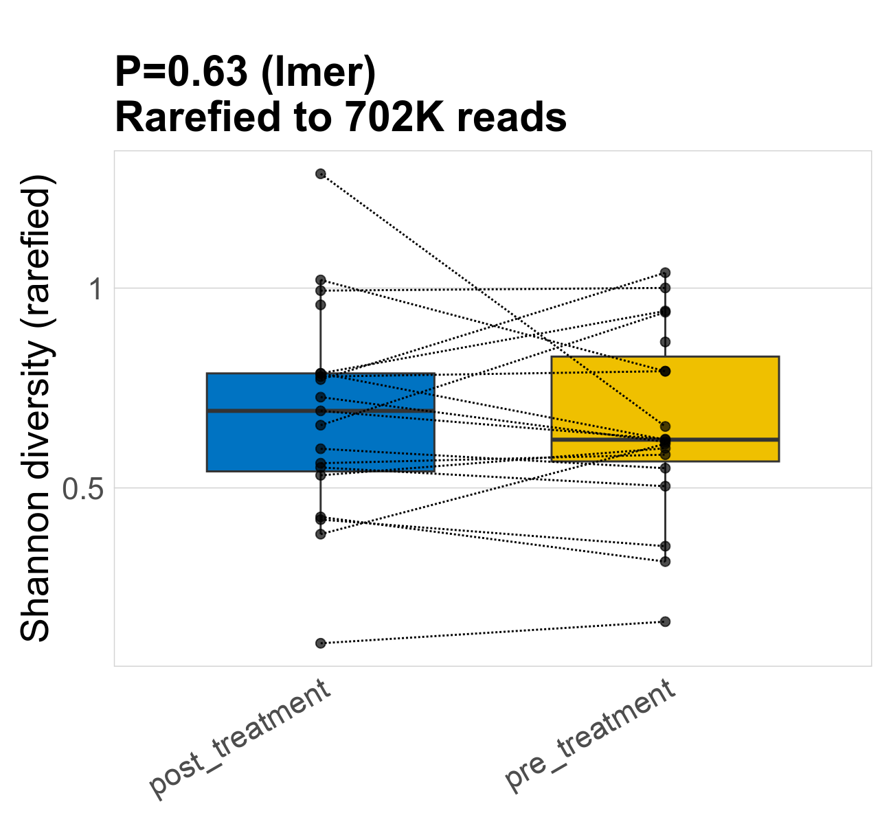 | Index | rarefiedTo | P lmer condition effect | Mean Pos | Mean Abundance | Median Abundance | Mean Treatmentpost_treatment | Median Treatmentpost_treatment | SD Treatmentpost_treatment | Mean Treatmentpre_treatment | Median Treatmentpre_treatment | SD Treatmentpre_treatment | Fold Change Log2(Treatmentpre_treatment/Treatmentpost_treatment) | Positive samples | Positive Treatmentpost_treatment | Positive Treatmentpre_treatment | Positive_Treatmentpost_treatment_percent | Positive_Treatmentpre_treatment_percent |