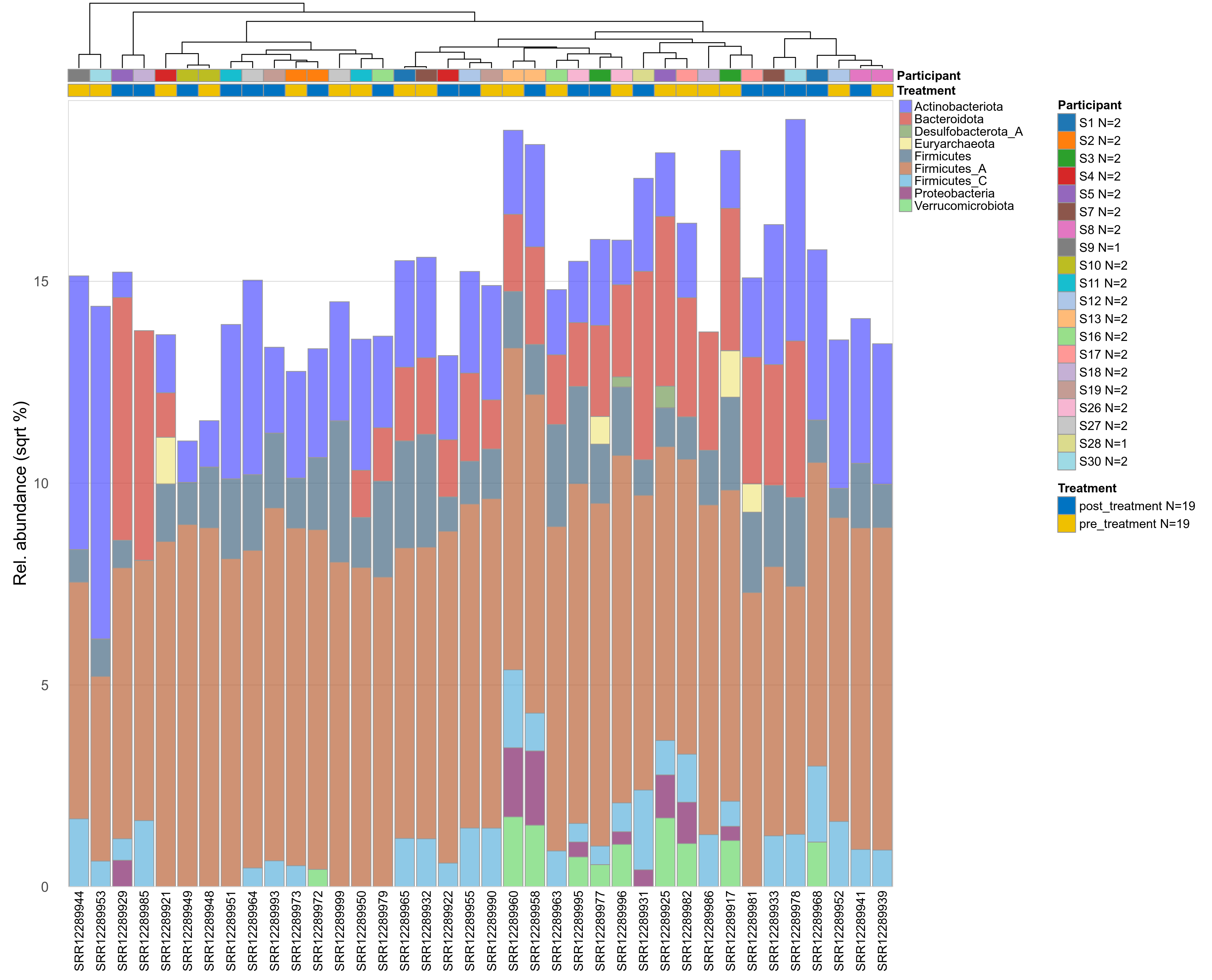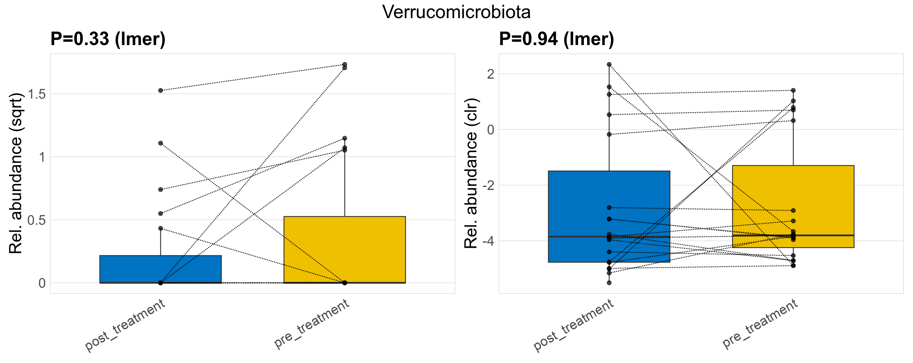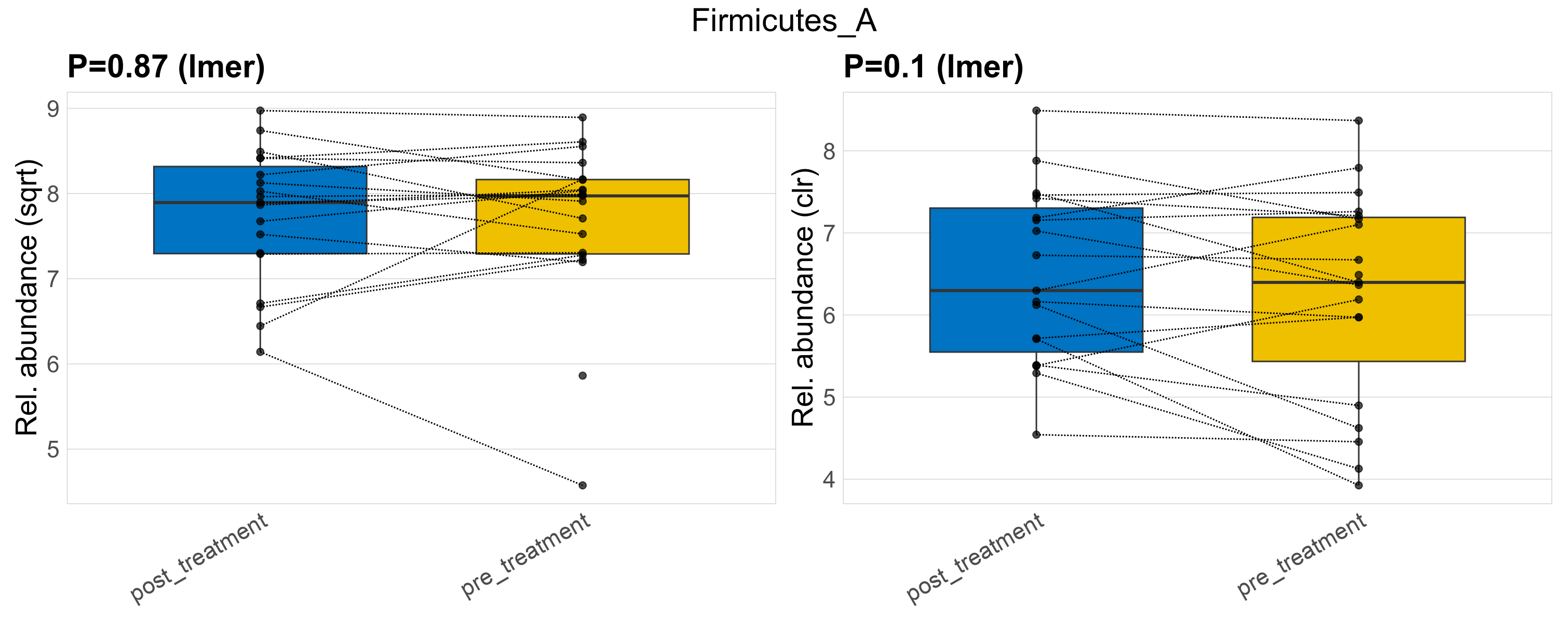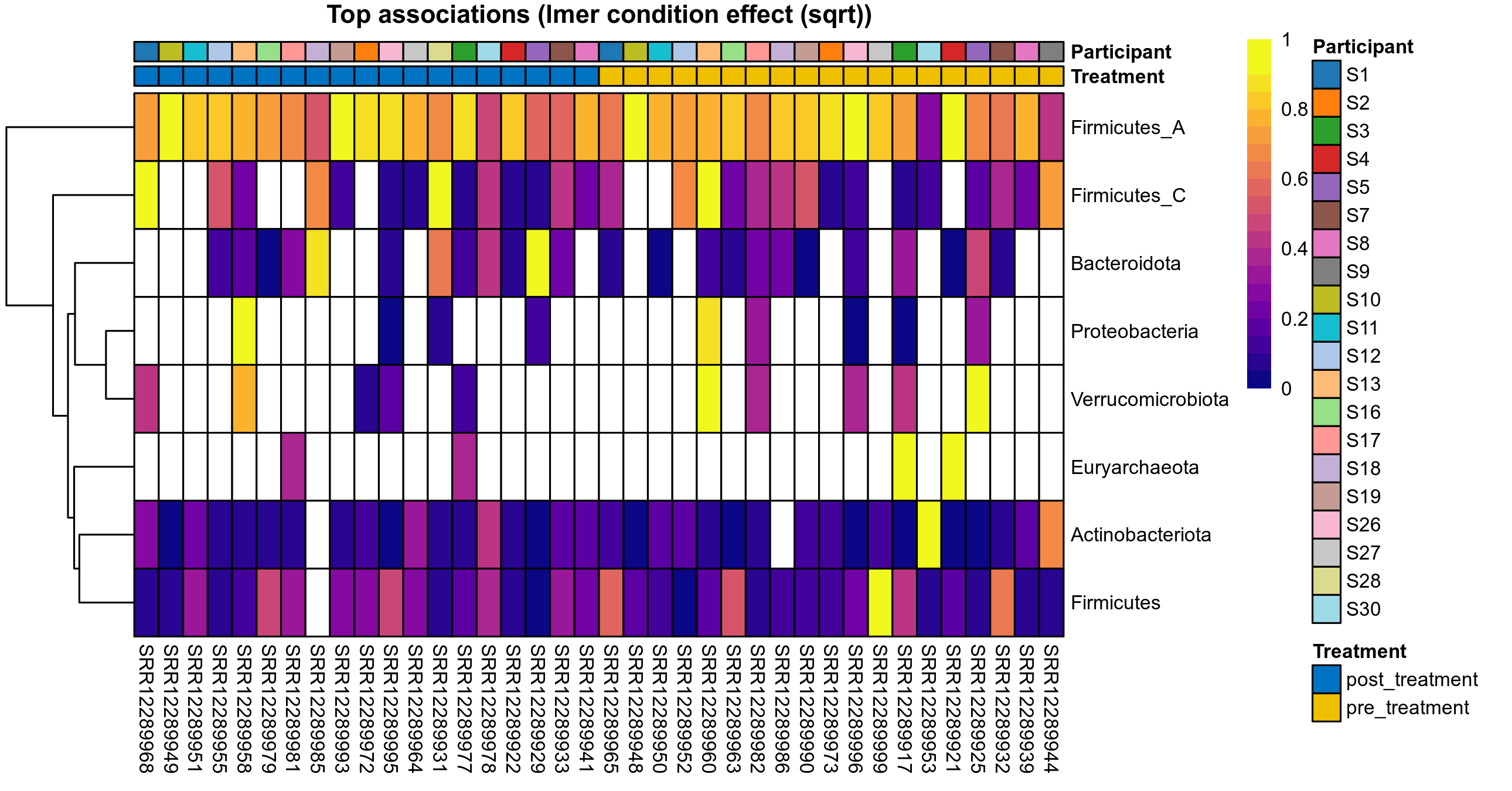 P lmer condition effect (sqrt): Differentially abundant species were identified by linear mixed effect regression without confounders. Random effects: Participant (intercept). Fixed effects: Treatment. Effect tested: Treatment.