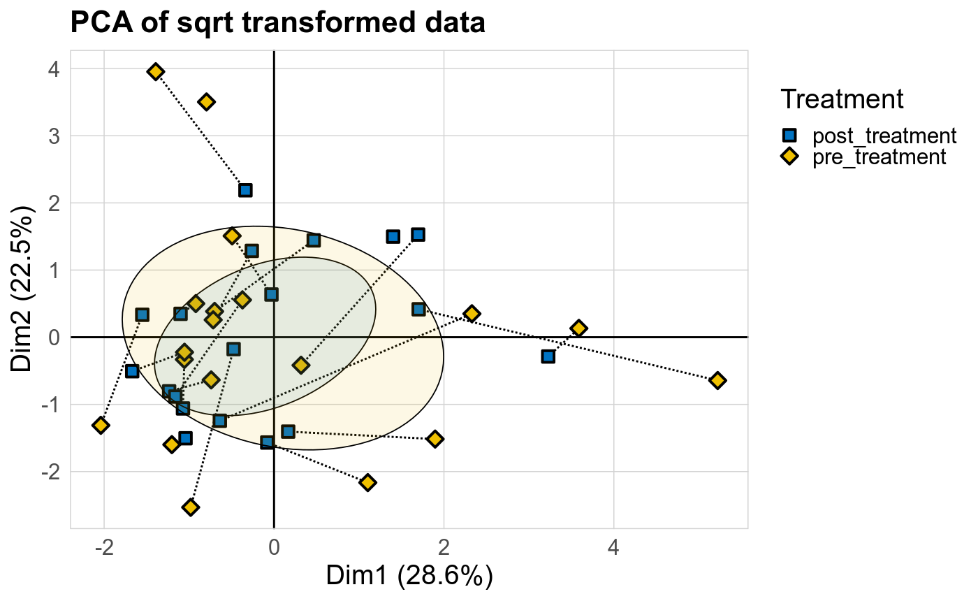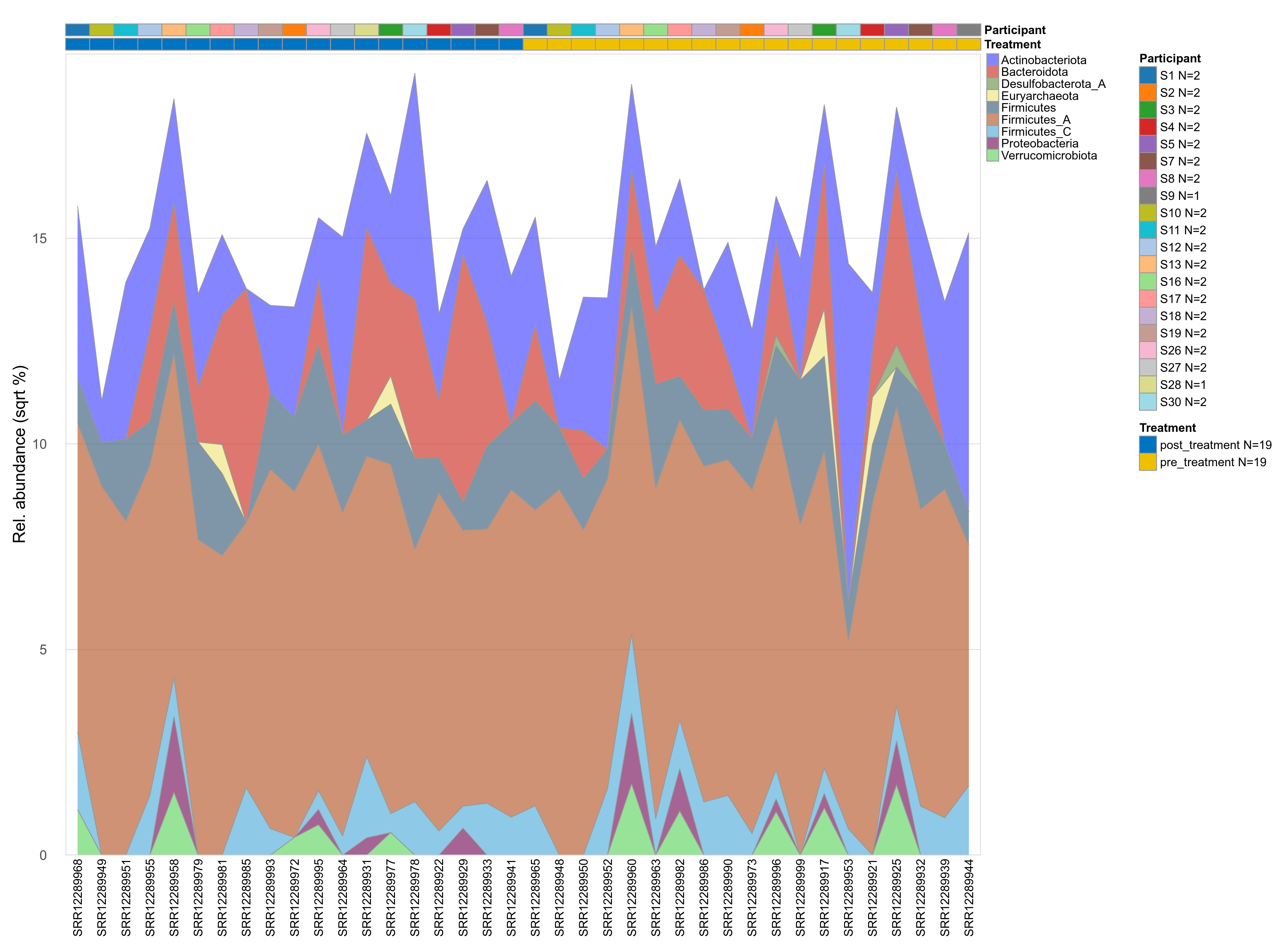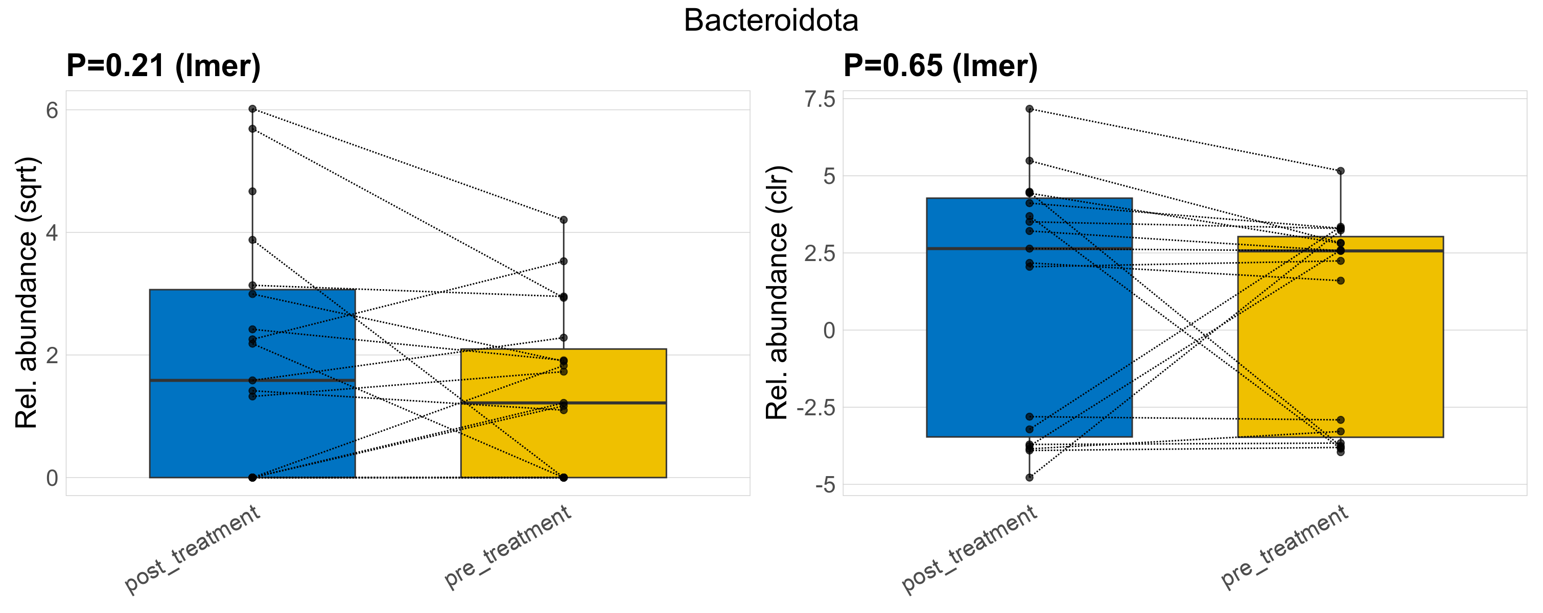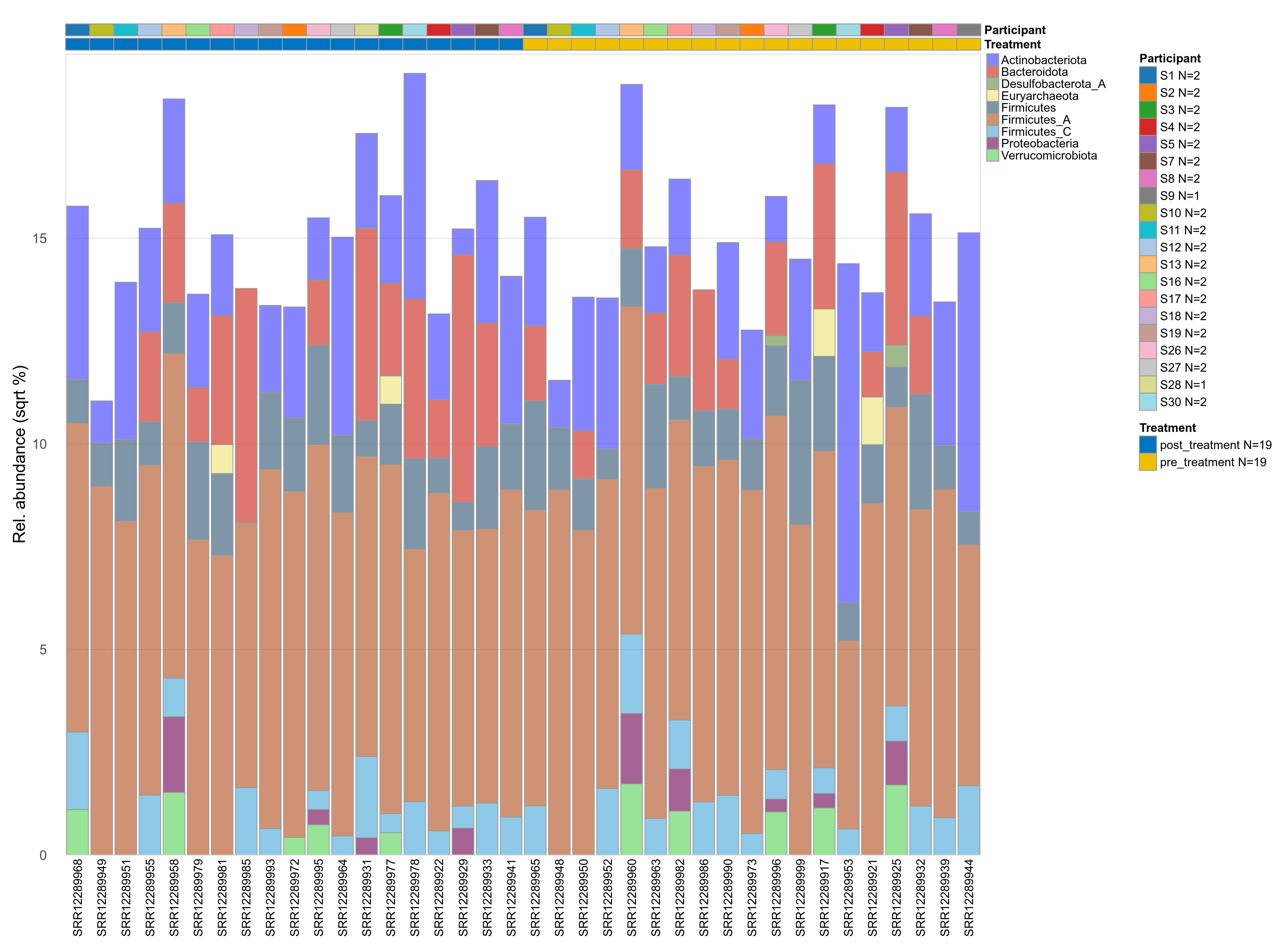 P lmer condition effect (sqrt): Differentially abundant species were identified by linear mixed effect regression without confounders. Random effects: Participant (intercept). Fixed effects: Treatment. Effect tested: Treatment.