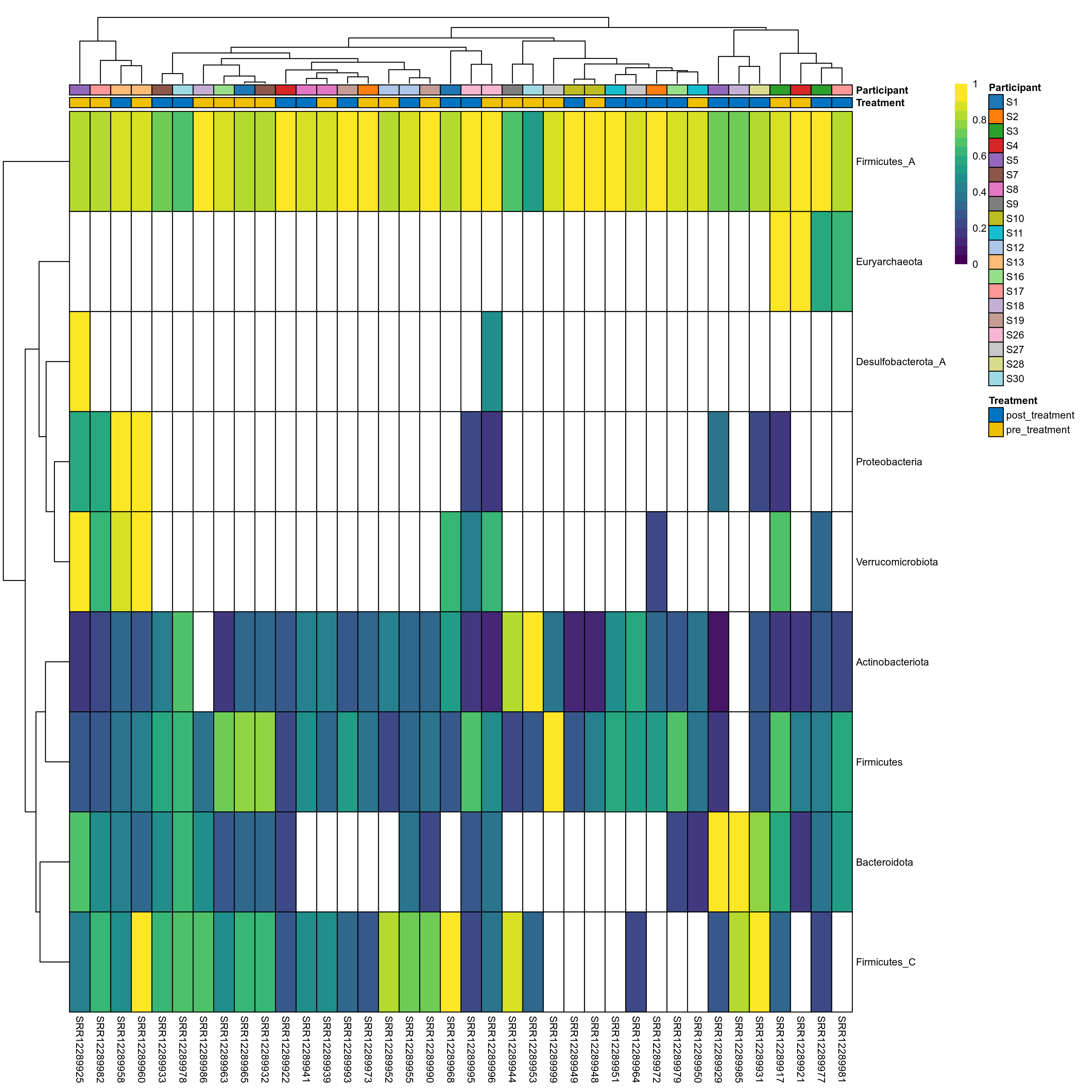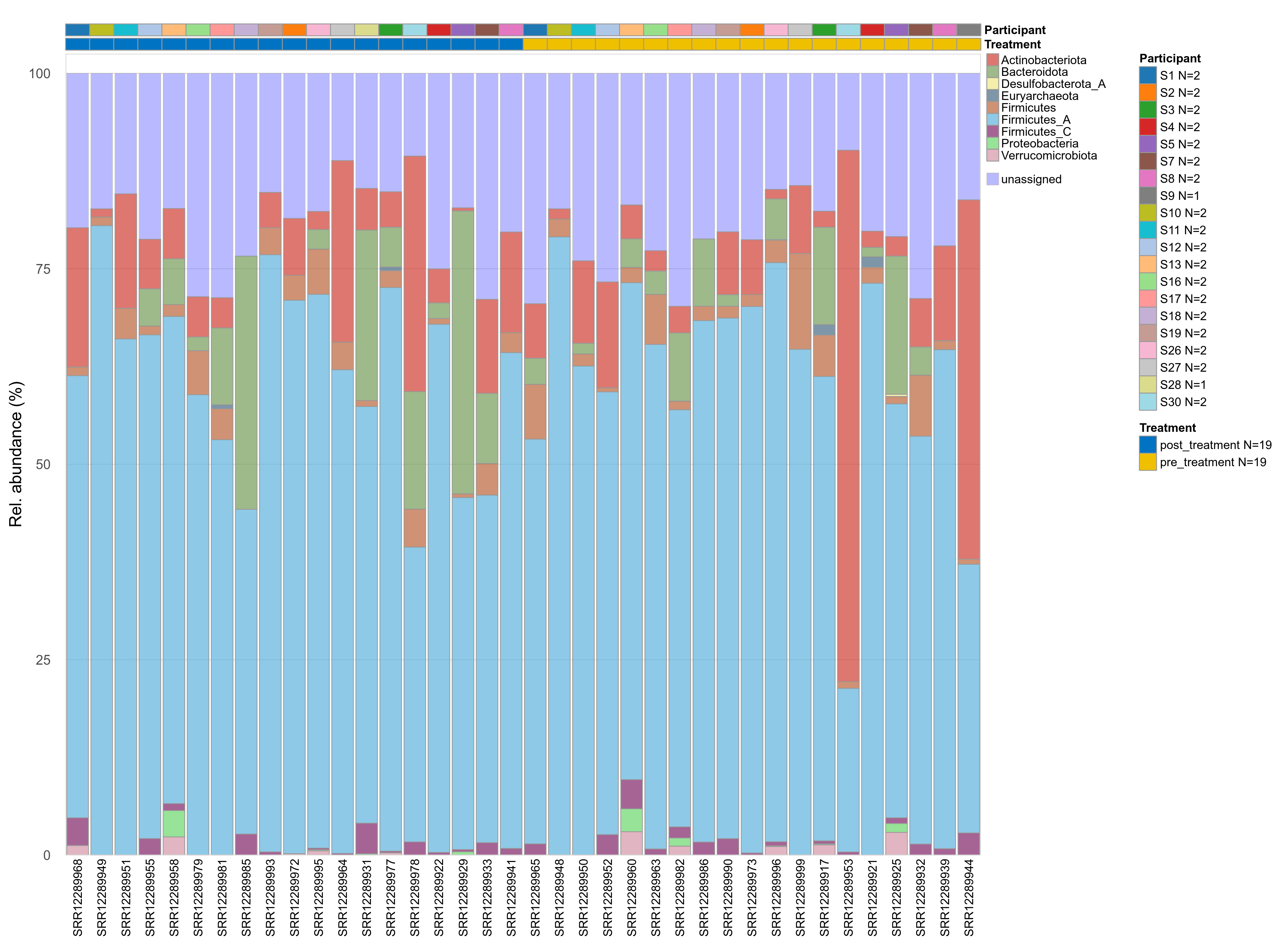 | Taxon | GTDB taxonomy | P lmer condition effect (sqrt) | FDR lmer condition effect (sqrt) | Pbonf lmer condition effect (sqrt) | P lmer condition effect (clr) | FDR lmer condition effect (clr) | Pbonf lmer condition effect (clr) | Mean Pos | Mean Abundance | Median Abundance | Mean Treatmentpost_treatment | Median Treatmentpost_treatment | SD Treatmentpost_treatment | Mean Treatmentpre_treatment | Median Treatmentpre_treatment | SD Treatmentpre_treatment | Fold Change Log2(Treatmentpre_treatment/Treatmentpost_treatment) | Positive samples | Positive Treatmentpost_treatment | Positive Treatmentpre_treatment | Positive_Treatmentpost_treatment_percent | Positive_Treatmentpre_treatment_percent |