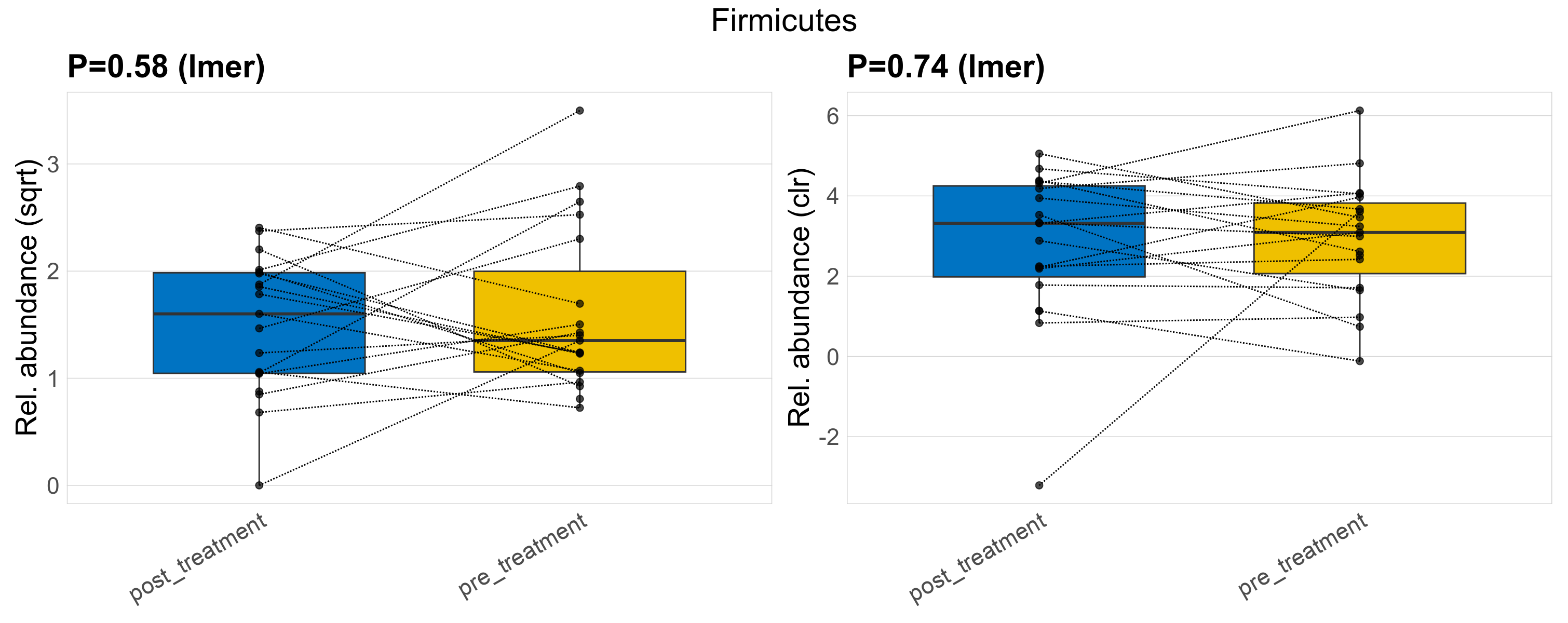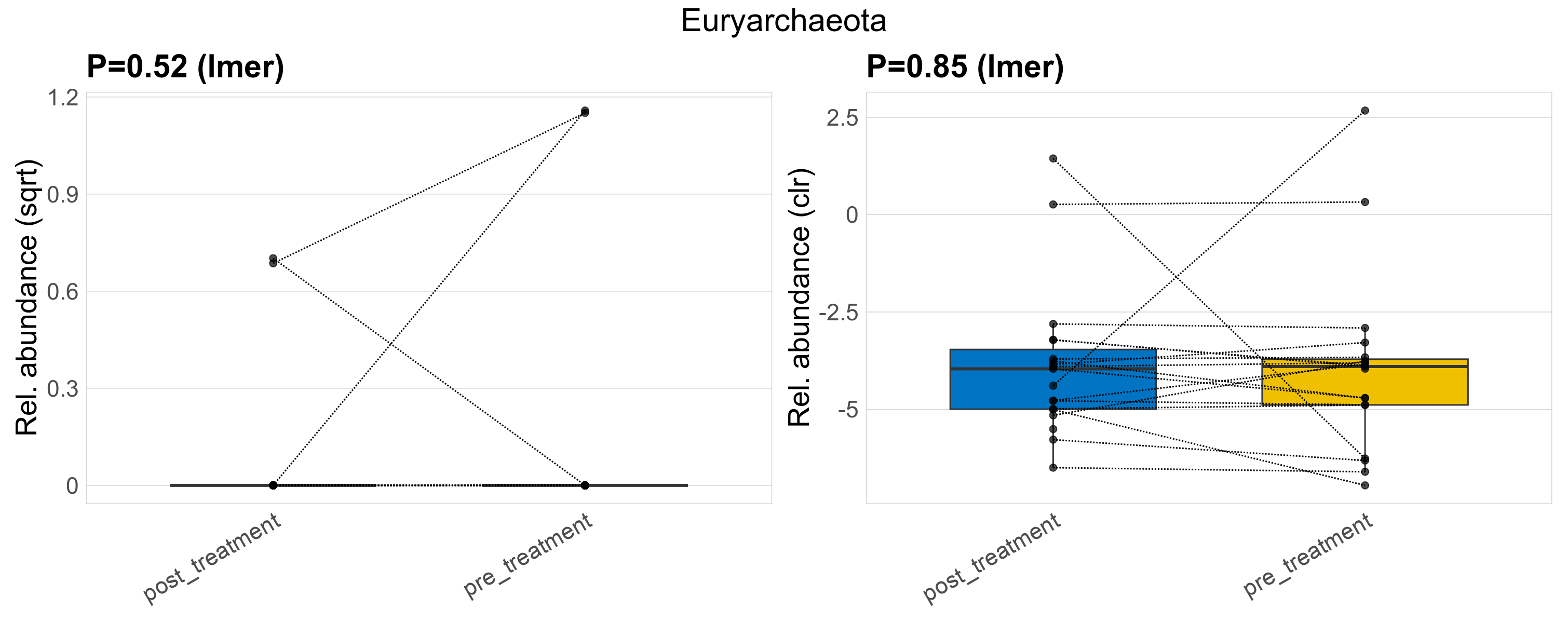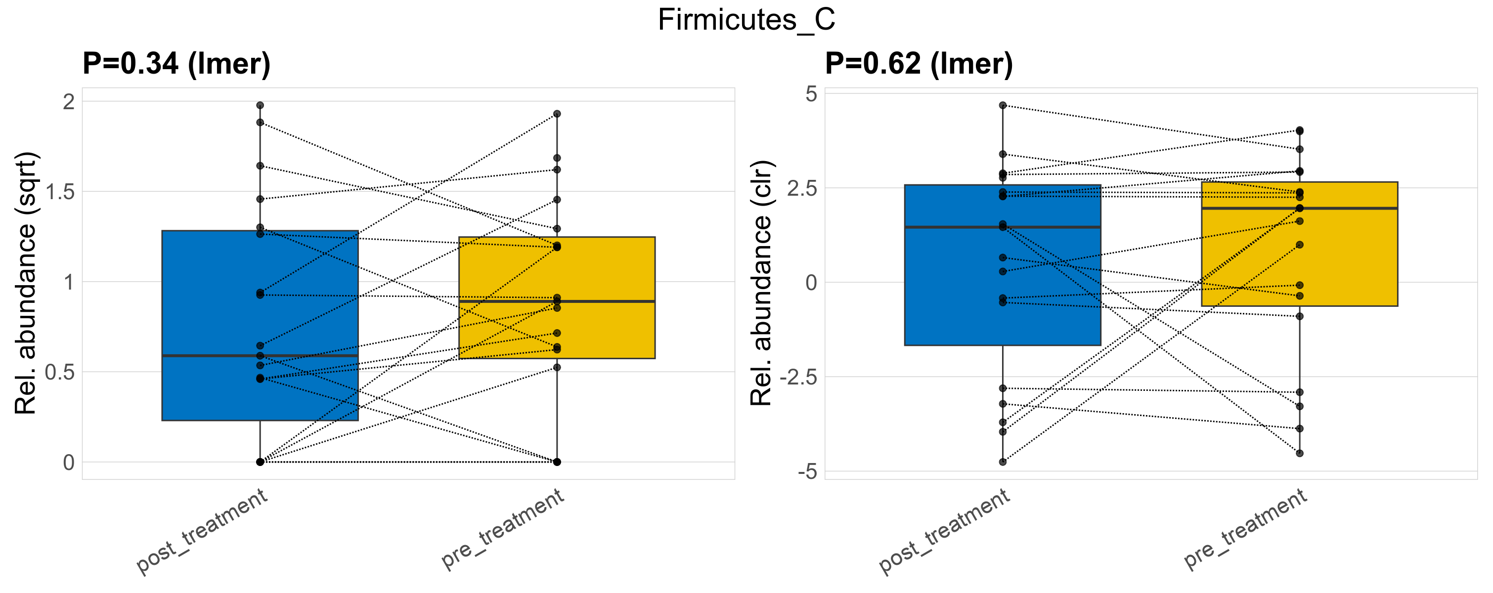 P lmer condition effect (clr): Differentially abundant species were identified by linear mixed effect regression without confounders. Random effects: Participant (intercept). Fixed effects: Treatment. Effect tested: Treatment.
