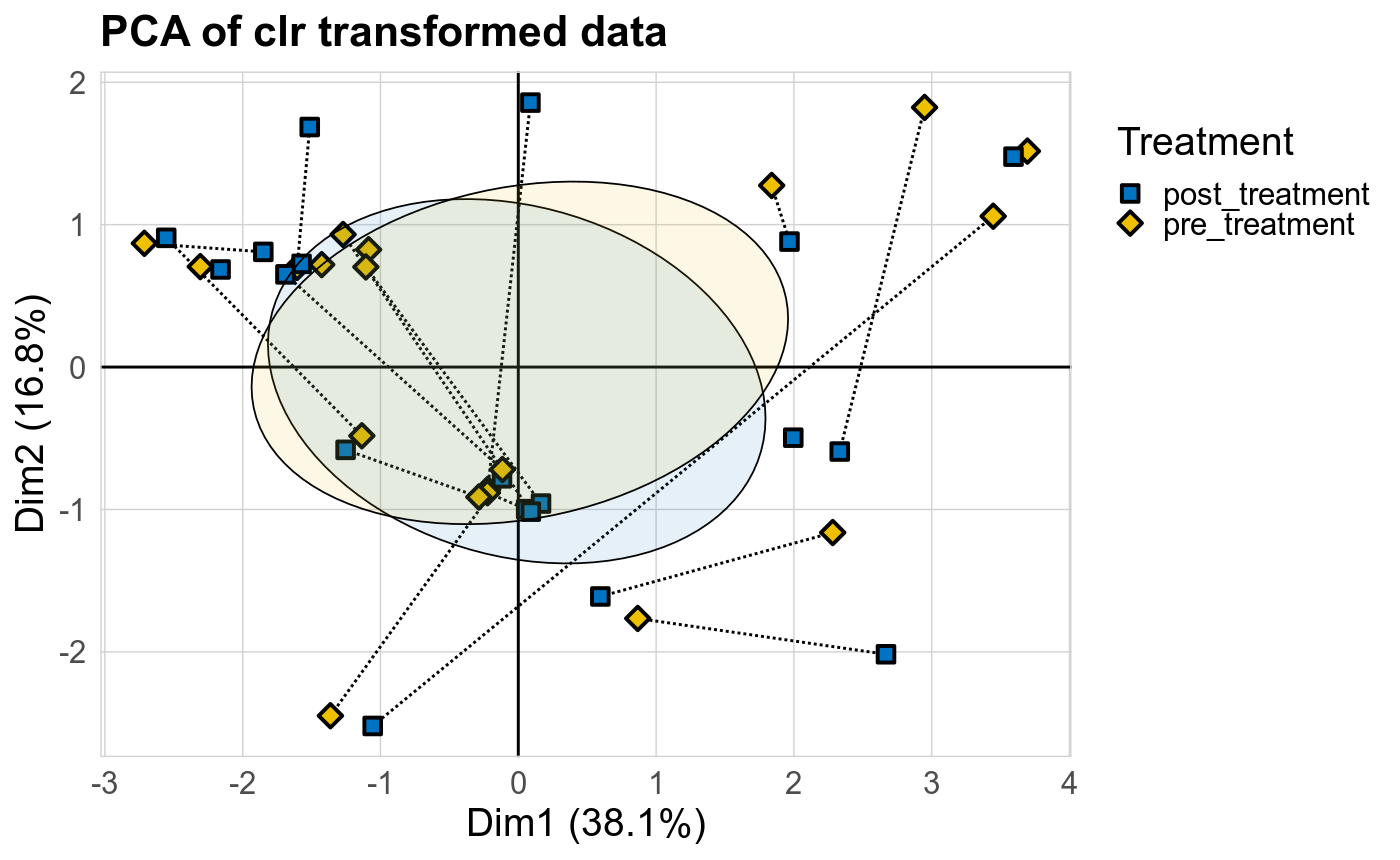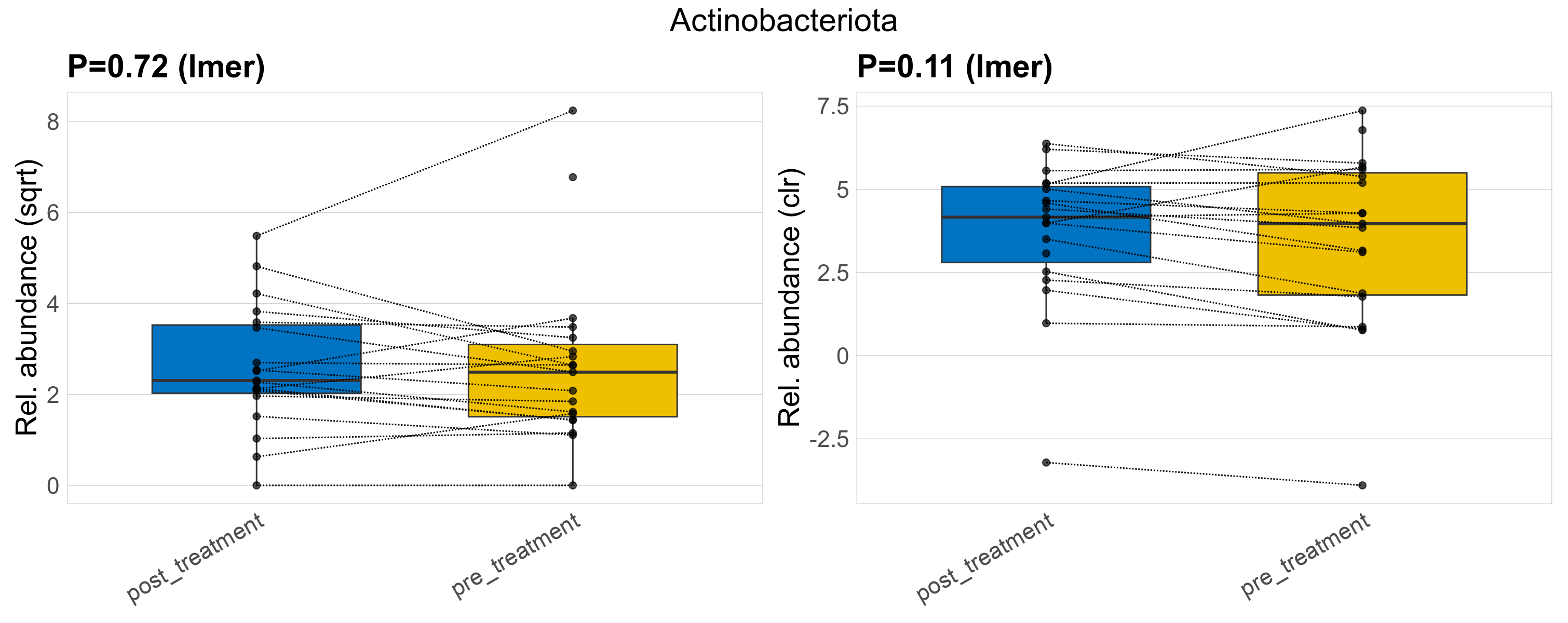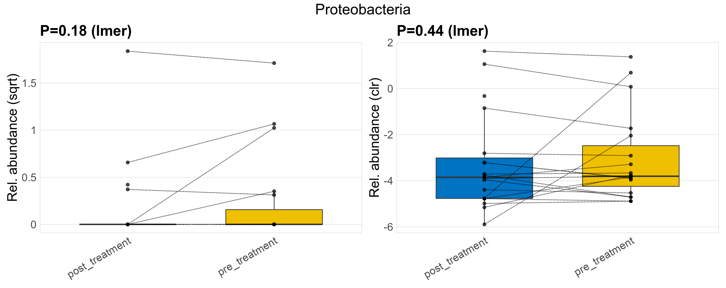 P lmer condition effect (clr): Differentially abundant species were identified by linear mixed effect regression without confounders. Random effects: Participant (intercept). Fixed effects: Treatment. Effect tested: Treatment.