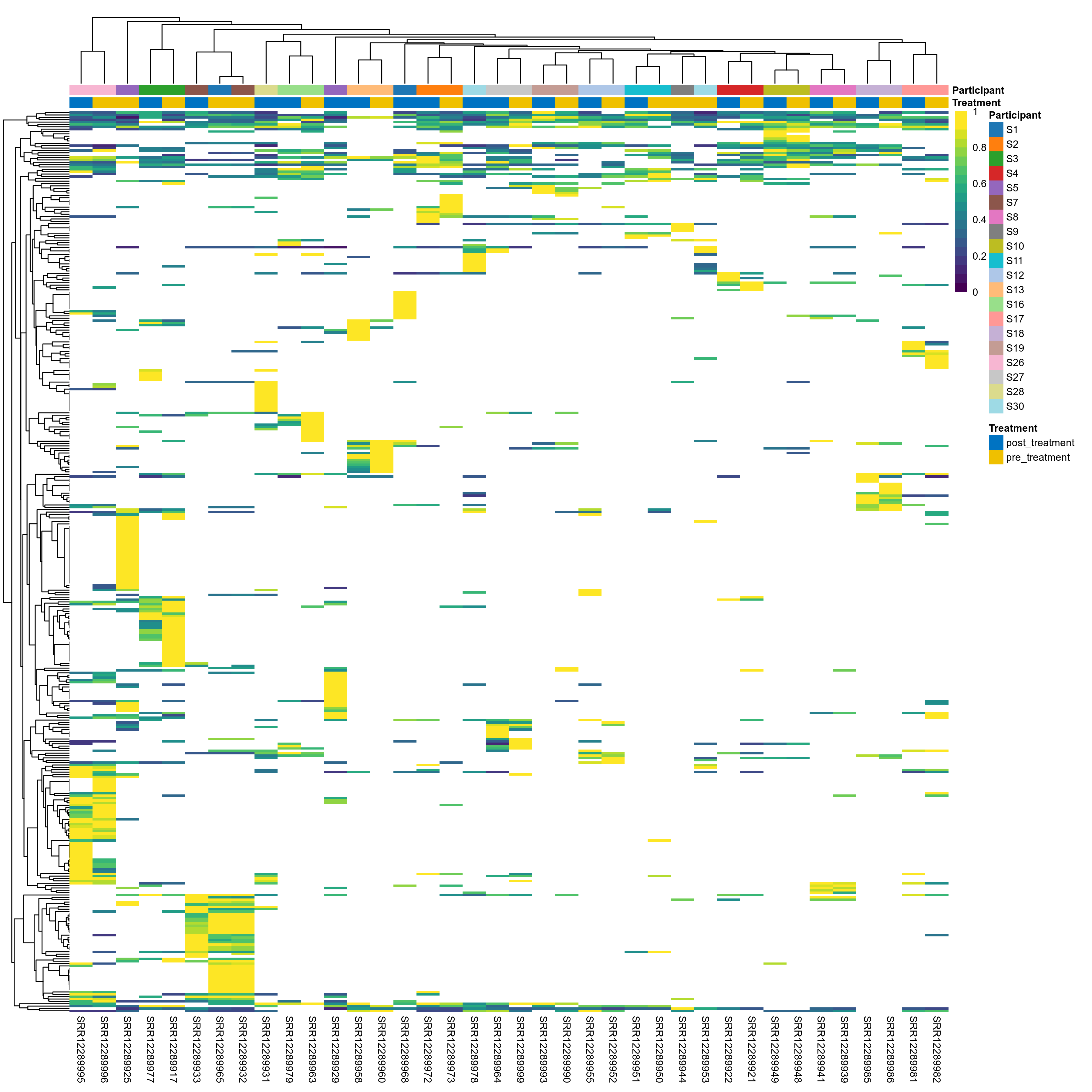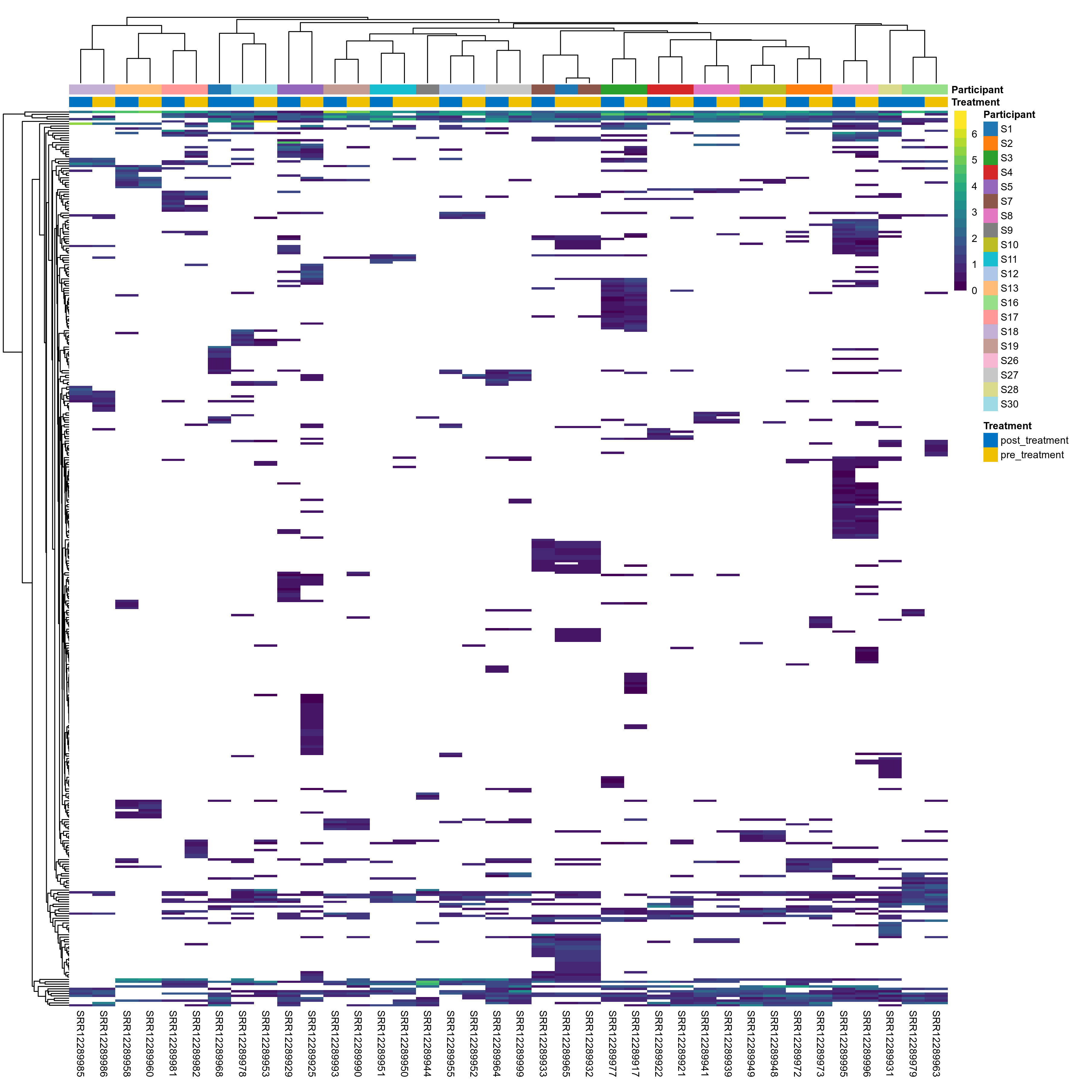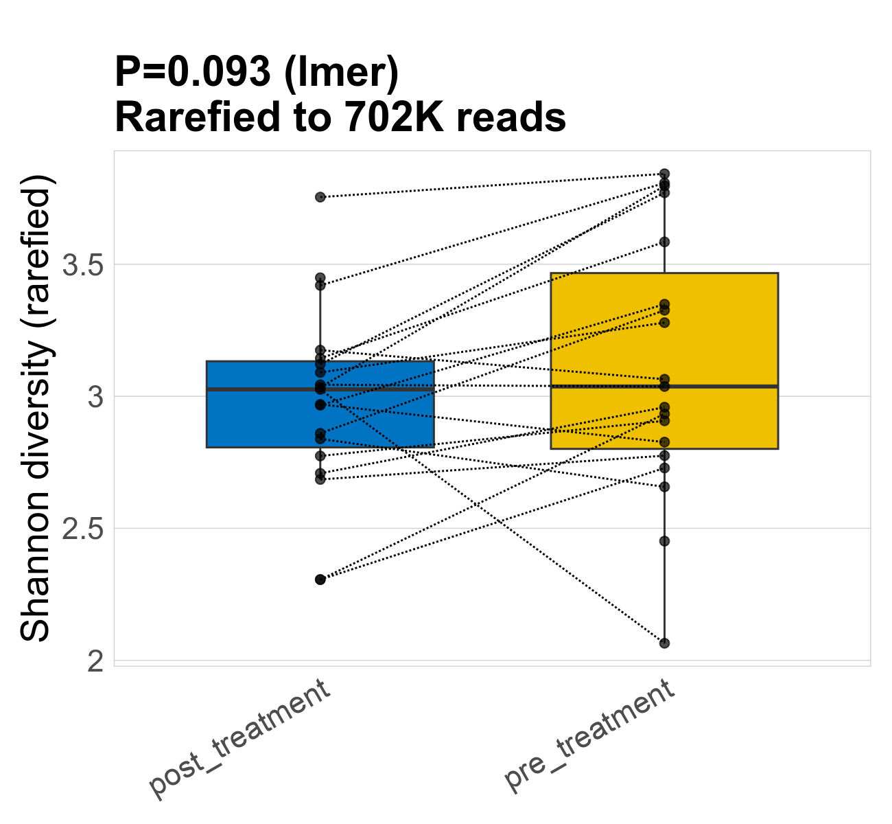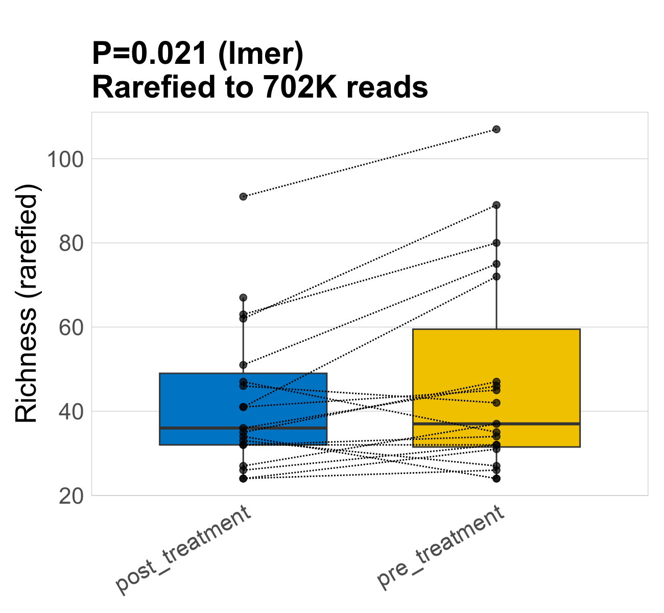 | Index | rarefiedTo | P lmer condition effect | Mean Pos | Mean Abundance | Median Abundance | Mean Treatmentpost_treatment | Median Treatmentpost_treatment | SD Treatmentpost_treatment | Mean Treatmentpre_treatment | Median Treatmentpre_treatment | SD Treatmentpre_treatment | Fold Change Log2(Treatmentpre_treatment/Treatmentpost_treatment) | Positive samples | Positive Treatmentpost_treatment | Positive Treatmentpre_treatment | Positive_Treatmentpost_treatment_percent | Positive_Treatmentpre_treatment_percent |