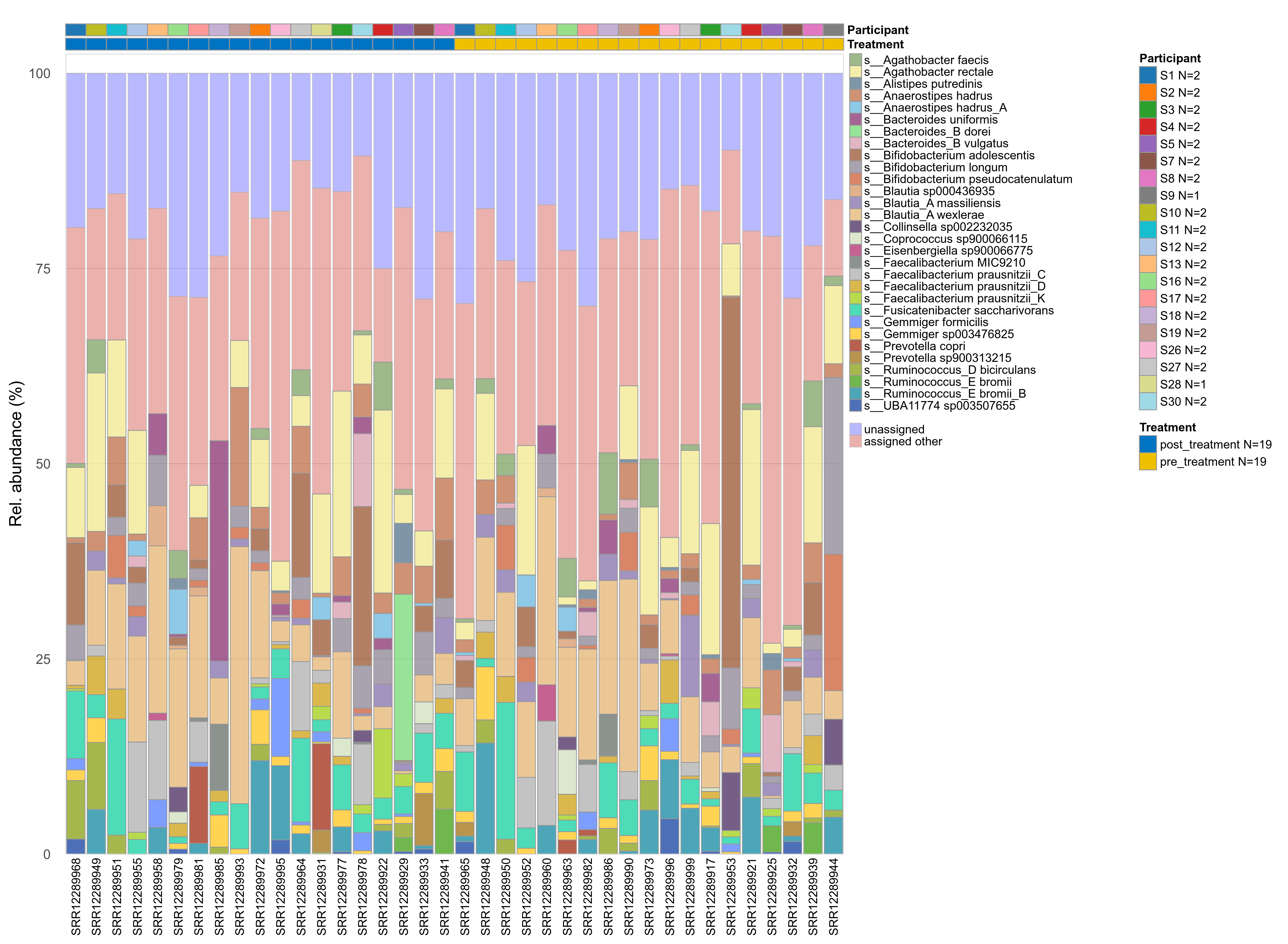 | s__Agathobacter rectale | d__Bacteria; p__Firmicutes_A; c__Clostridia; o__Lachnospirales; f__Lachnospiraceae; g__Agathobacter | 0.35 | 0.66 | 1 | 0.56 | 0.73 | 1 | 9.7 | 8.1 | 6.5 | 8.7 | 6.3 | 7.1 | 7.6 | 6.7 | 6.8 | -0.2 | 32 / 38 (84%) | 16 / 19 (84%) | 16 / 19 (84%) | 0.842 | 0.842 |