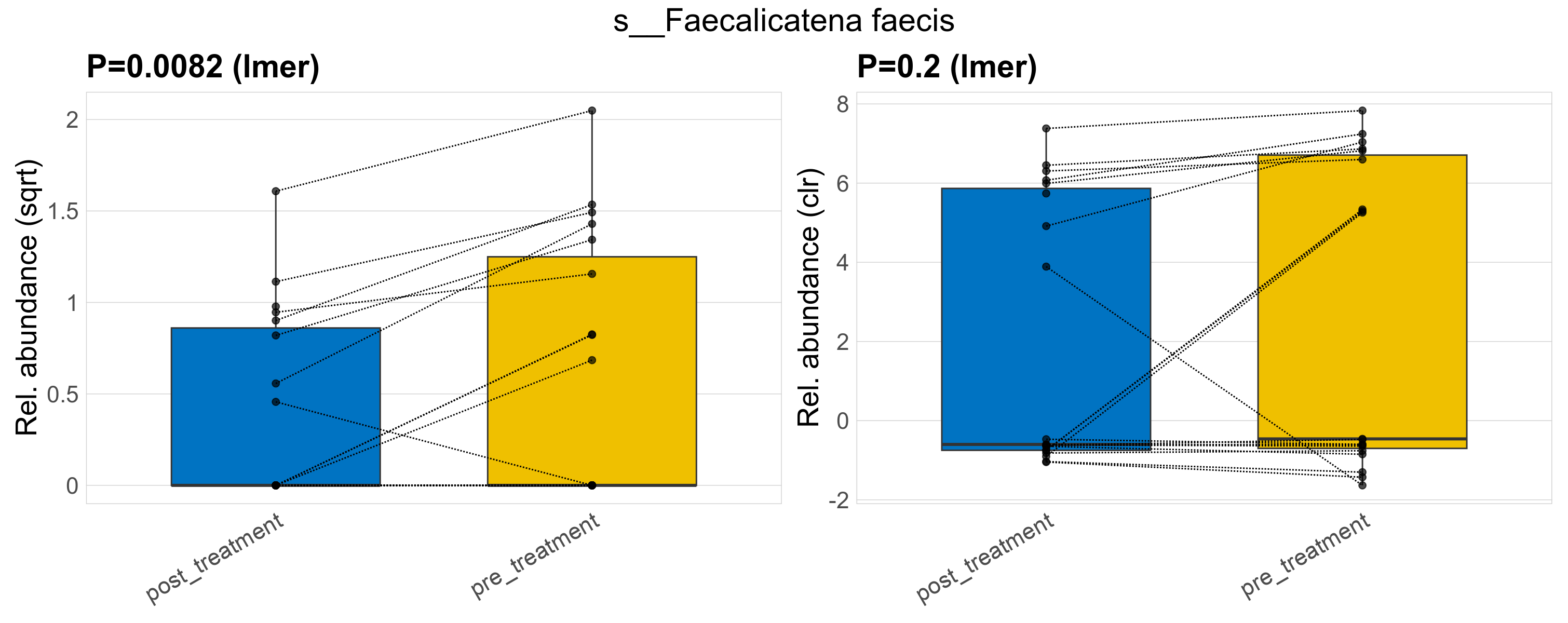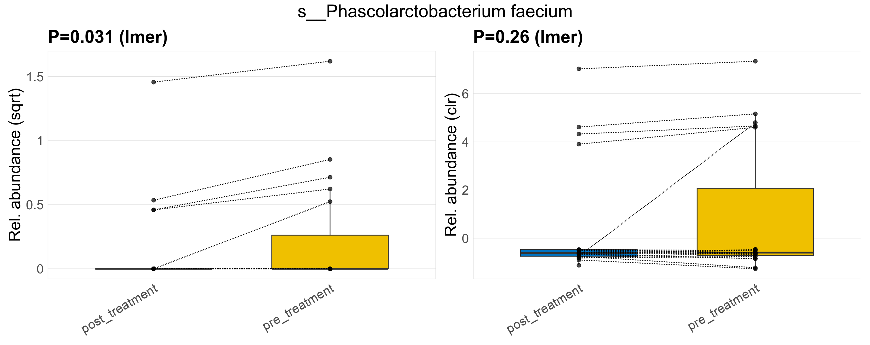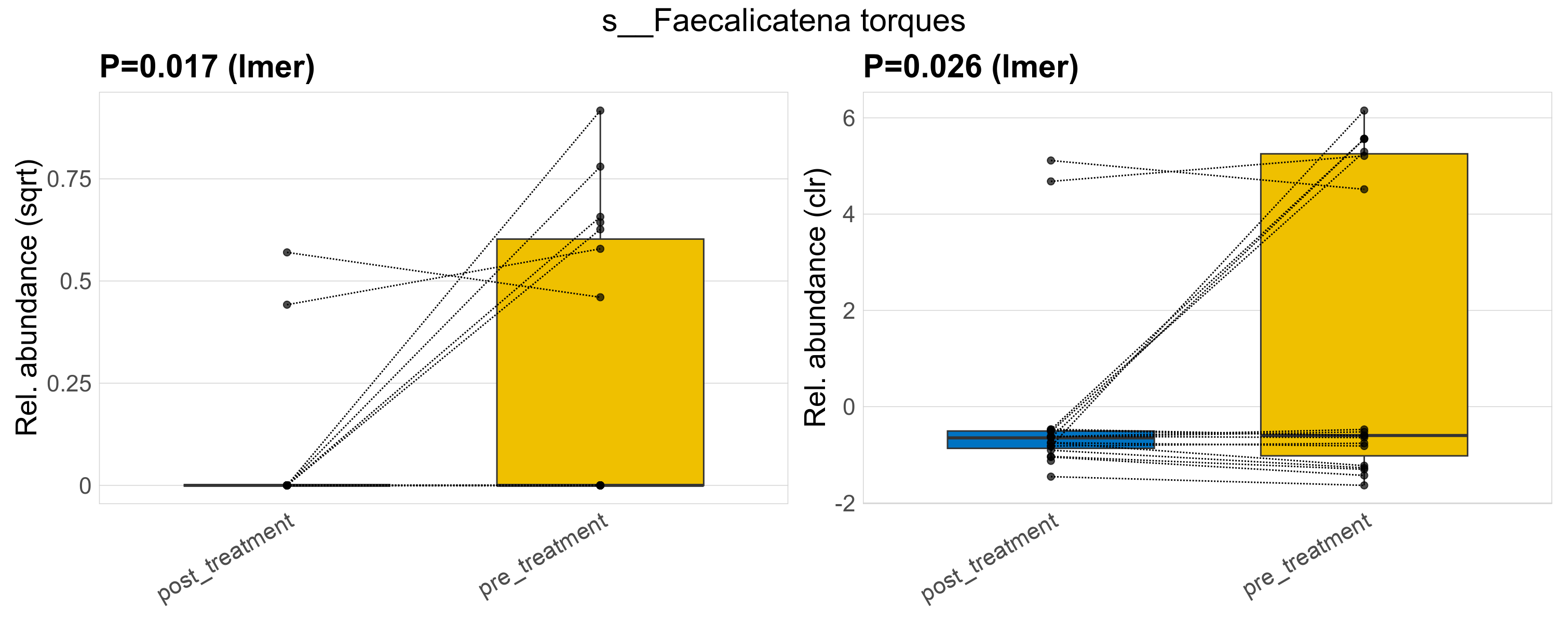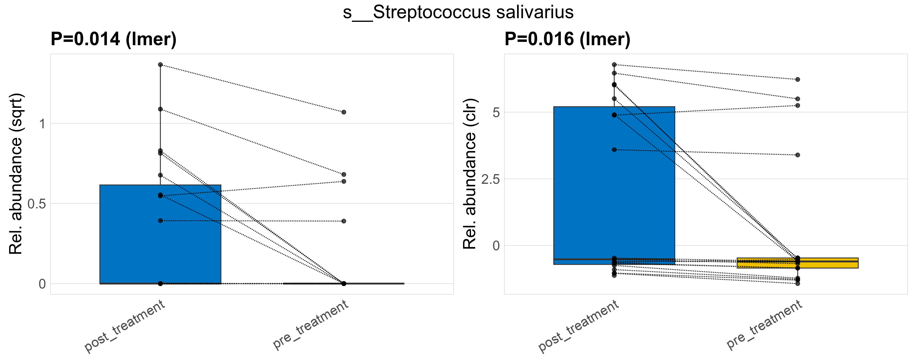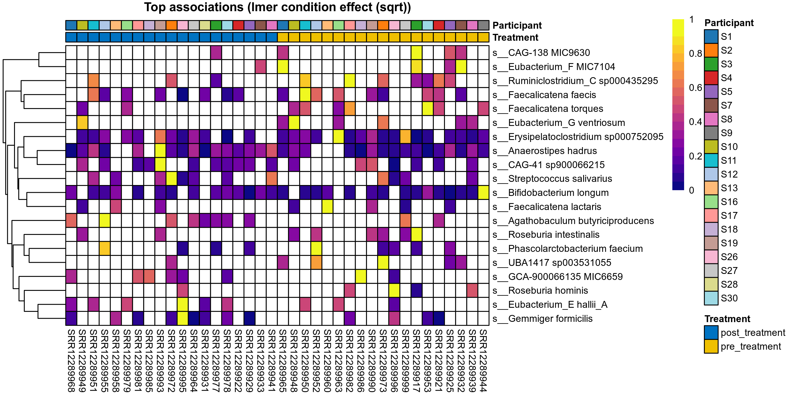 P lmer condition effect (sqrt): Differentially abundant species were identified by linear mixed effect regression without confounders. Random effects: Participant (intercept). Fixed effects: Treatment. Effect tested: Treatment.