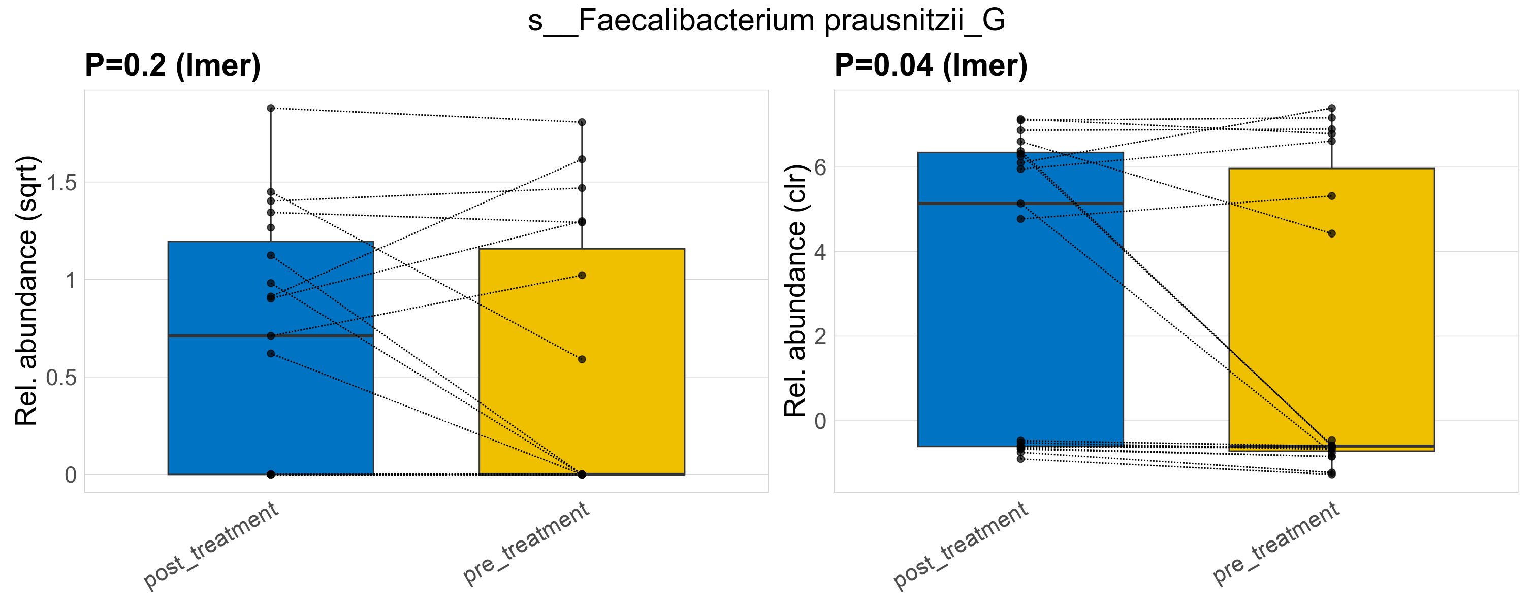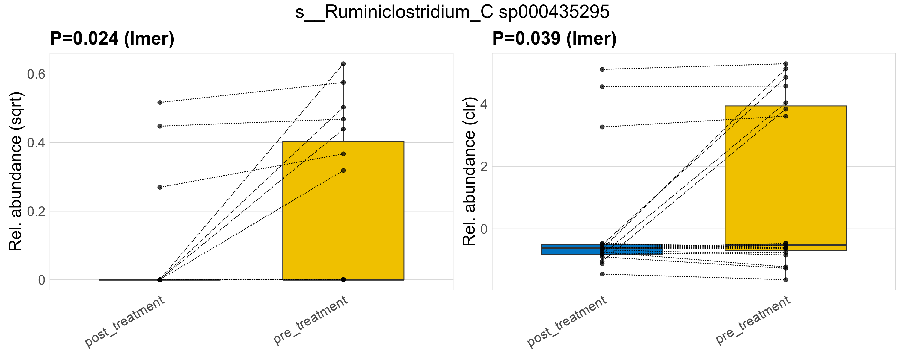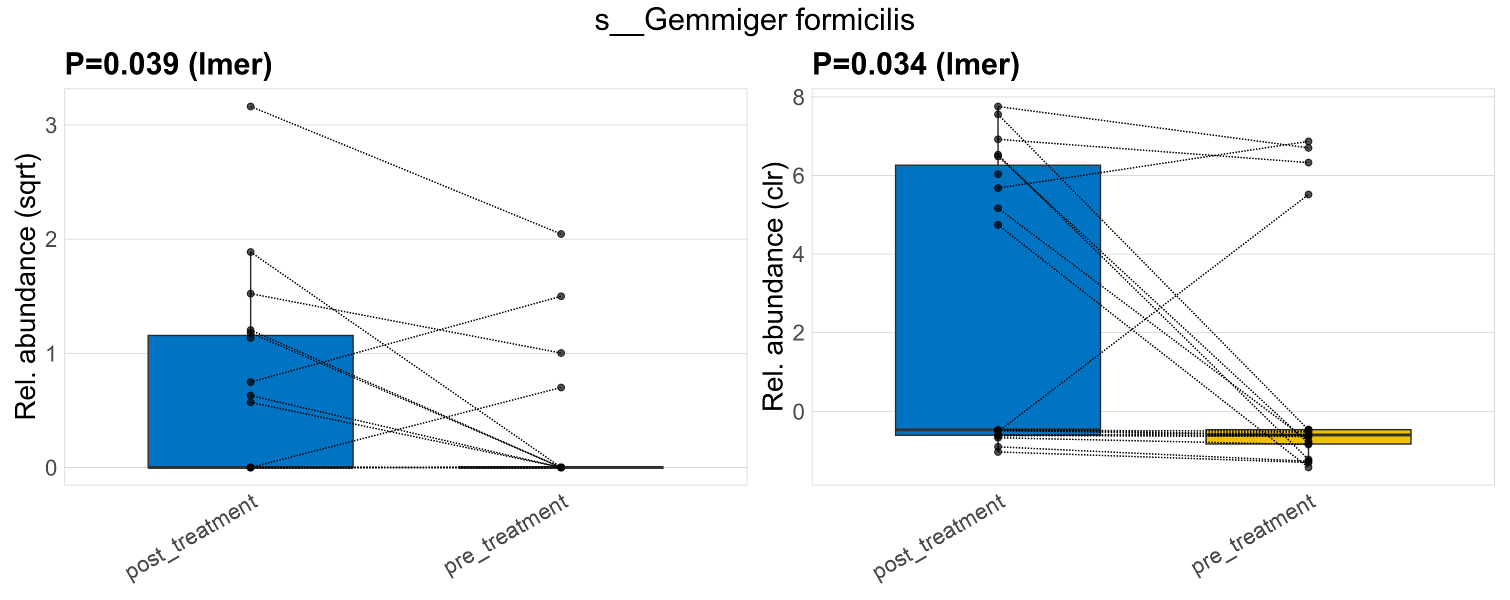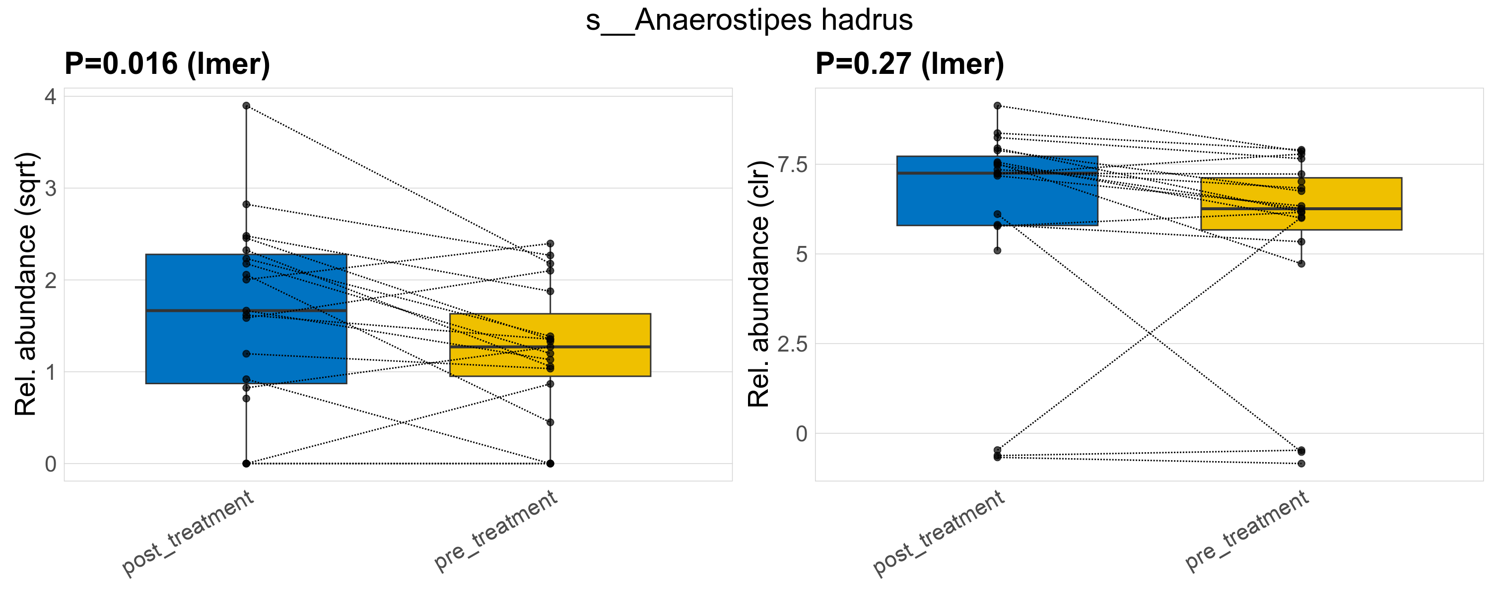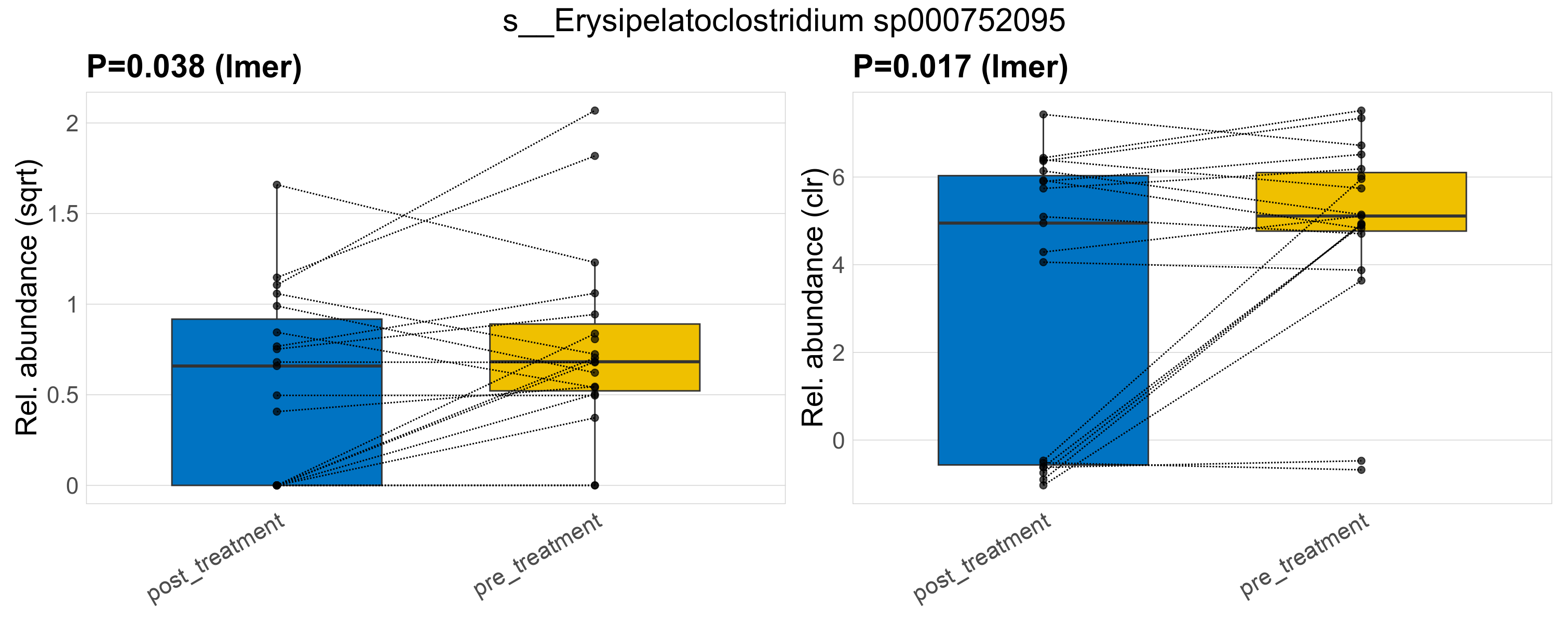 P lmer condition effect (sqrt): Differentially abundant species were identified by linear mixed effect regression without confounders. Random effects: Participant (intercept). Fixed effects: Treatment. Effect tested: Treatment.