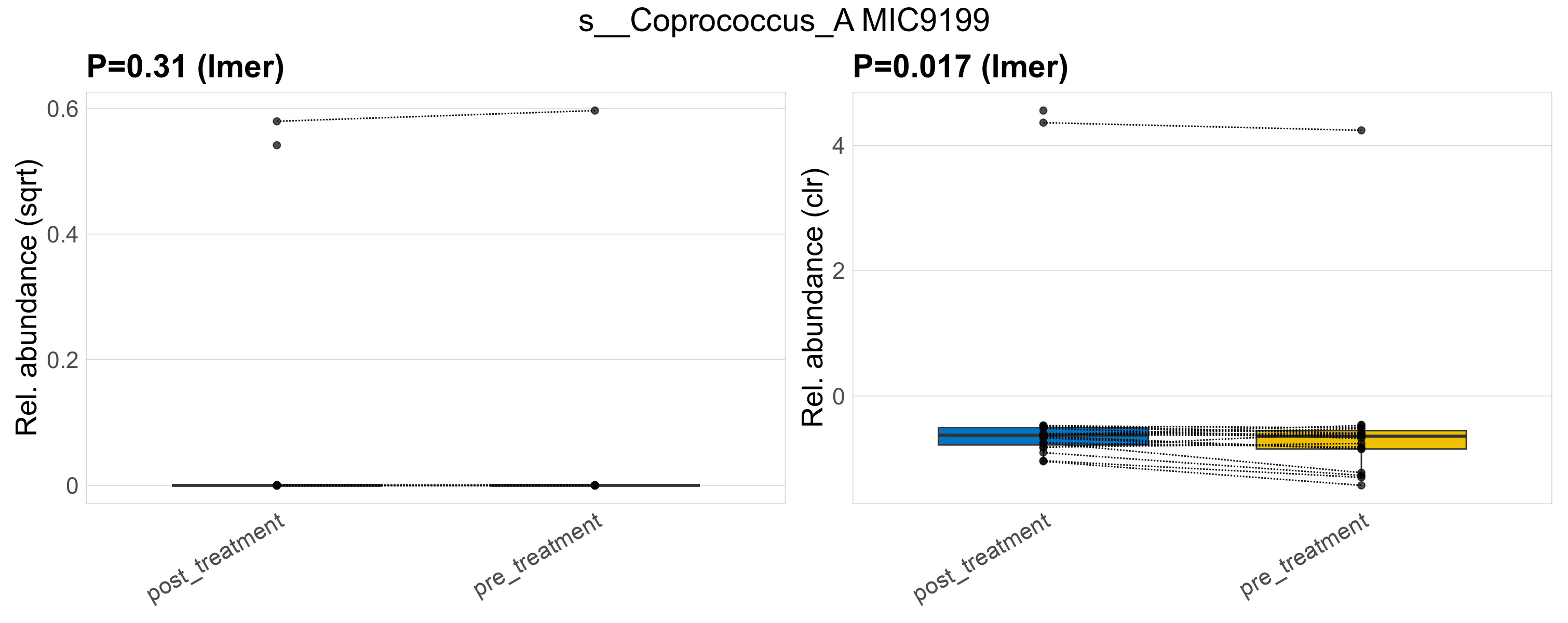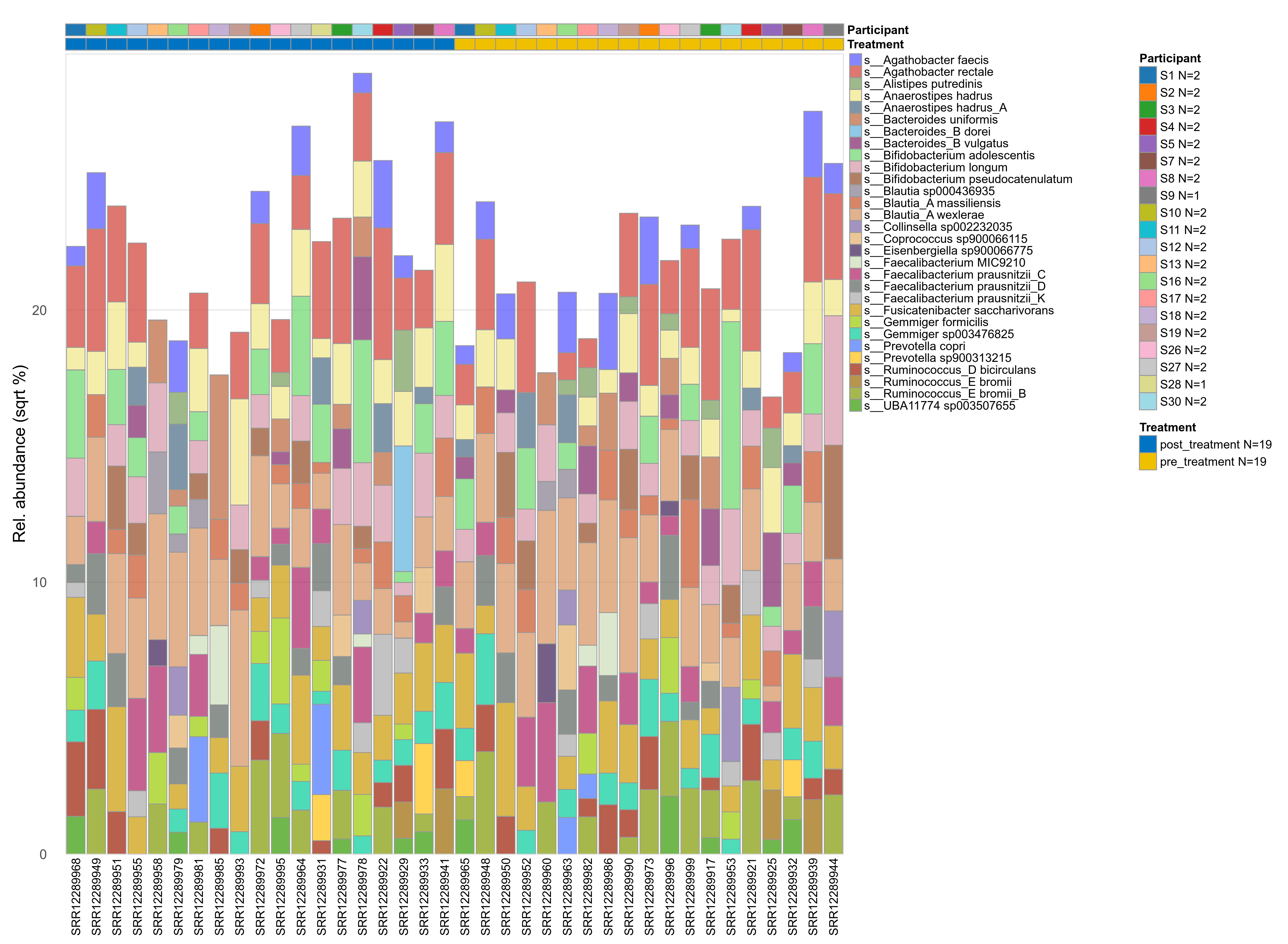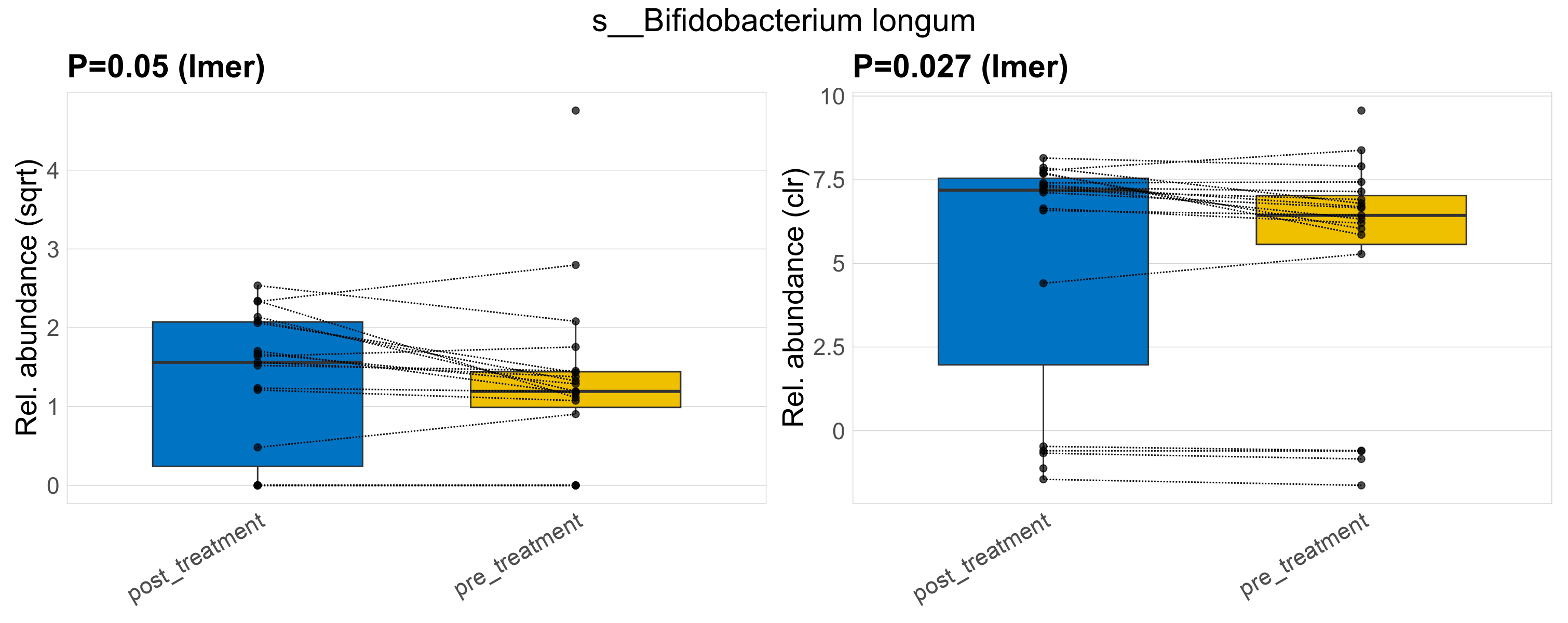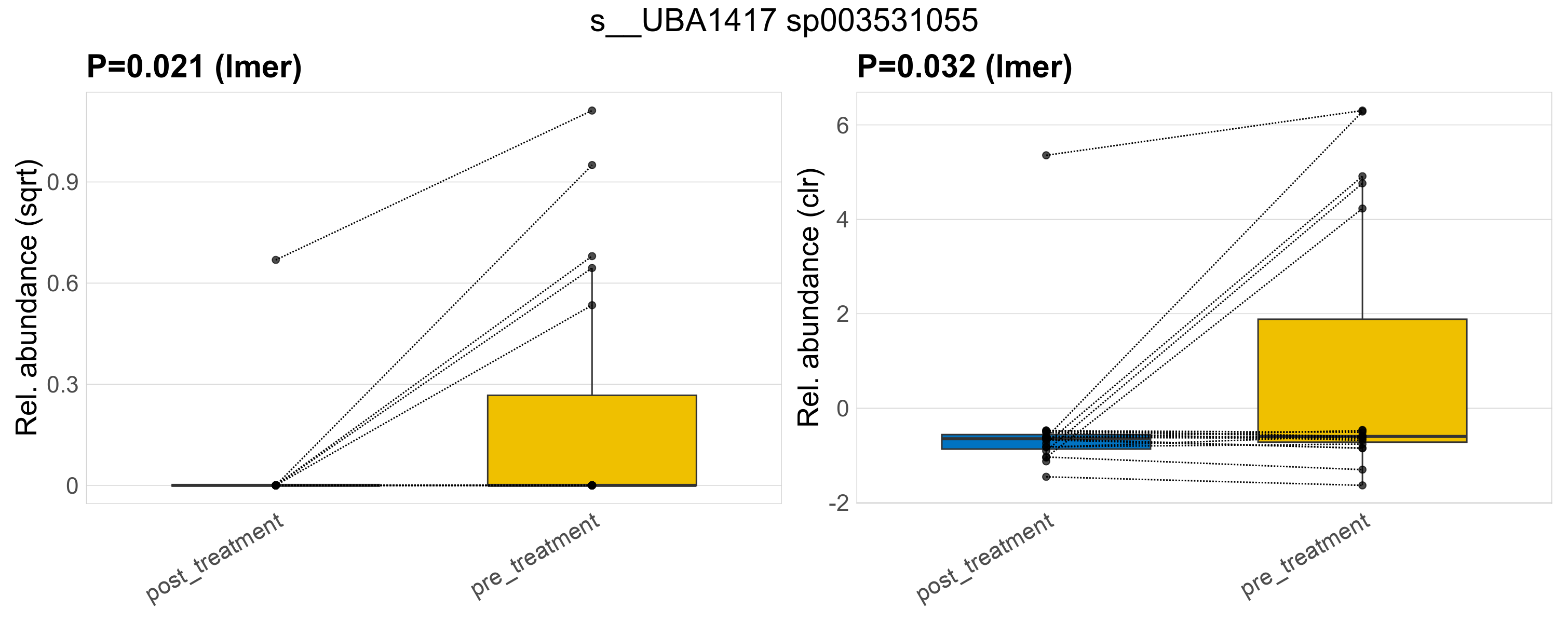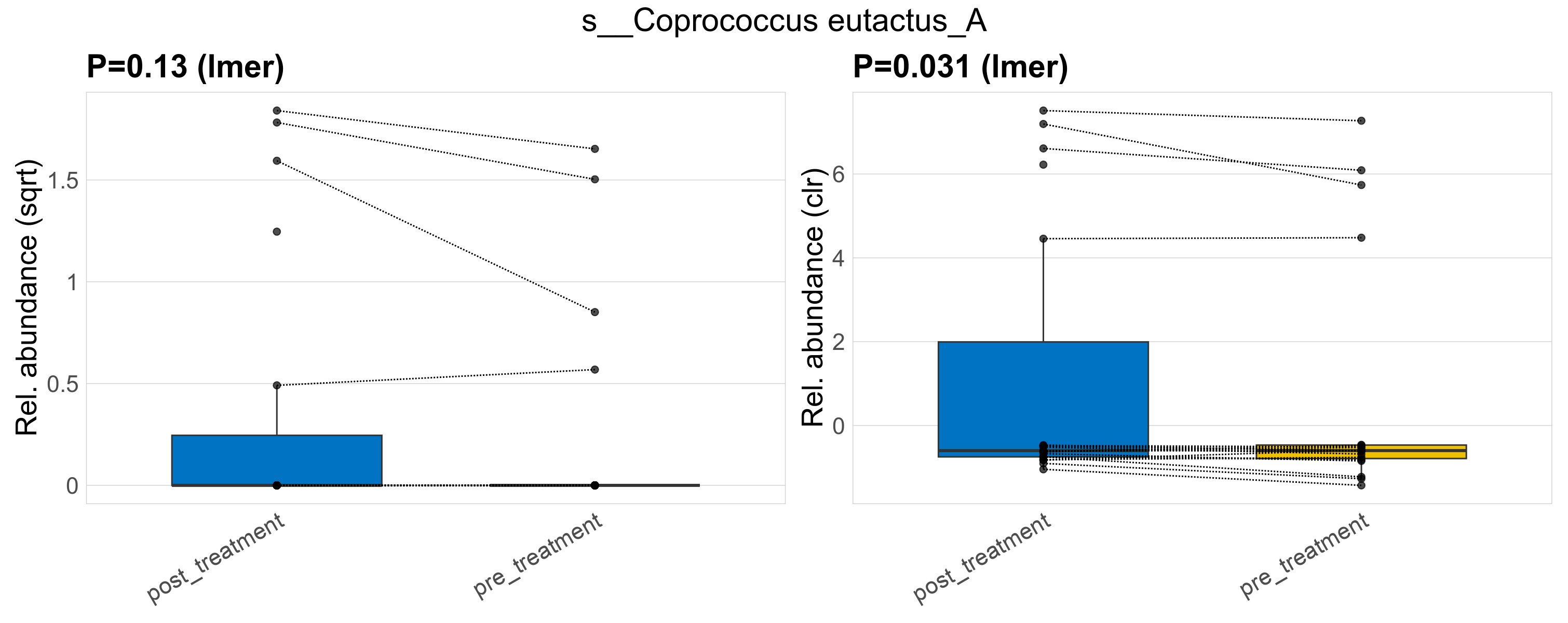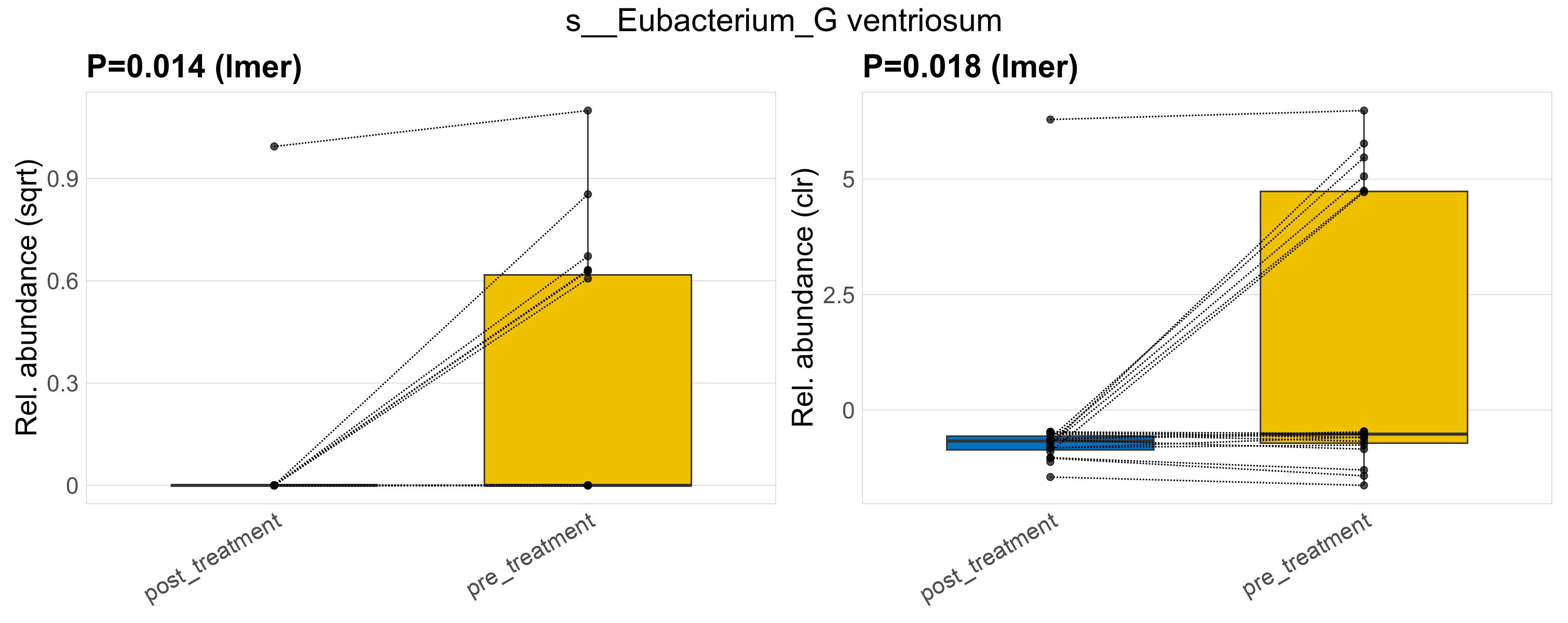 P lmer condition effect (sqrt): Differentially abundant species were identified by linear mixed effect regression without confounders. Random effects: Participant (intercept). Fixed effects: Treatment. Effect tested: Treatment.