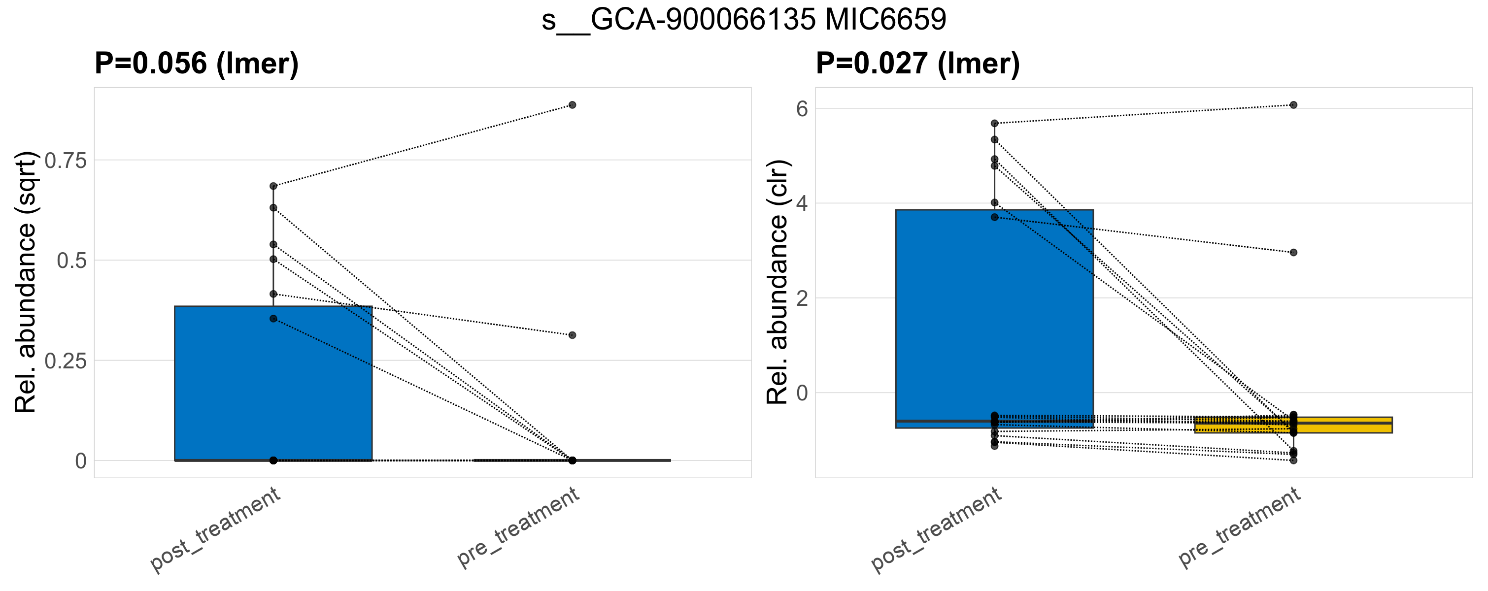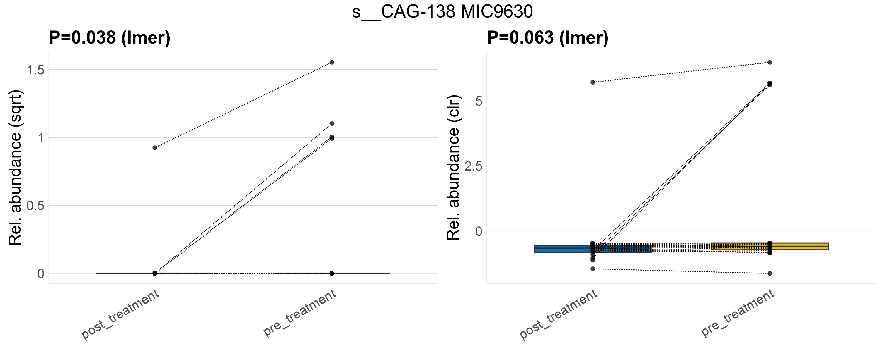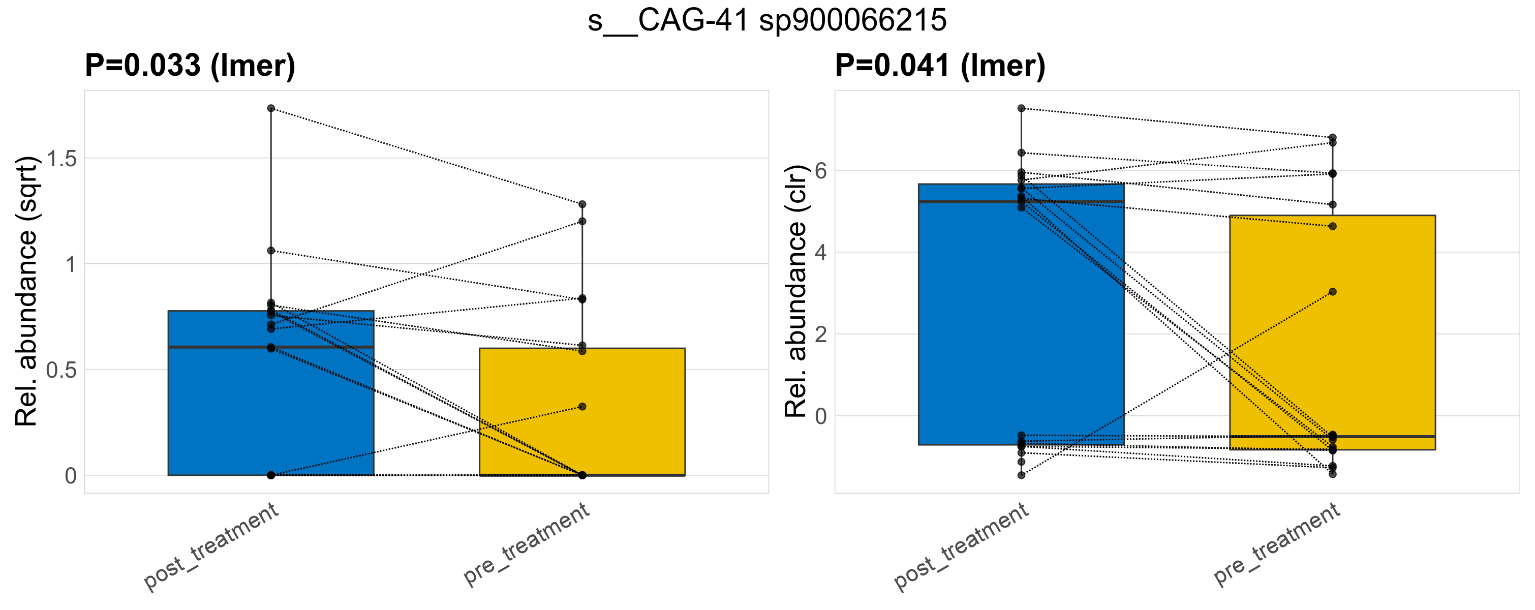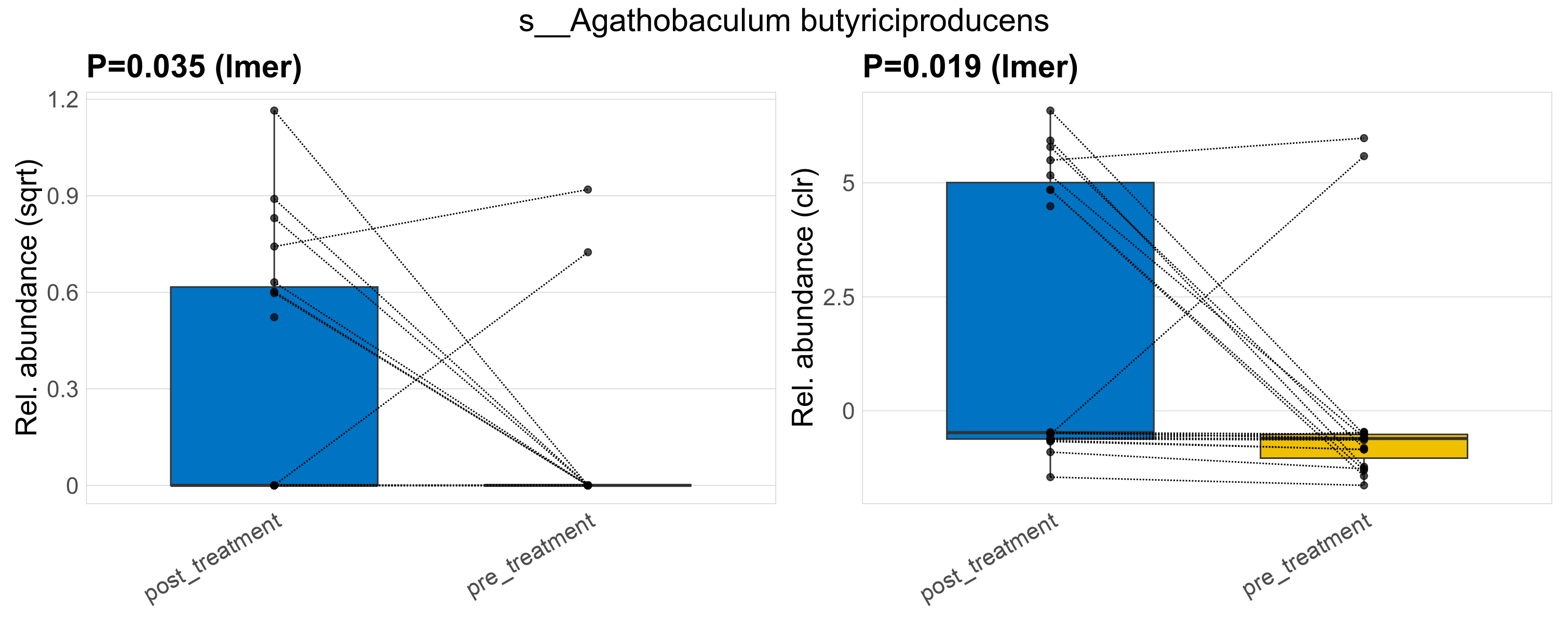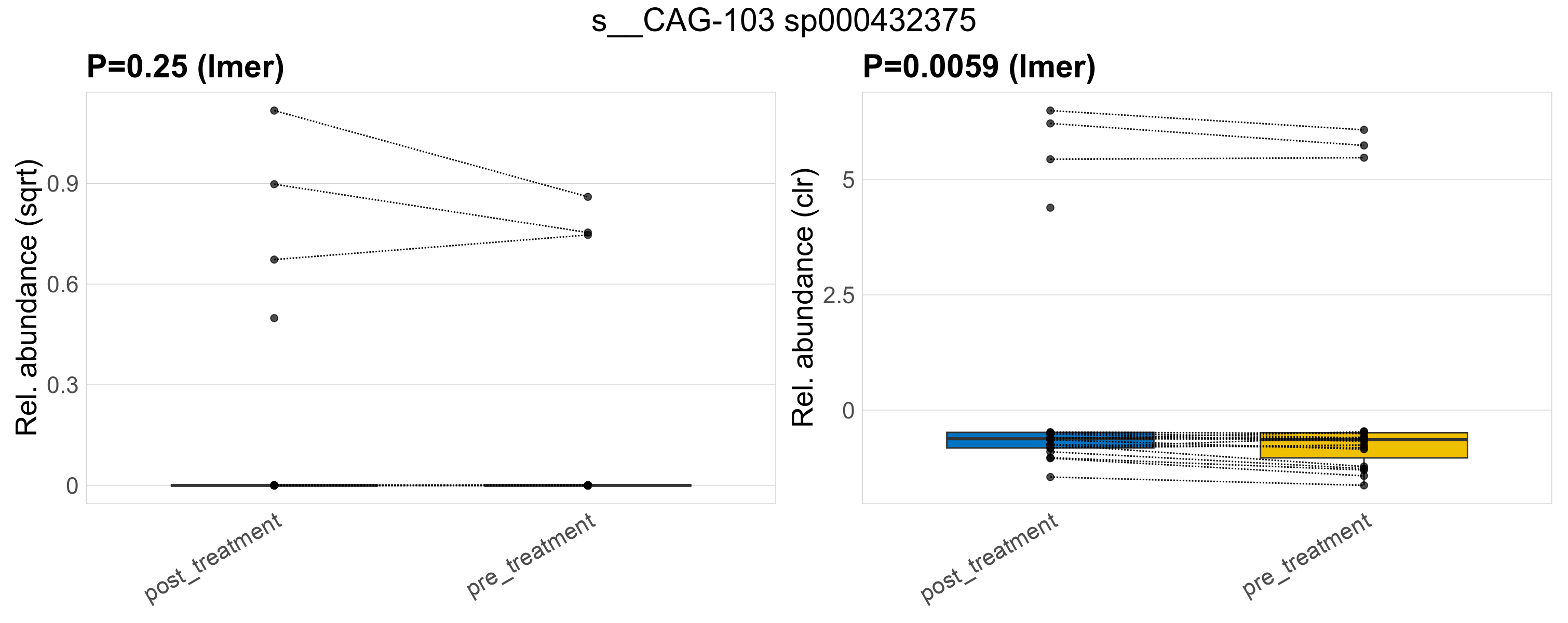 P lmer condition effect (sqrt): Differentially abundant species were identified by linear mixed effect regression without confounders. Random effects: Participant (intercept). Fixed effects: Treatment. Effect tested: Treatment.