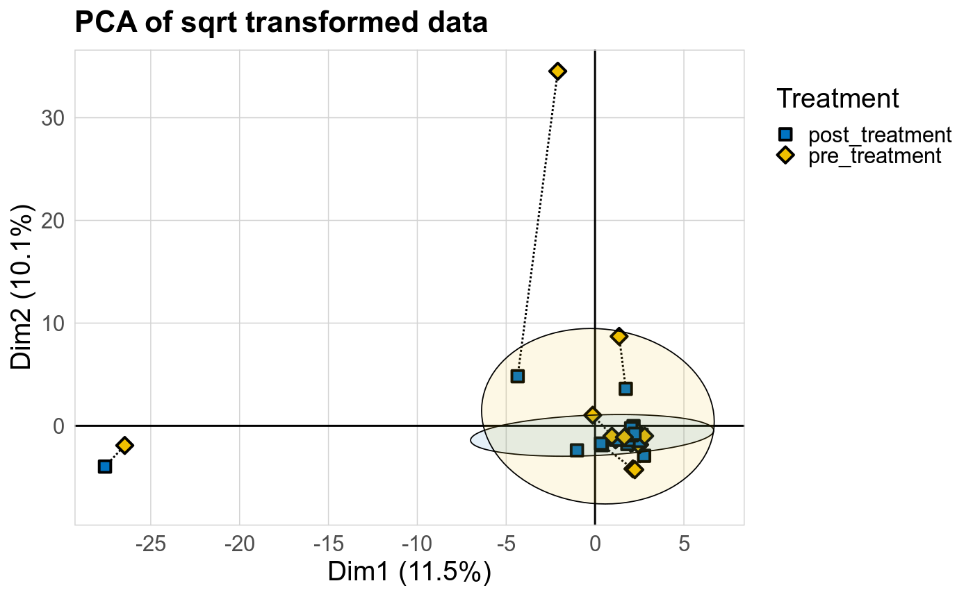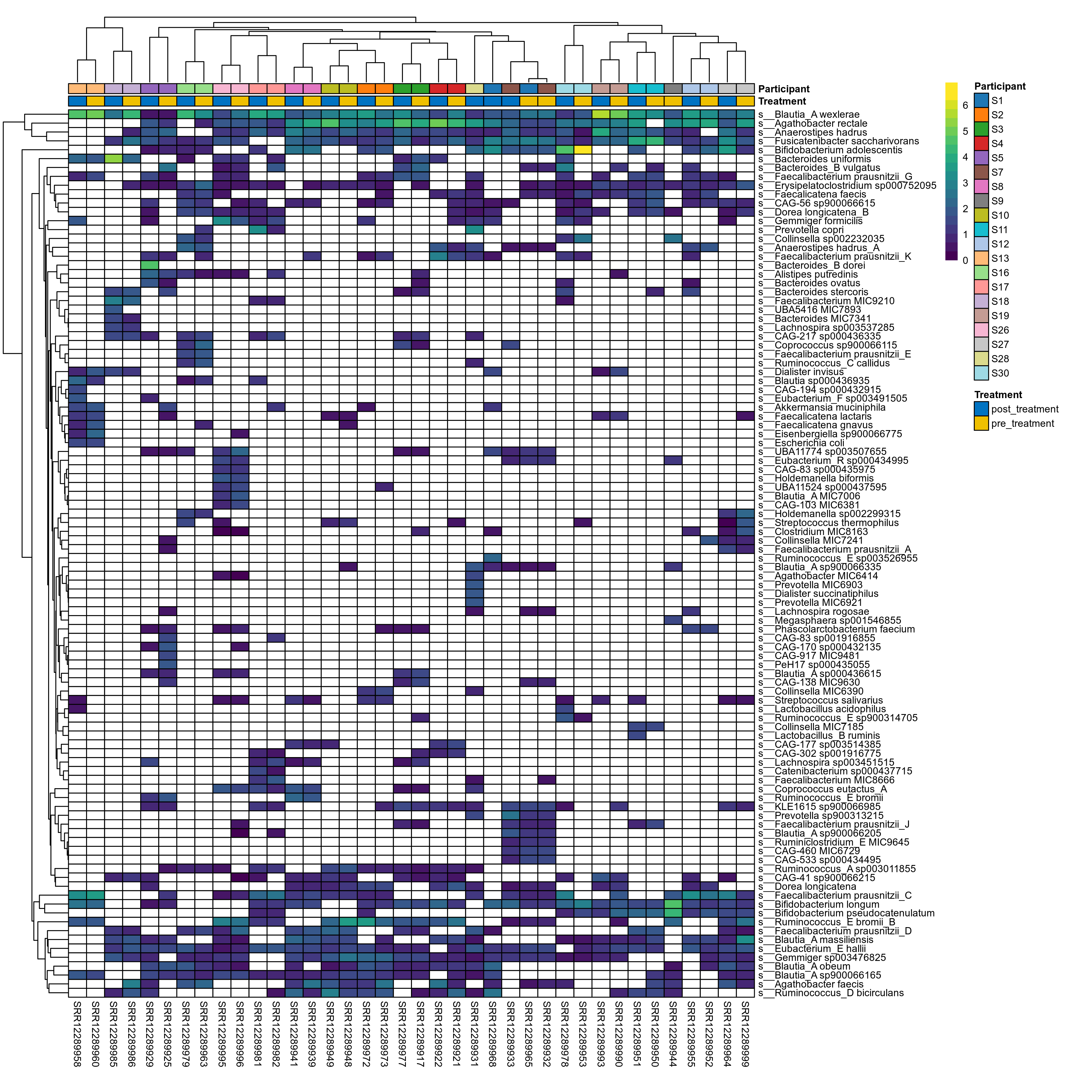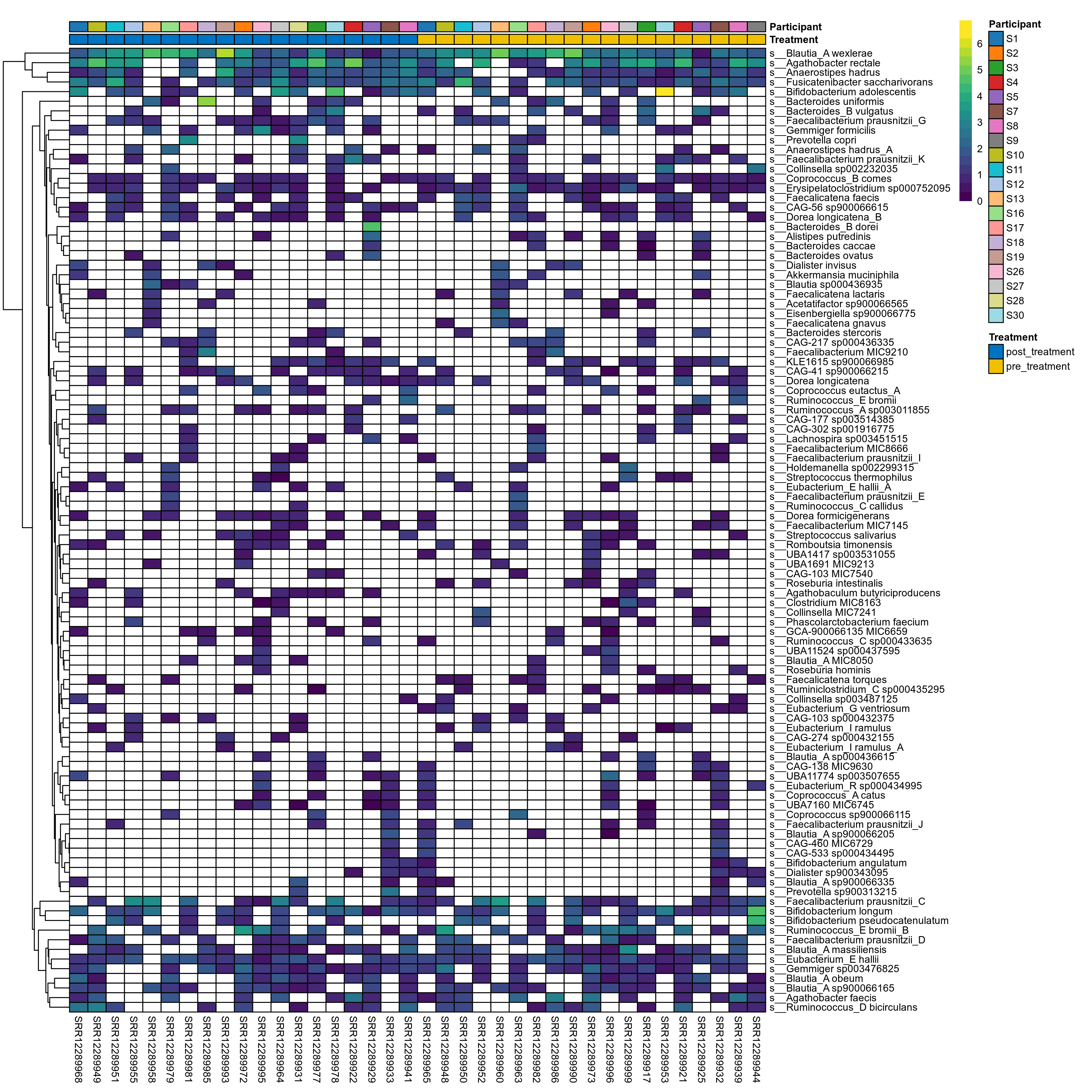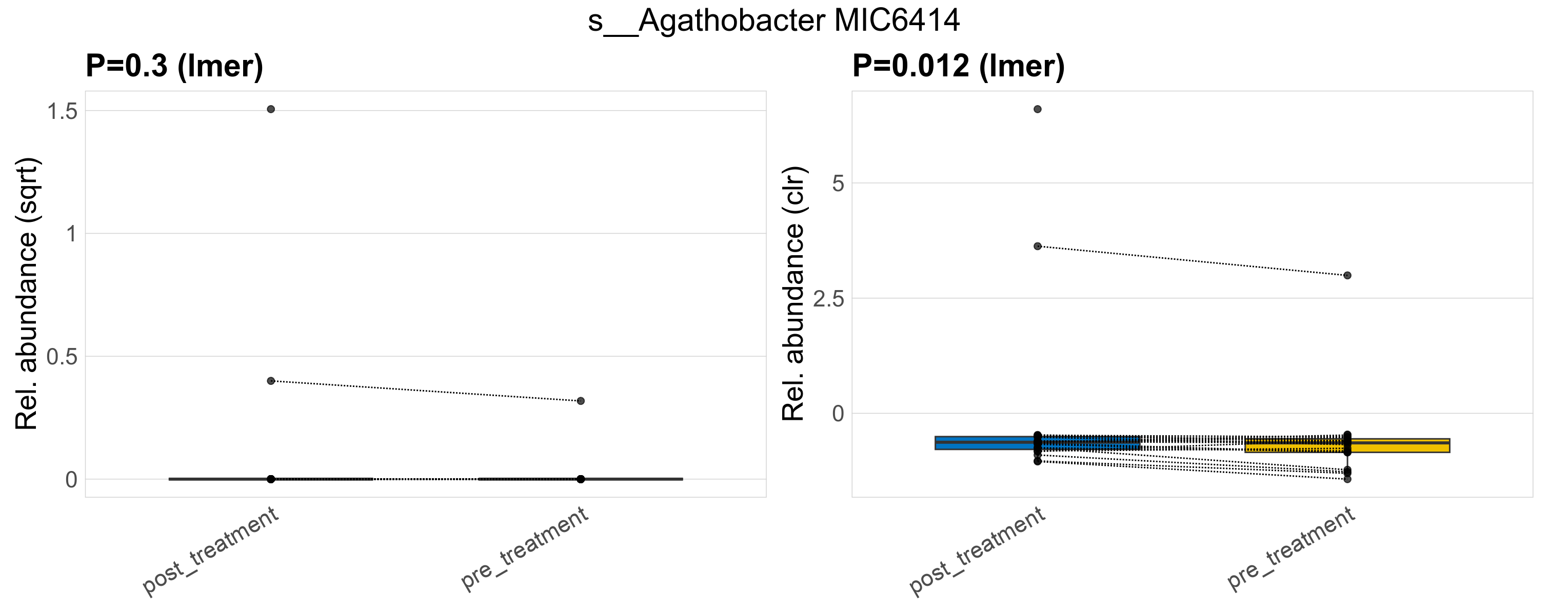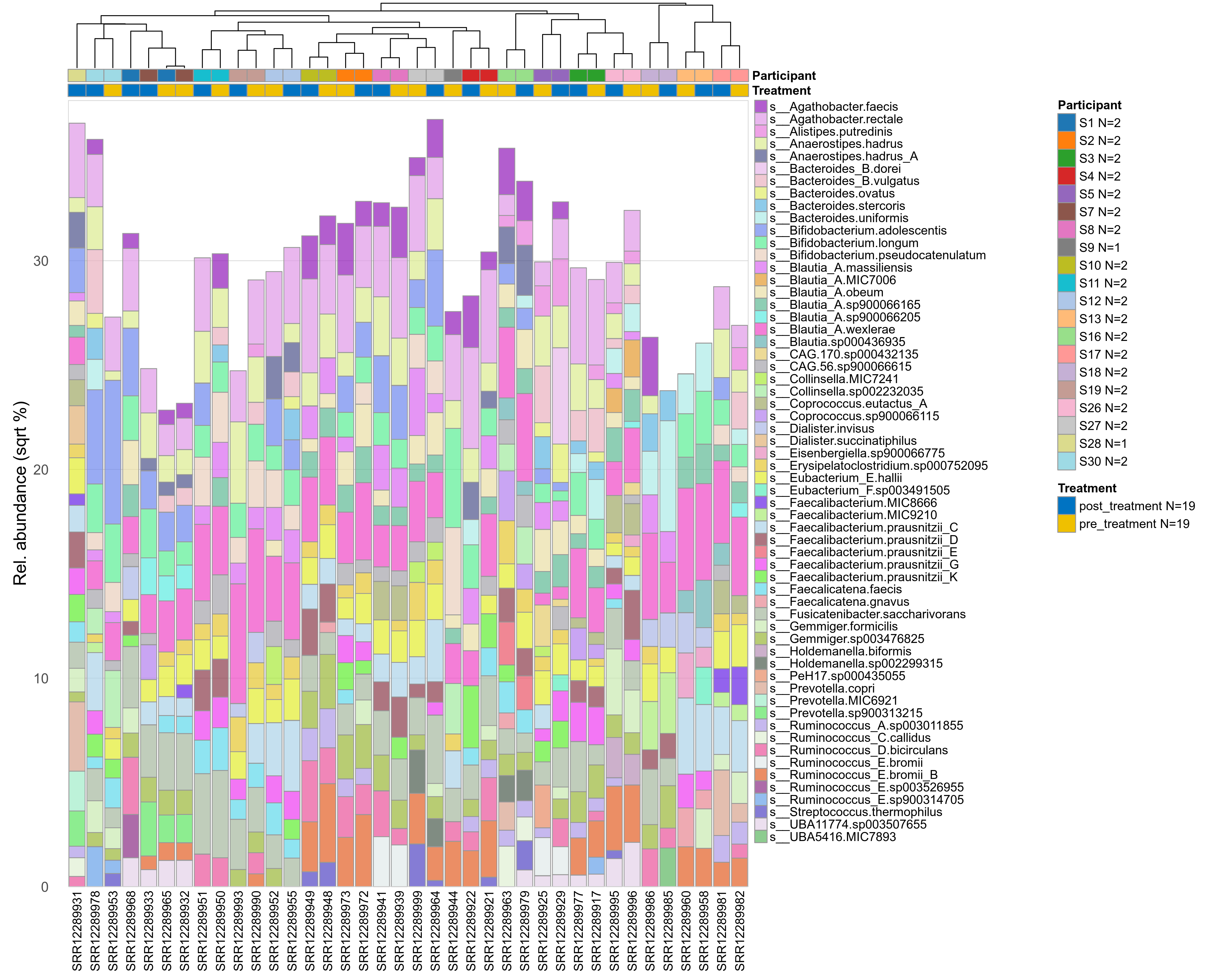 P lmer condition effect (sqrt): Differentially abundant species were identified by linear mixed effect regression without confounders. Random effects: Participant (intercept). Fixed effects: Treatment. Effect tested: Treatment.