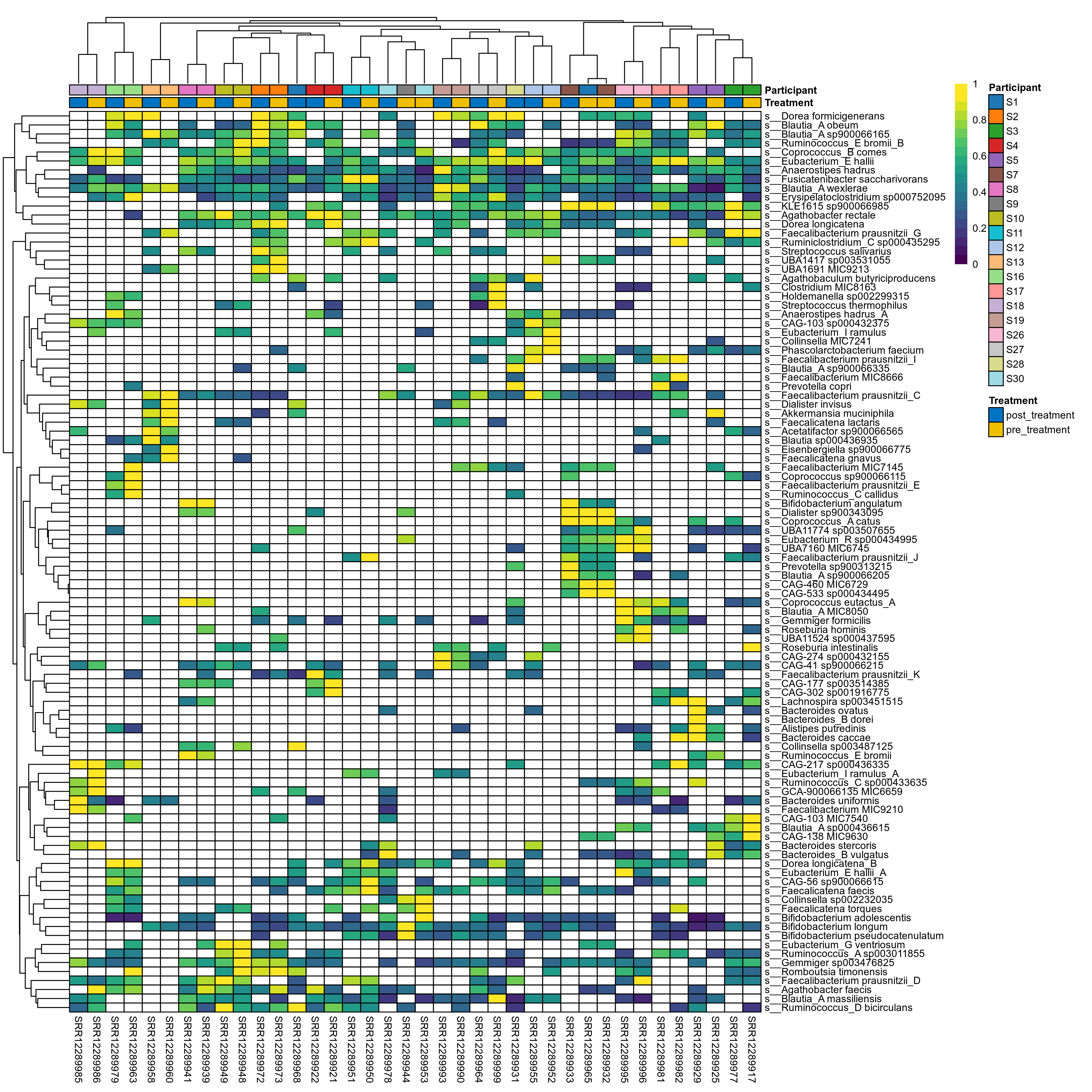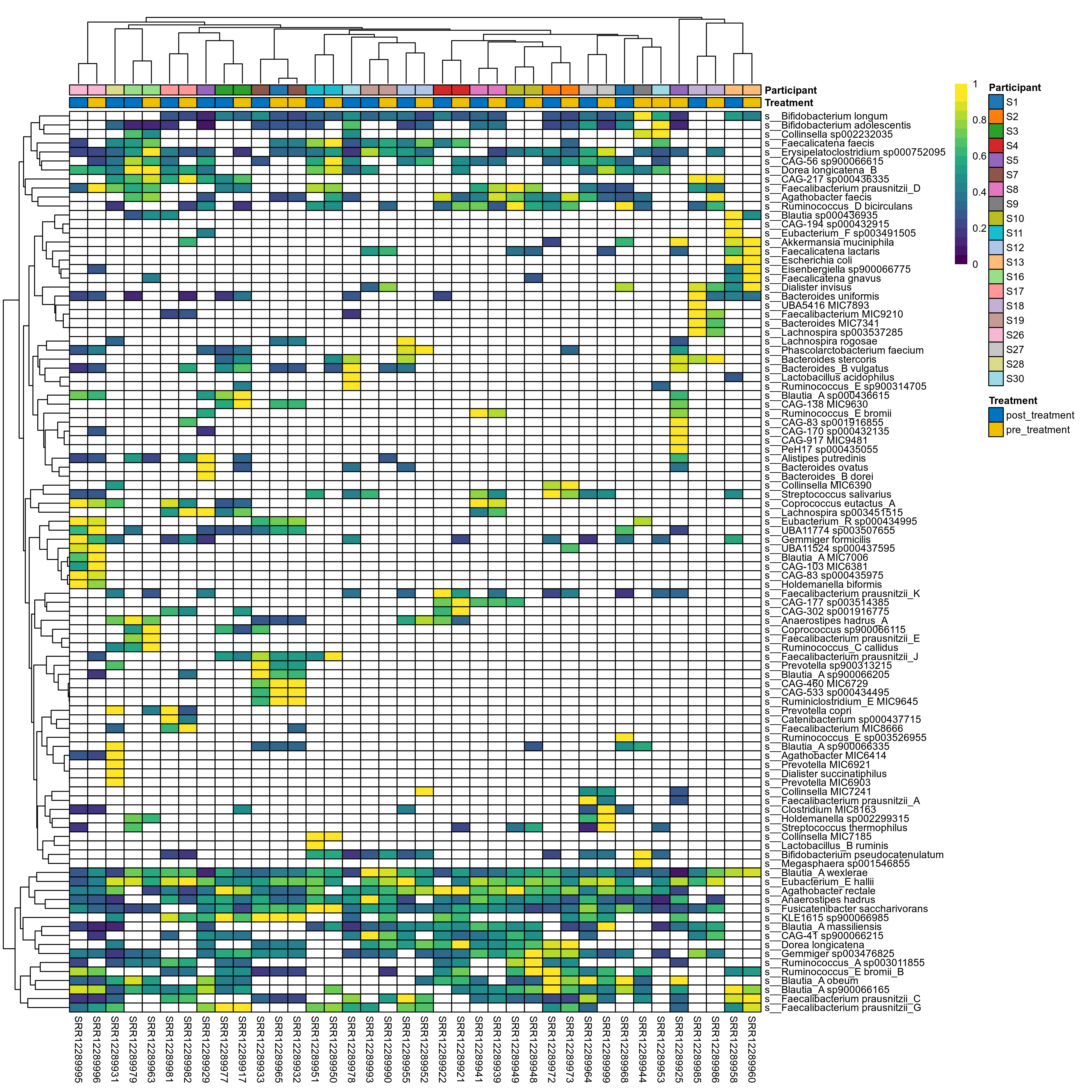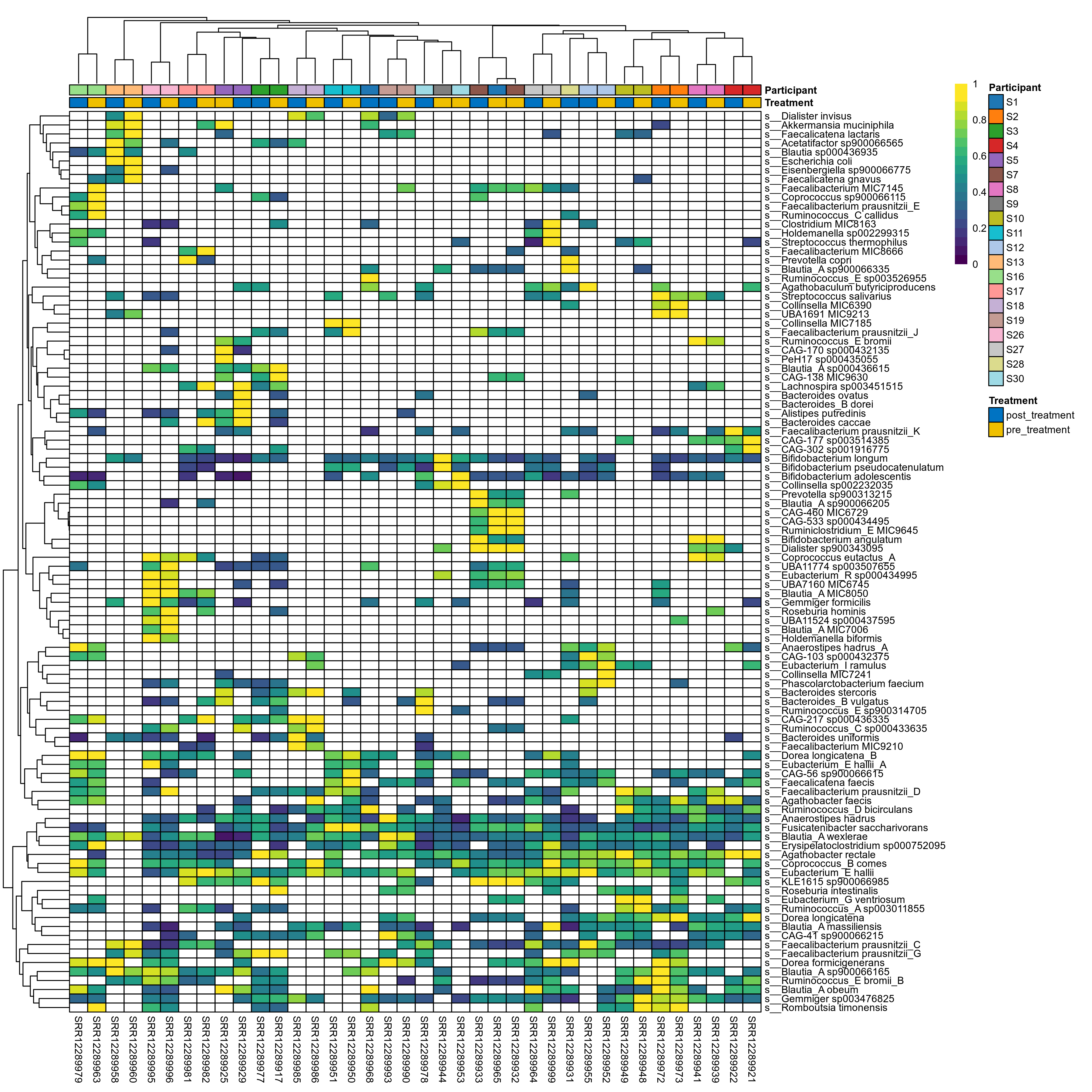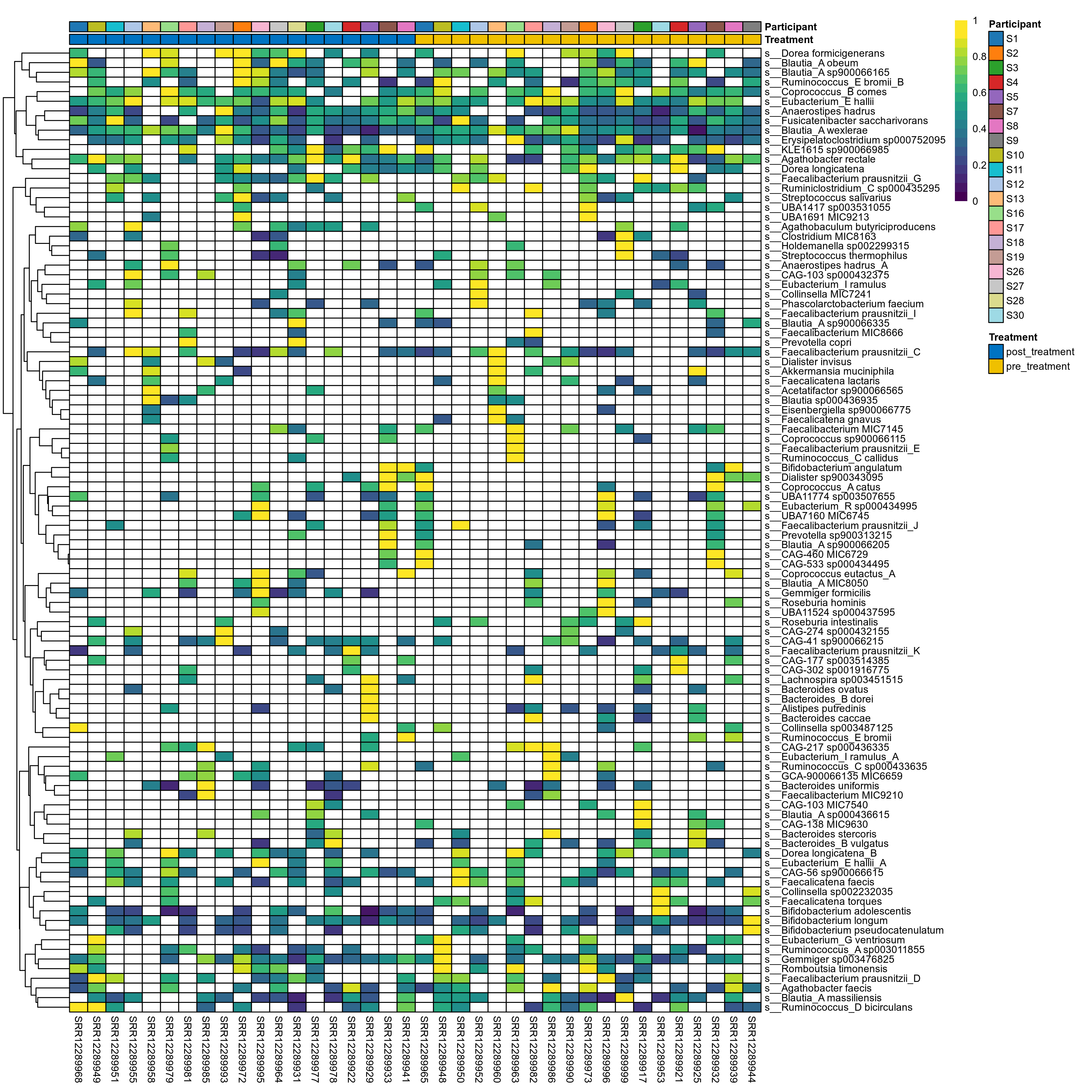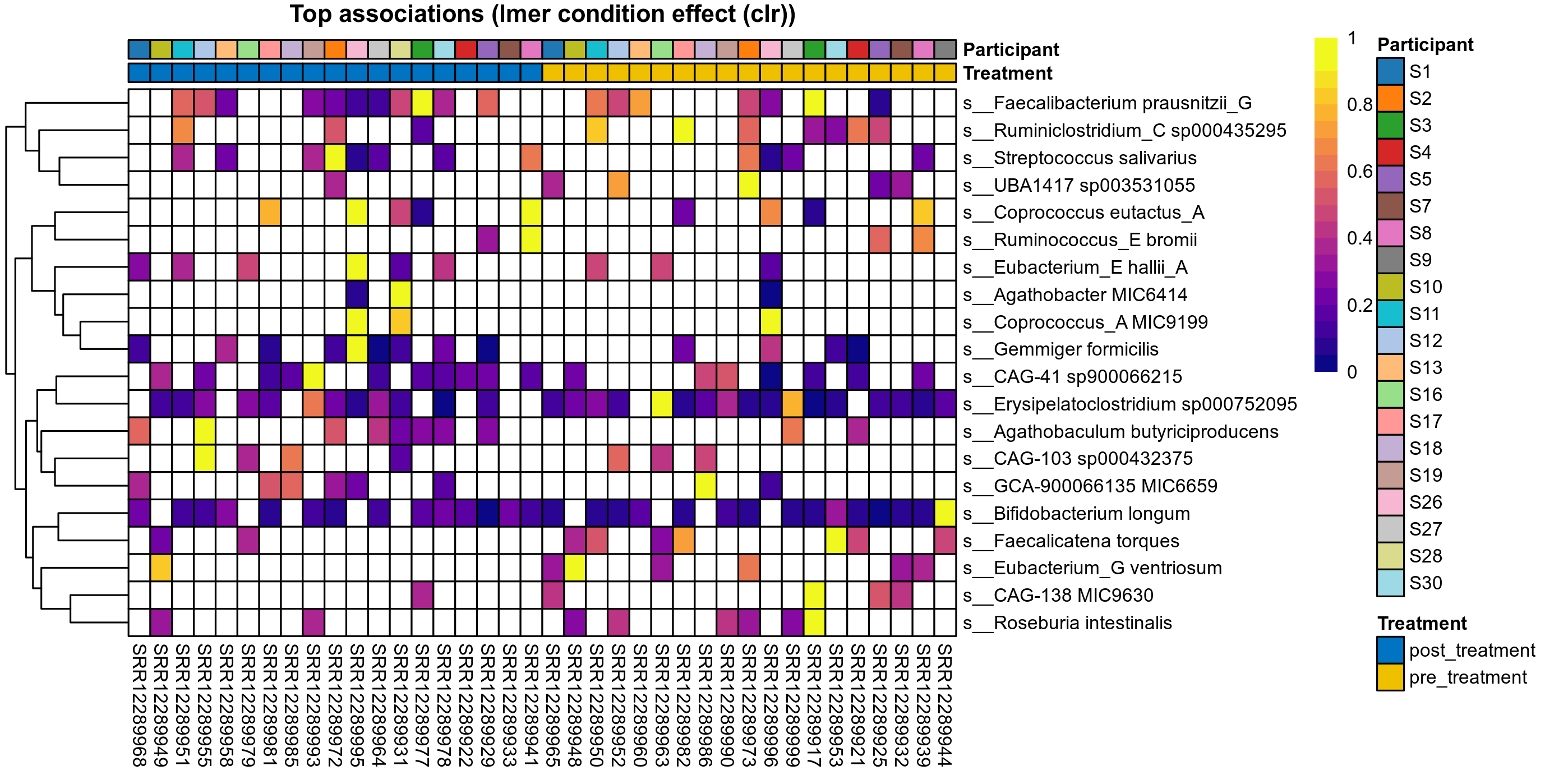 P lmer condition effect (clr): Differentially abundant species were identified by linear mixed effect regression without confounders. Random effects: Participant (intercept). Fixed effects: Treatment. Effect tested: Treatment.