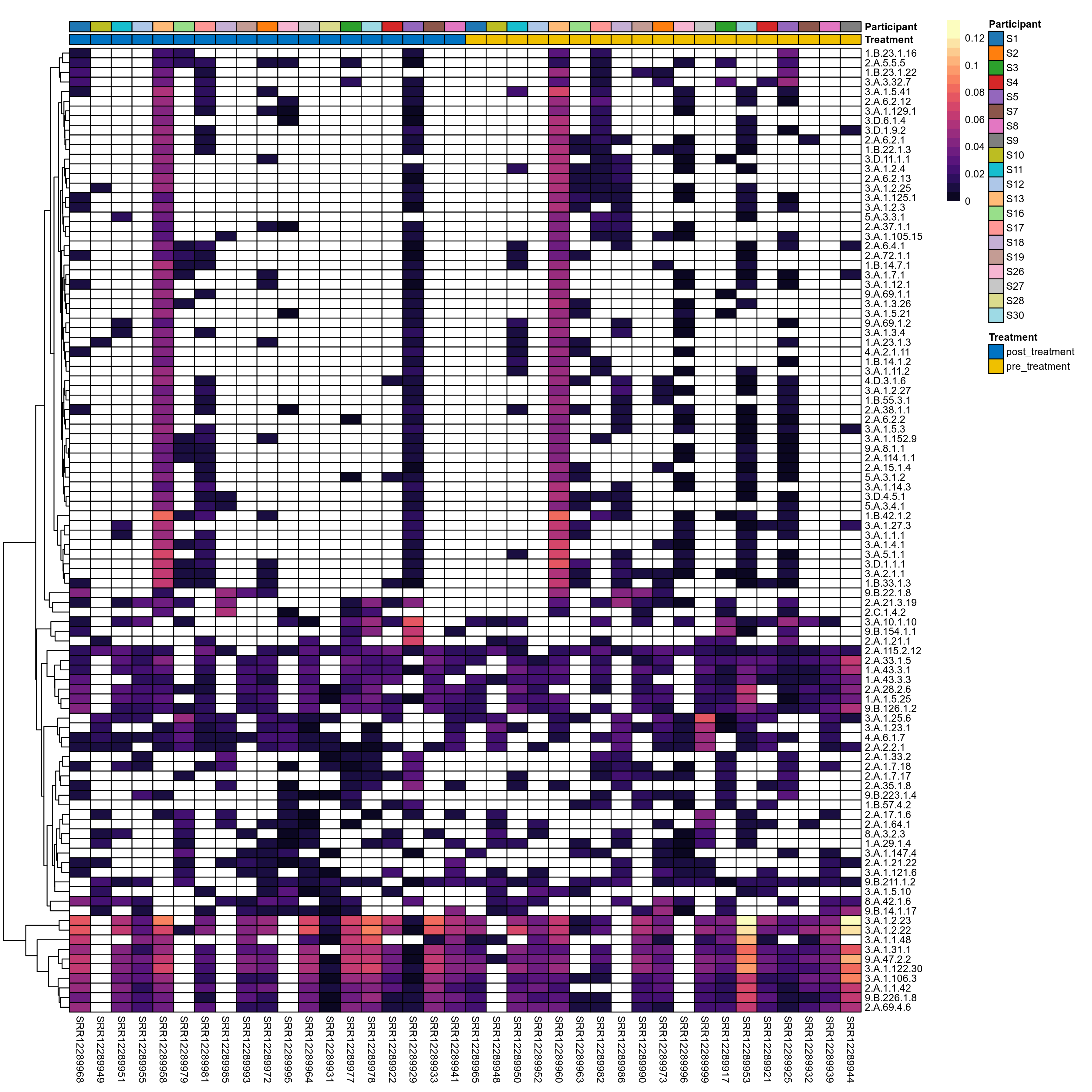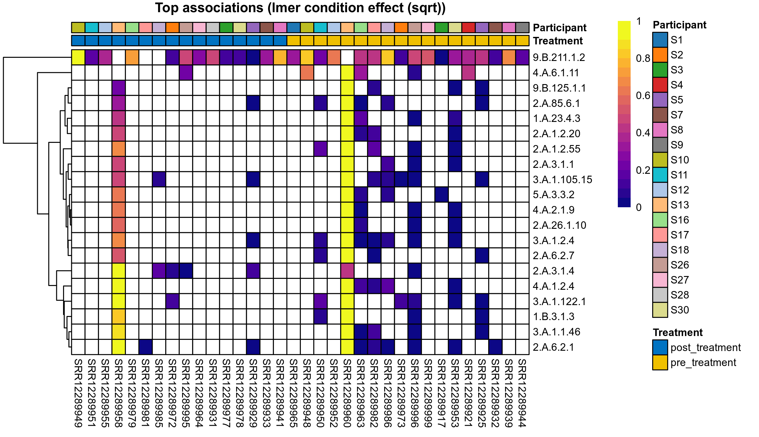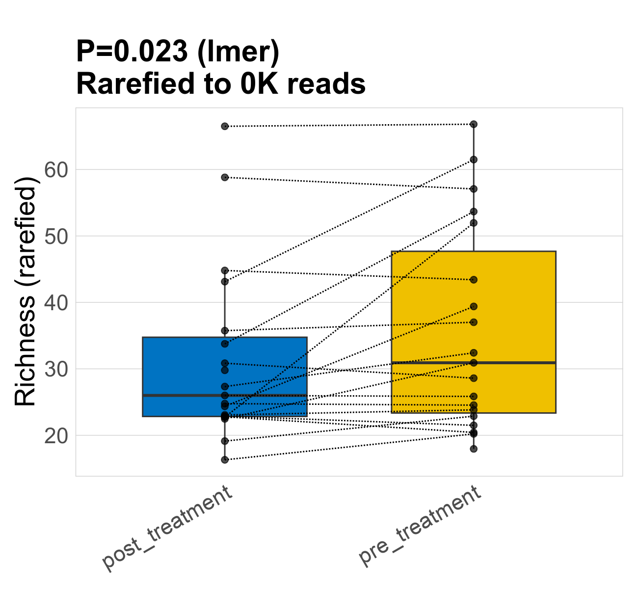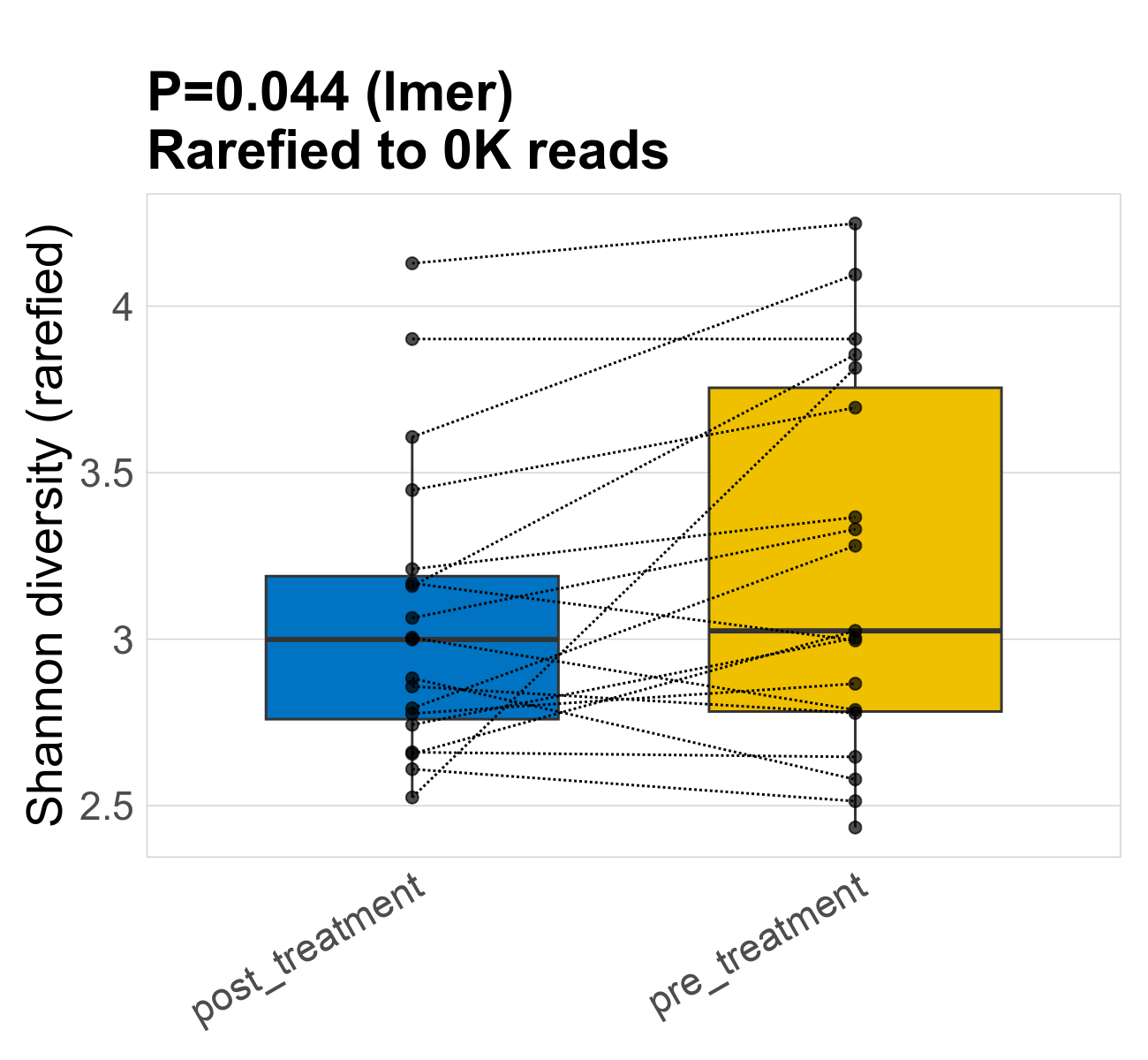 | Index | rarefiedTo | P lmer condition effect | Mean Pos | Mean Abundance | Median Abundance | Mean Treatmentpost_treatment | Median Treatmentpost_treatment | SD Treatmentpost_treatment | Mean Treatmentpre_treatment | Median Treatmentpre_treatment | SD Treatmentpre_treatment | Fold Change Log2(Treatmentpre_treatment/Treatmentpost_treatment) | Positive samples | Positive Treatmentpost_treatment | Positive Treatmentpre_treatment | Positive_Treatmentpost_treatment_percent | Positive_Treatmentpre_treatment_percent |