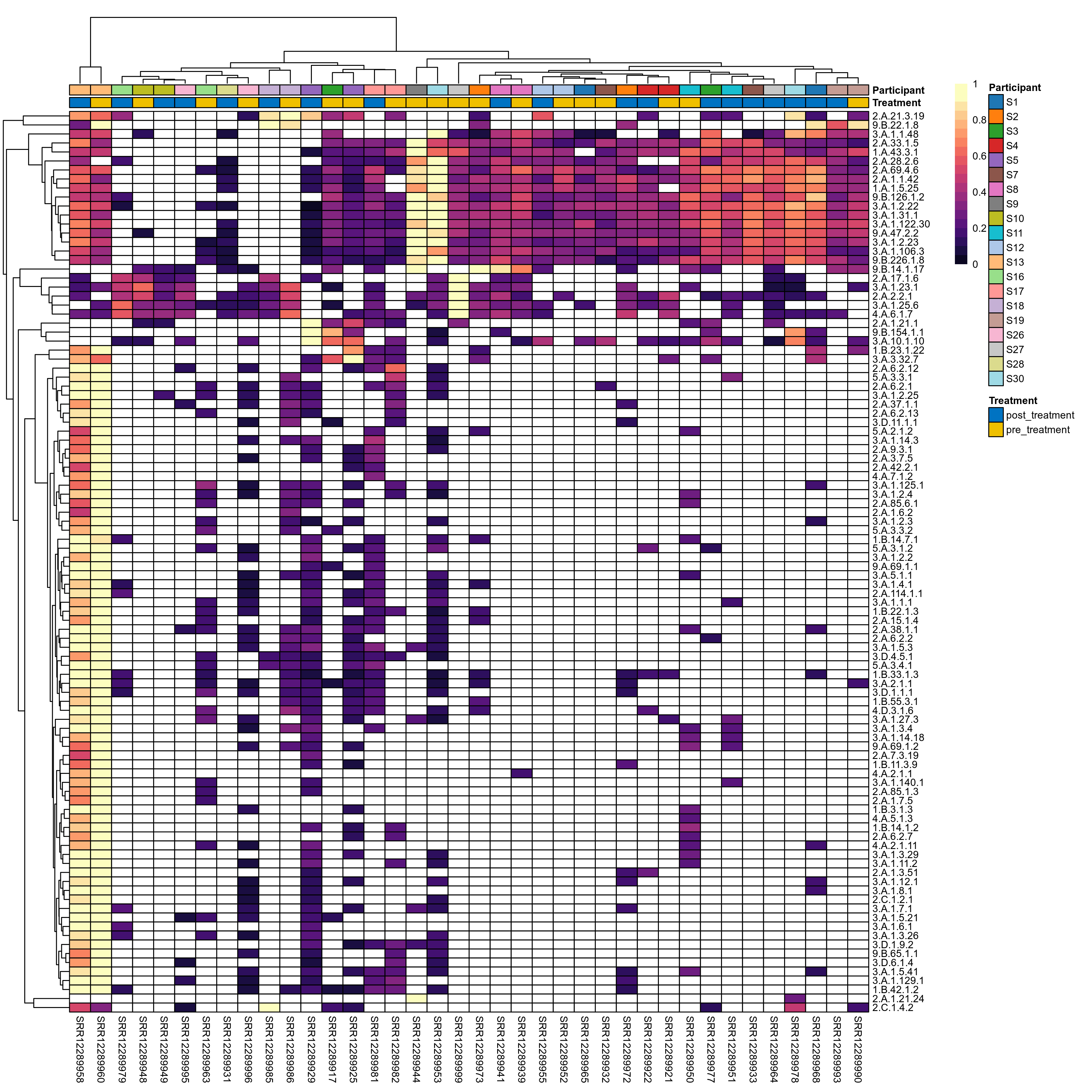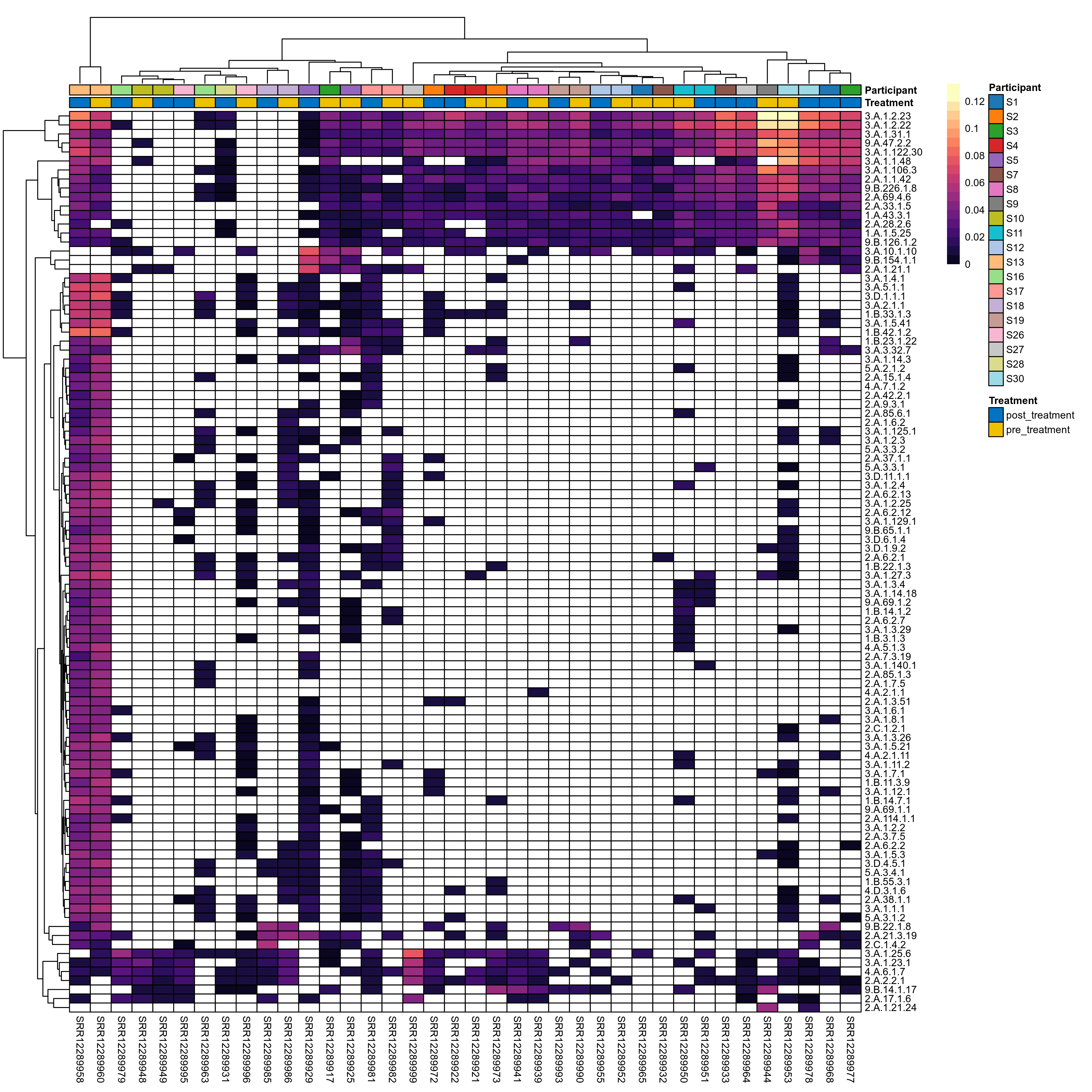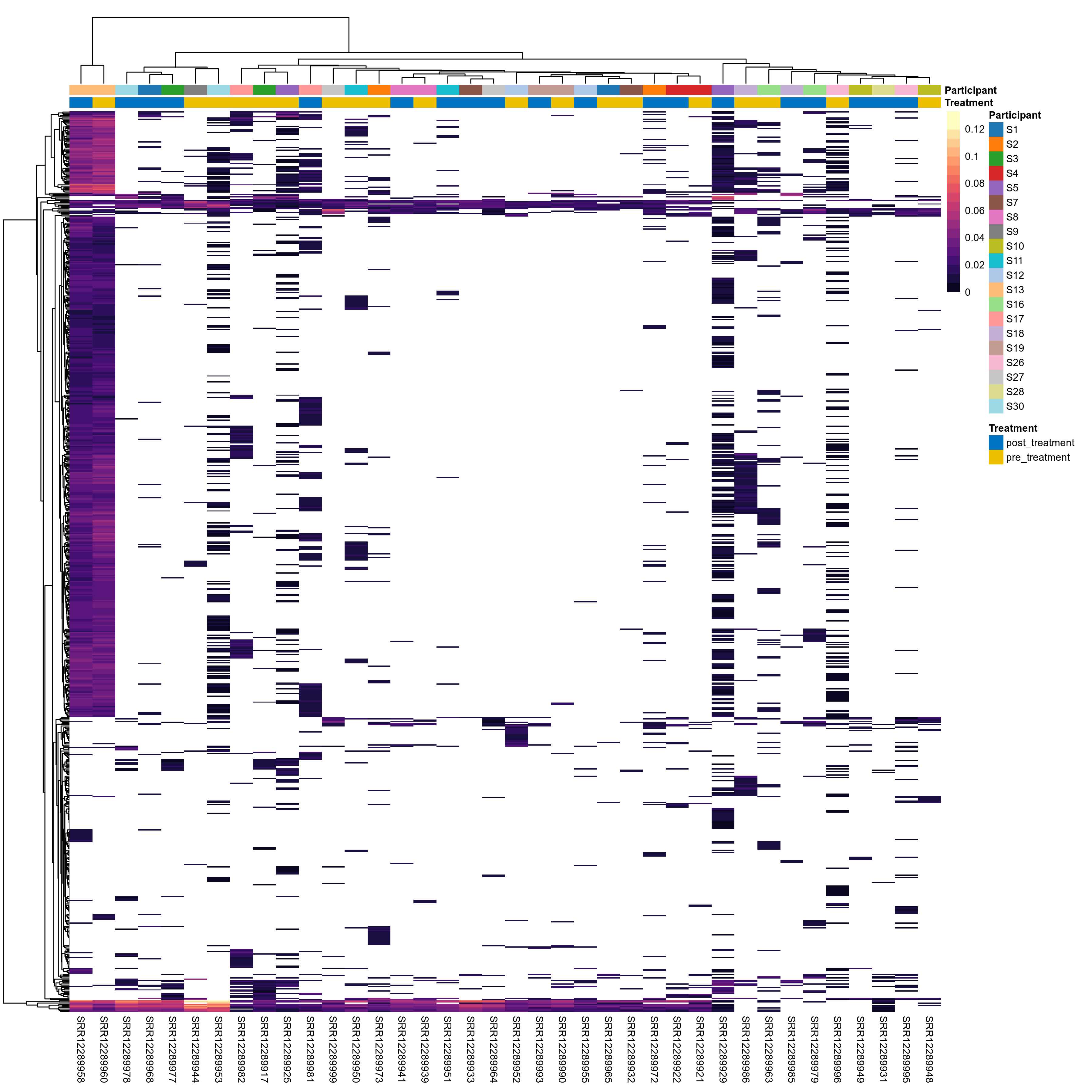 | Index | rarefiedTo | P lmer condition effect | Mean Pos | Mean Abundance | Median Abundance | Mean Treatmentpost_treatment | Median Treatmentpost_treatment | SD Treatmentpost_treatment | Mean Treatmentpre_treatment | Median Treatmentpre_treatment | SD Treatmentpre_treatment | Fold Change Log2(Treatmentpre_treatment/Treatmentpost_treatment) | Positive samples | Positive Treatmentpost_treatment | Positive Treatmentpre_treatment | Positive_Treatmentpost_treatment_percent | Positive_Treatmentpre_treatment_percent |