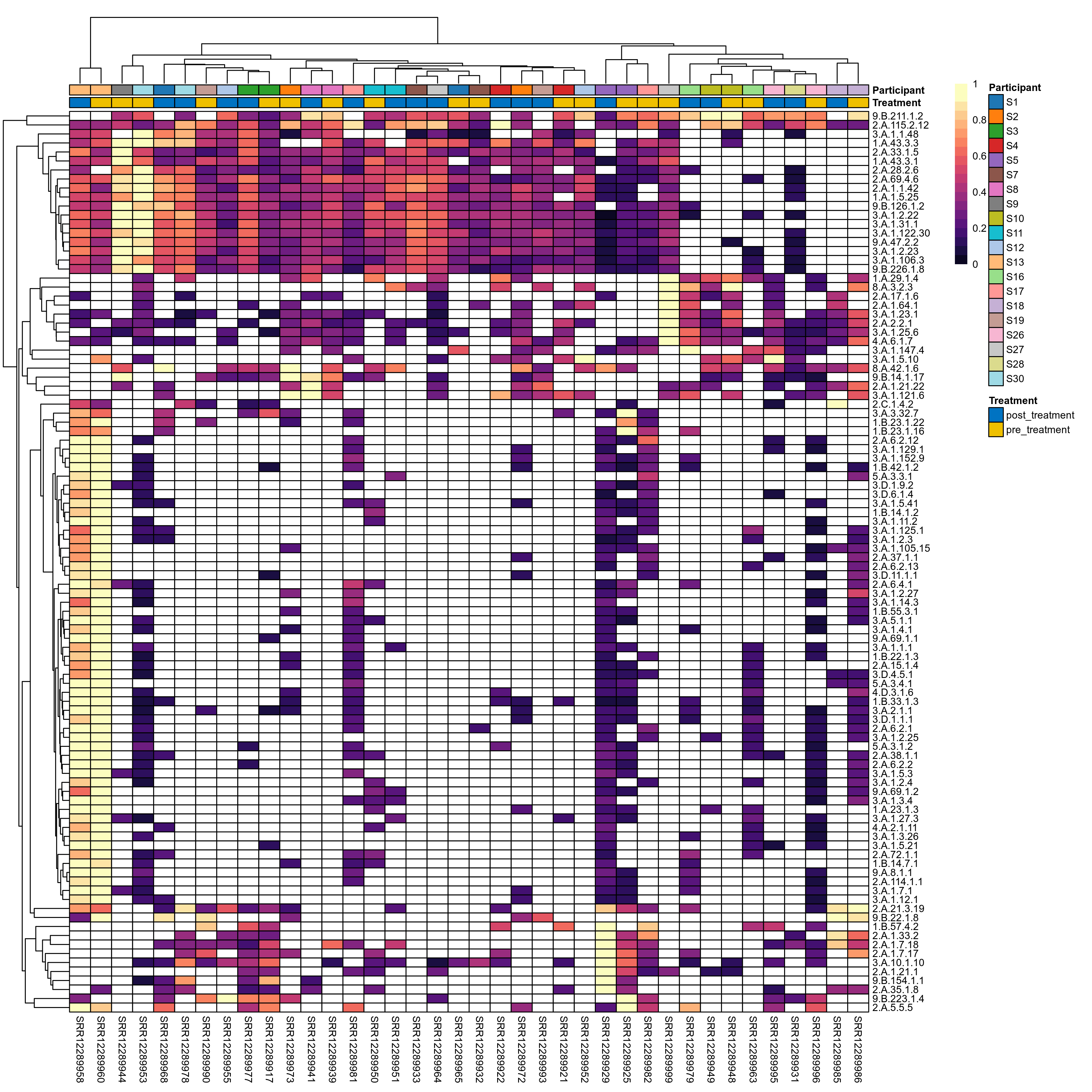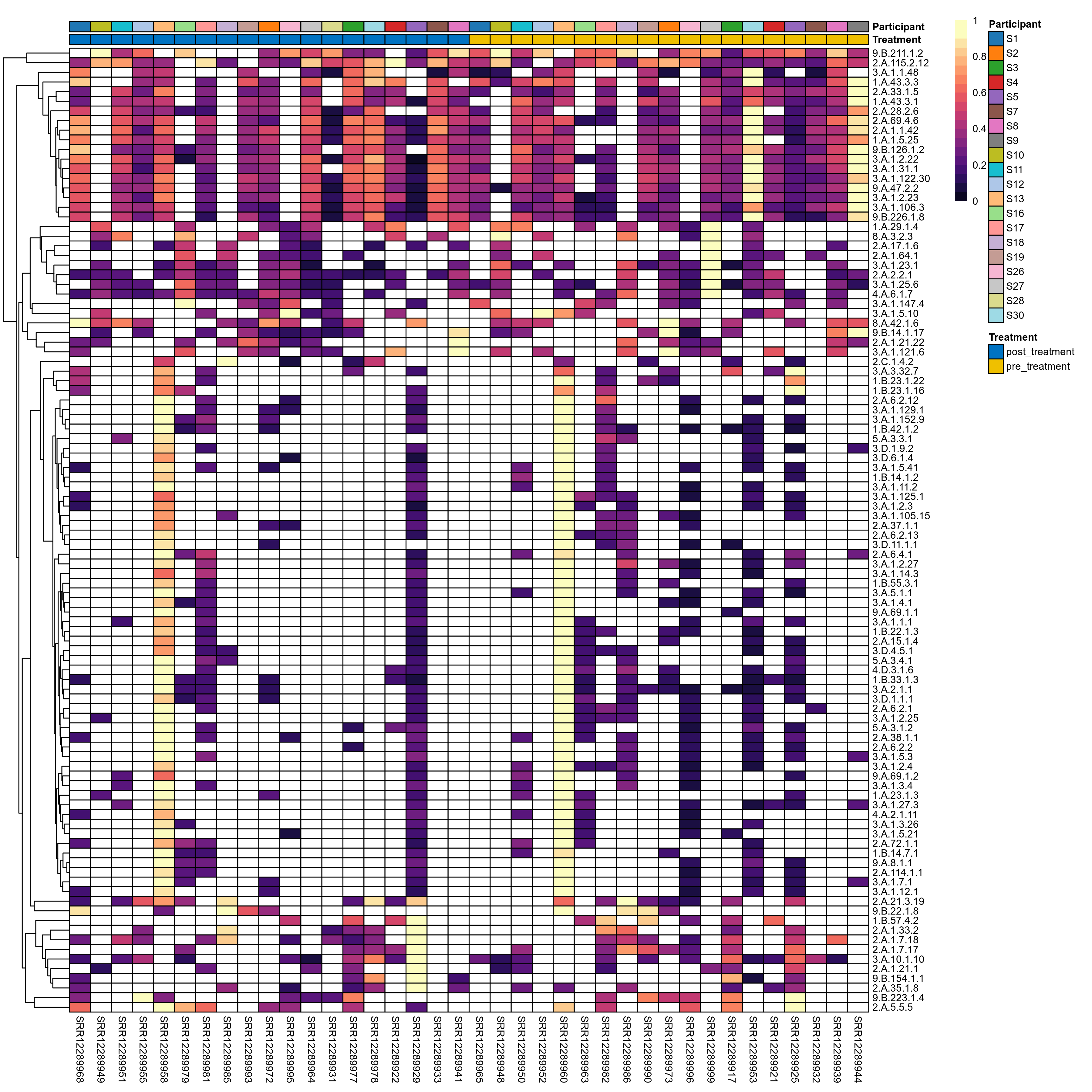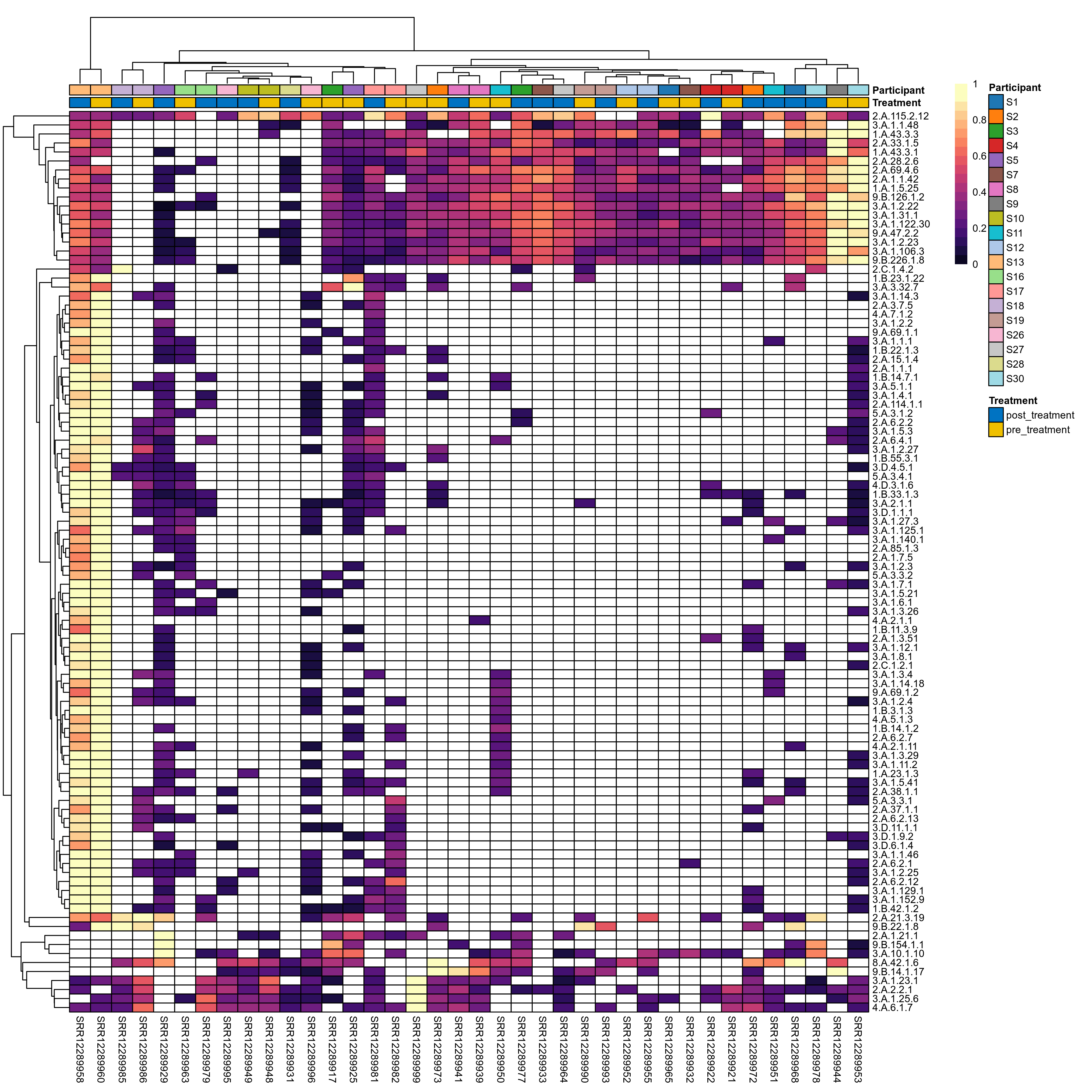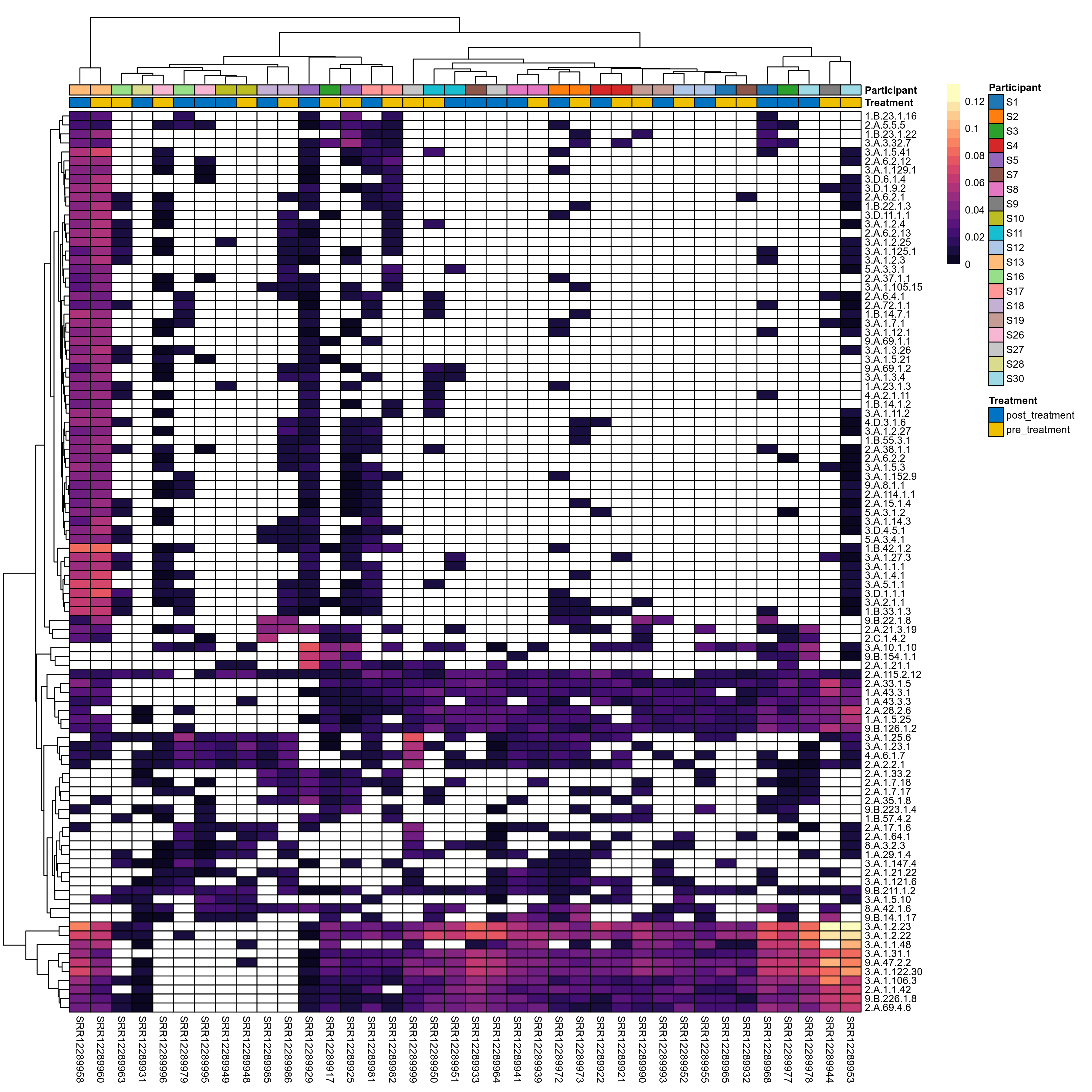 | Index | rarefiedTo | P lmer condition effect | Mean Pos | Mean Abundance | Median Abundance | Mean Treatmentpost_treatment | Median Treatmentpost_treatment | SD Treatmentpost_treatment | Mean Treatmentpre_treatment | Median Treatmentpre_treatment | SD Treatmentpre_treatment | Fold Change Log2(Treatmentpre_treatment/Treatmentpost_treatment) | Positive samples | Positive Treatmentpost_treatment | Positive Treatmentpre_treatment | Positive_Treatmentpost_treatment_percent | Positive_Treatmentpre_treatment_percent |