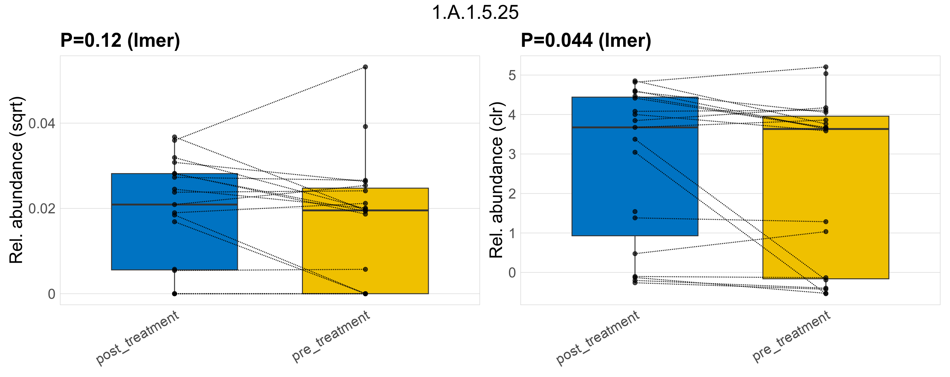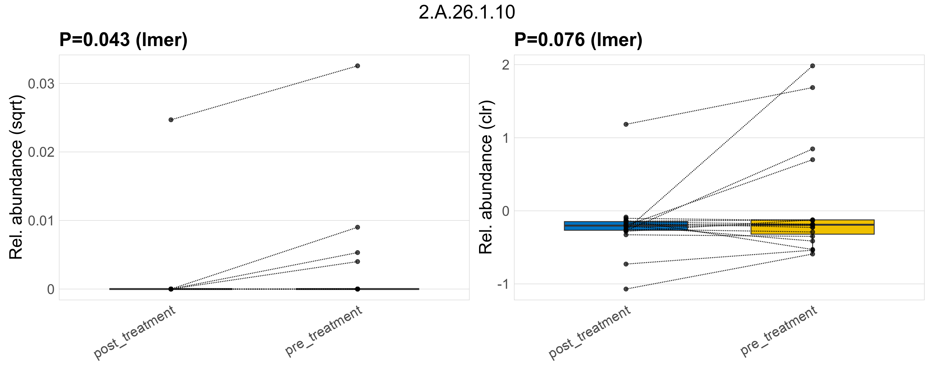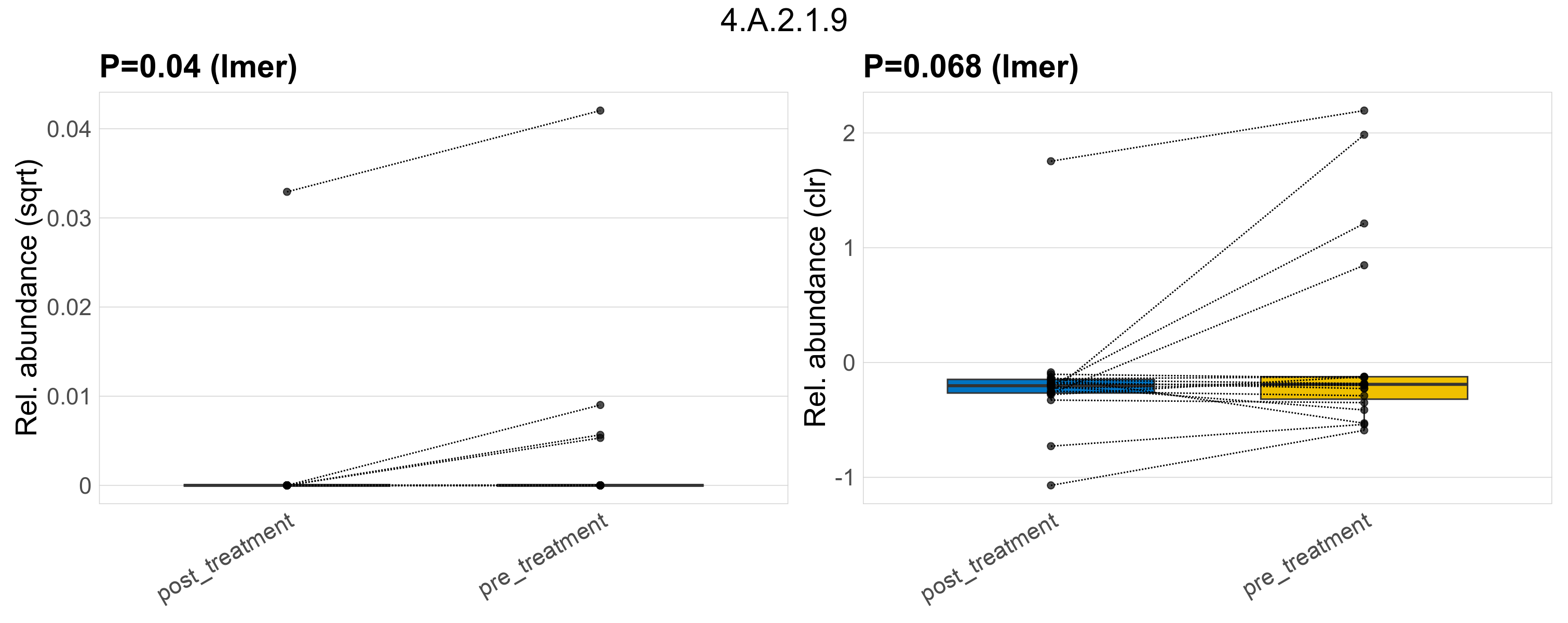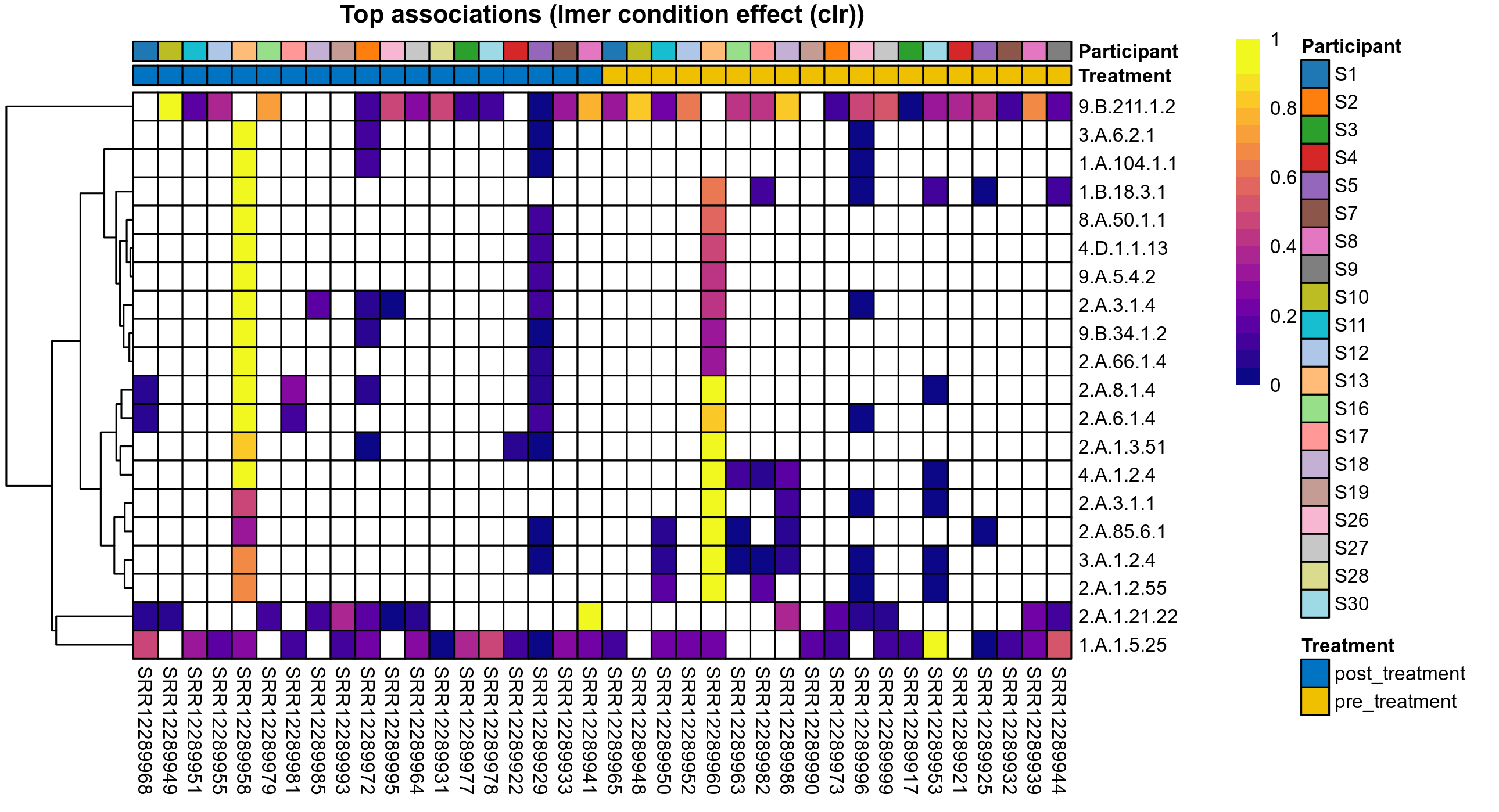P lmer condition effect (clr): Differentially abundant functions were identified by linear mixed effect regression without confounders. Random effects: Participant (intercept). Fixed effects: Treatment. Effect tested: Treatment.