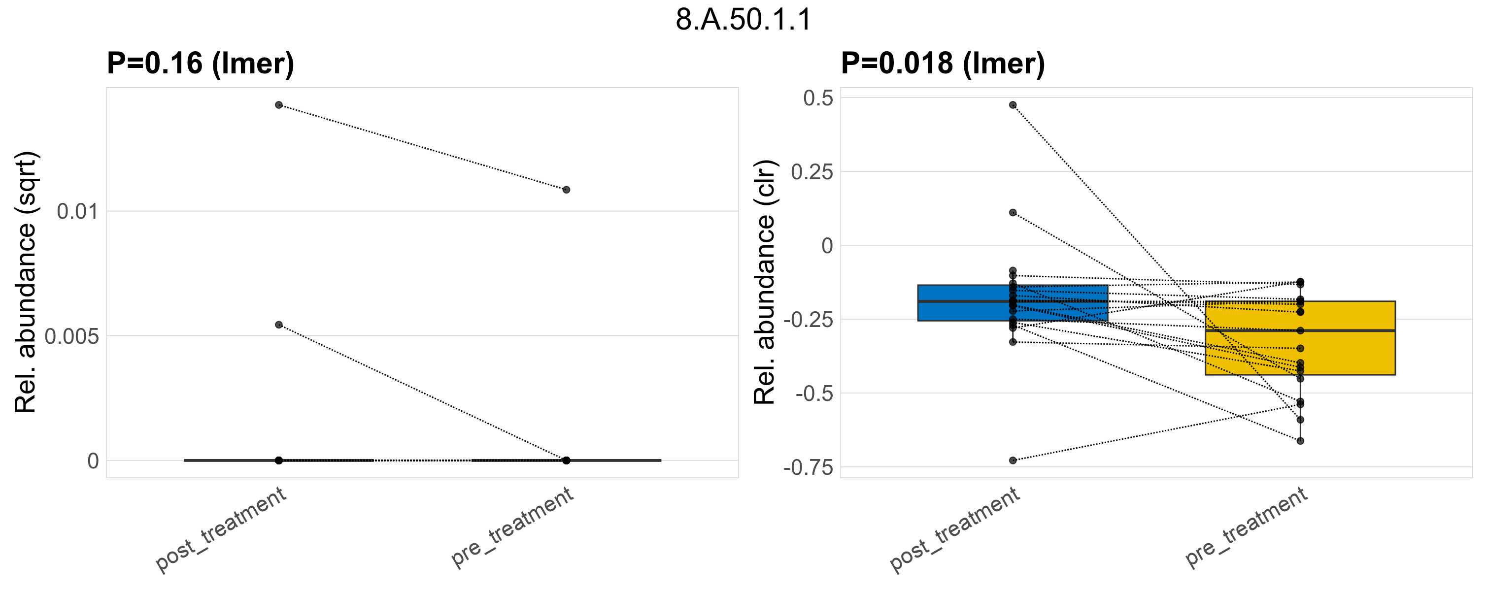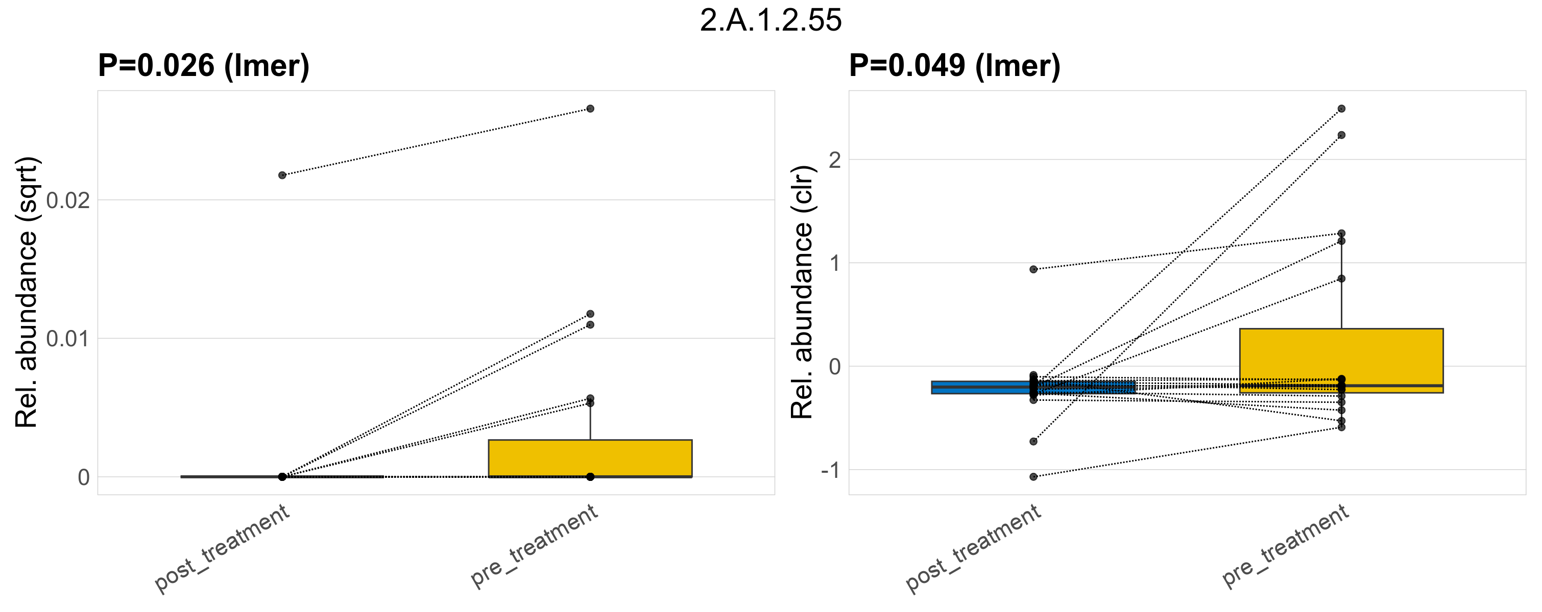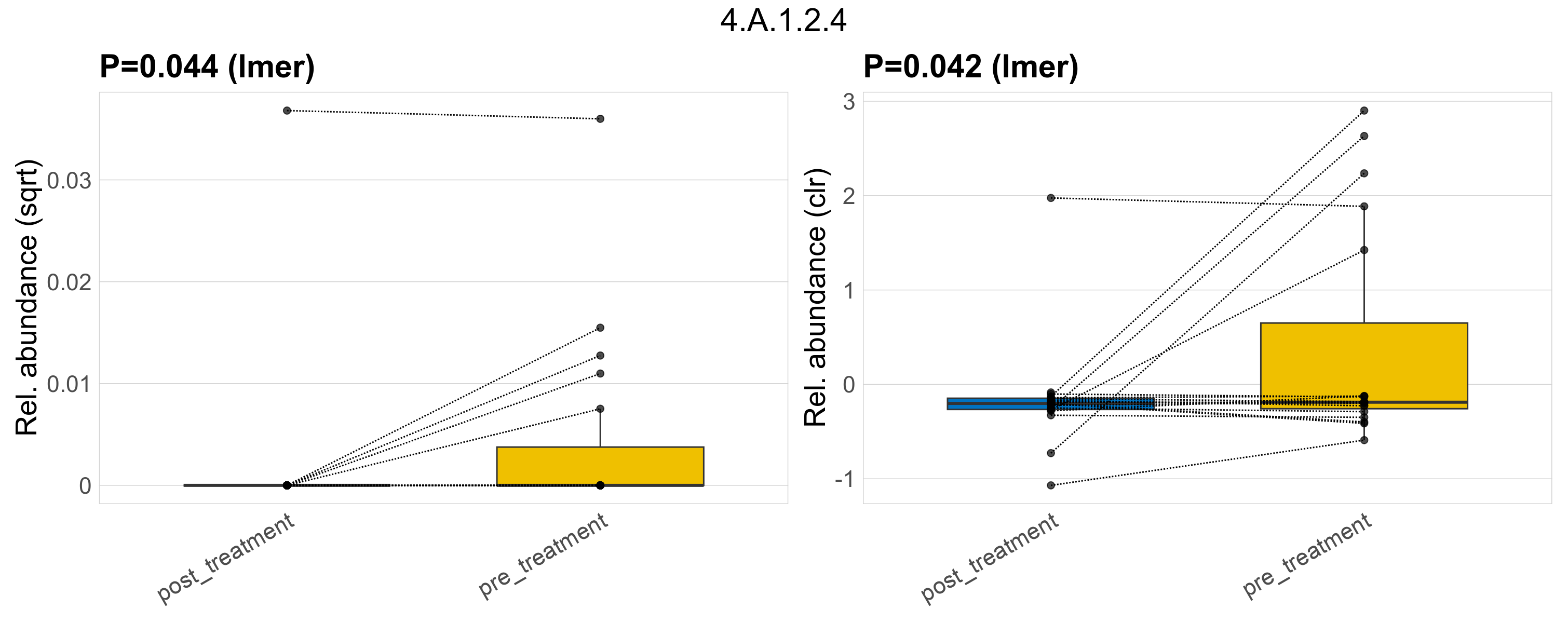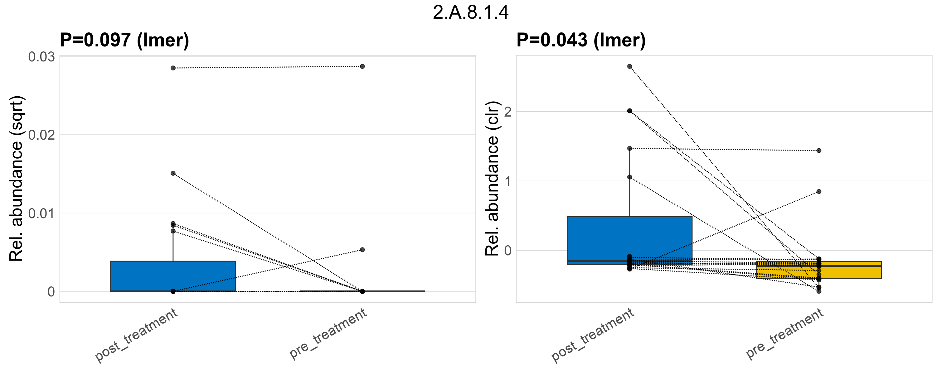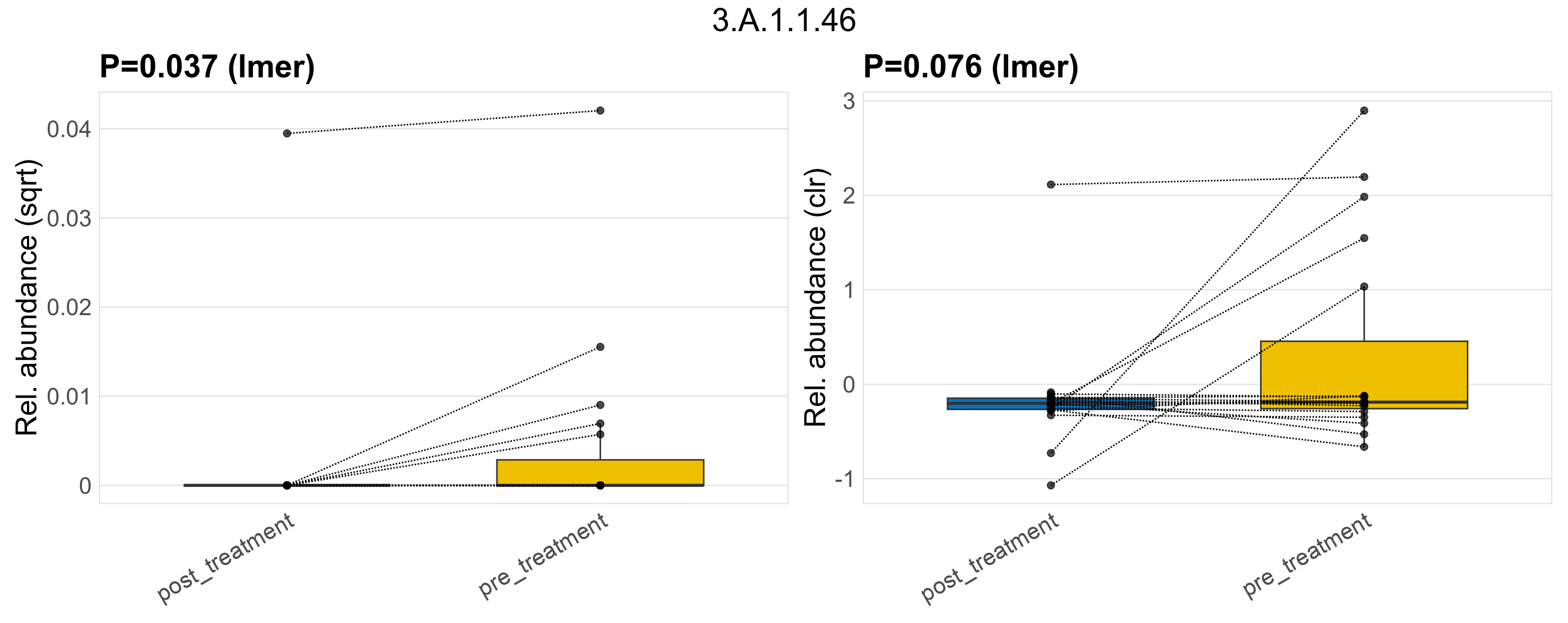 P lmer condition effect (clr): Differentially abundant functions were identified by linear mixed effect regression without confounders. Random effects: Participant (intercept). Fixed effects: Treatment. Effect tested: Treatment.
