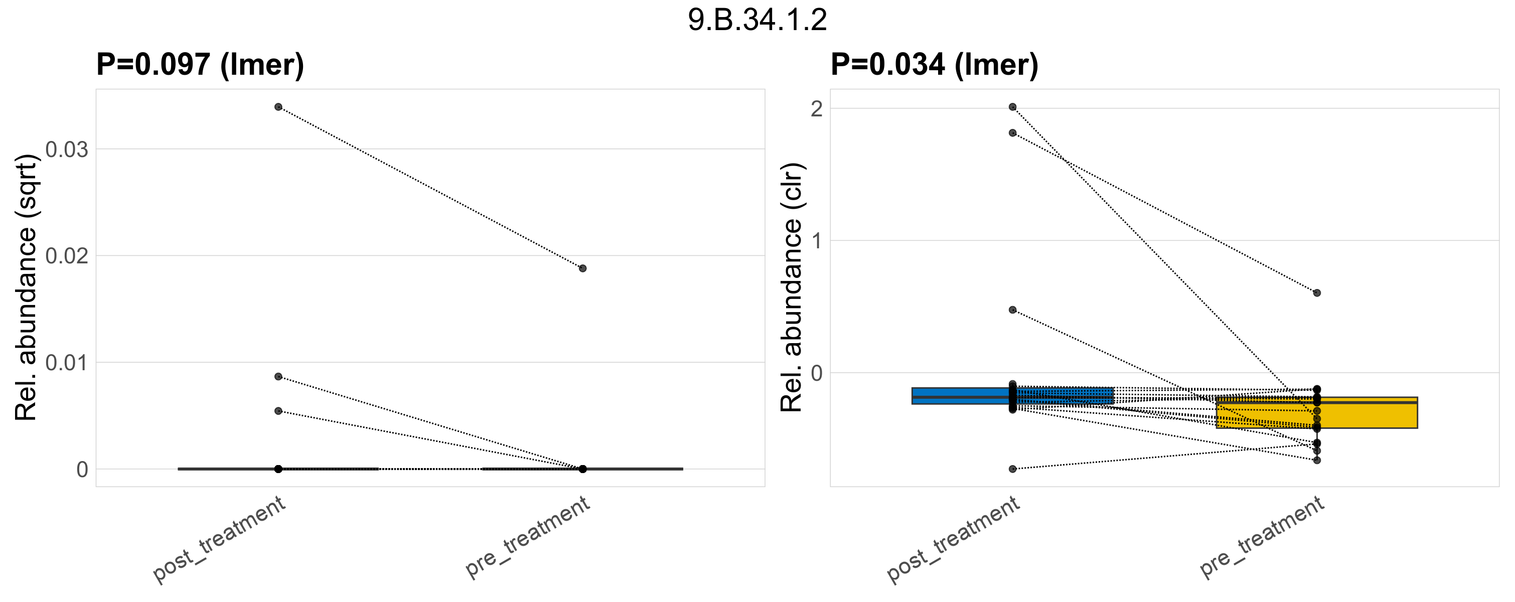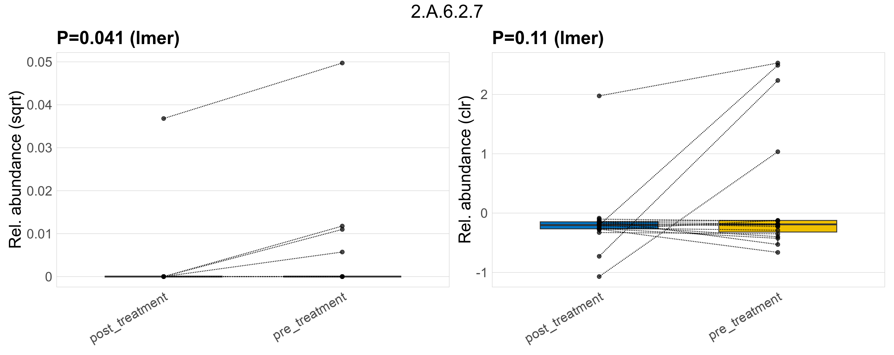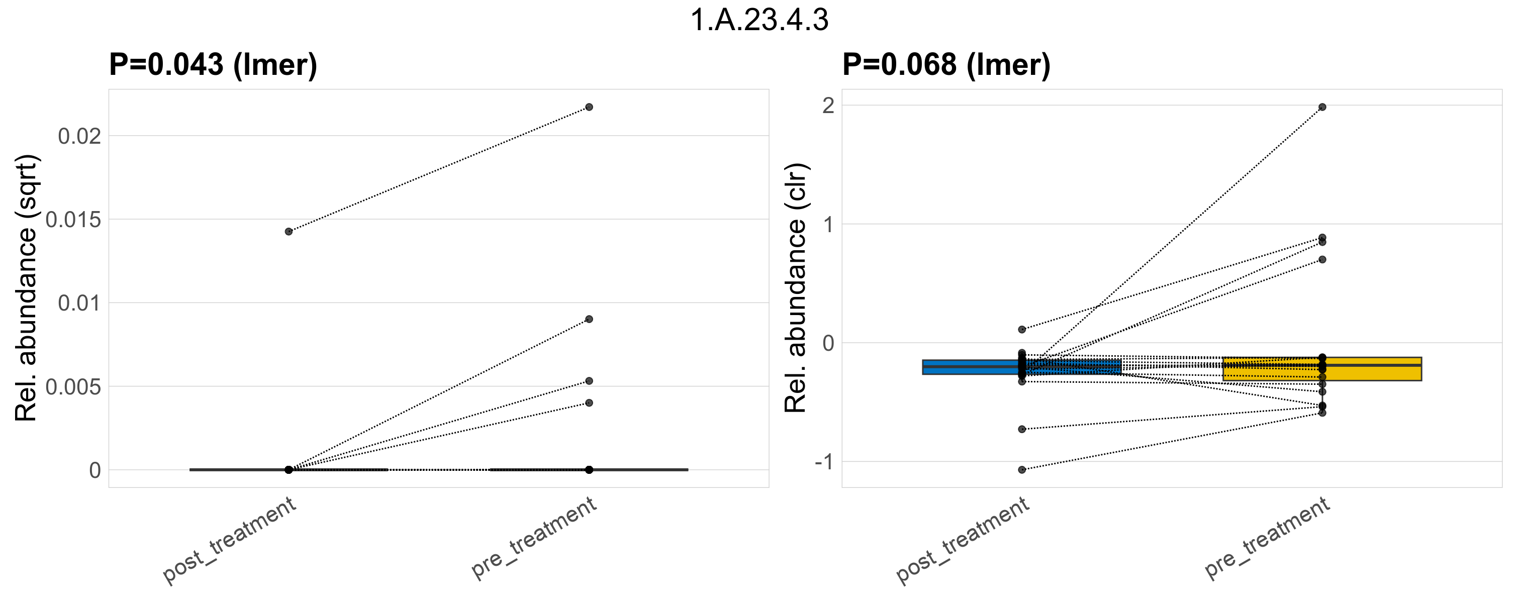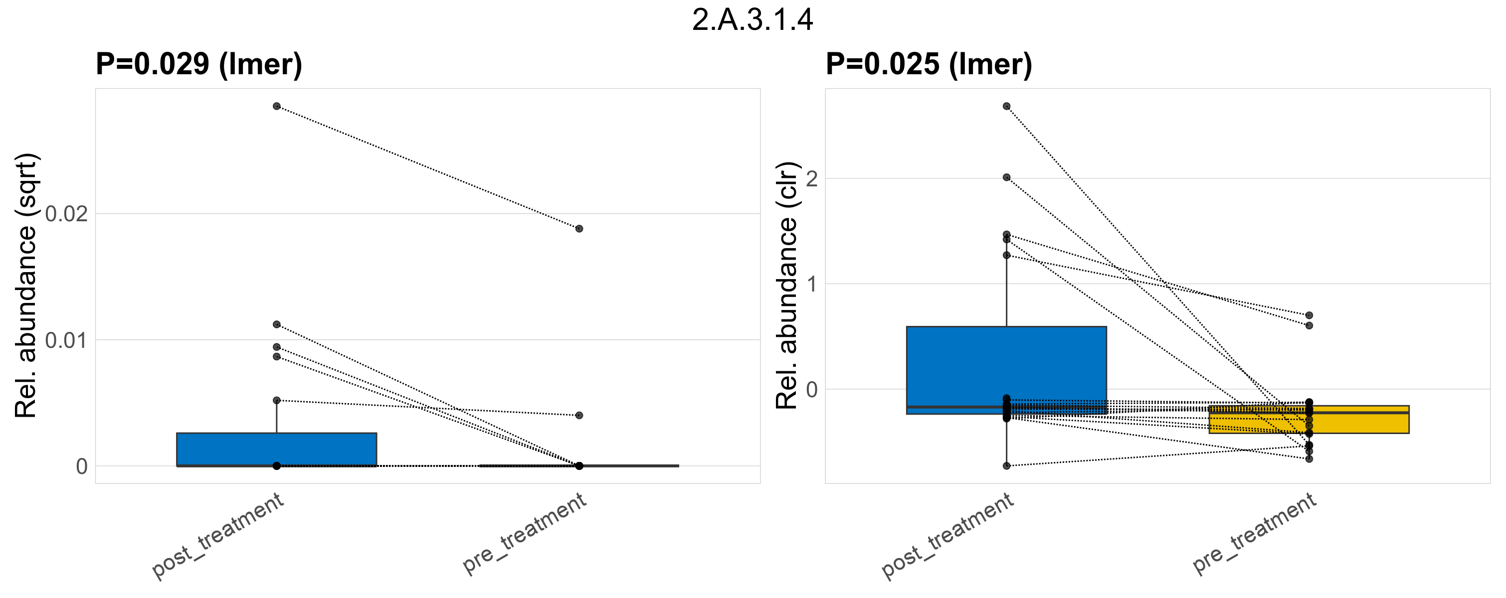 P lmer condition effect (clr): Differentially abundant functions were identified by linear mixed effect regression without confounders. Random effects: Participant (intercept). Fixed effects: Treatment. Effect tested: Treatment.