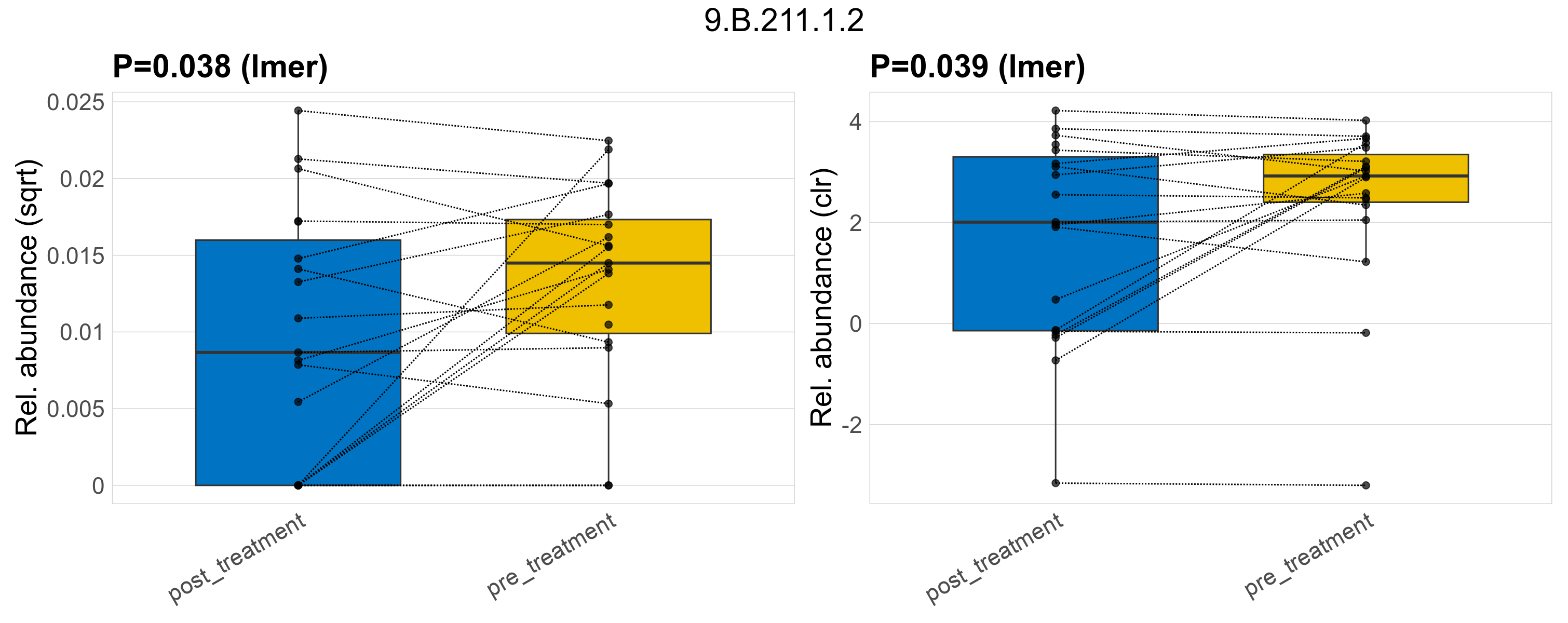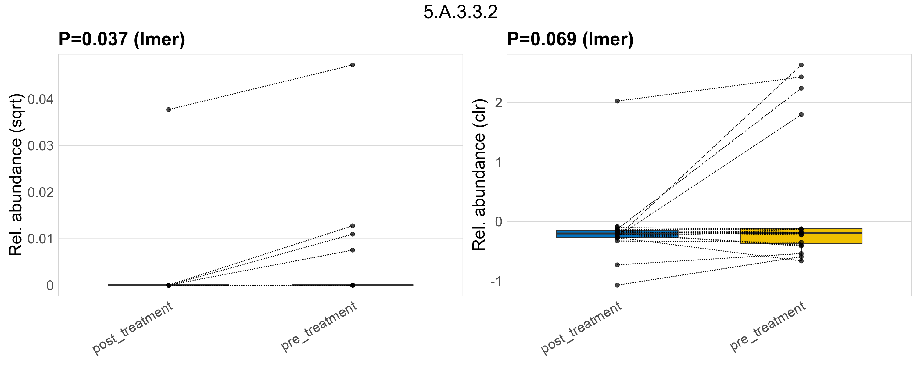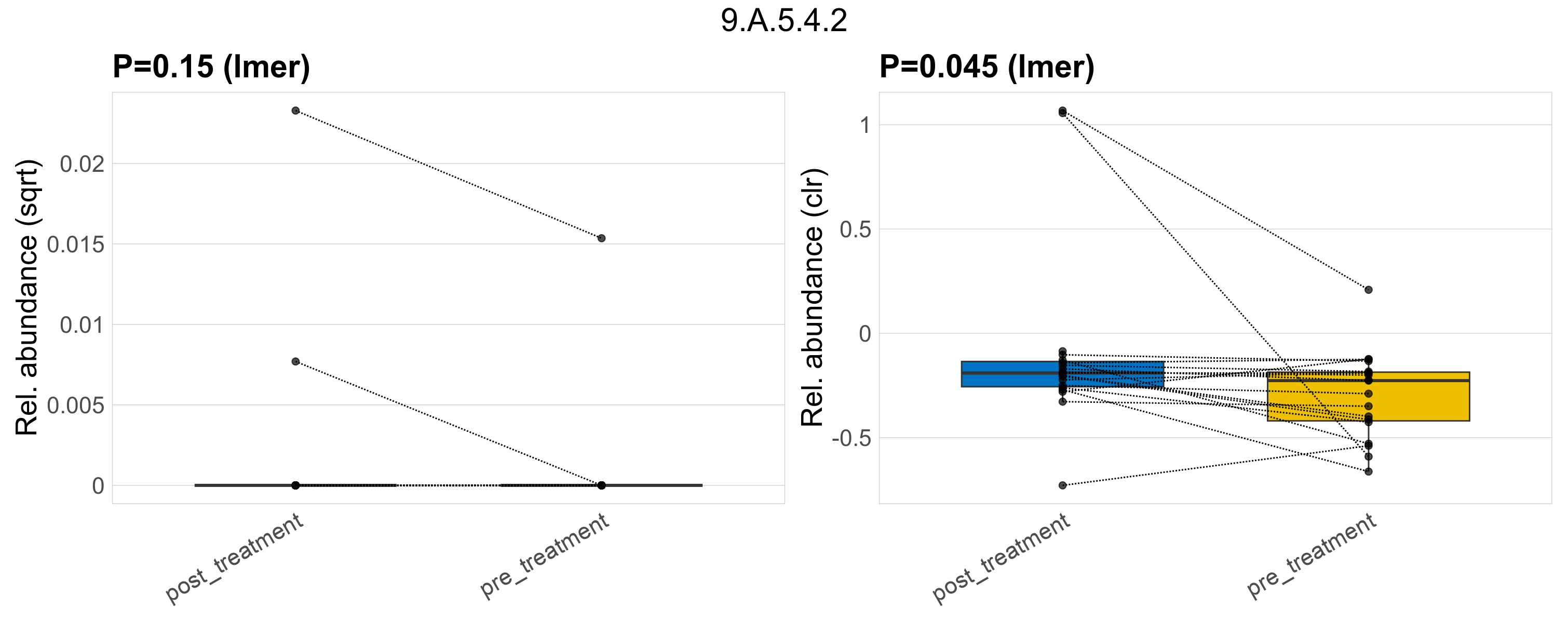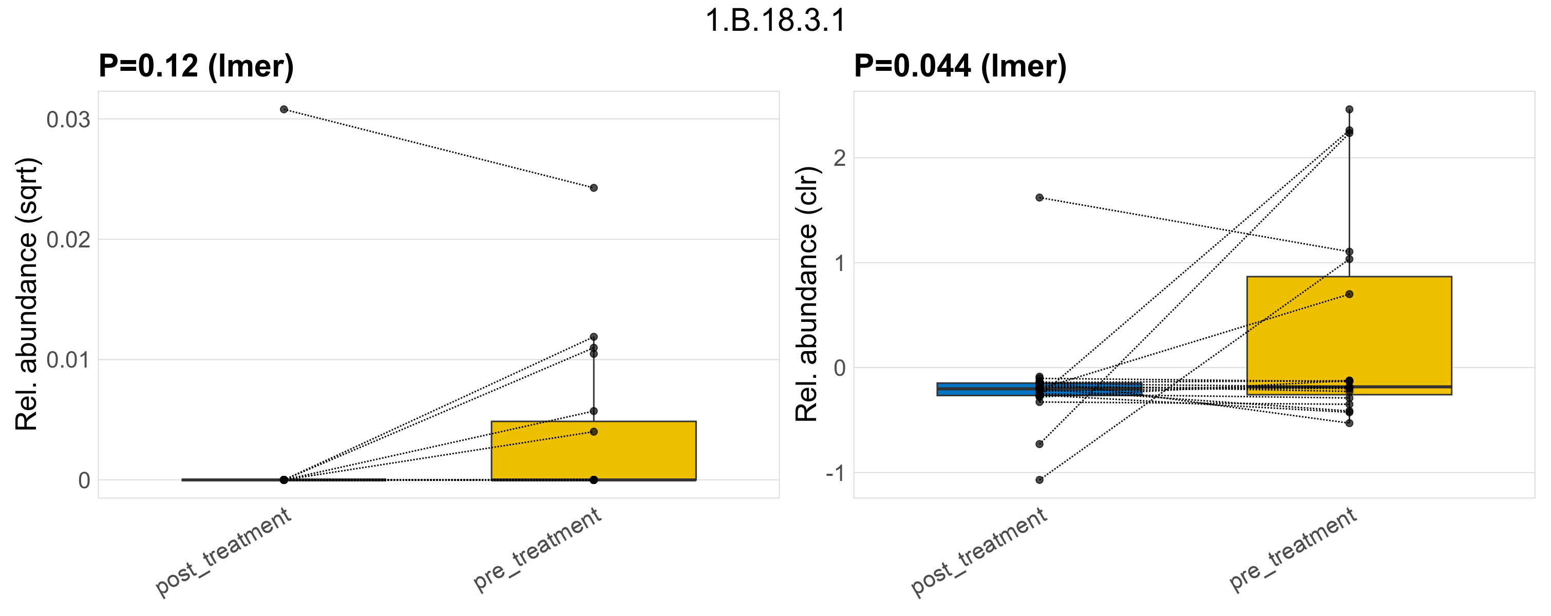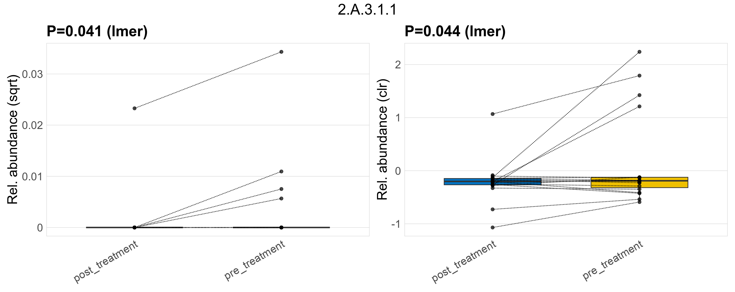 P lmer condition effect (clr): Differentially abundant functions were identified by linear mixed effect regression without confounders. Random effects: Participant (intercept). Fixed effects: Treatment. Effect tested: Treatment.